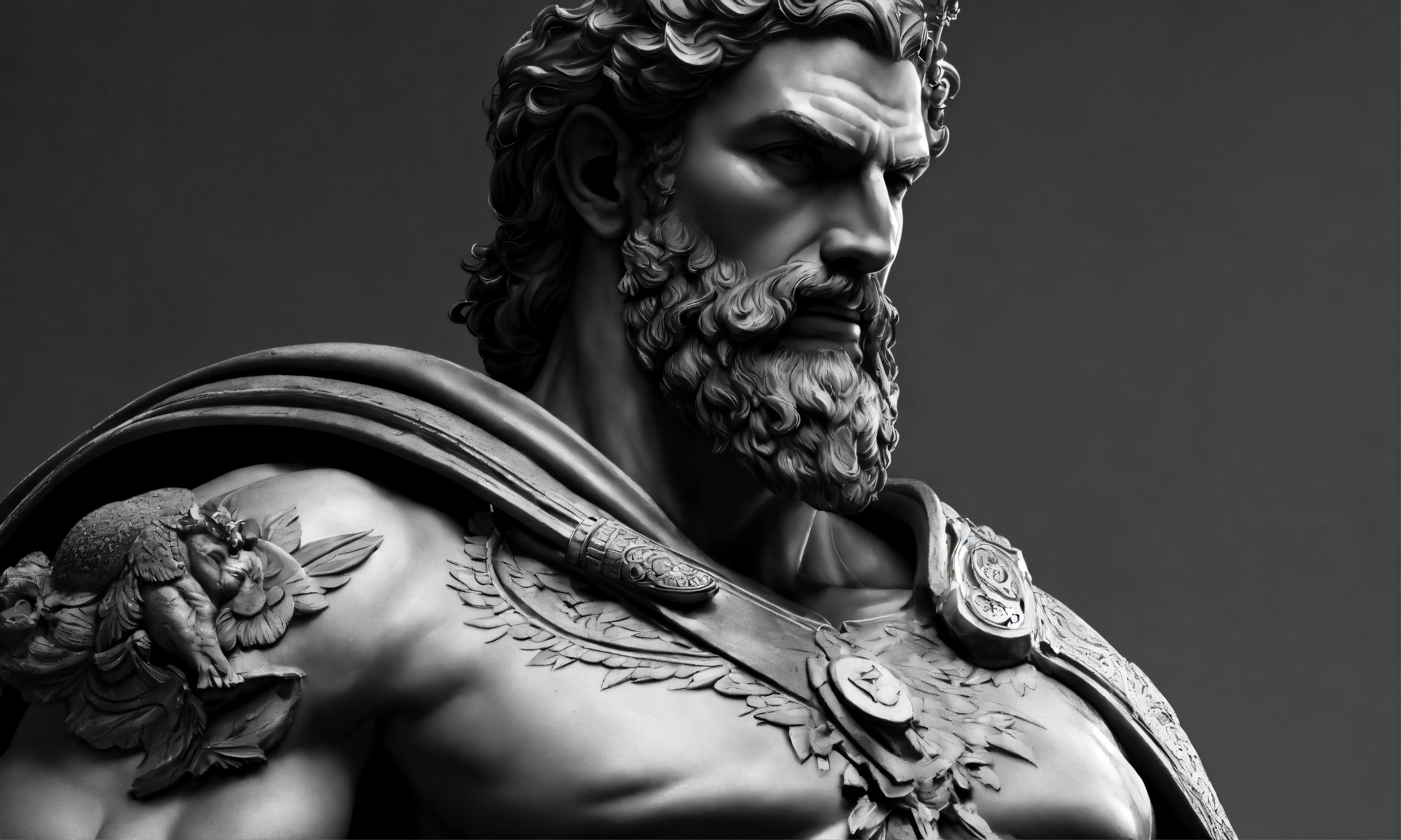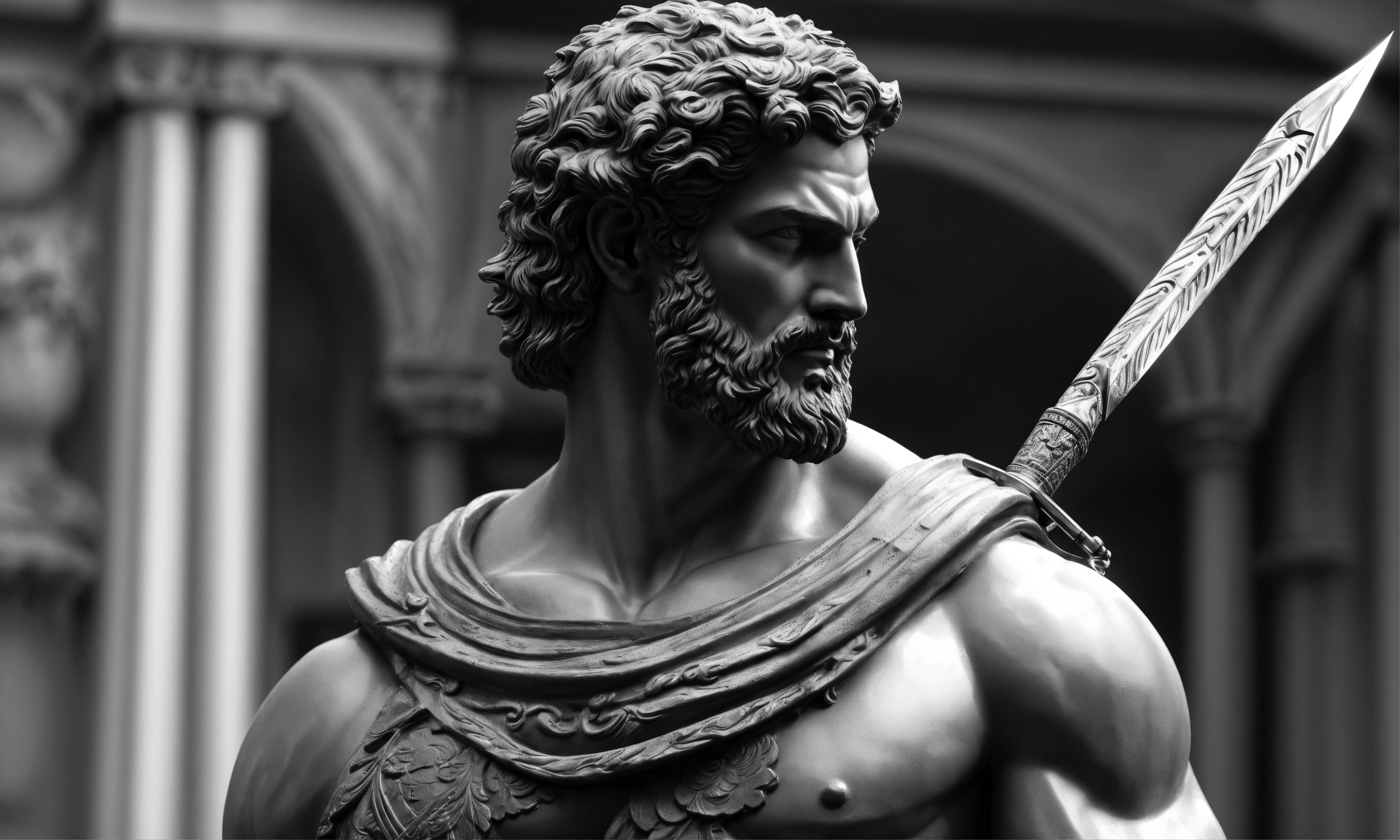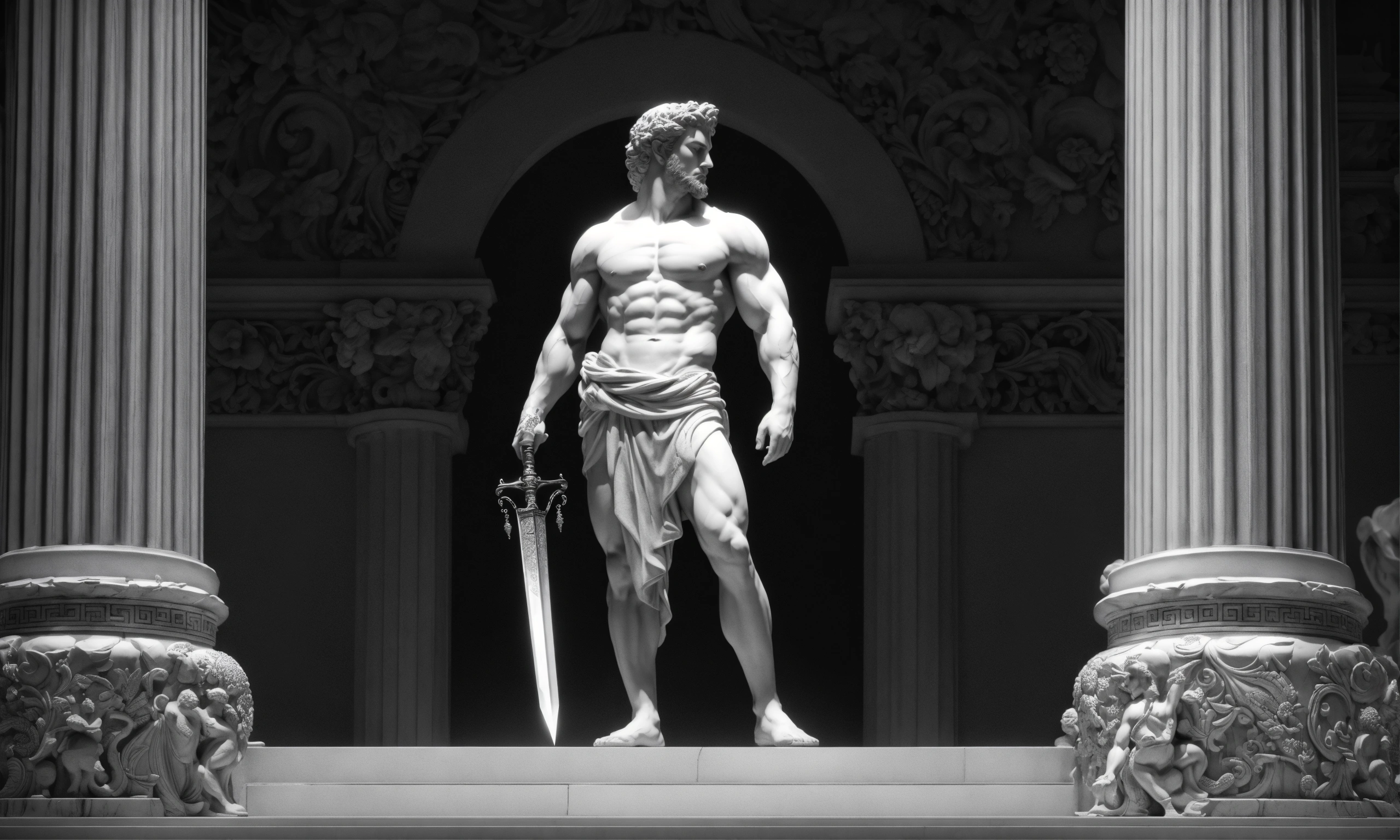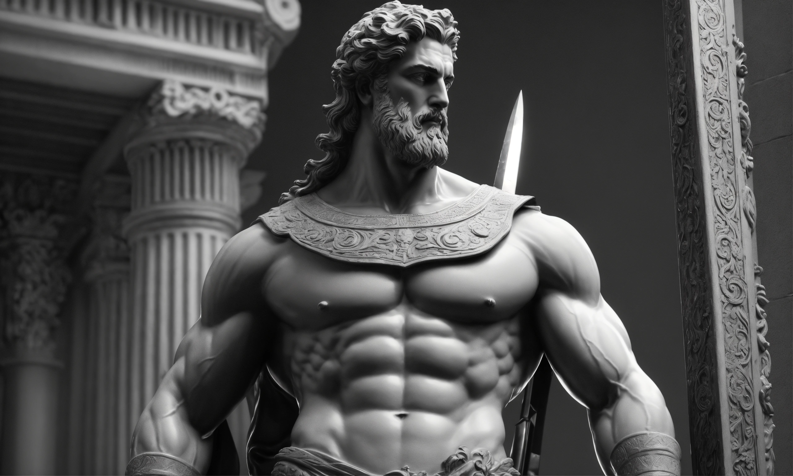Greek statue strong man standing with wicked smirk sideways with dagger, black and white still, digital art, perfect composition, beautiful detailed intricate insanely detailed octane render trending on artstation, 8 k artistic