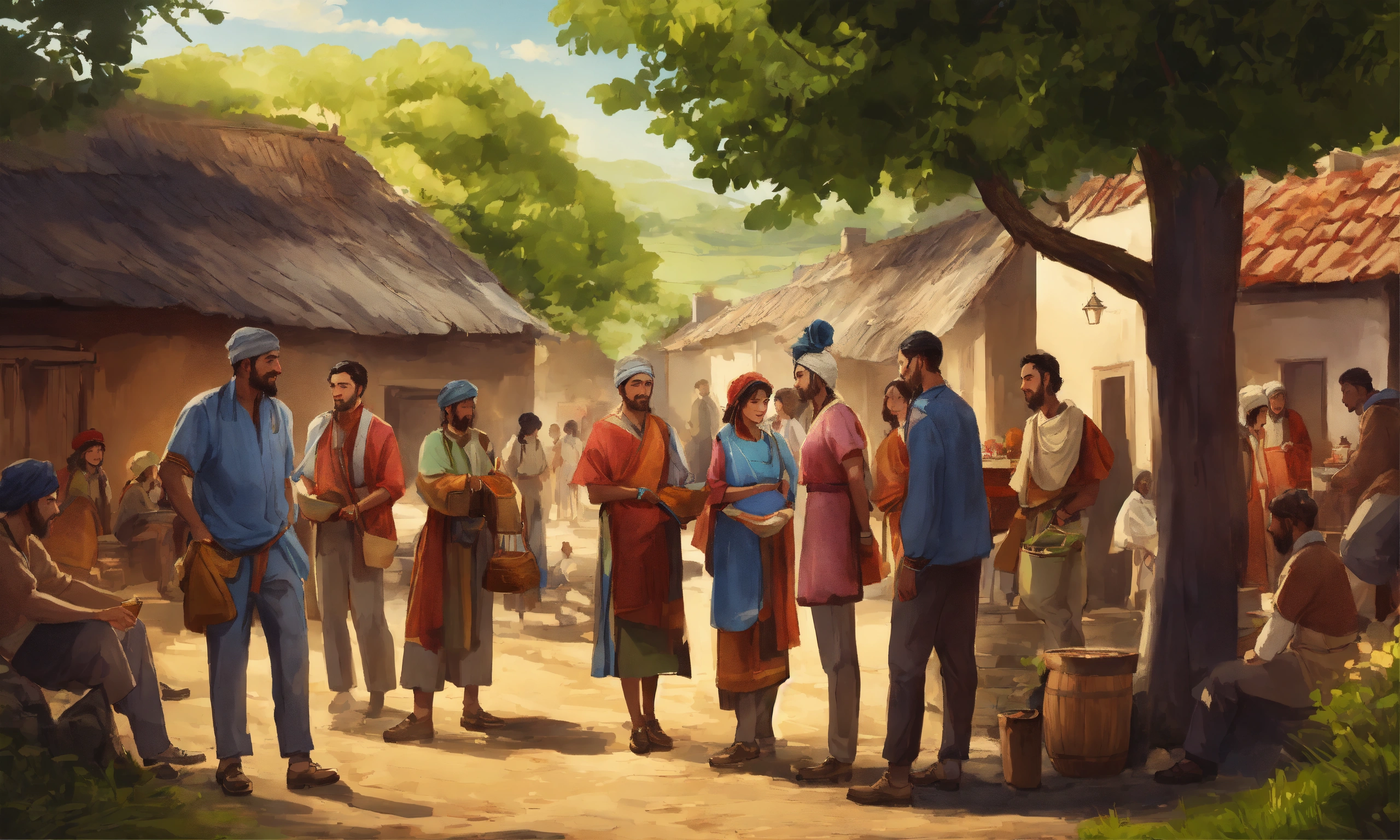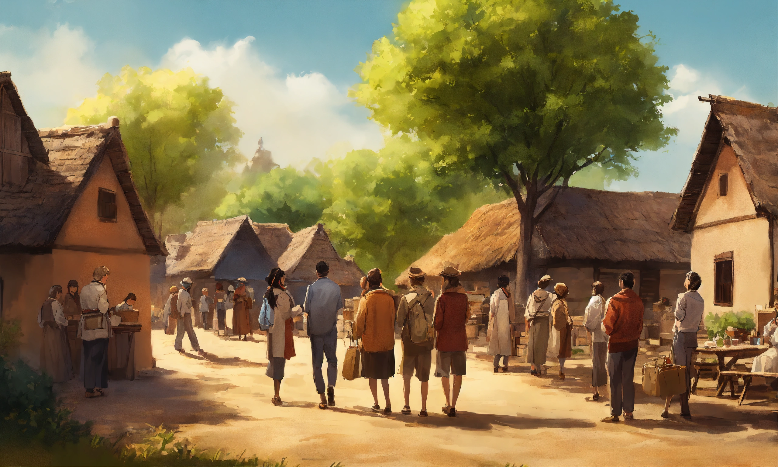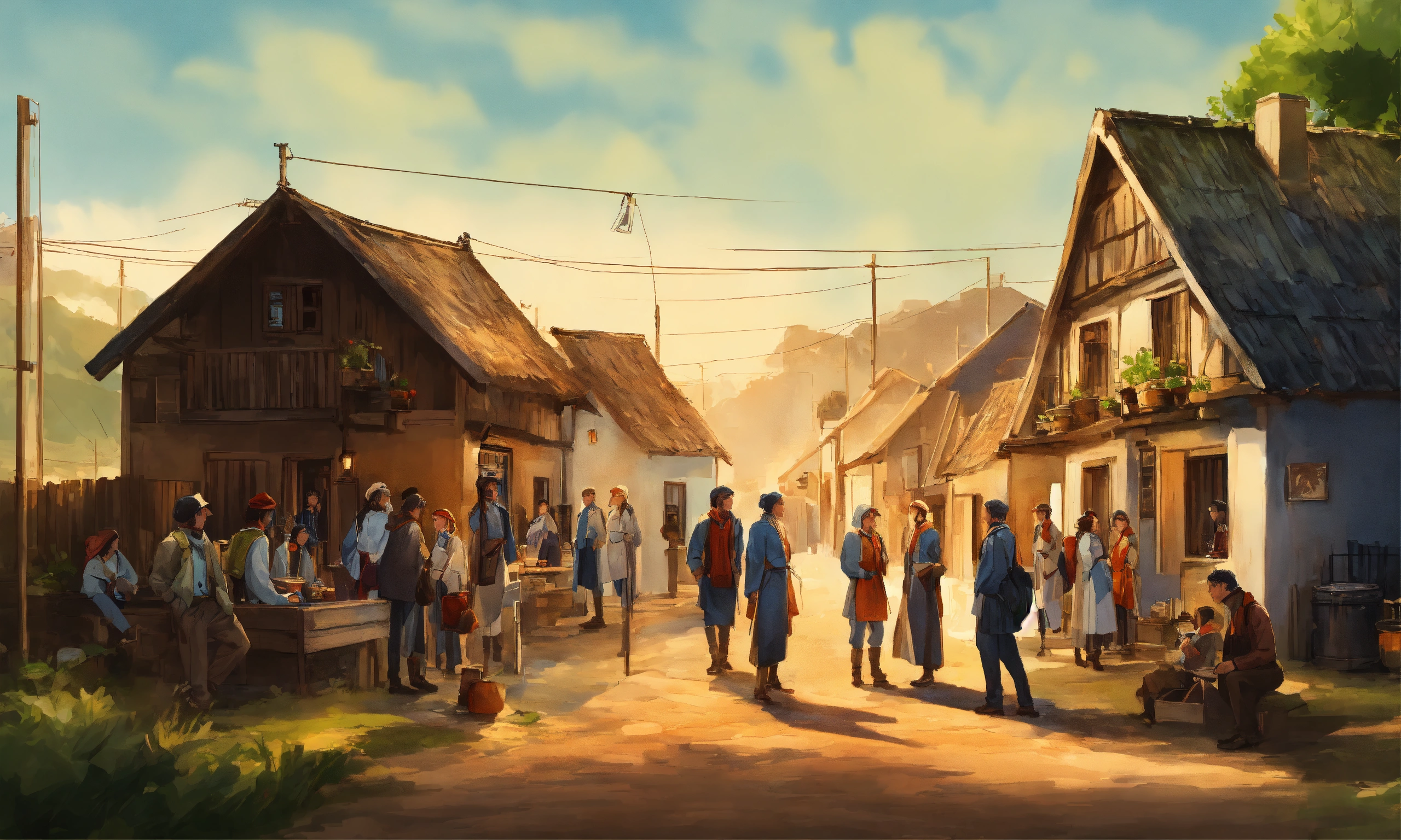 Very high detailed 2d illustration portrait of group of people in the village talking to each other