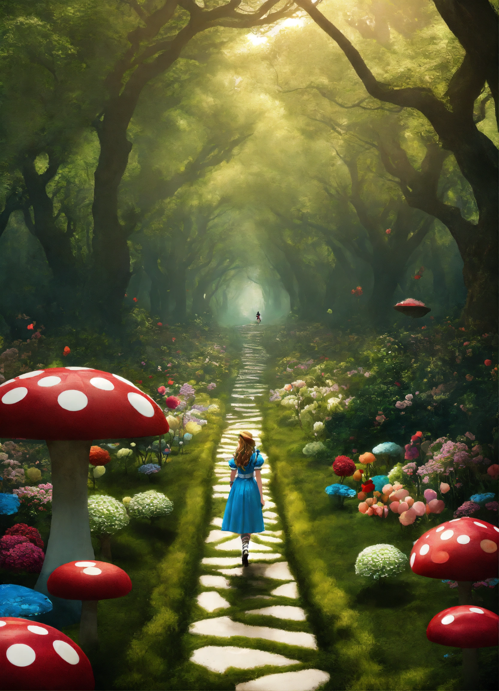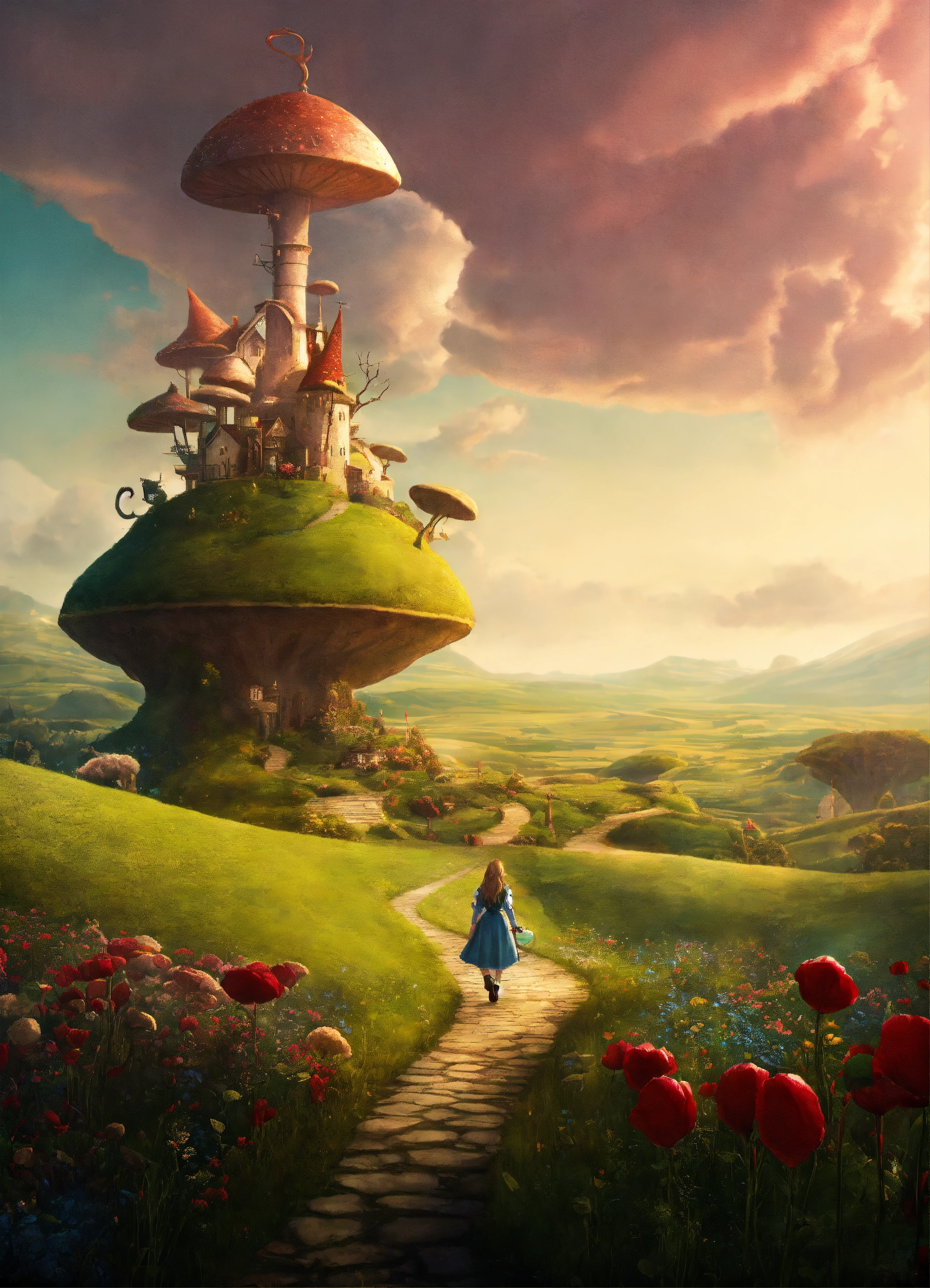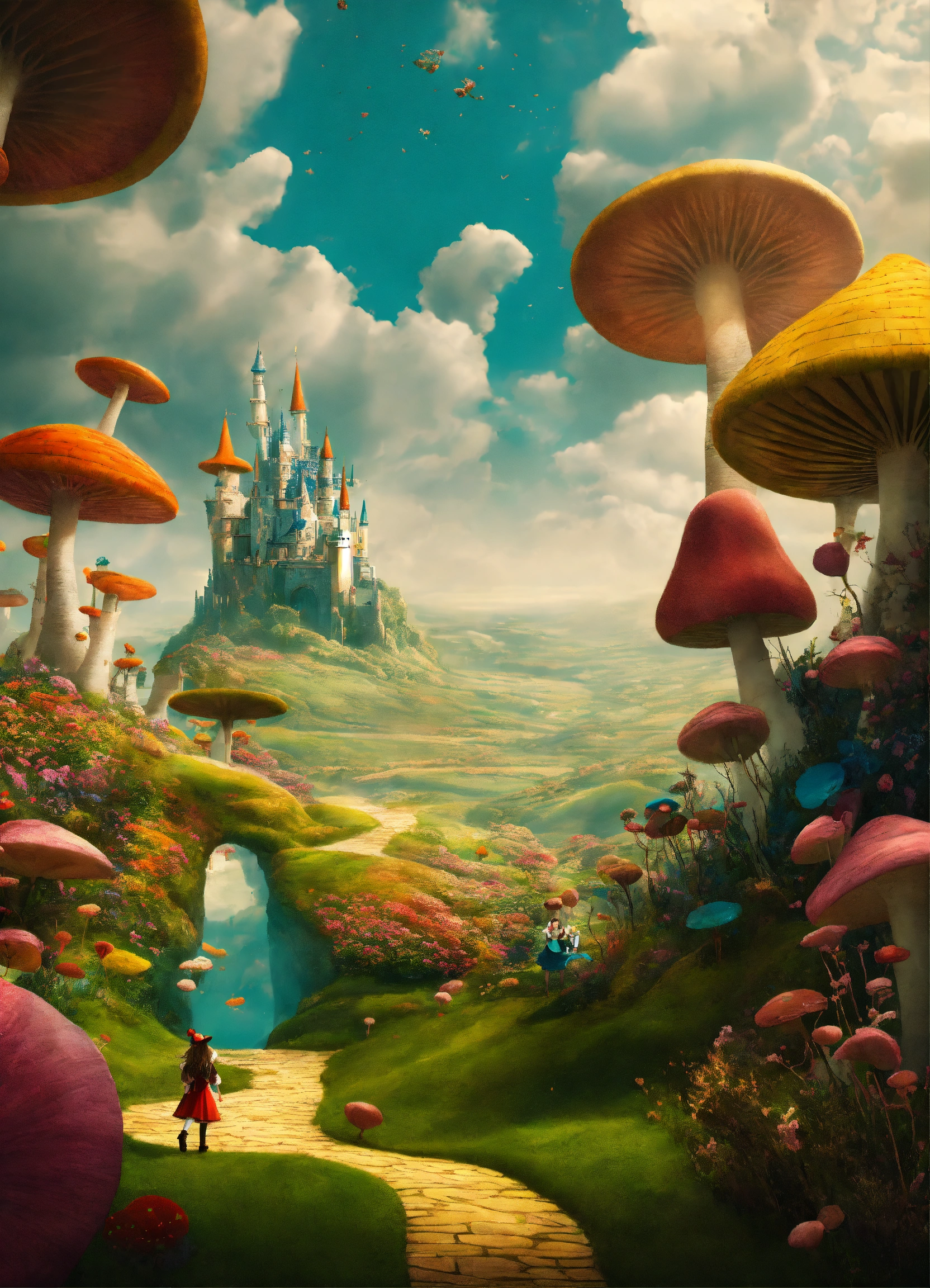 Alice in wonderland landscape meets wizard of oz hd, minimalist and sleek conceptual environment, surrealism