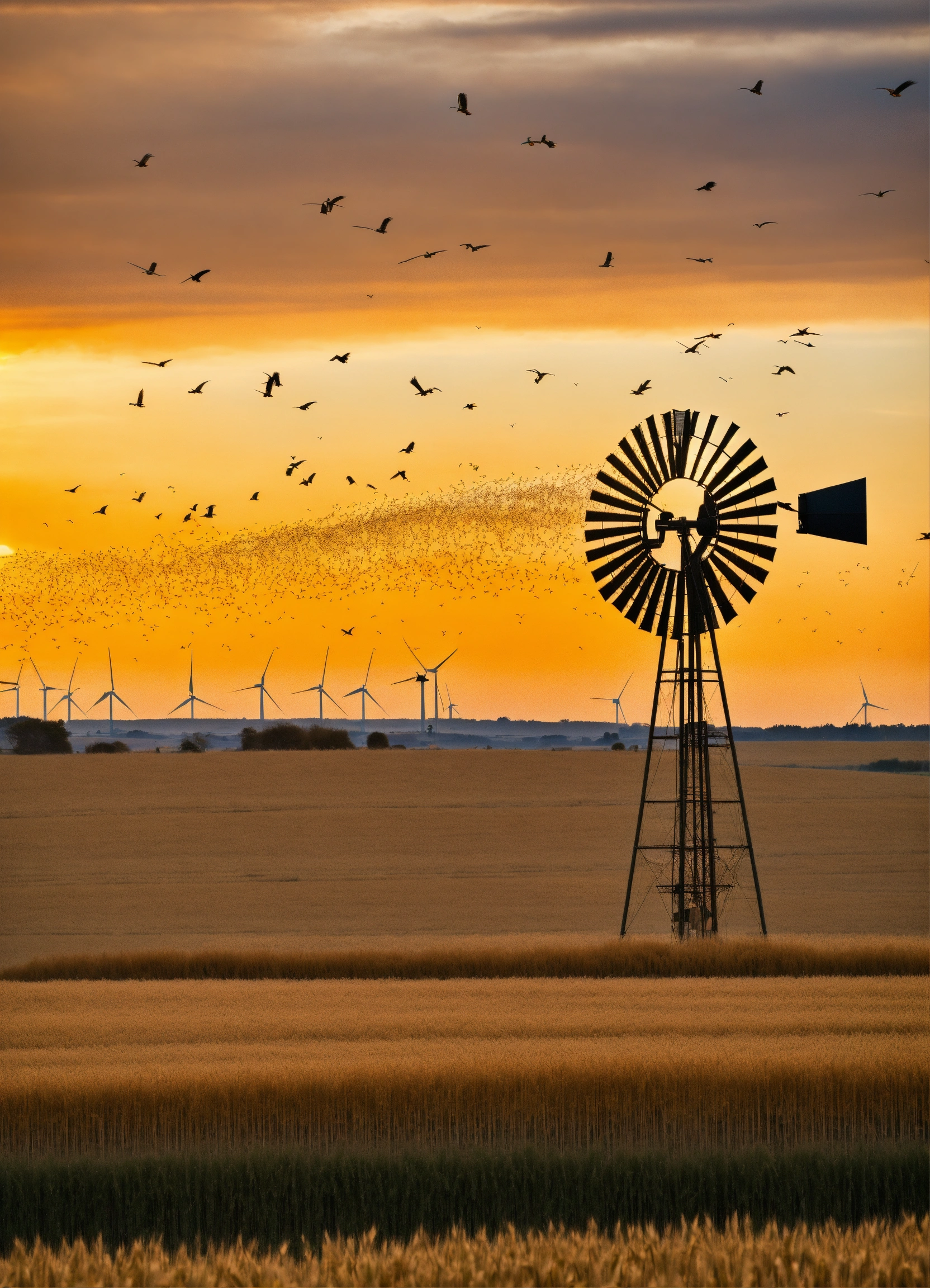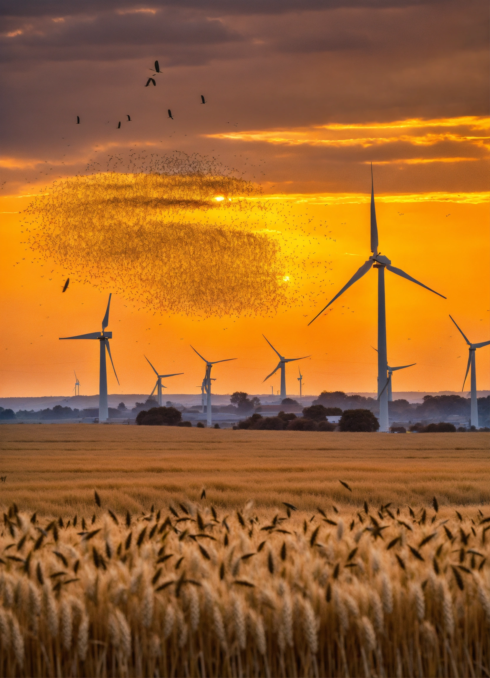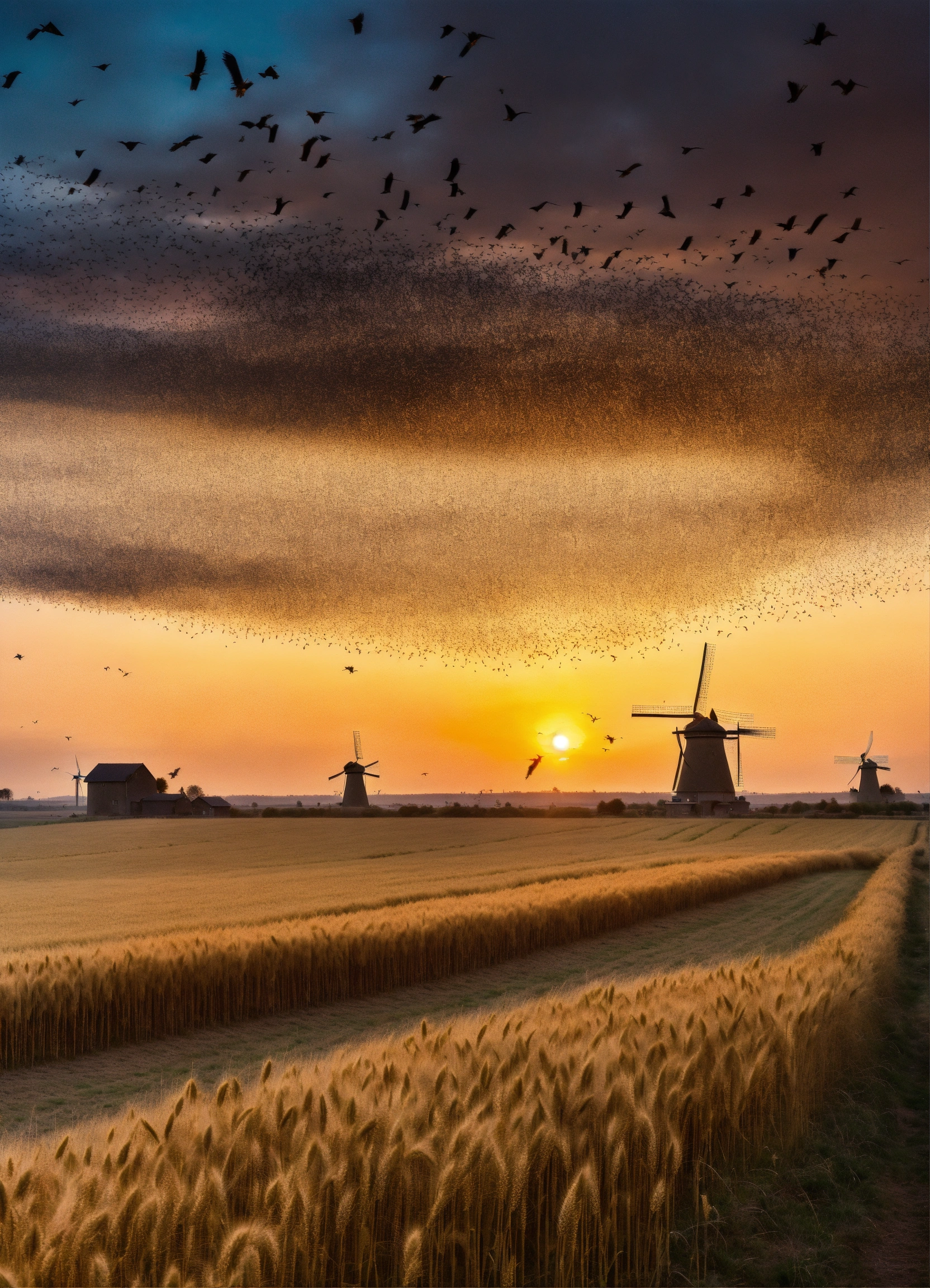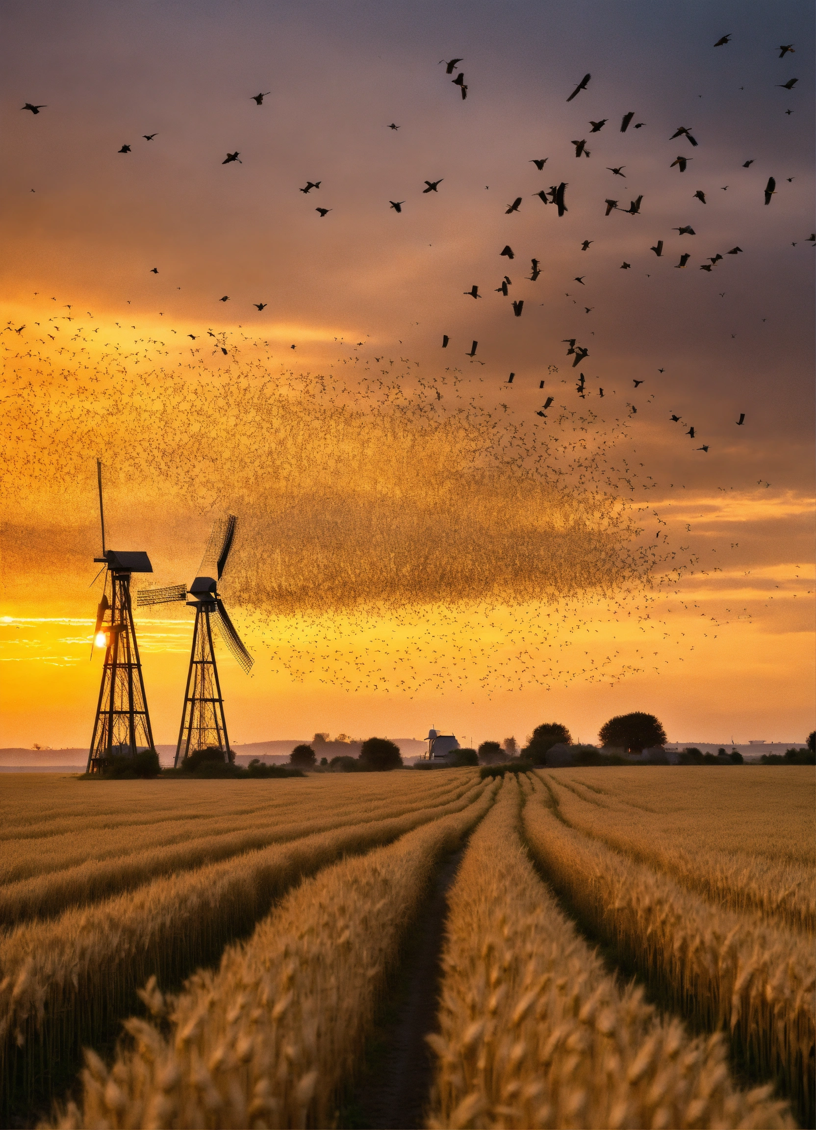Beautiful murmuration of starling birds in the sunset sky over a golden field of wheat with windmills in the distance
