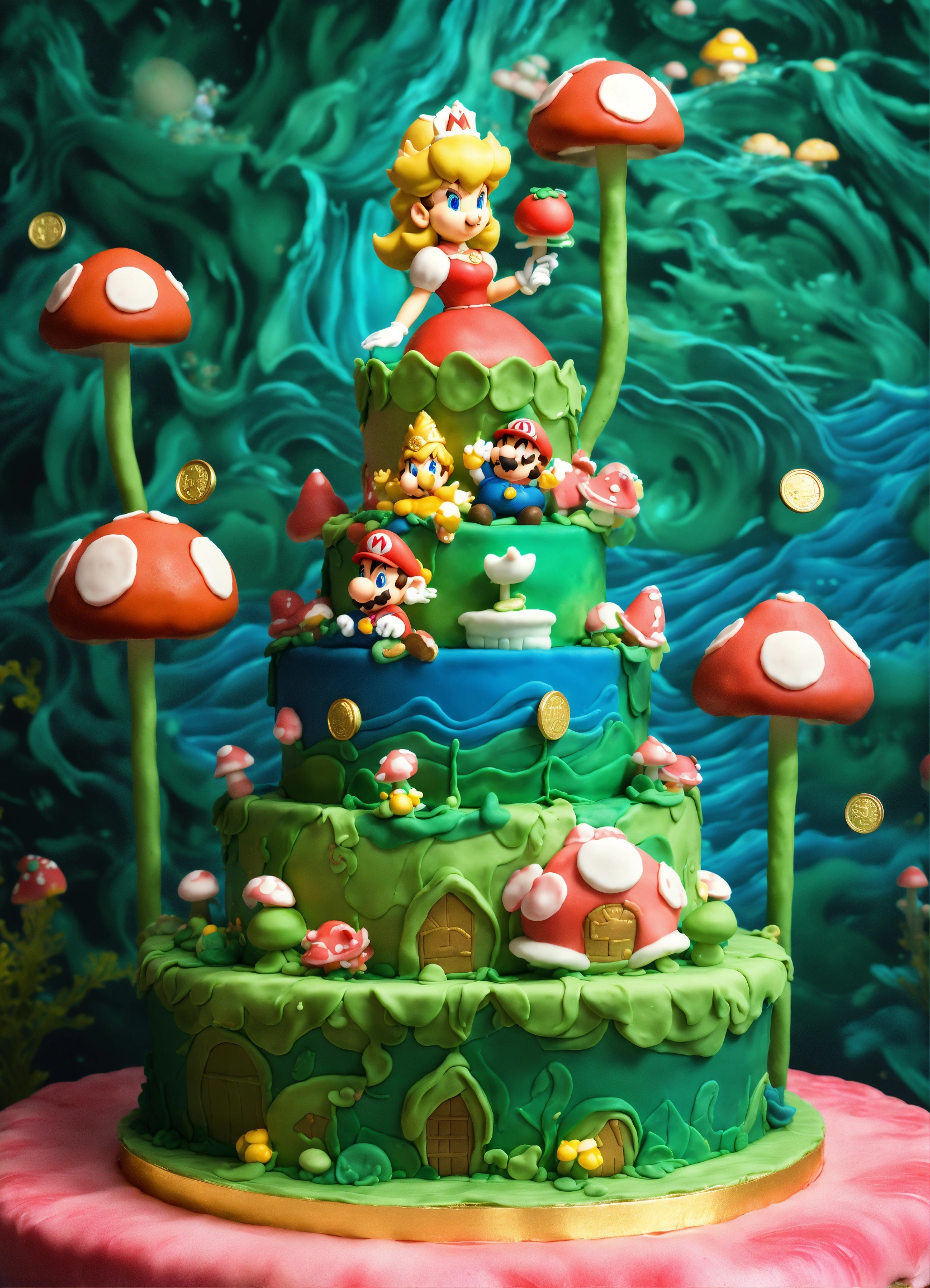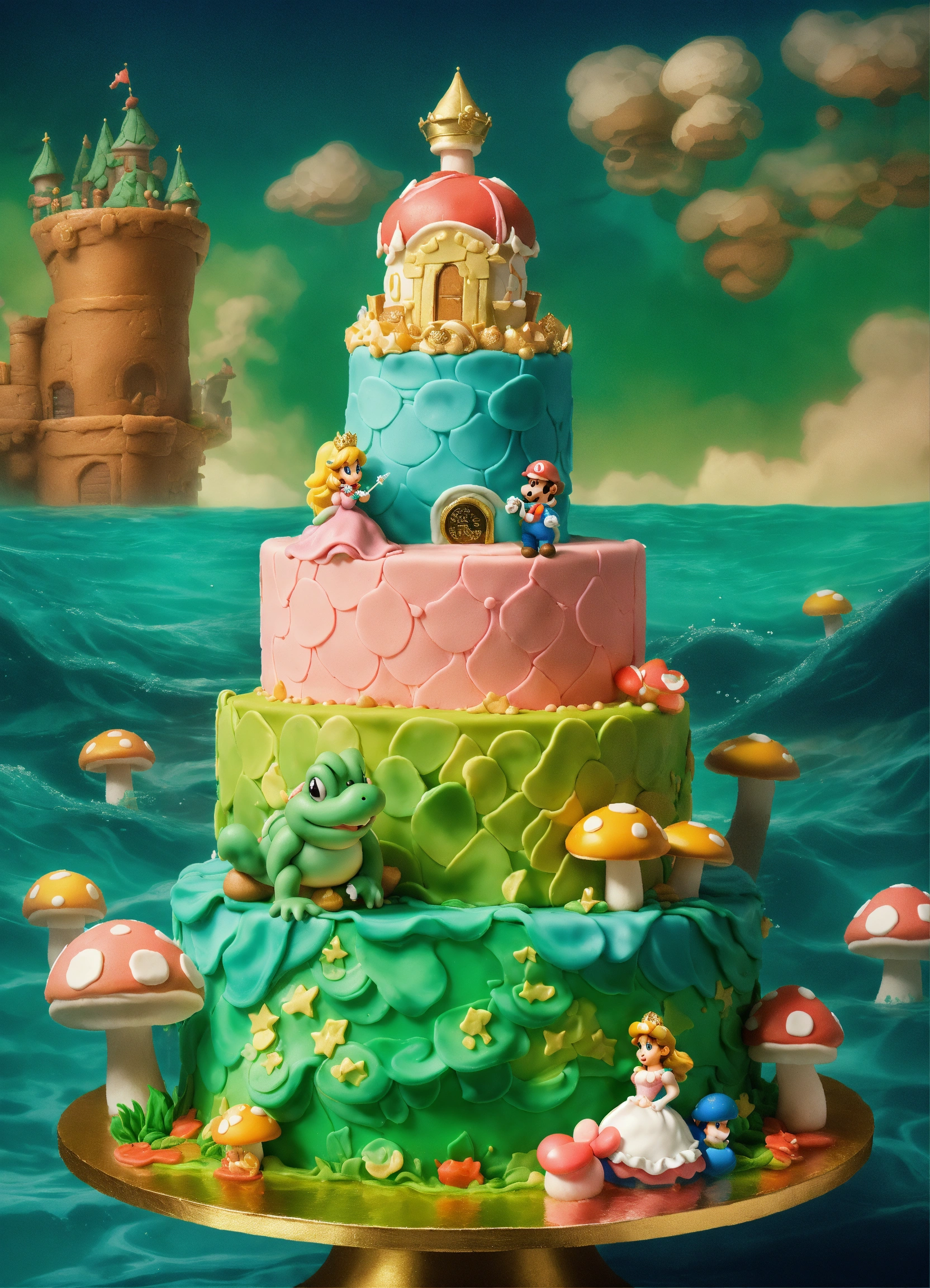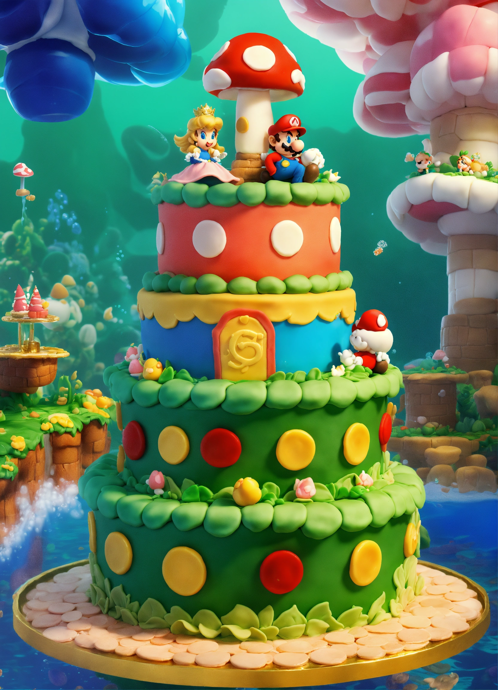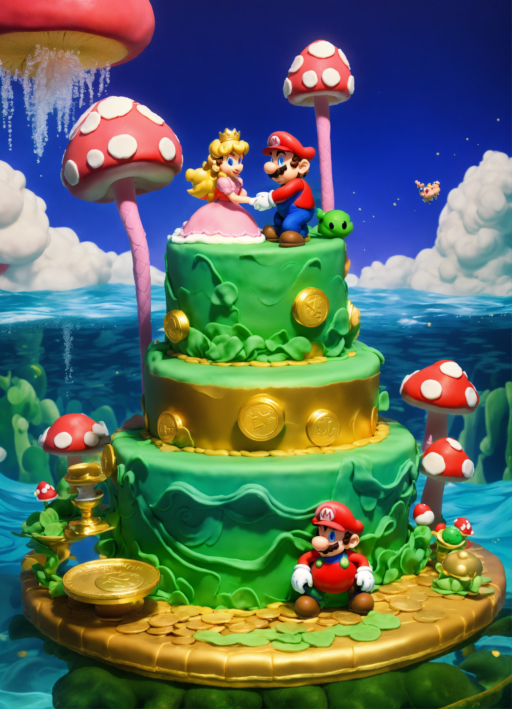 Mario and princess peach atop a multi-tiered cake, iconic green warp pipes and blue underwater waves, bowser and toad as cake guests, retro gaming meets romantic elegance, digital art, vibrant mushroom kingdom palette with gold coin accents.