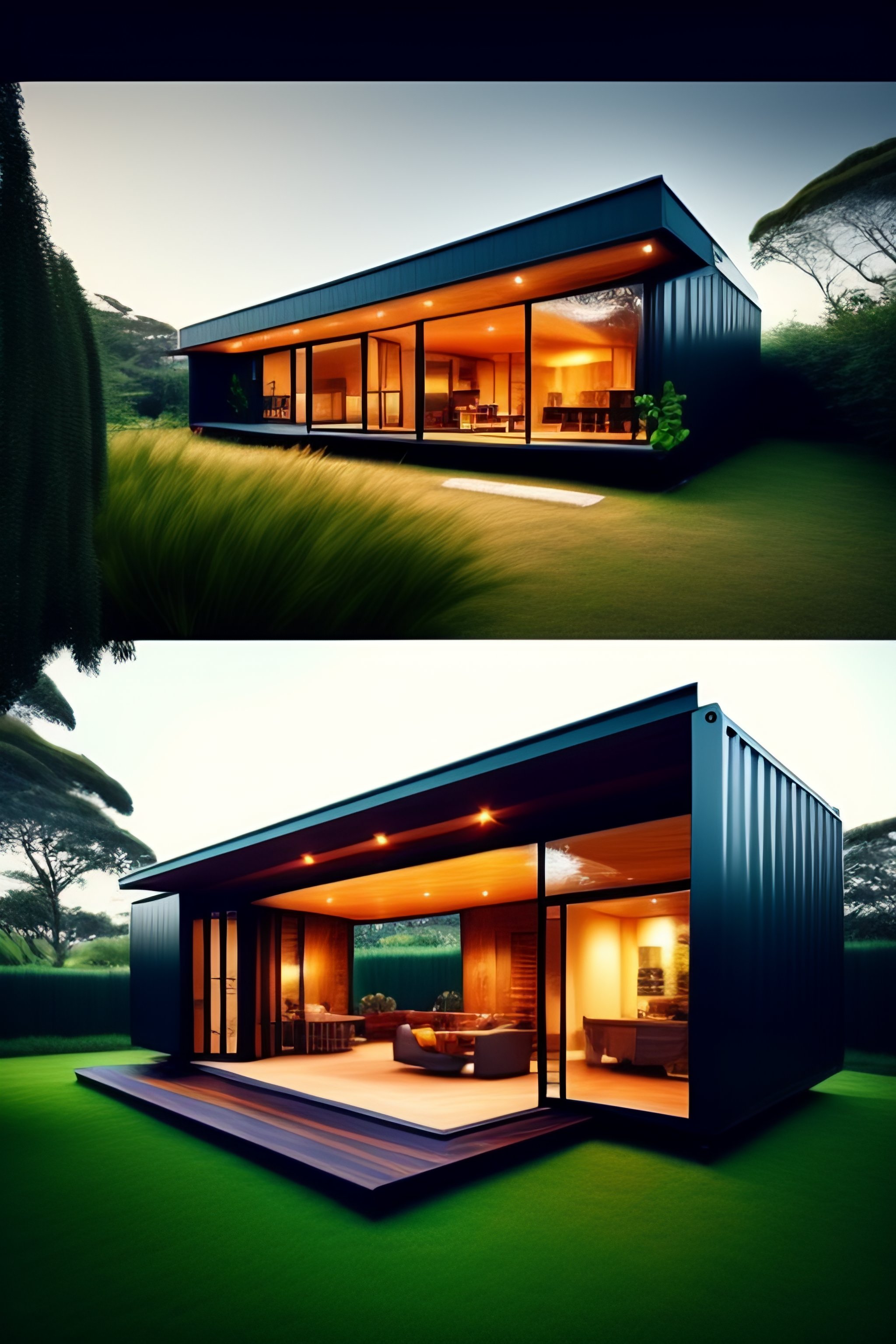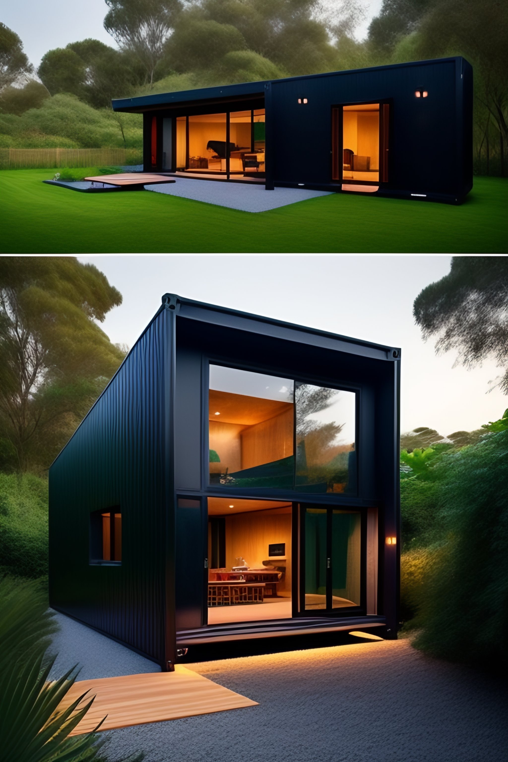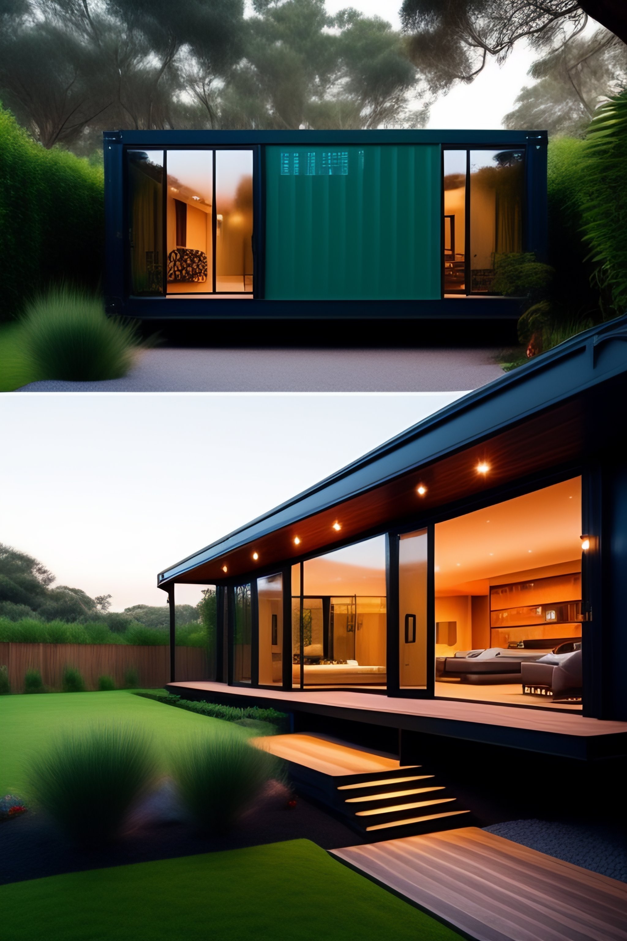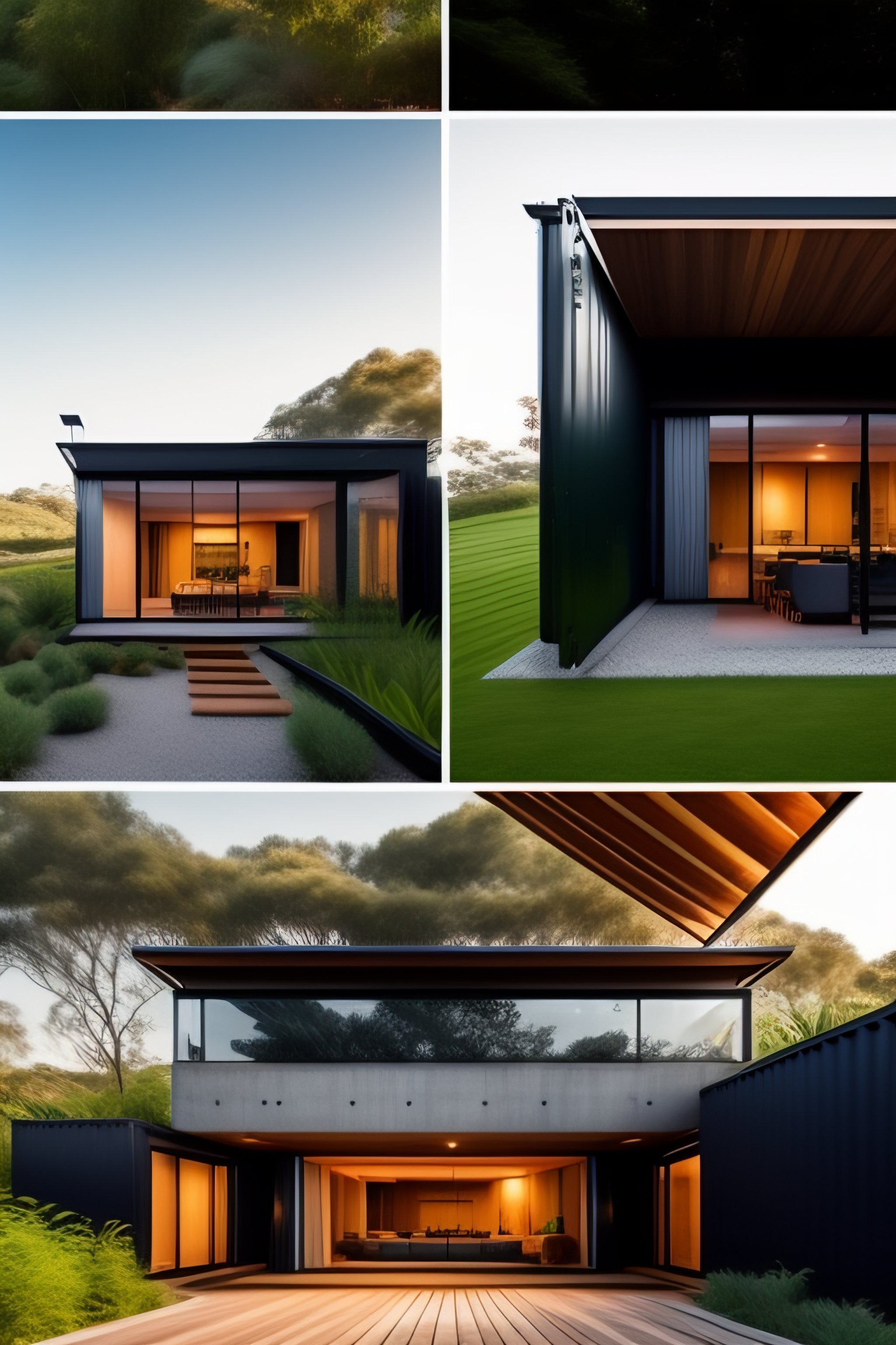 Hidden oasis shipping container home, courtyard, garden, deck, ultra modern style, dramatic materials, concrete, wood panel, stone brick, dramatic landscape, south asia, south pacific, african colors