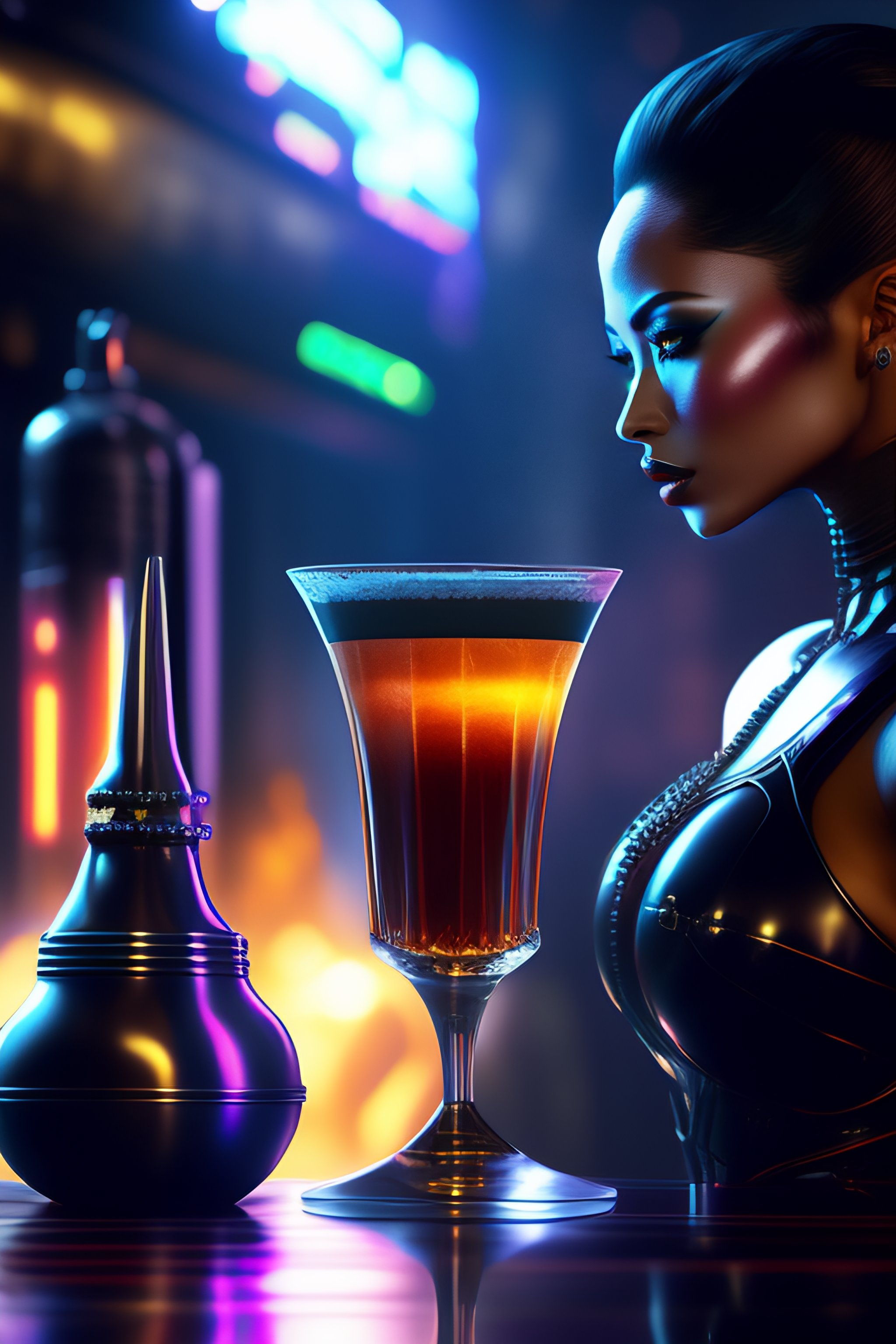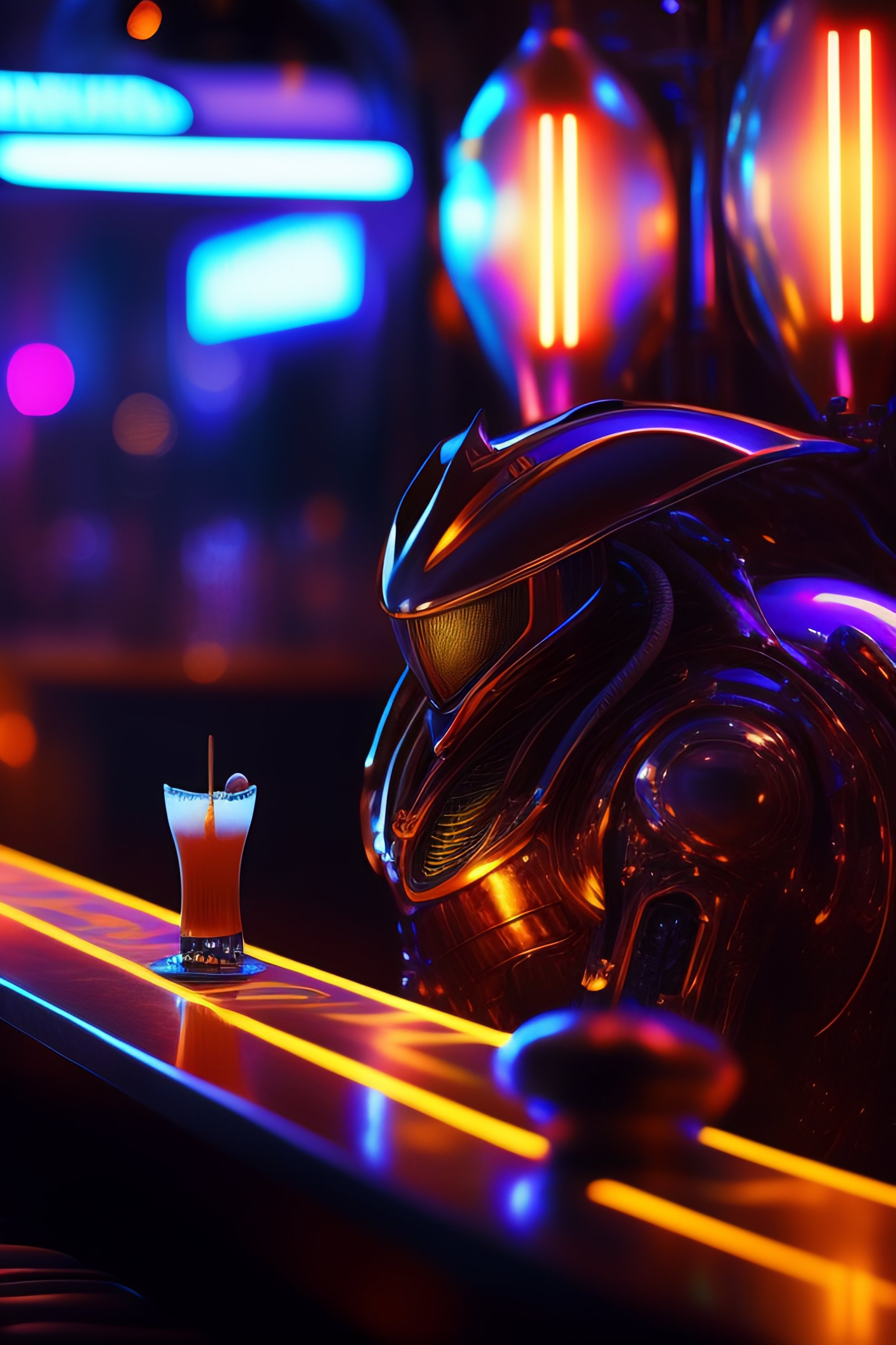 Alien and biomechanical drinking cocktails elixir futuristic strong full body cinematic style digital art render with mechanical and futuristic details in a cyberpunk underworld, sci-fi bar, moody atmospheric lighting, techno horror, dangerous, art by yoshiyuki sadamoto and matt banning, batt, directed by roger deakins
