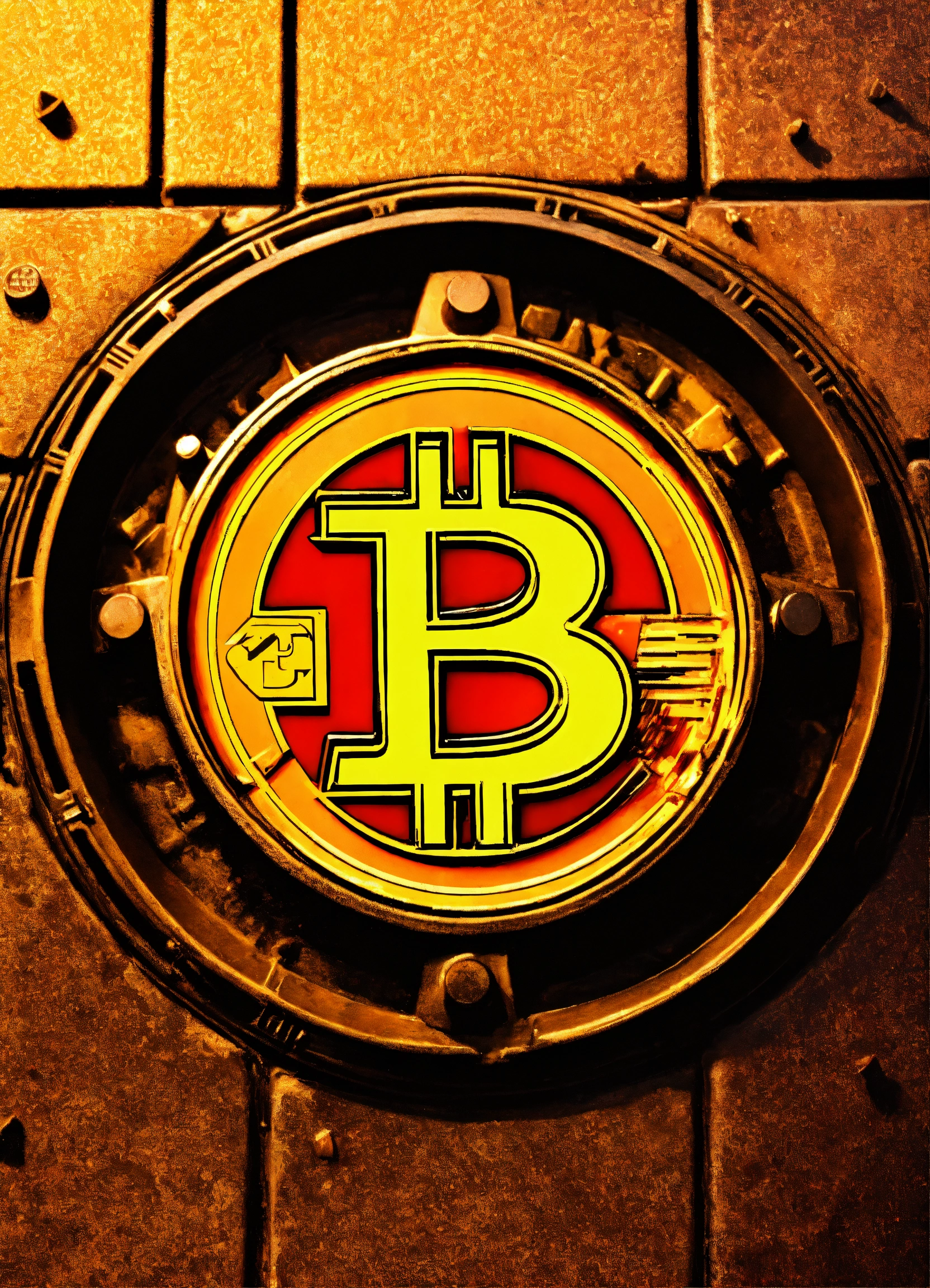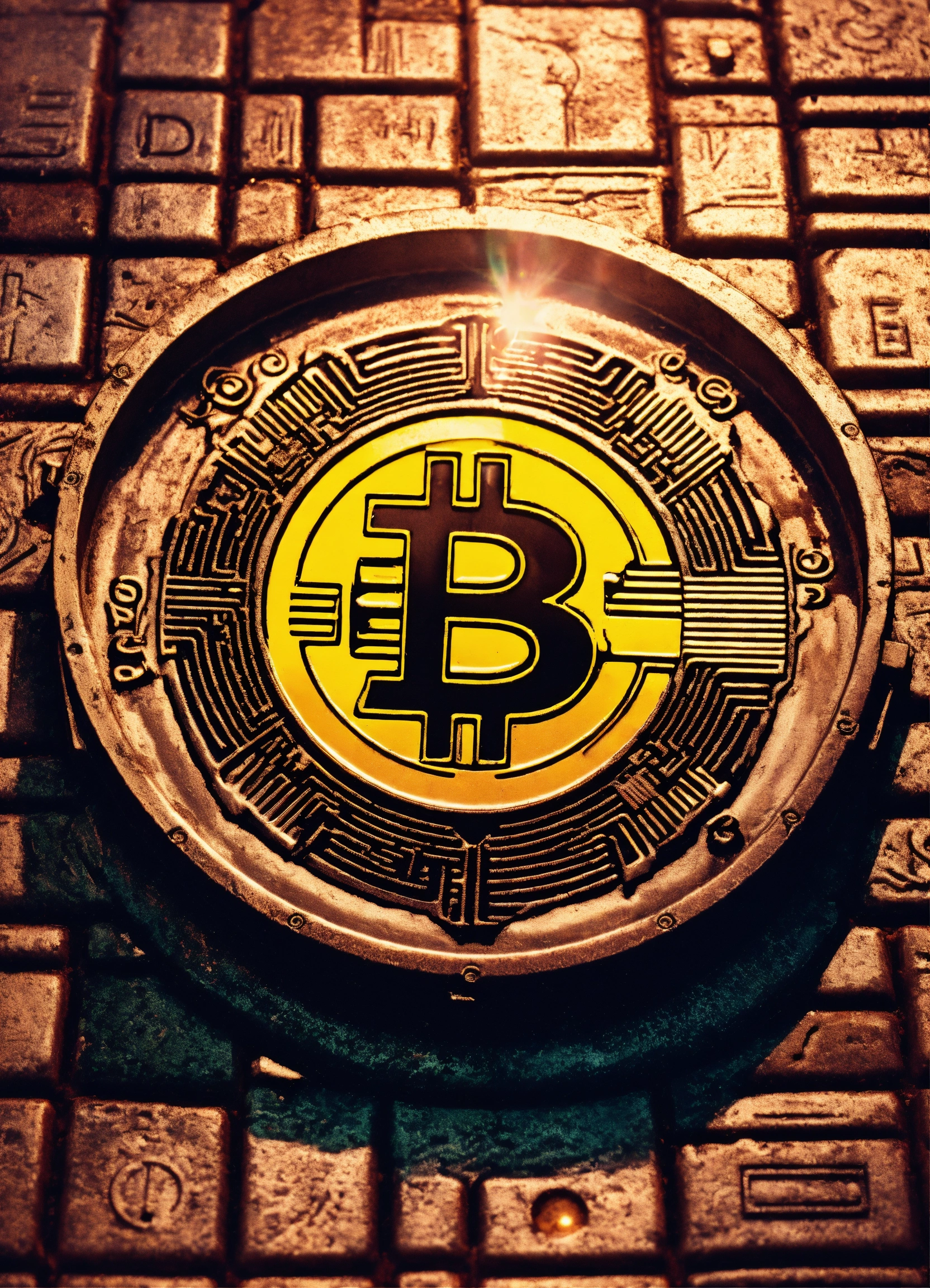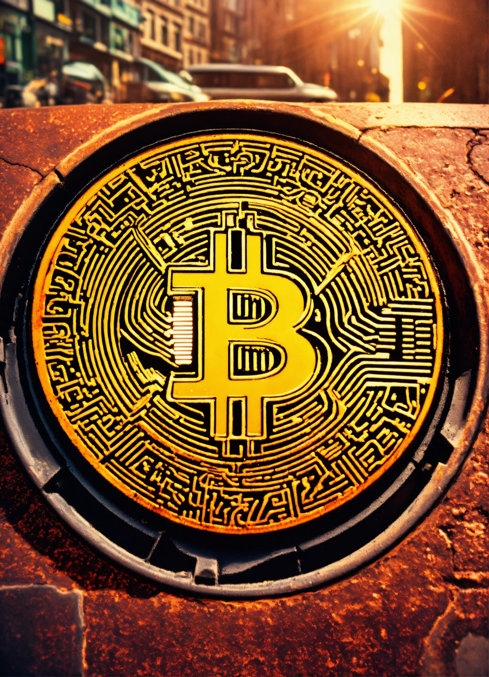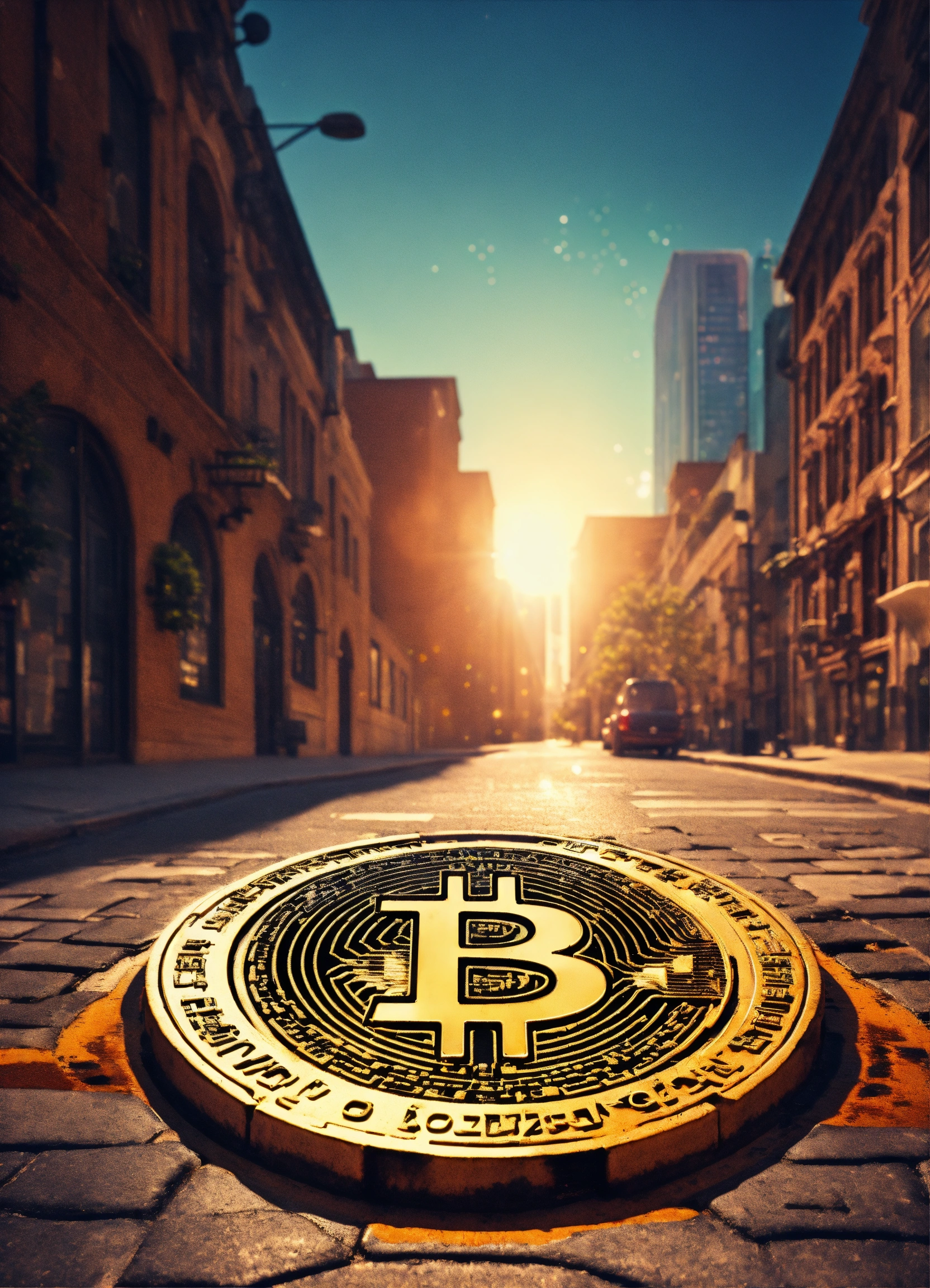 City street, manhole cover with bitcoin logo, pixar style, intricate detail, film grain, lens flare, kodachrome iso 200