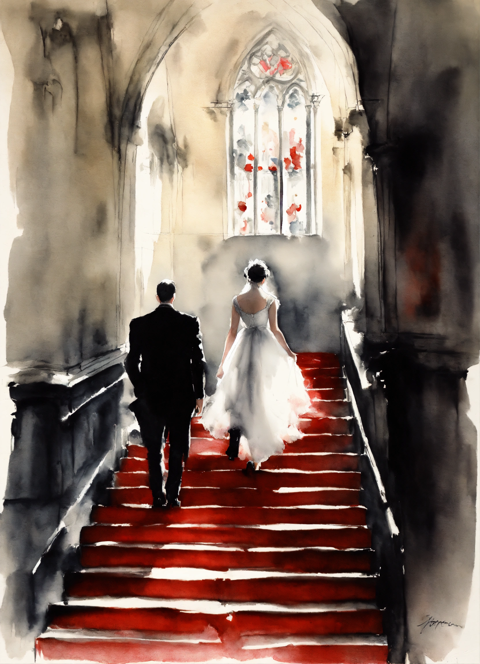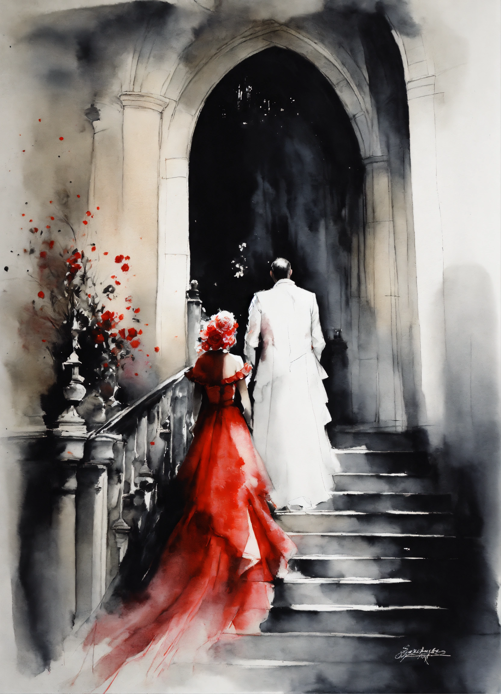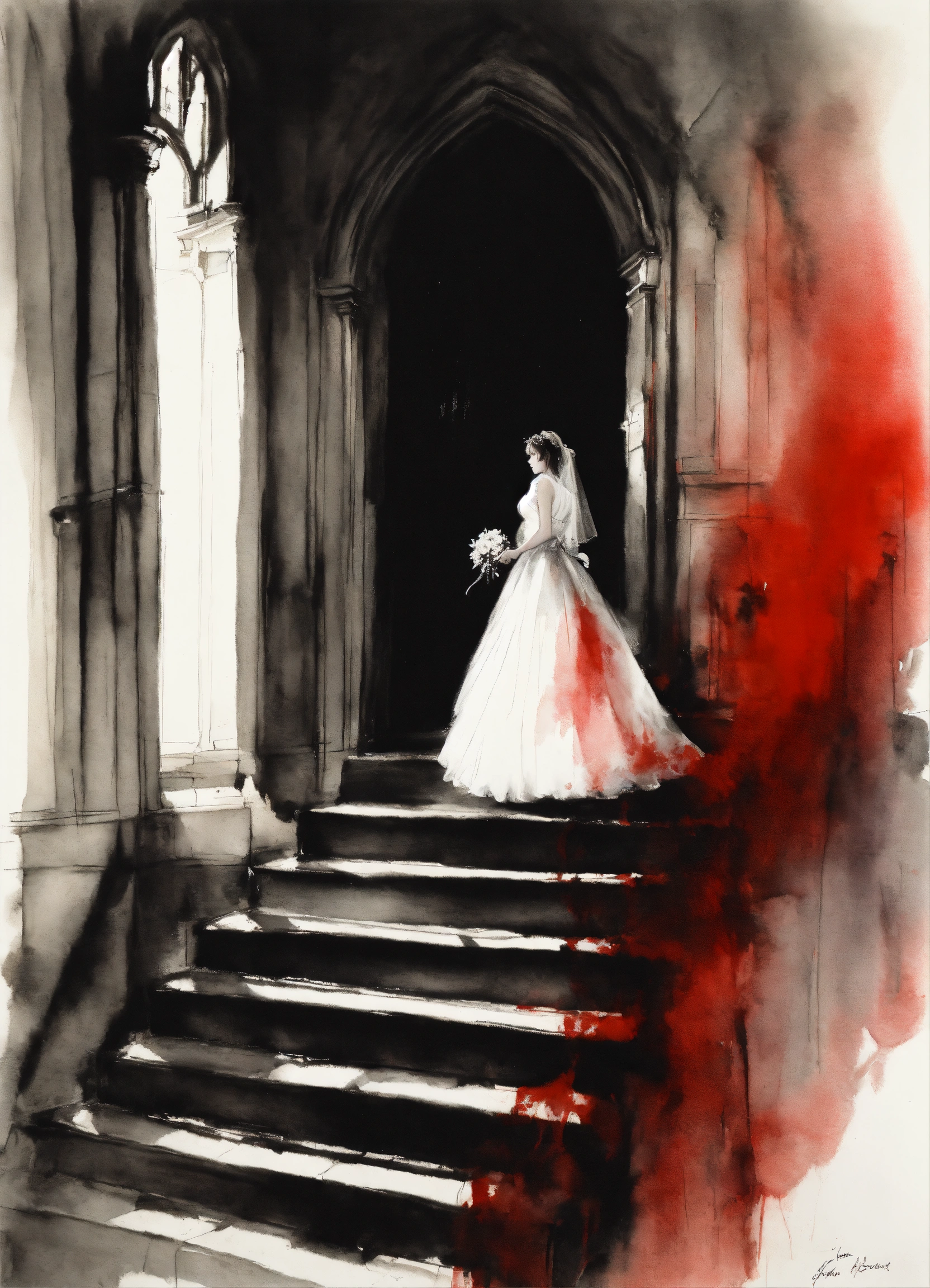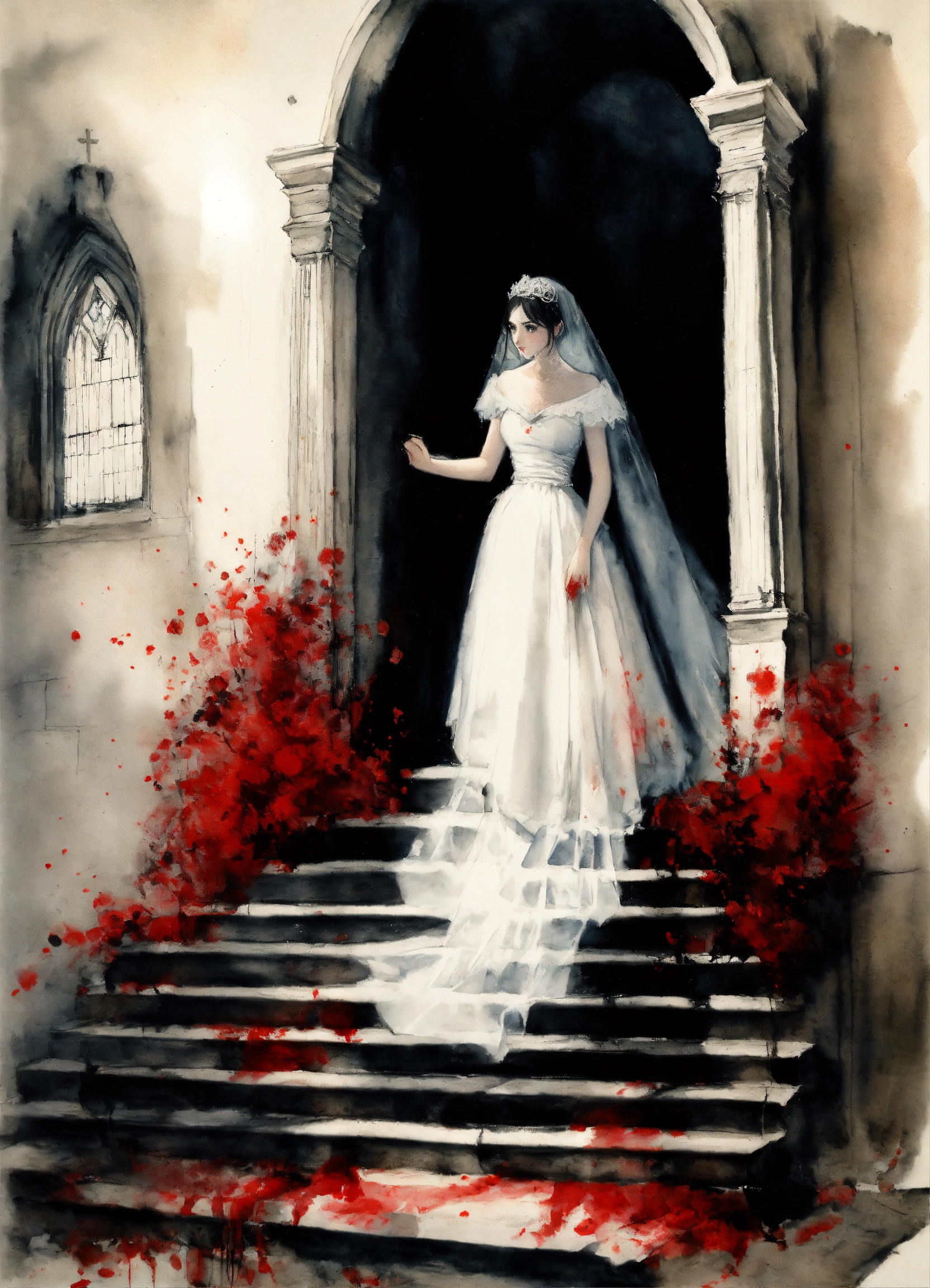 Stephen gammell style, dessin, aquarelle, aquarelles, noir et blanc et rouge, de marais, de sombres créatures, dégoulinant, the bride with a beautiful white dress and the groom climbs the steps of the church