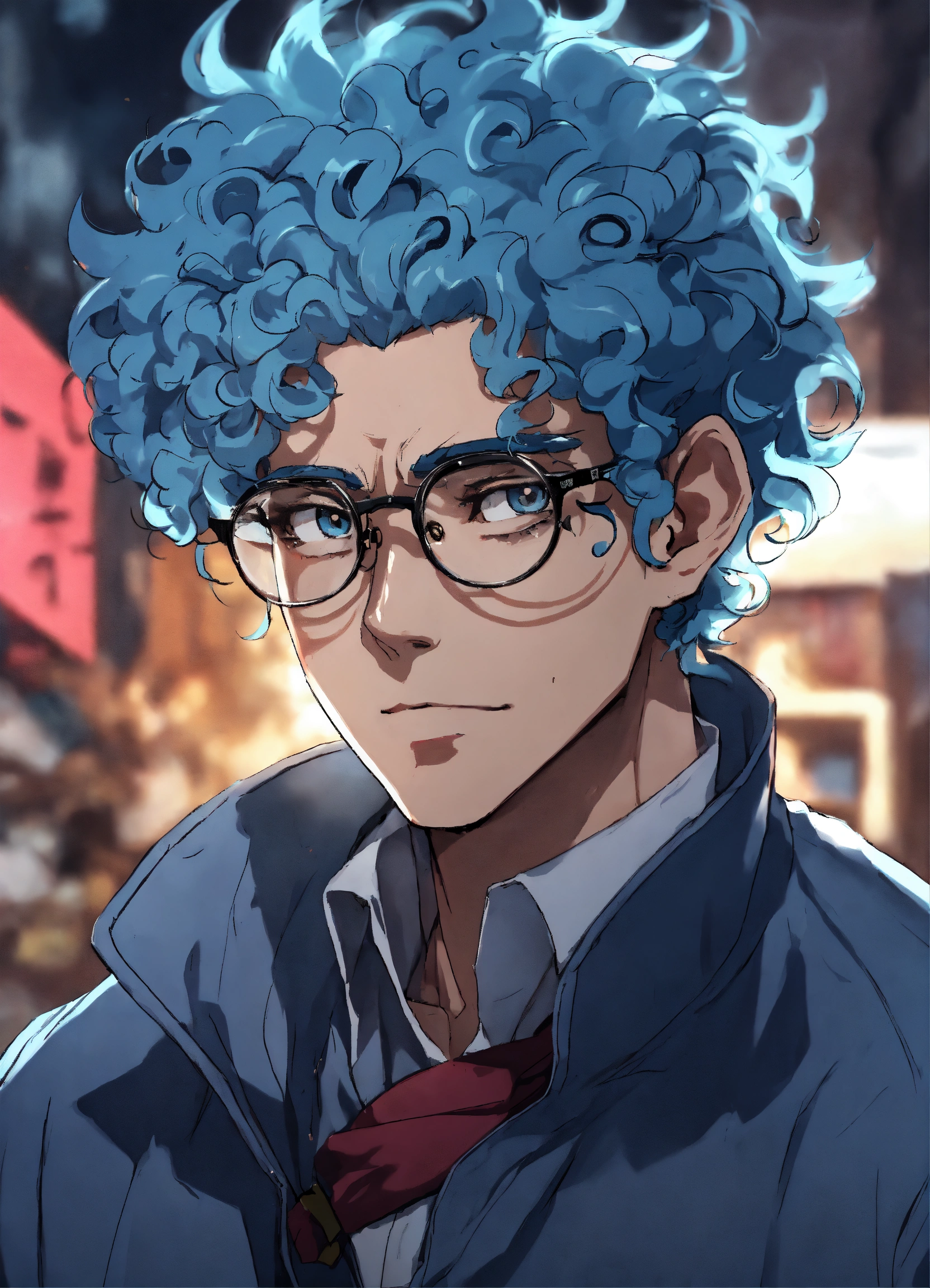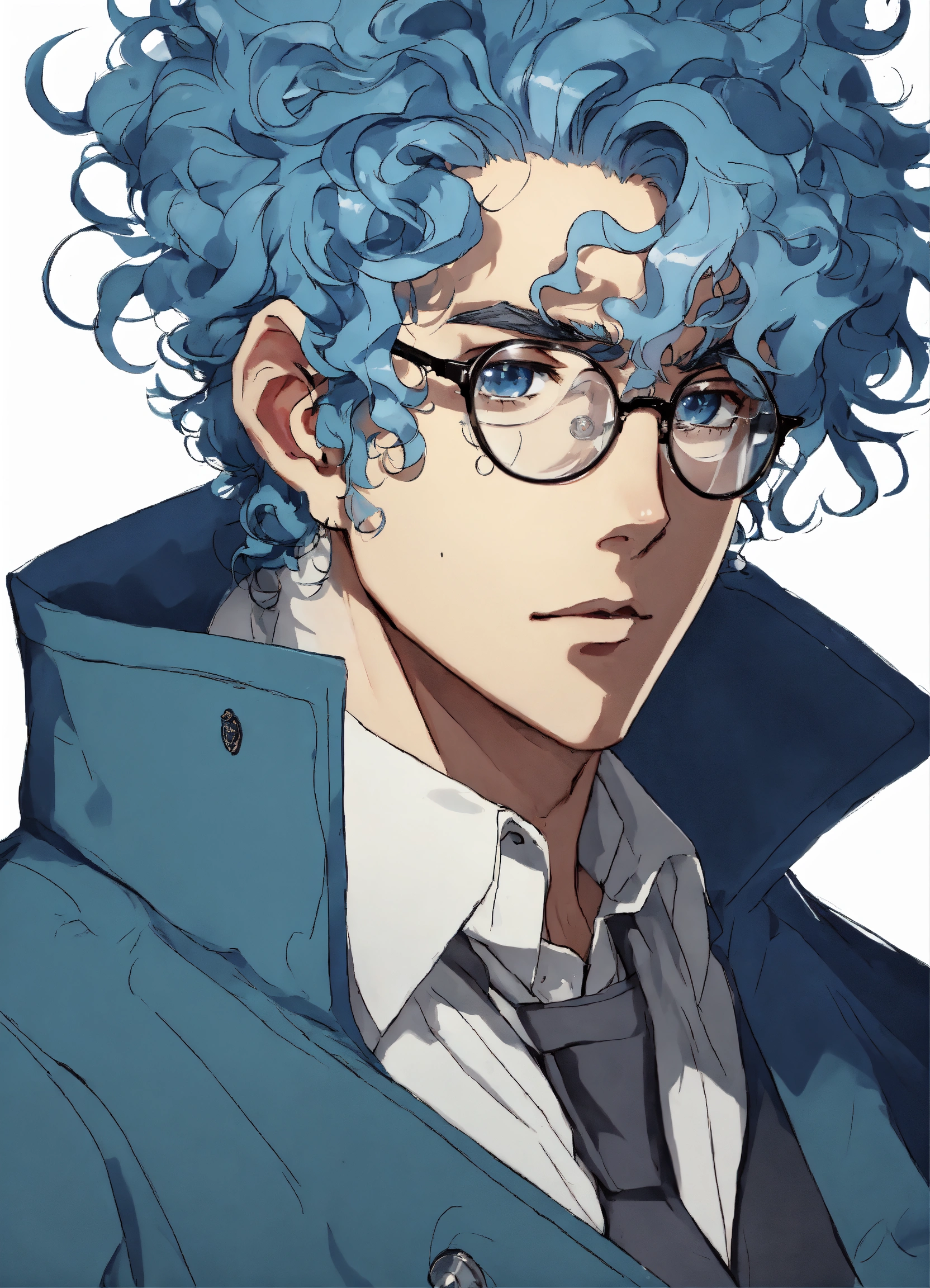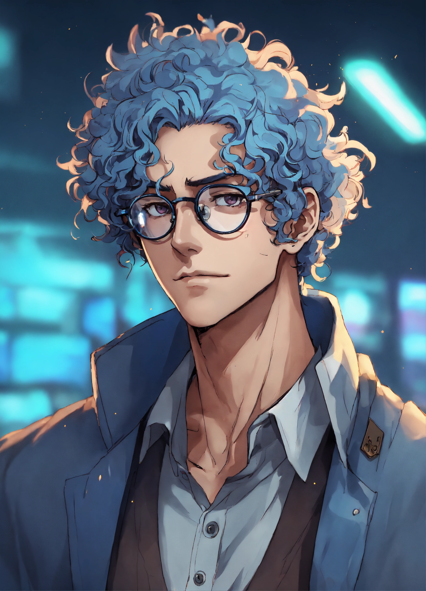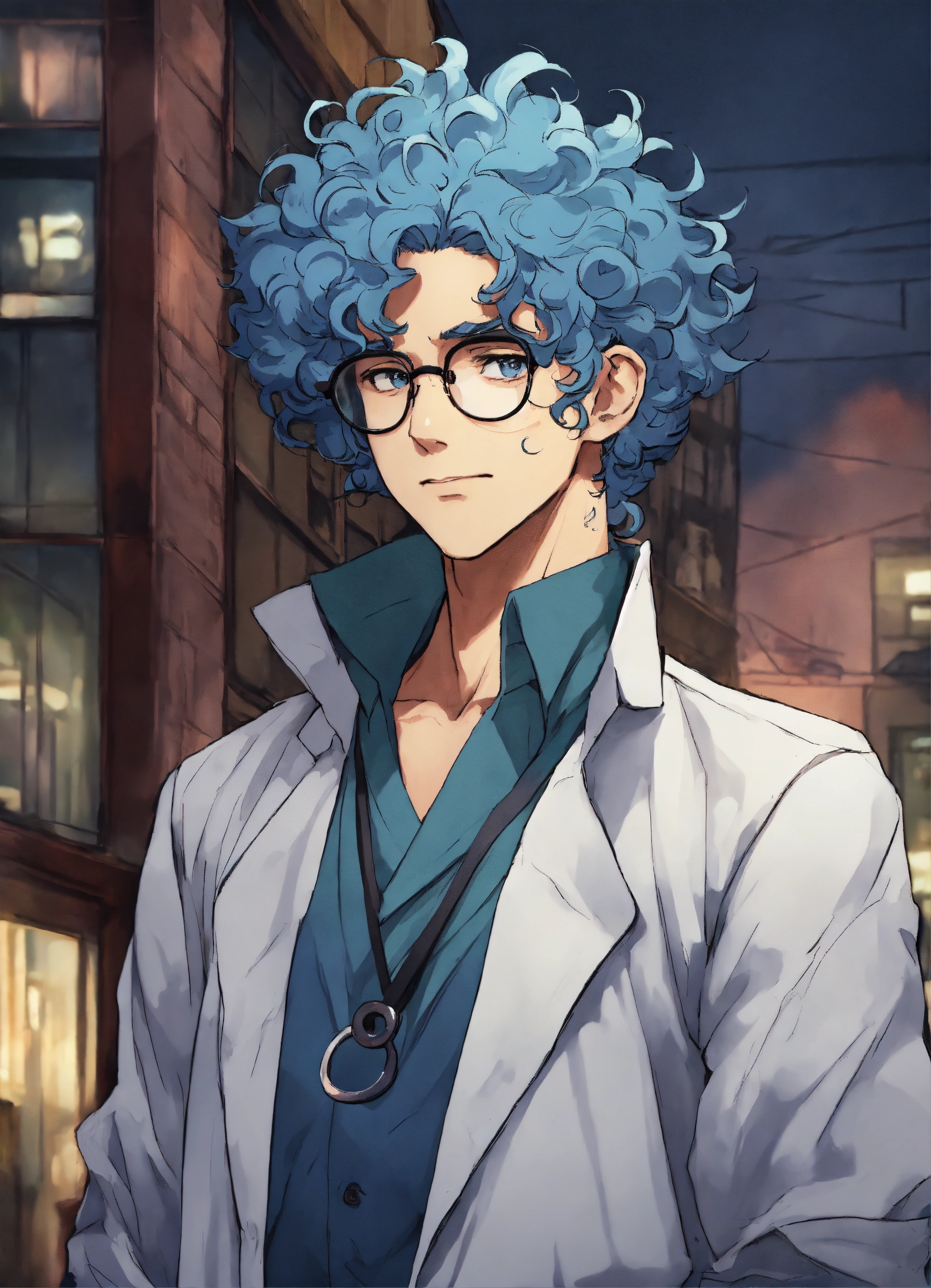 a shrewd male criminal scientist with curly blue hair and spectacles