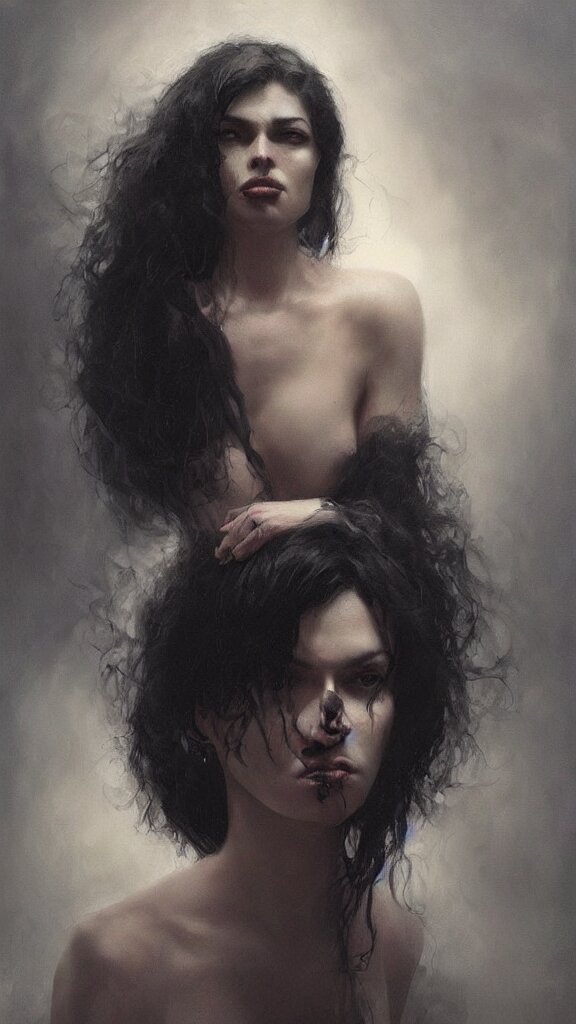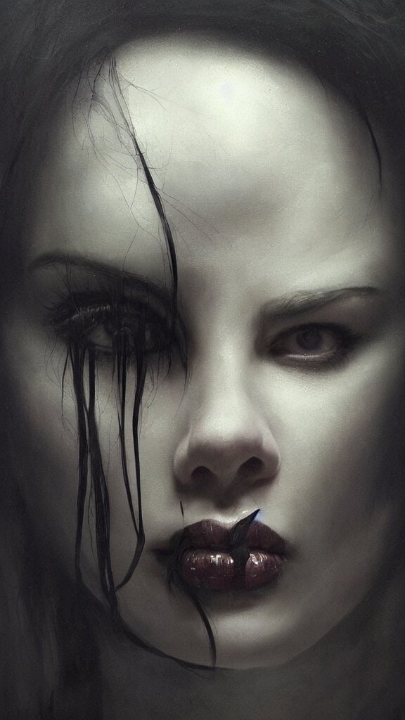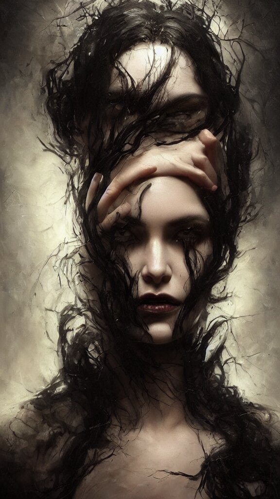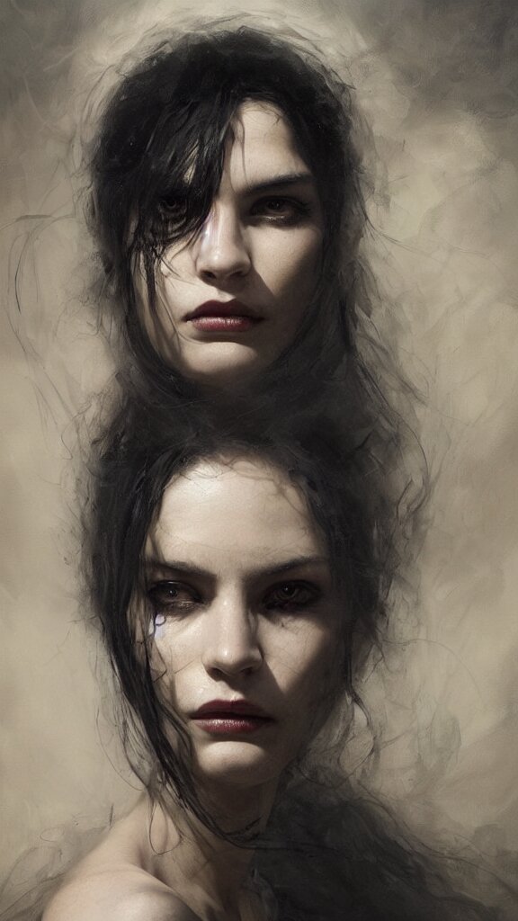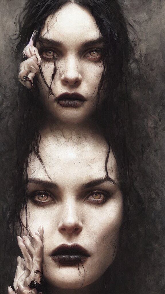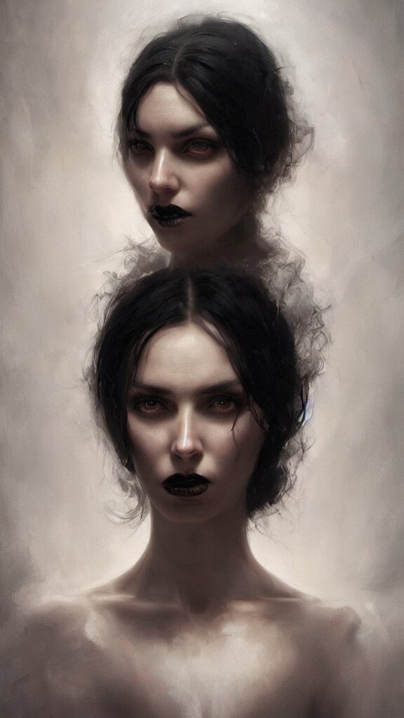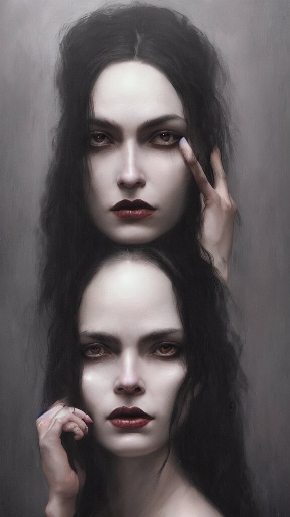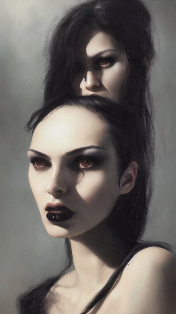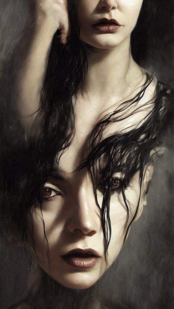 Face of a beautiful woman with very black hair, intimidating woman, large black eyes, high forehead, smooth pale skin, ethereal skin, ominous, eldritch. oil painting by nuri iyem, james gurney, james jean, greg rutkowski, highly detailed, soft lighting, chiaroscuro