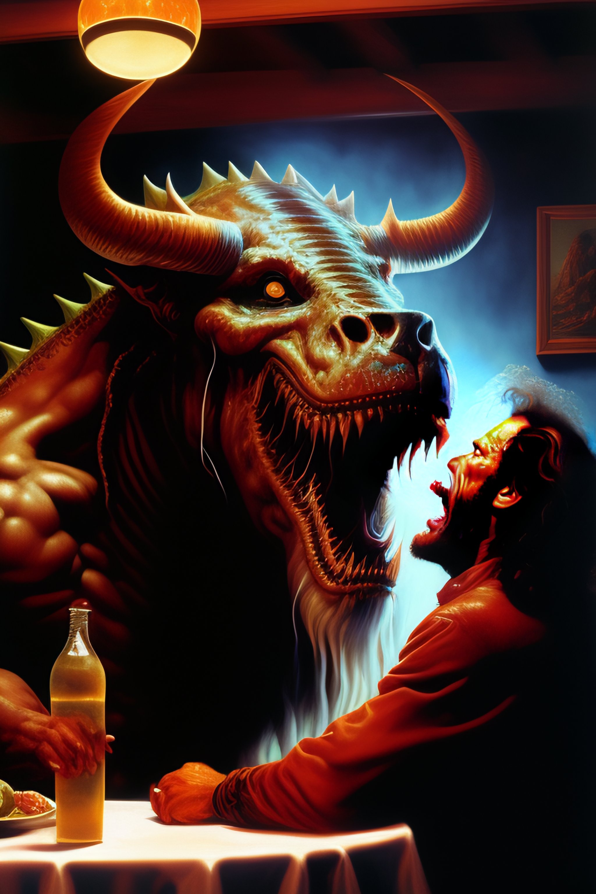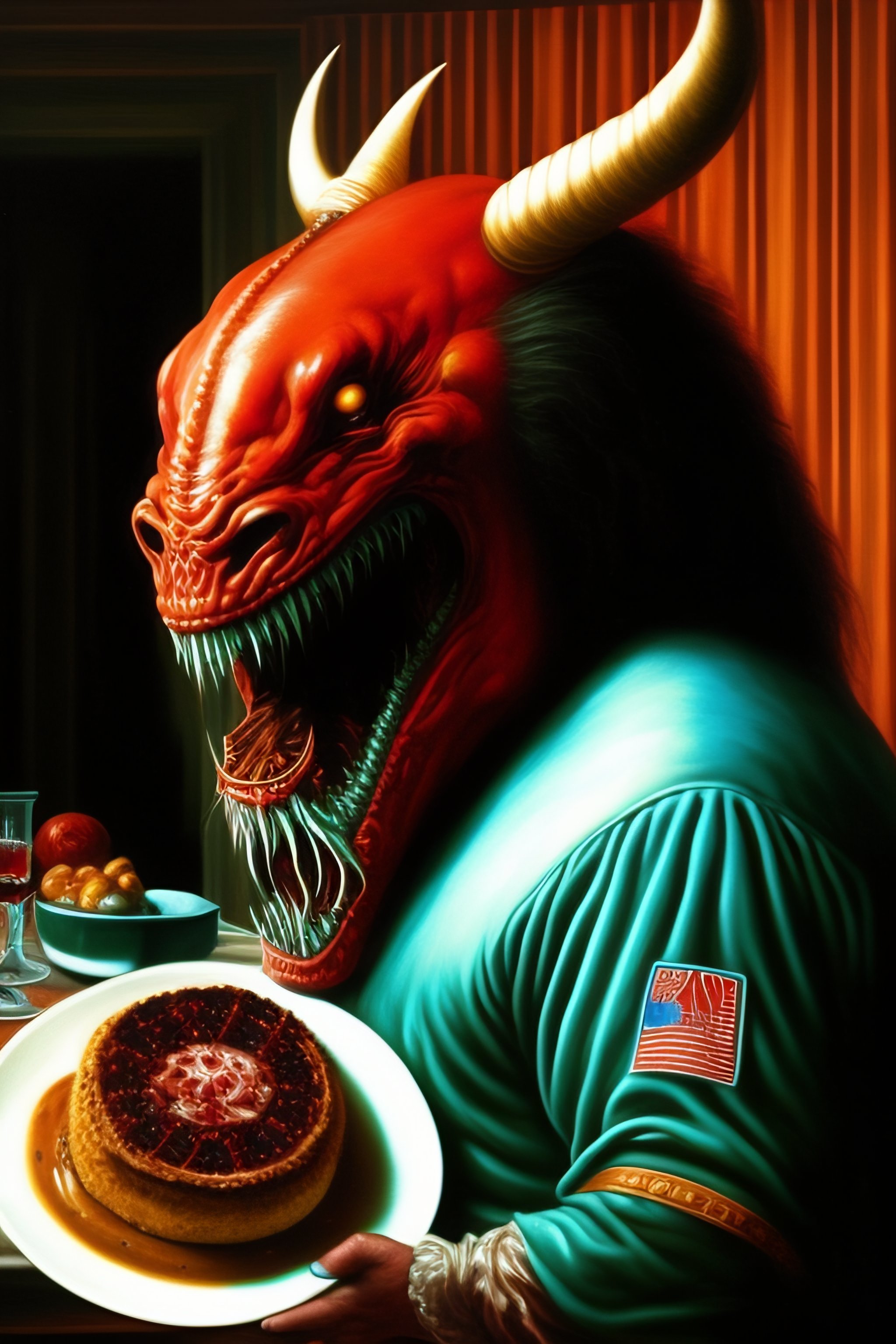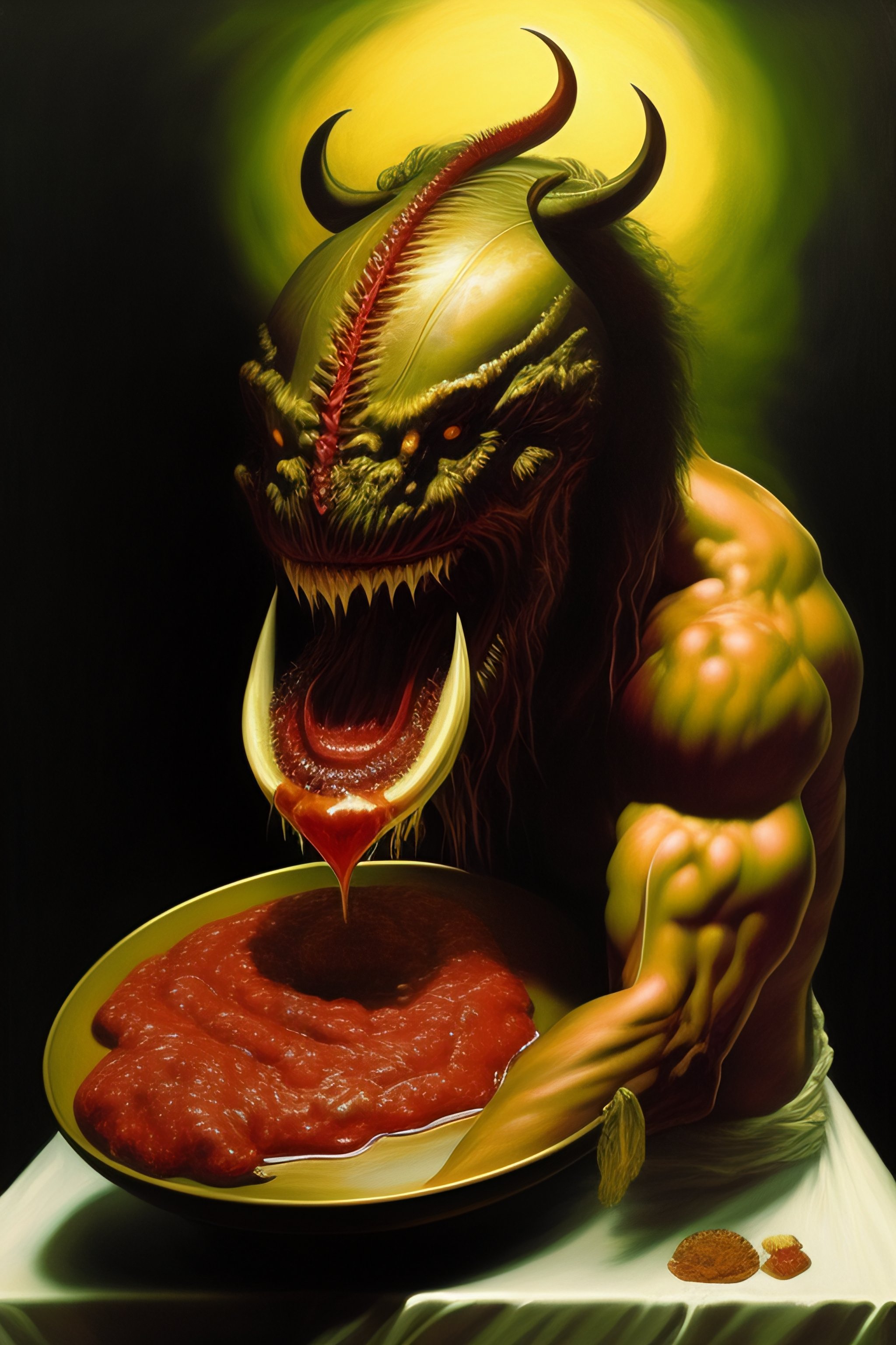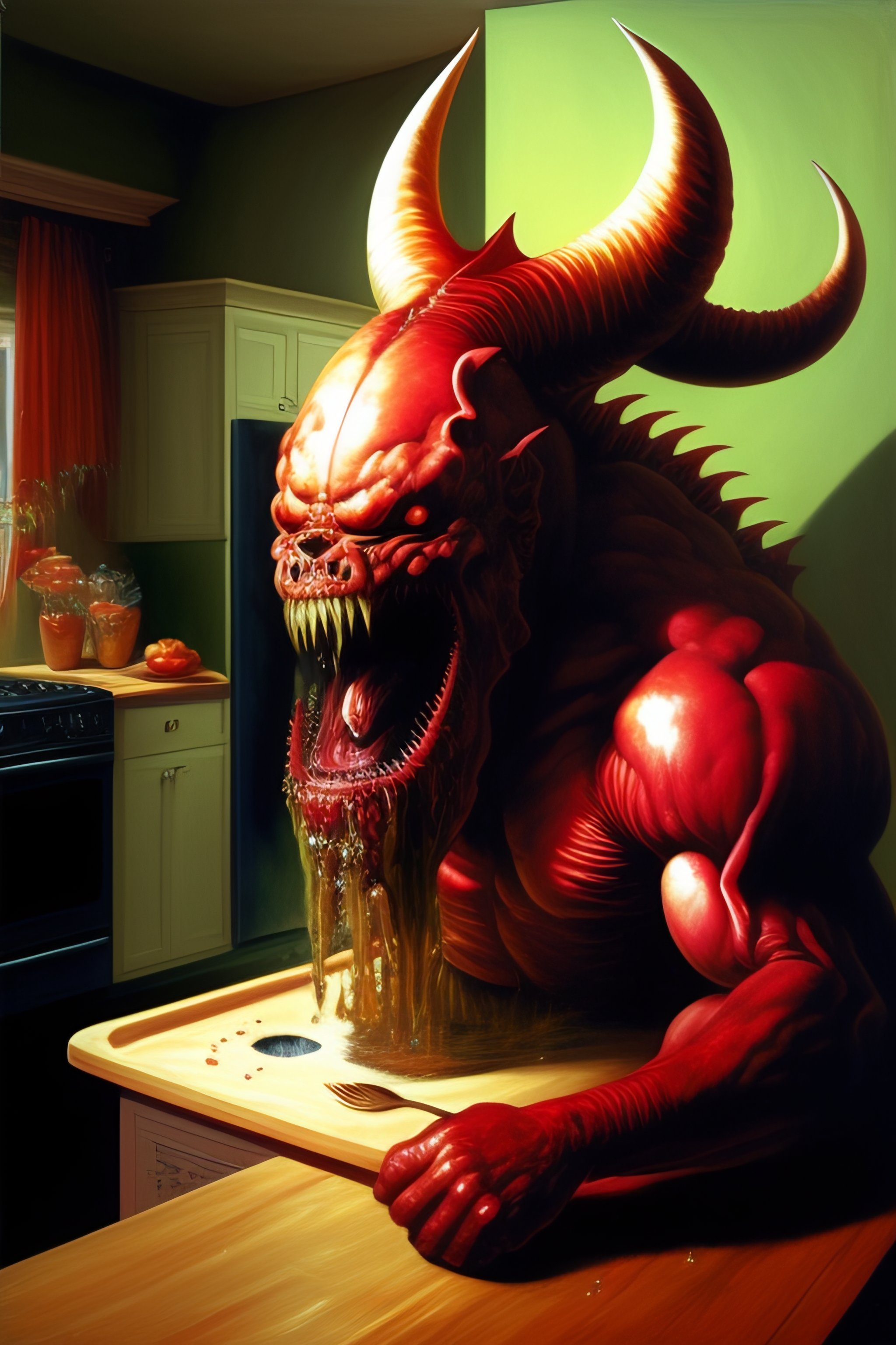 Michelangelo painting of a disgusting demon monster eating a man, cult horror, kitchen inspired by the thing, by greg nicotero