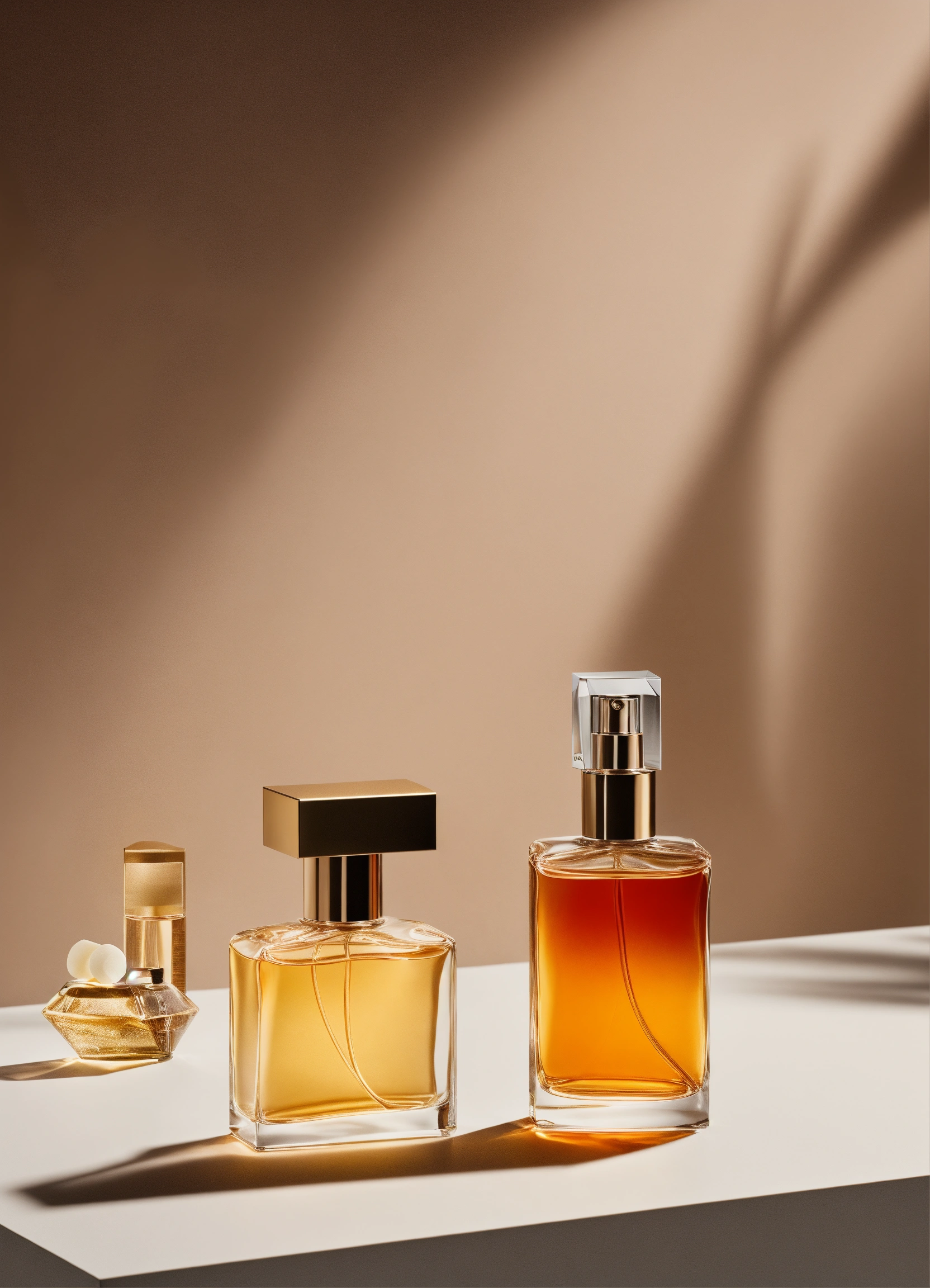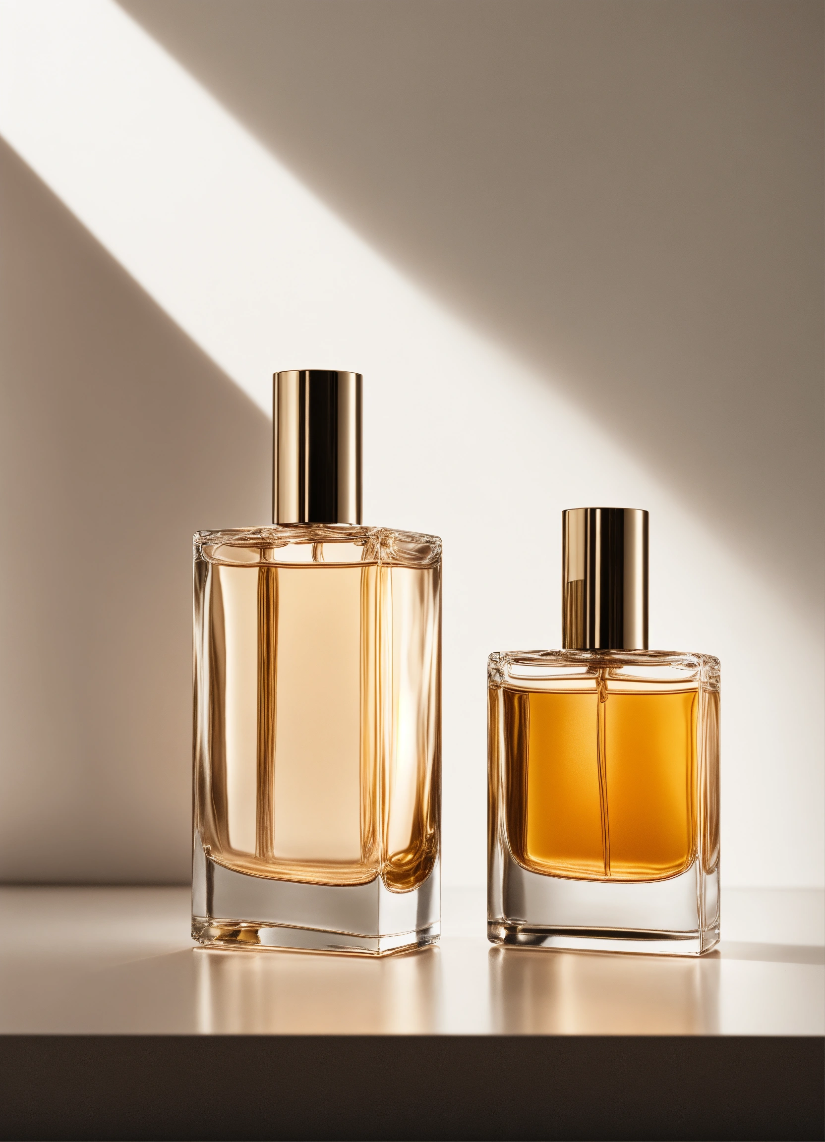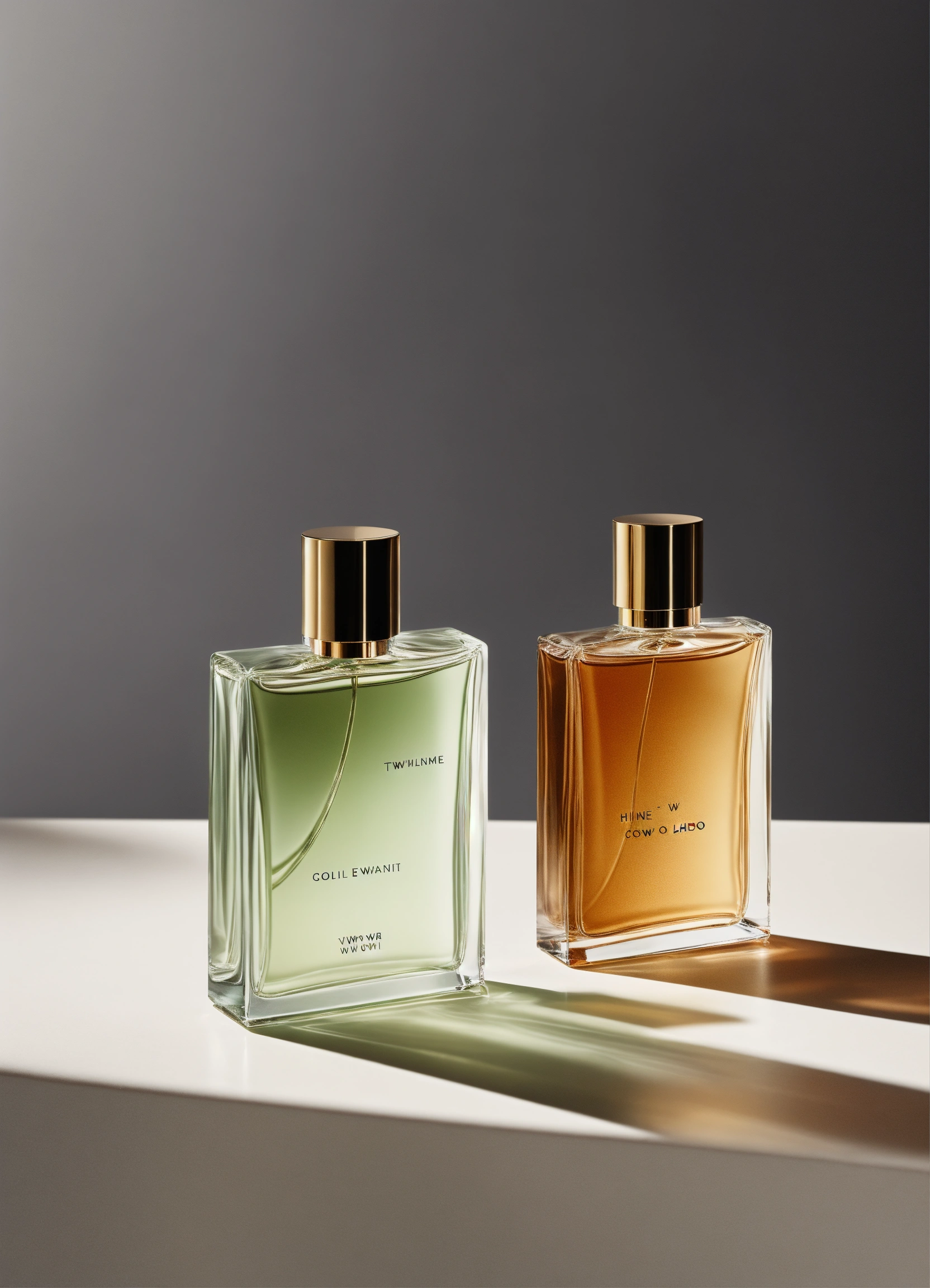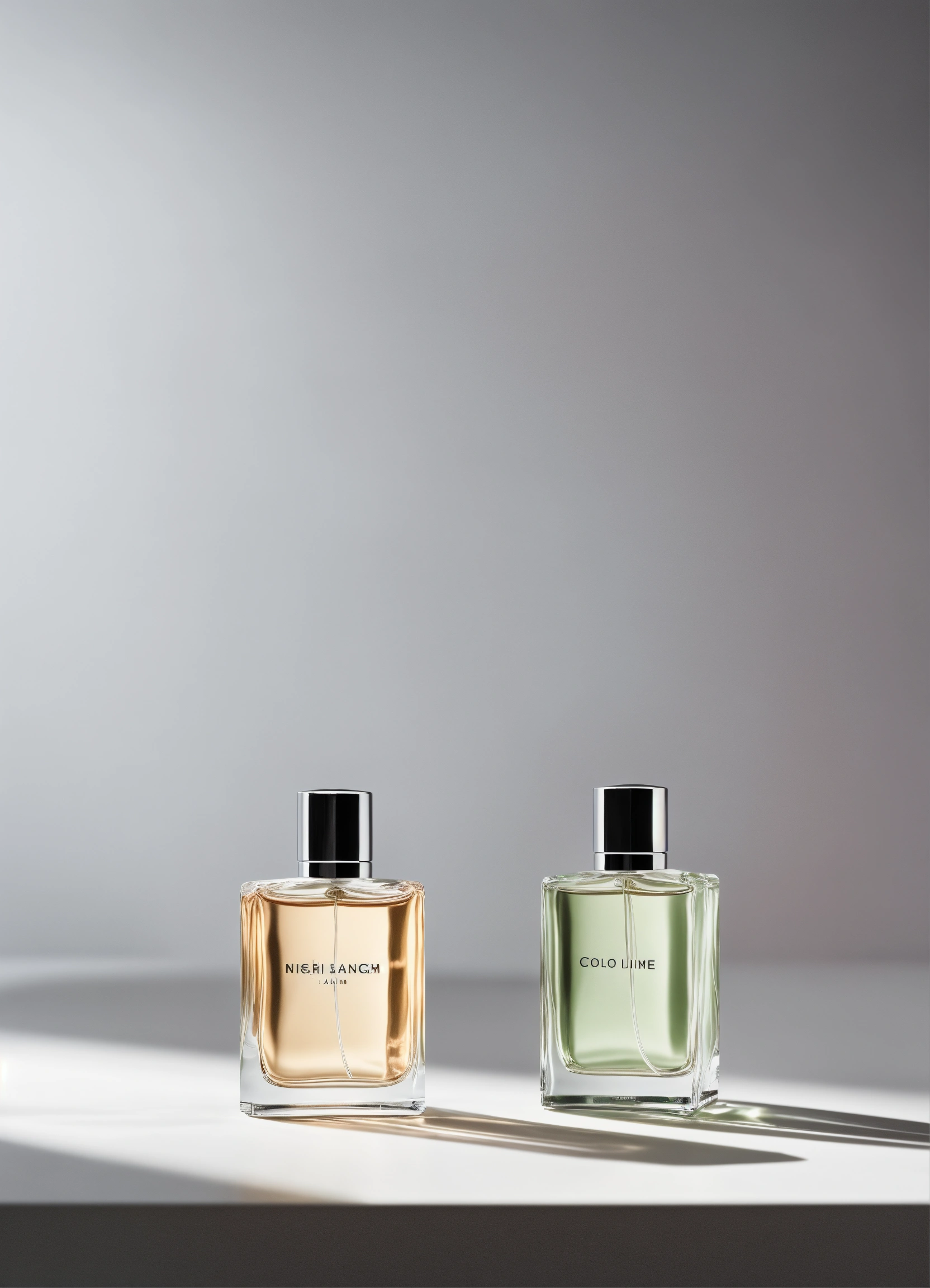 Minimalist two fragrance bottles on white background cologne studio lighting high-end finish