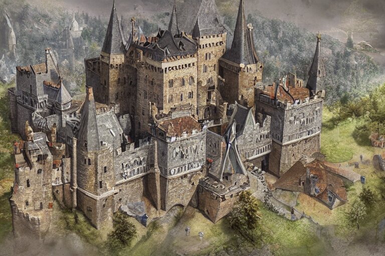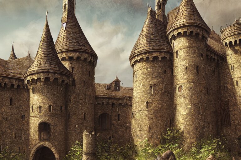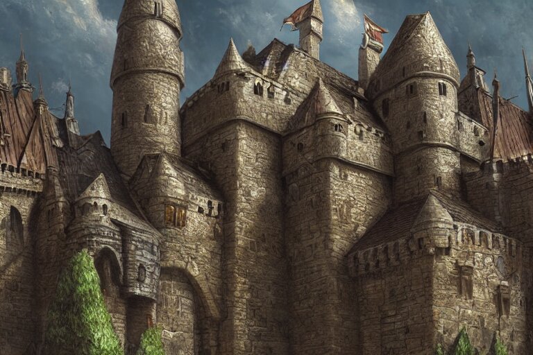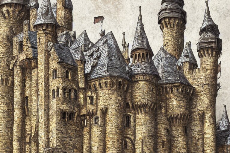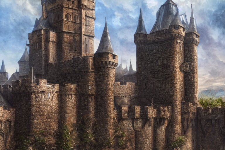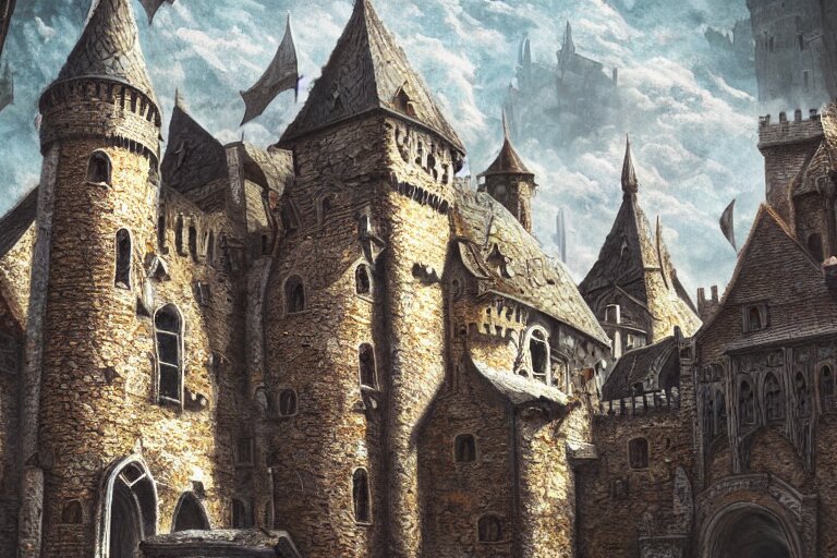A medieval castle, texture, intricate, details, highly detailed, masterpiece, architecture, building, trending on artstation, focus, sharp focus, concept art, digital painting, fantasy, d&d, tabletop, rpg, roleplay, sunny, day, midday, photograph, still