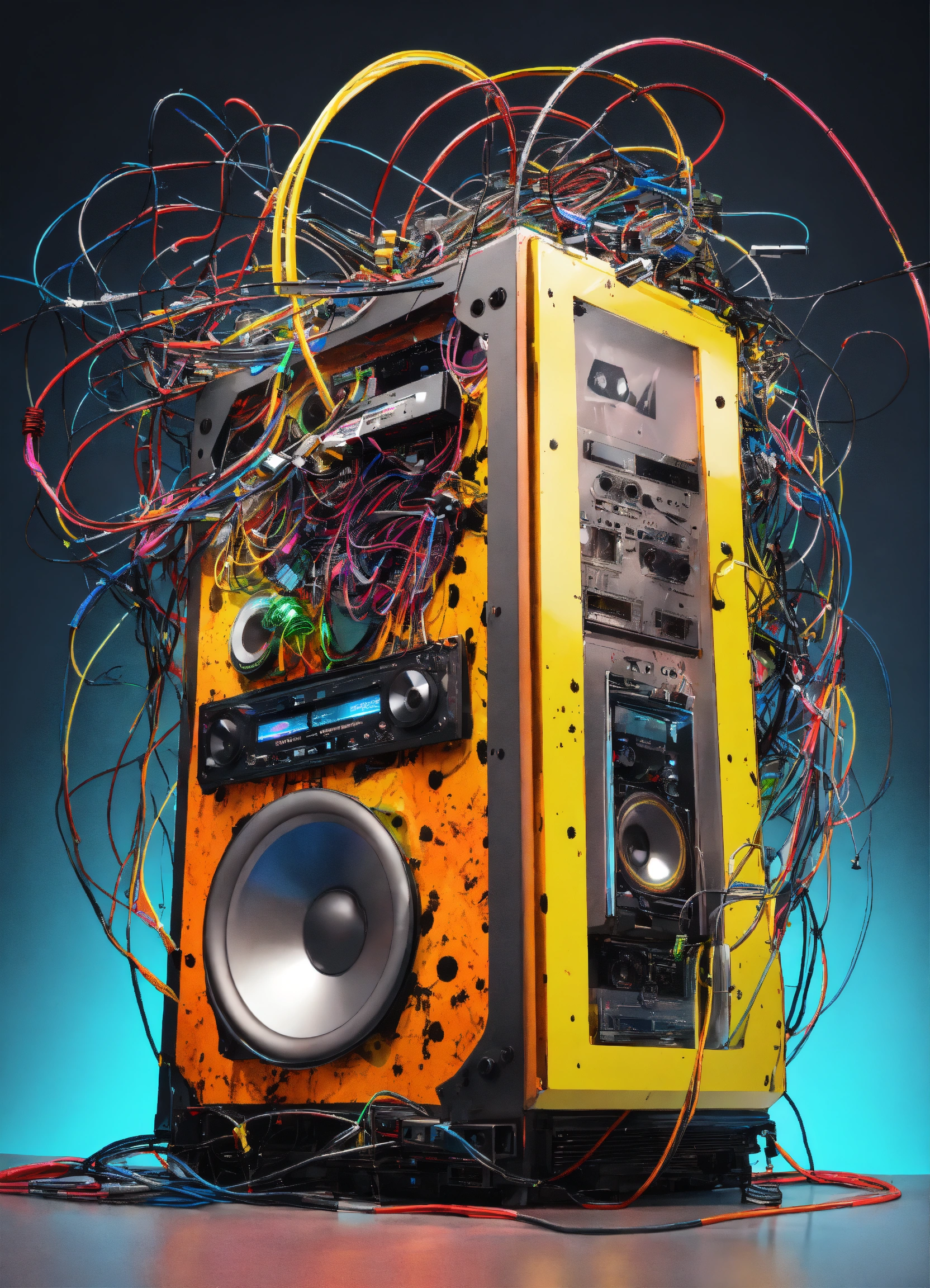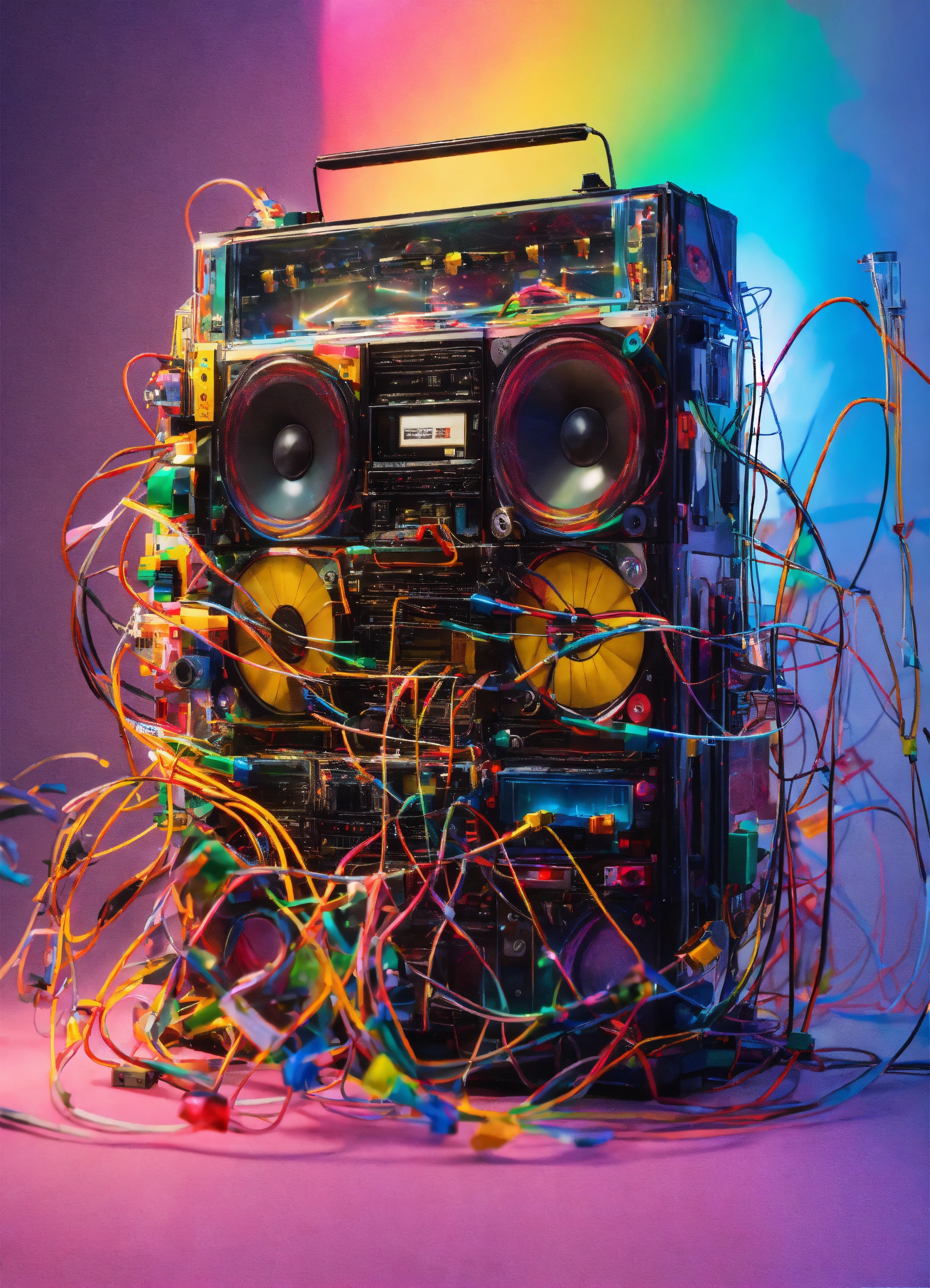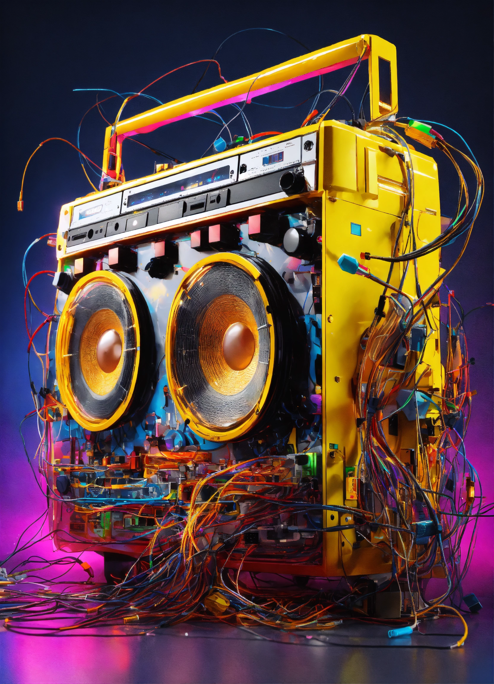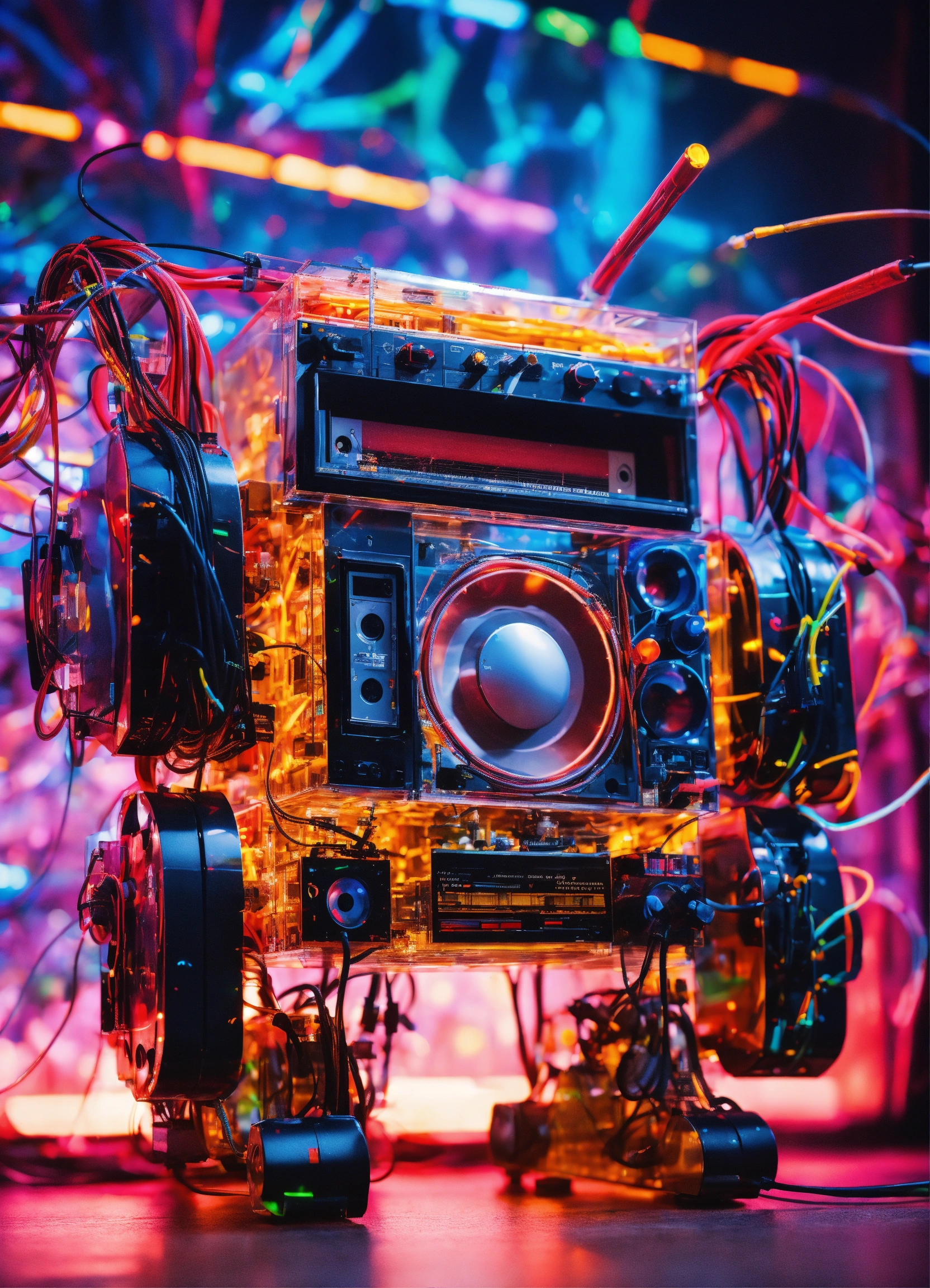 Bright color low-angle view shot photography of a flying huge 3d plexiglass multi cassette ghetto blaster robot full of cables and wires, with big boomers, emerges from spiral black ink splatters, 80 degree view