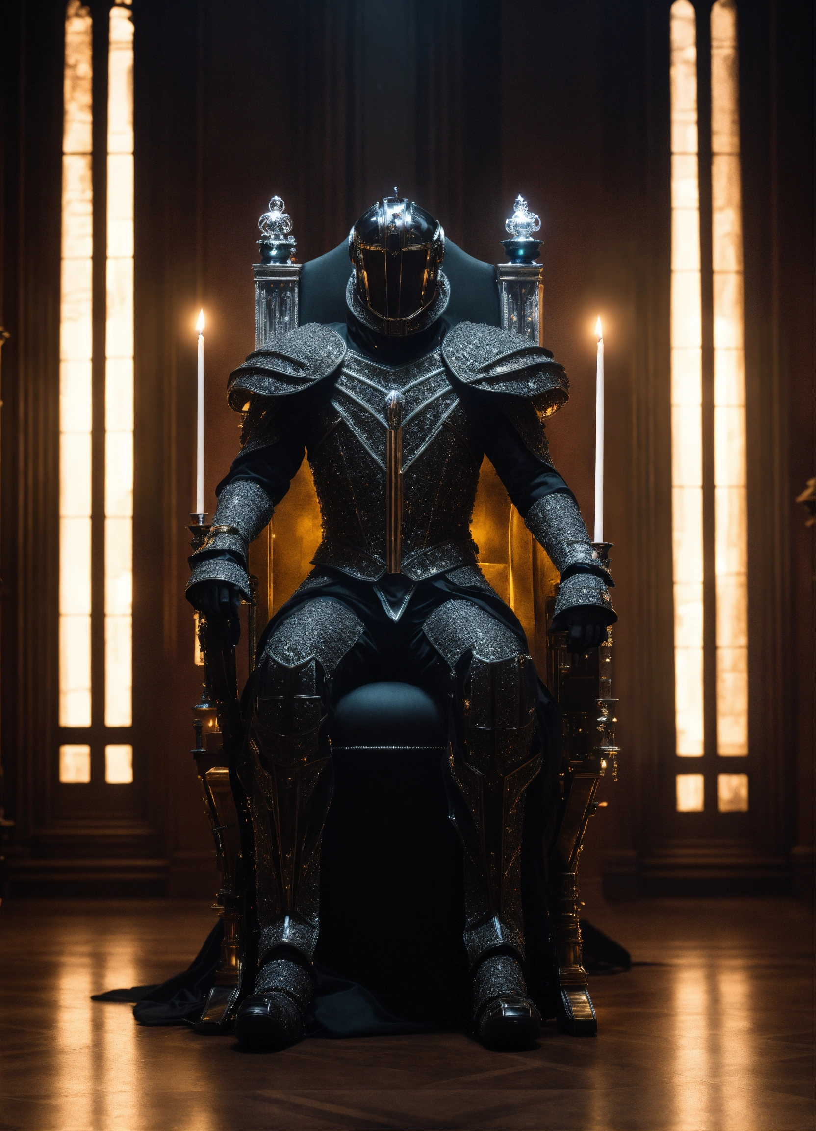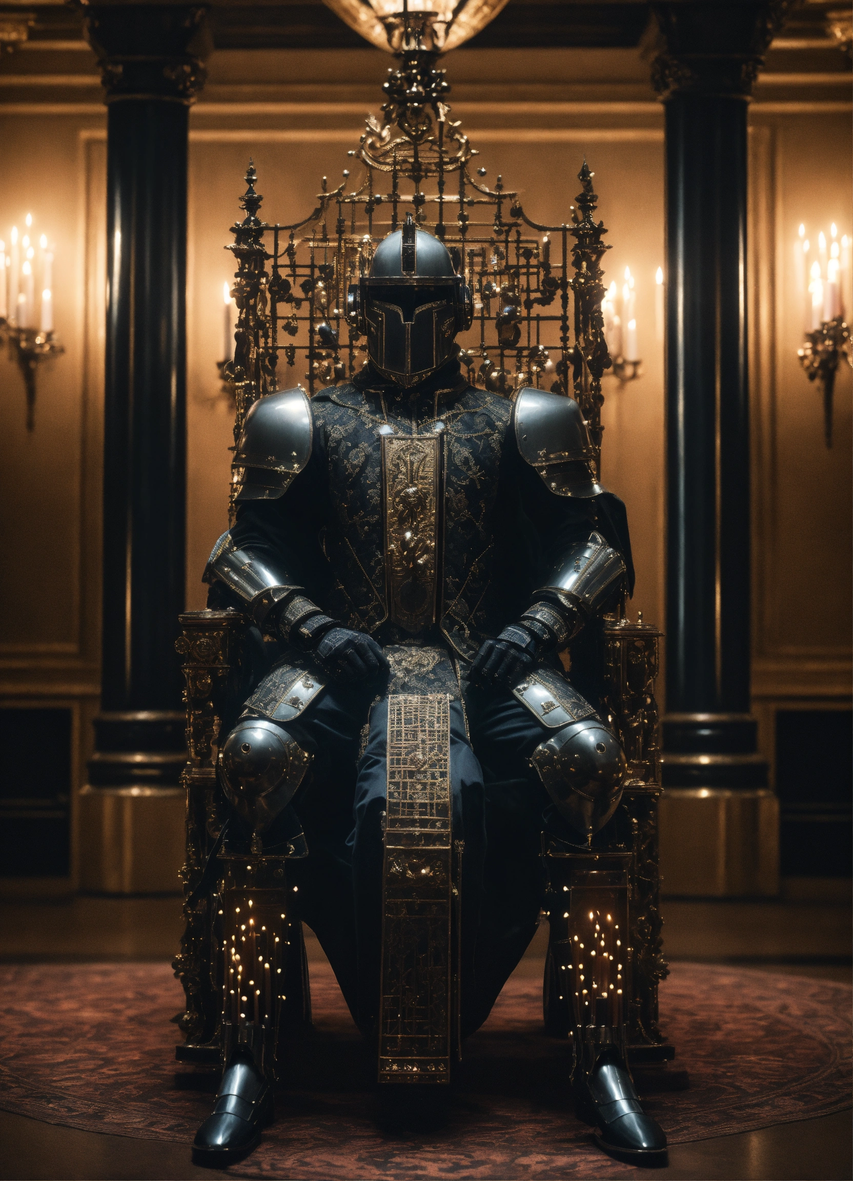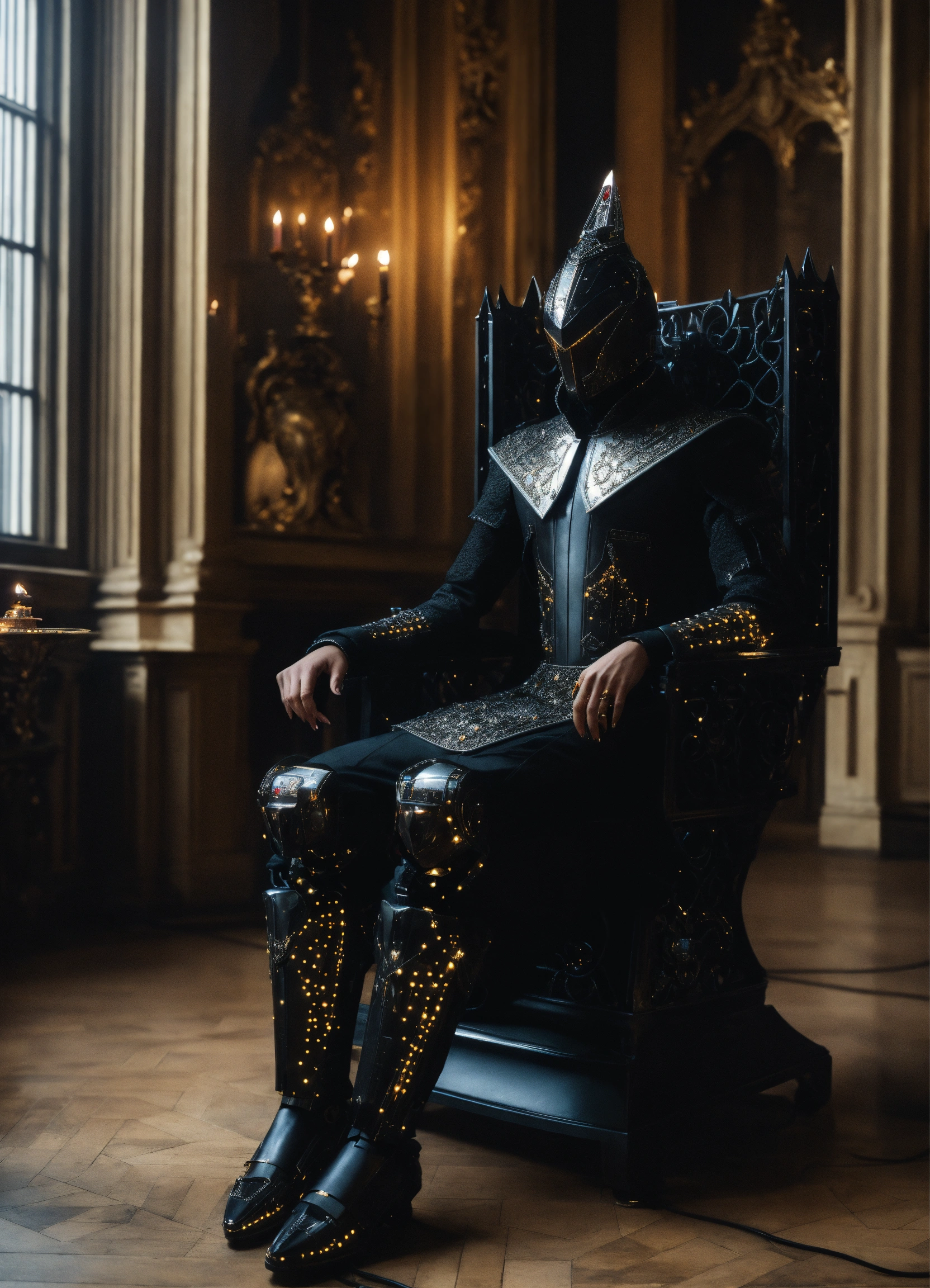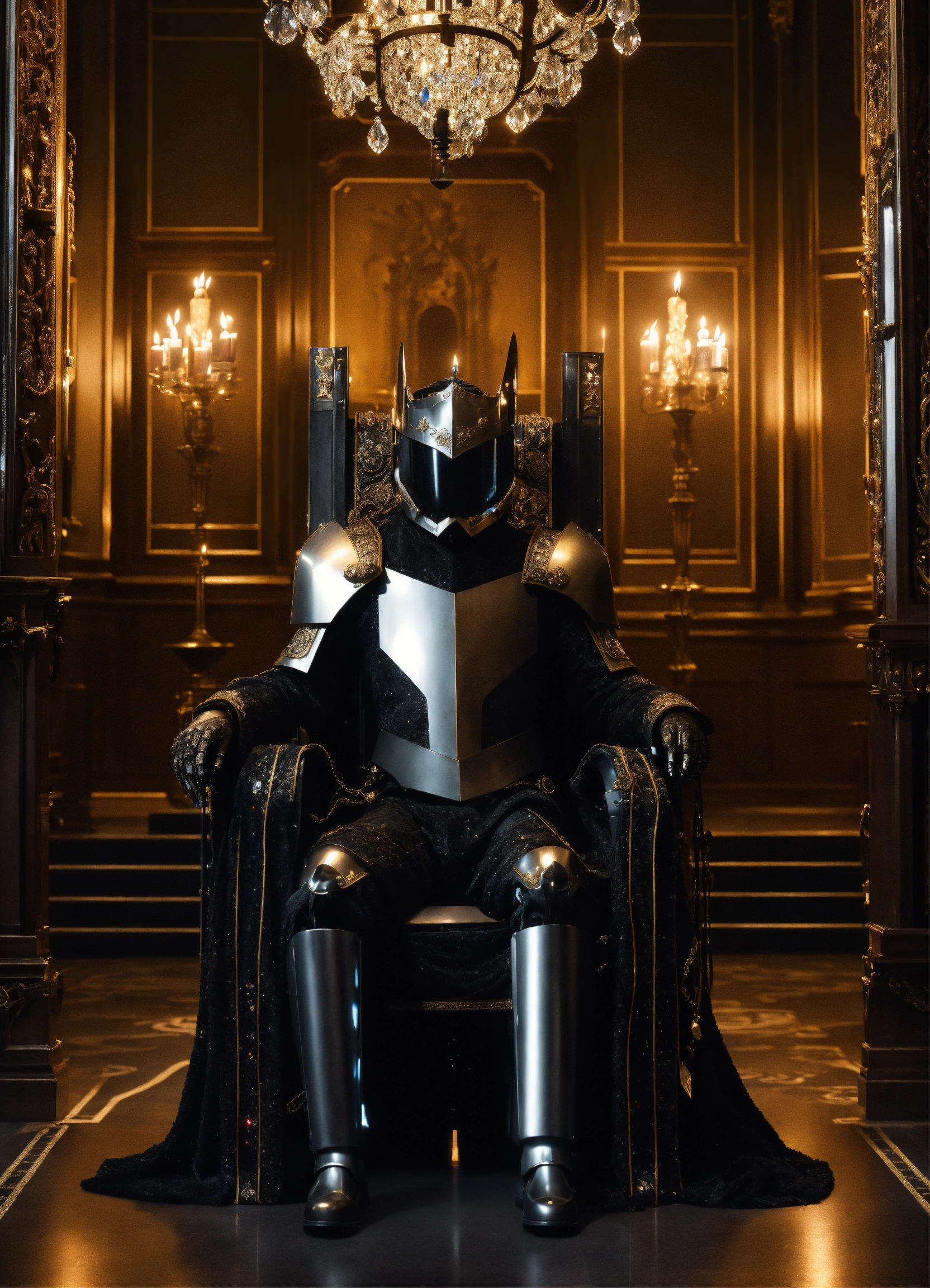 An ultrarrealistic distant photograph of a futuristic medieval king style power suit, made of black mate metal and polymer, full crystal hull, for a man, visible wires, sitting in a throne, two robot dogs, imposing, modern minimalism, elegant, dystopia, mysterious, godlike, scary, in a victorian era large palace room whit candle lights, 8k