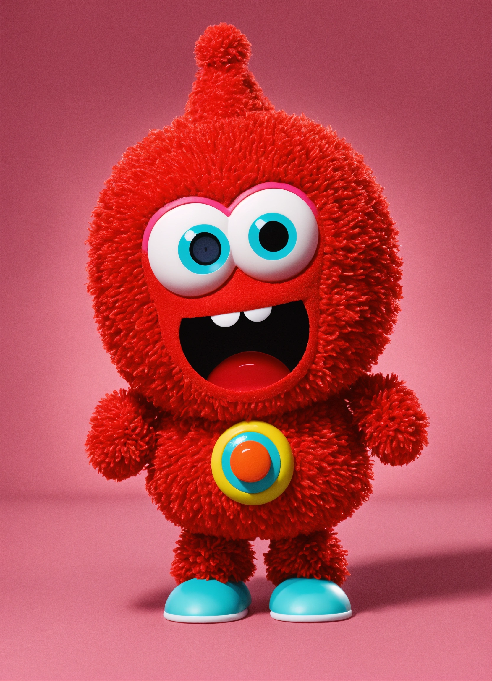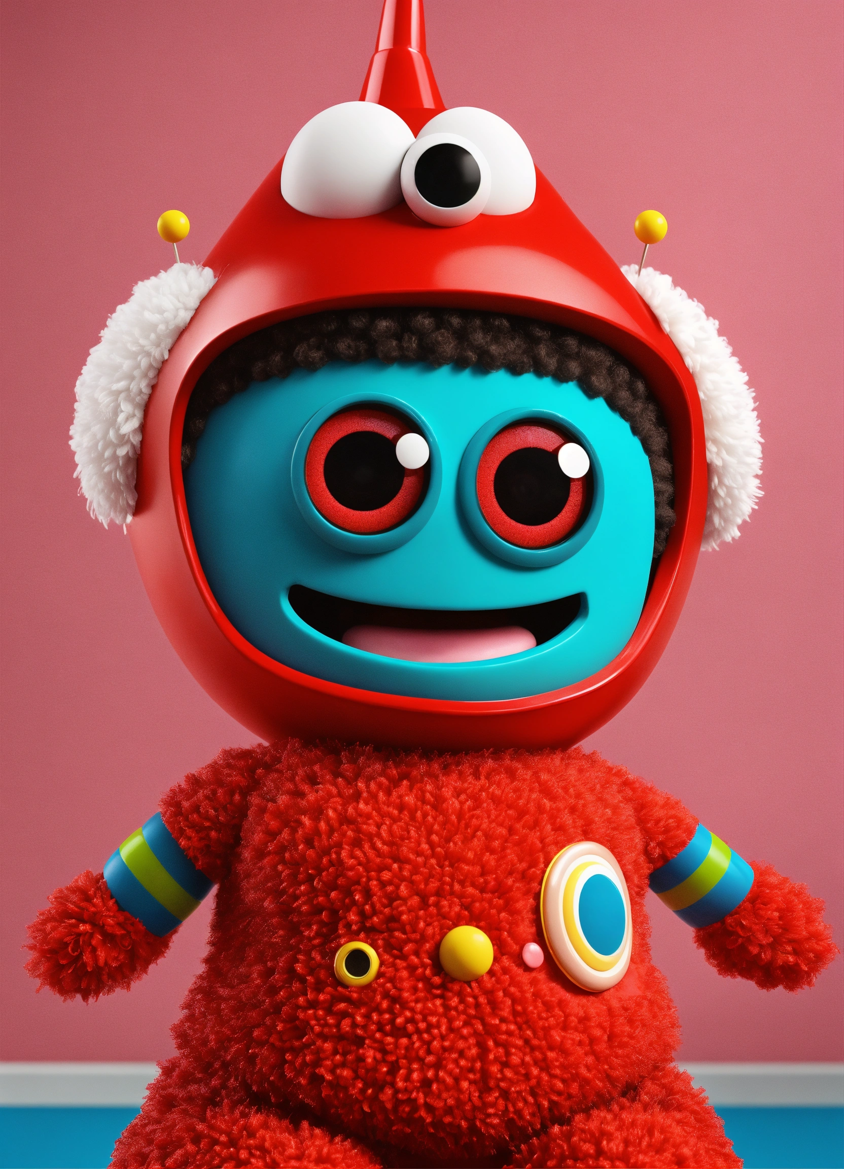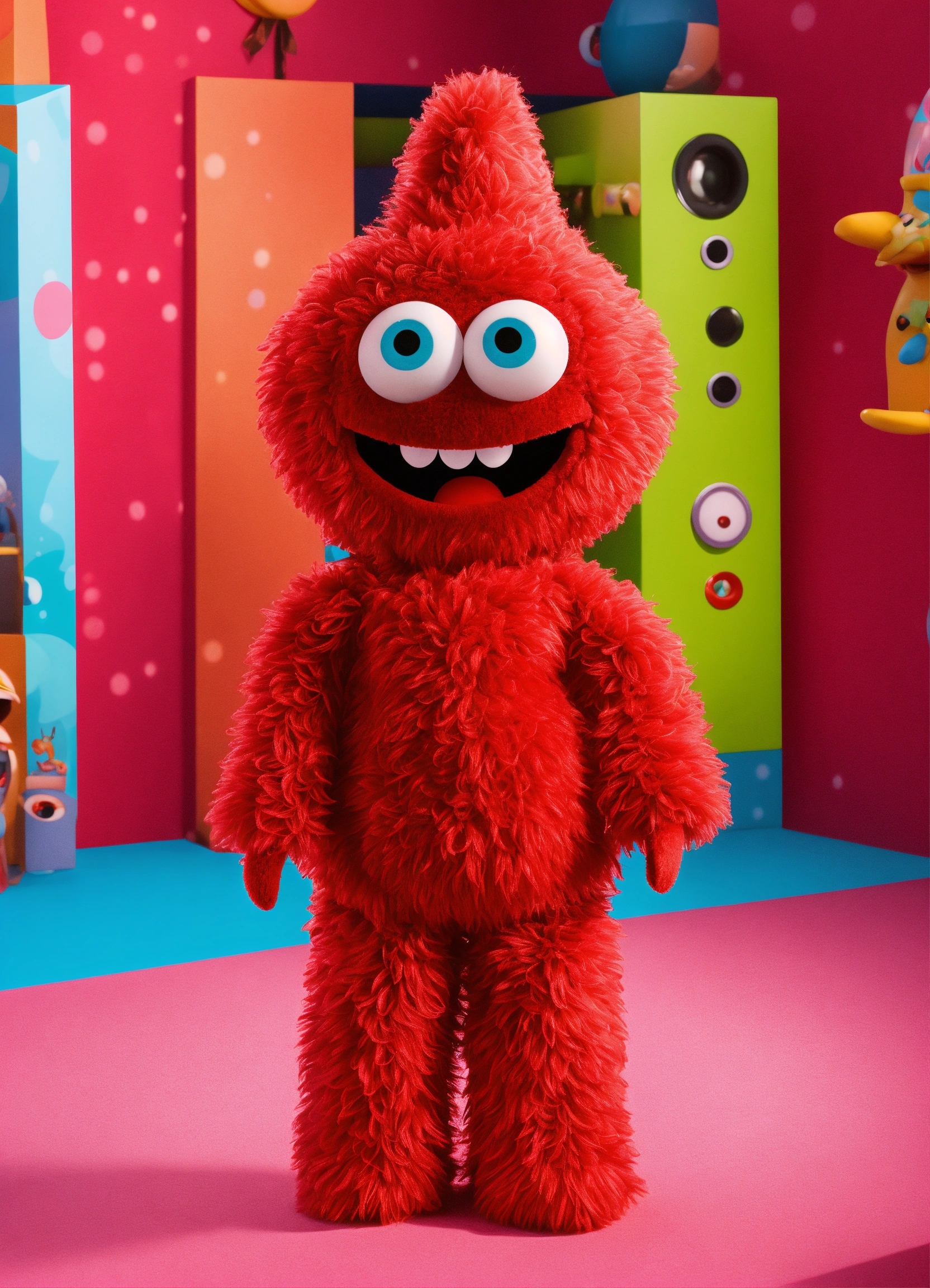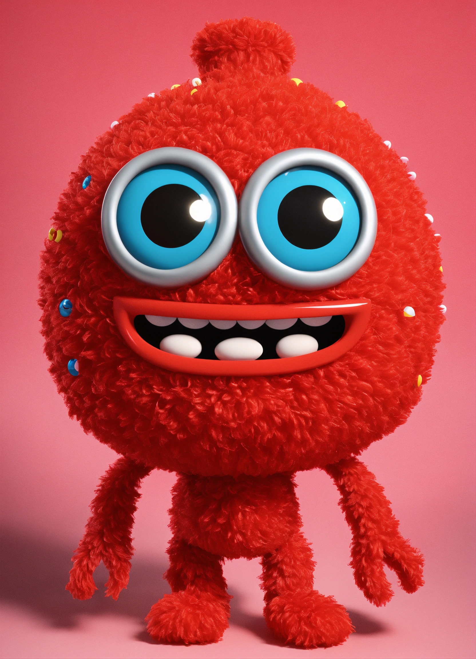 Create a cute yo gabba gabba red female character with cute eyes, playful looking in front of the camera and smiling in 3d