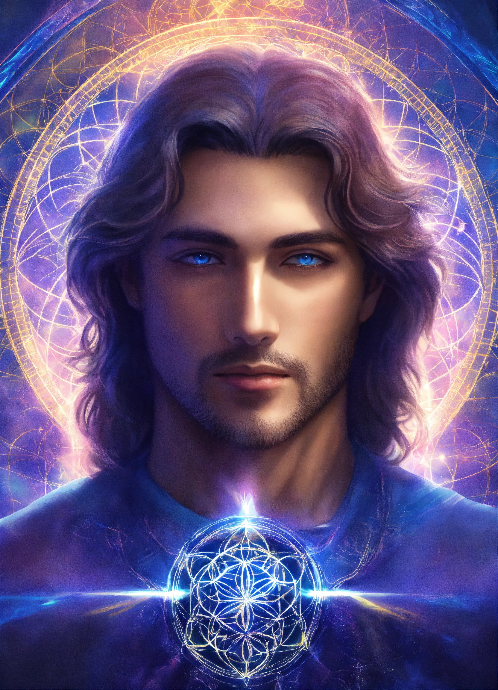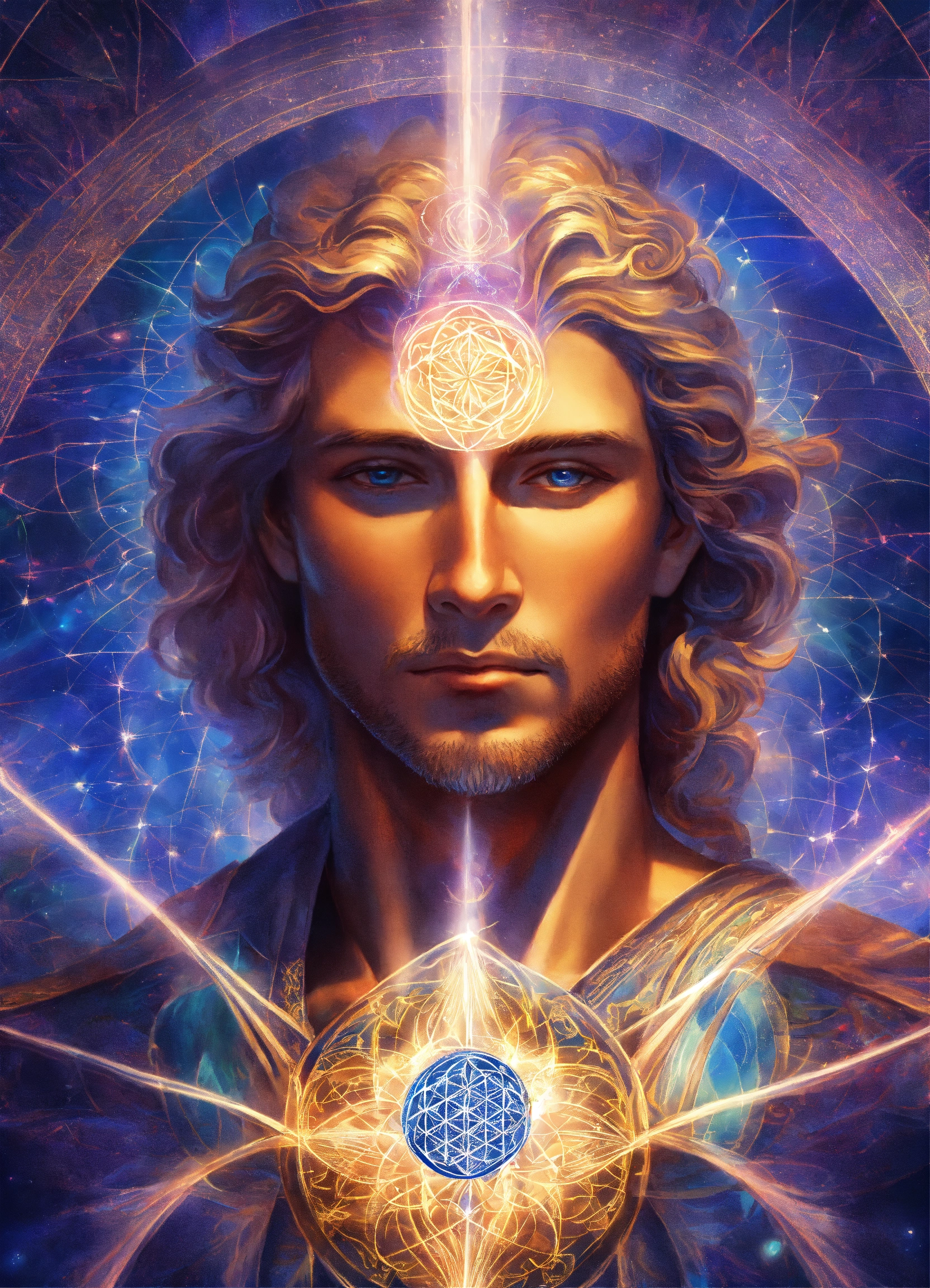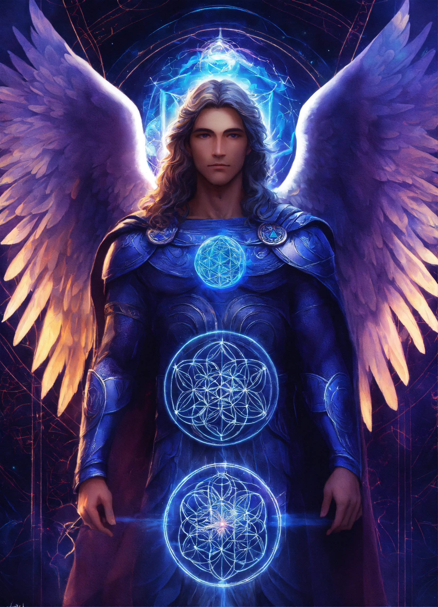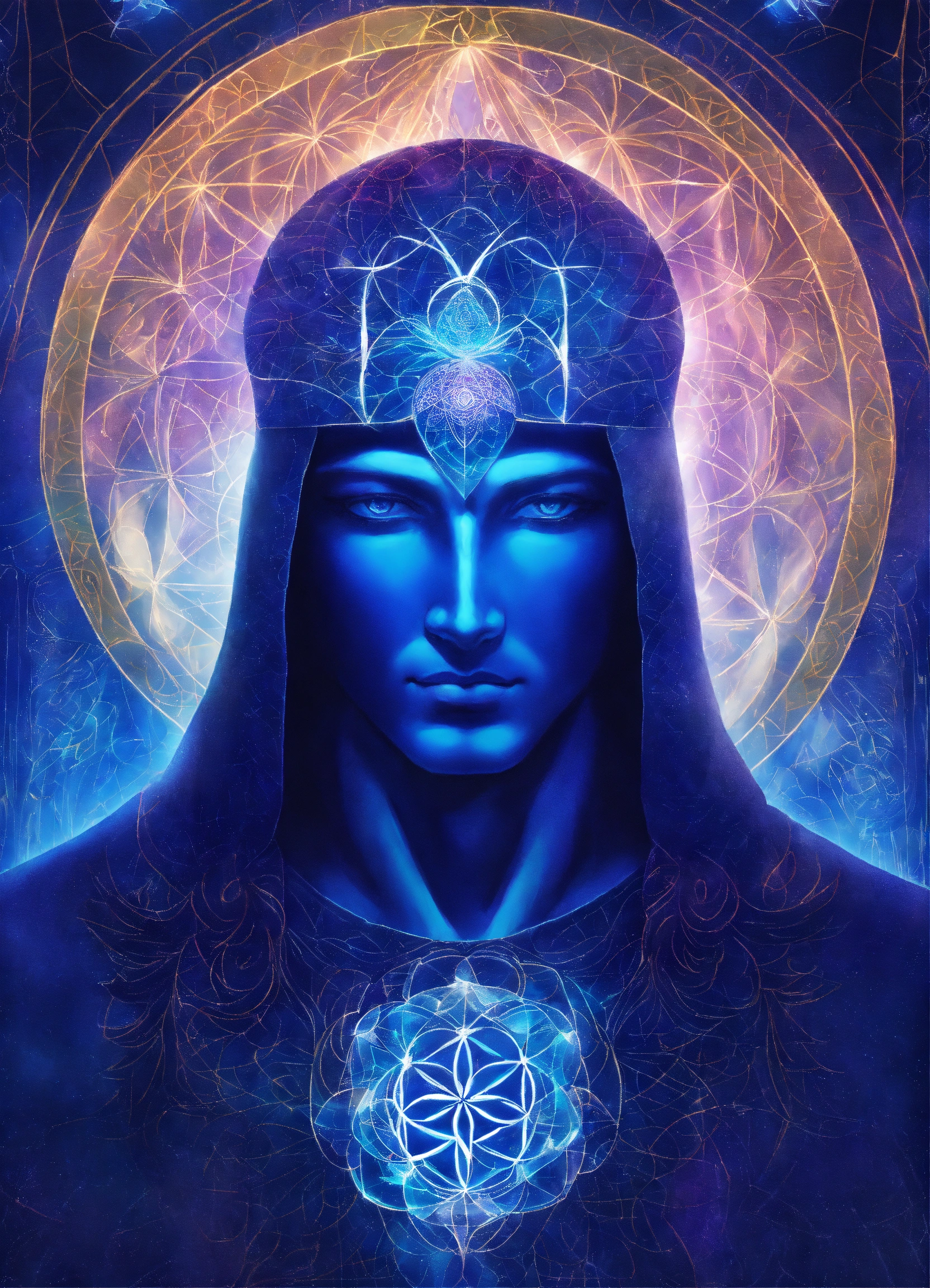 Archangel michael with a middle-aged male face, flower of life in the backround, indigo and sapphire blue light lines, esoteric sigil, prismatic aurora lights, celestial realm, blue swirl of light