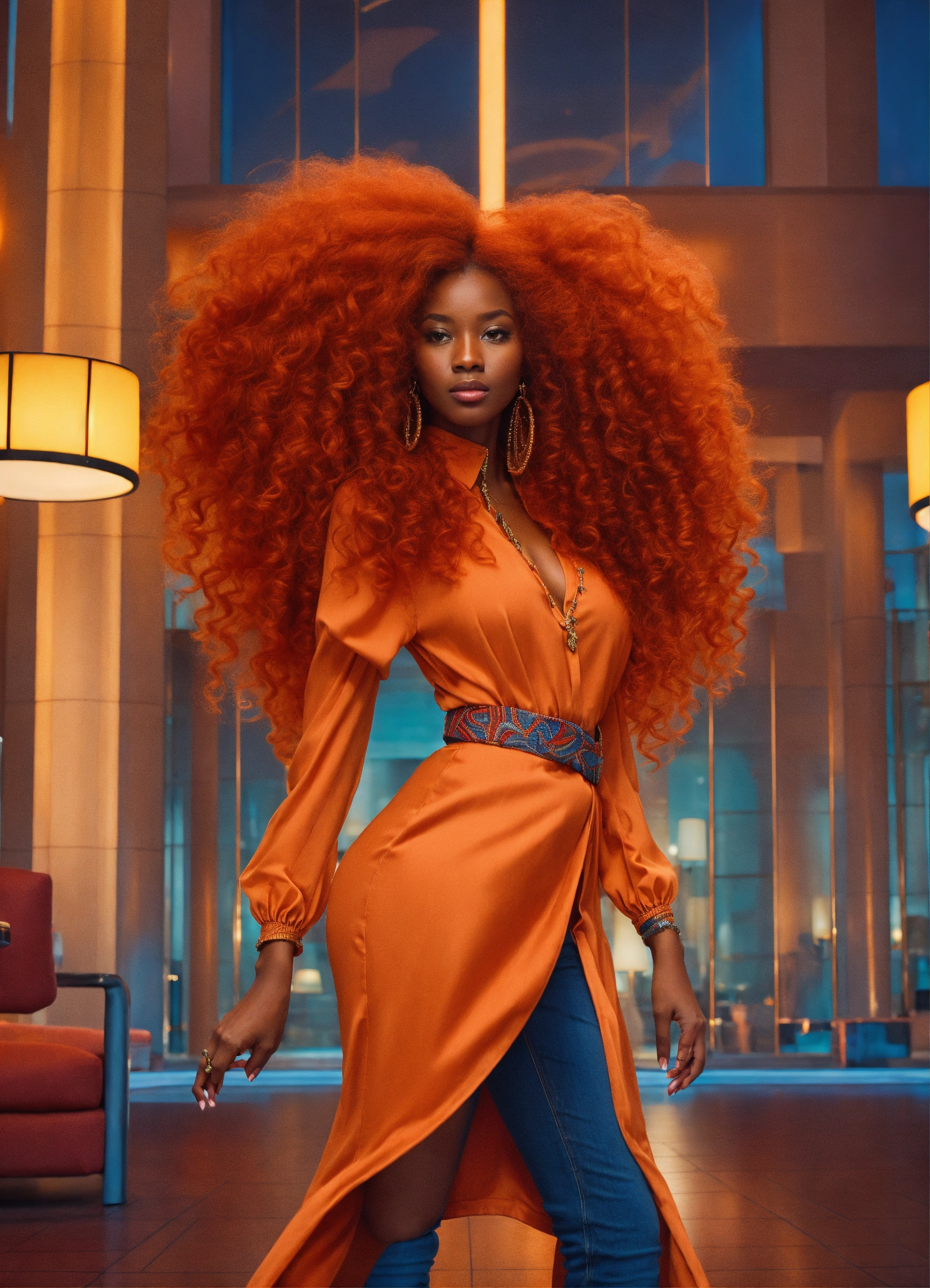 Pretty human looking alien with dark orange skin, huge reddish orange curly hair, african features, volumpious, wide hips, dressed in haute couture blouse, jeans and heels in hotel lobby