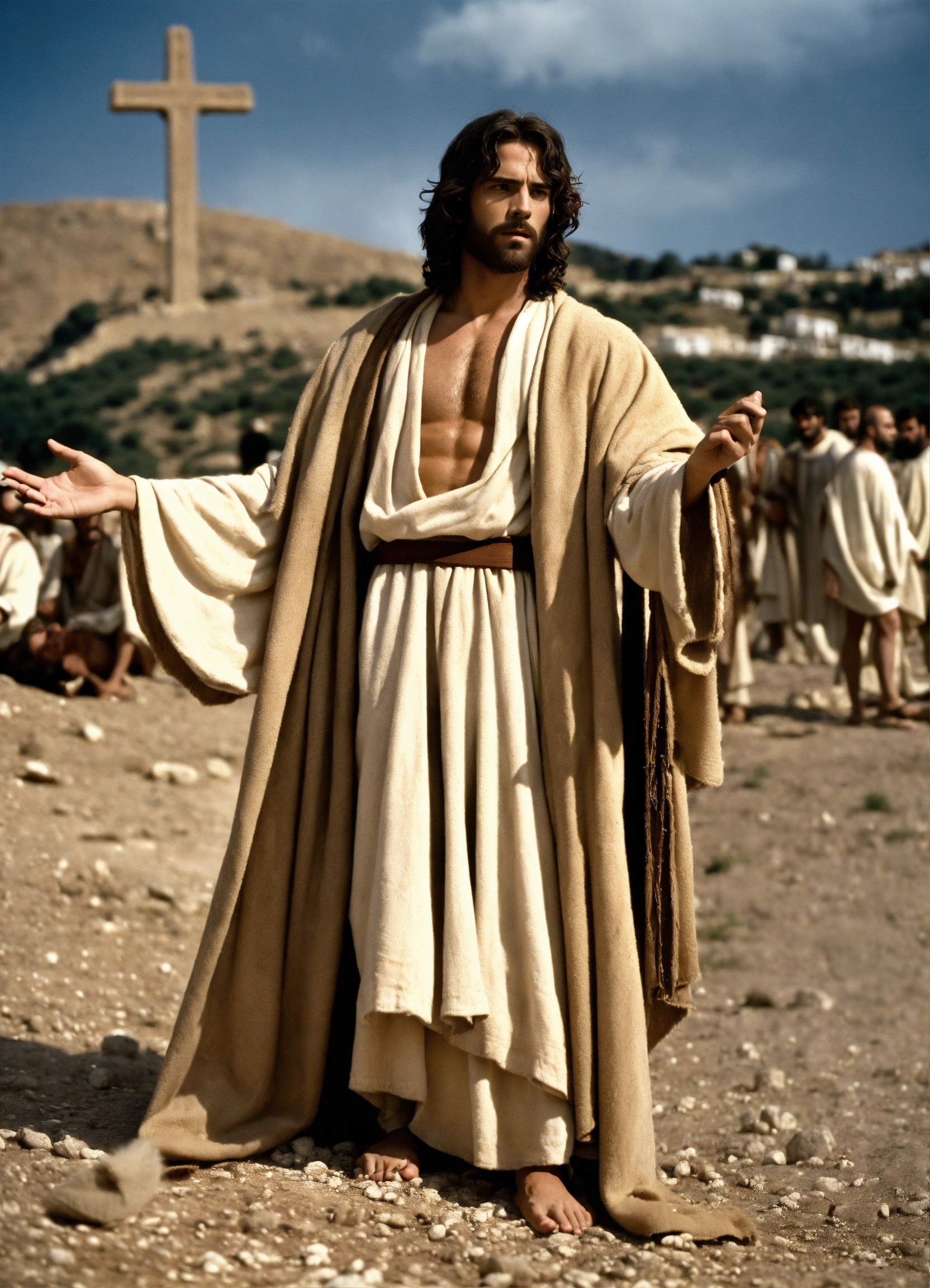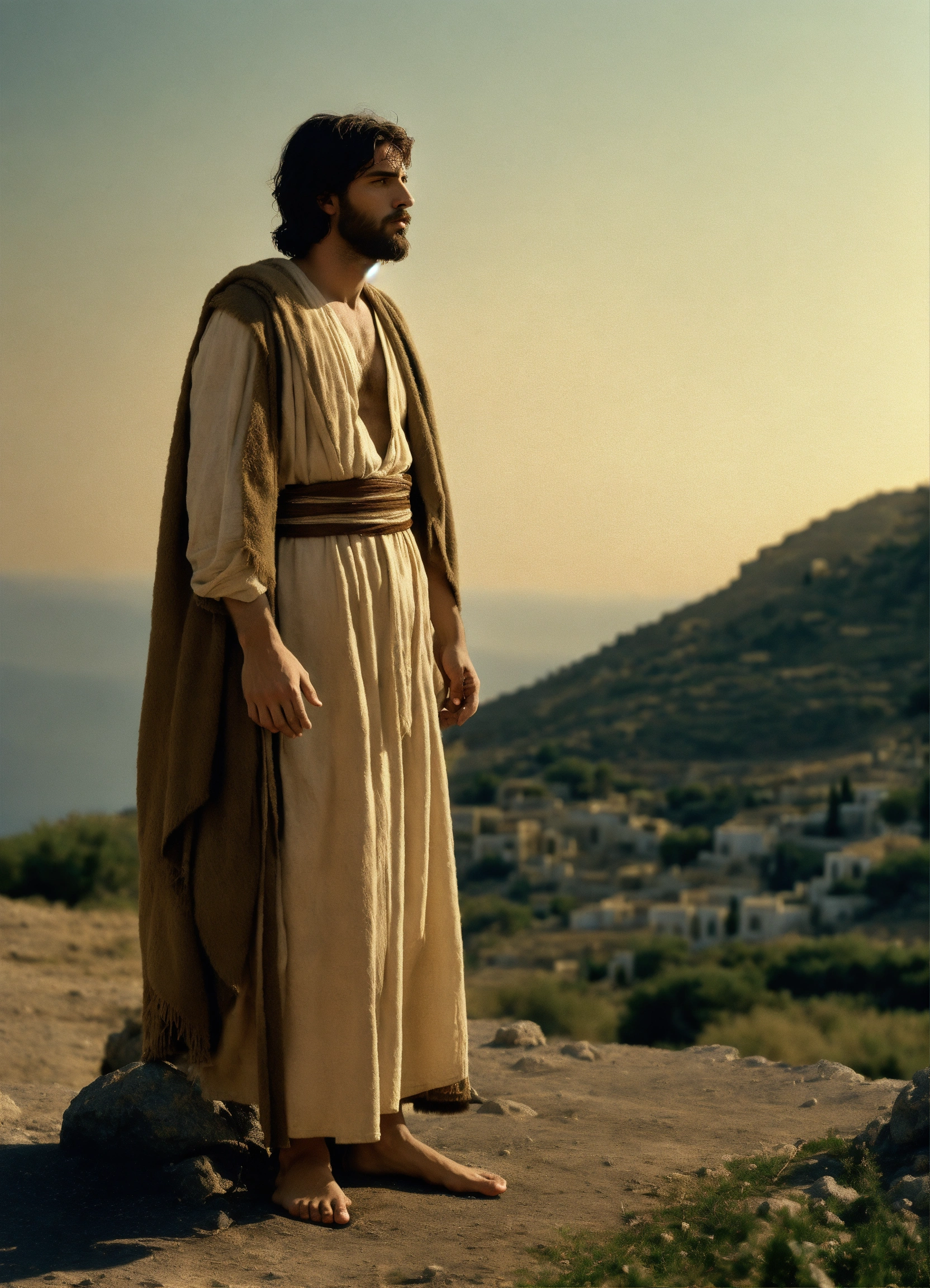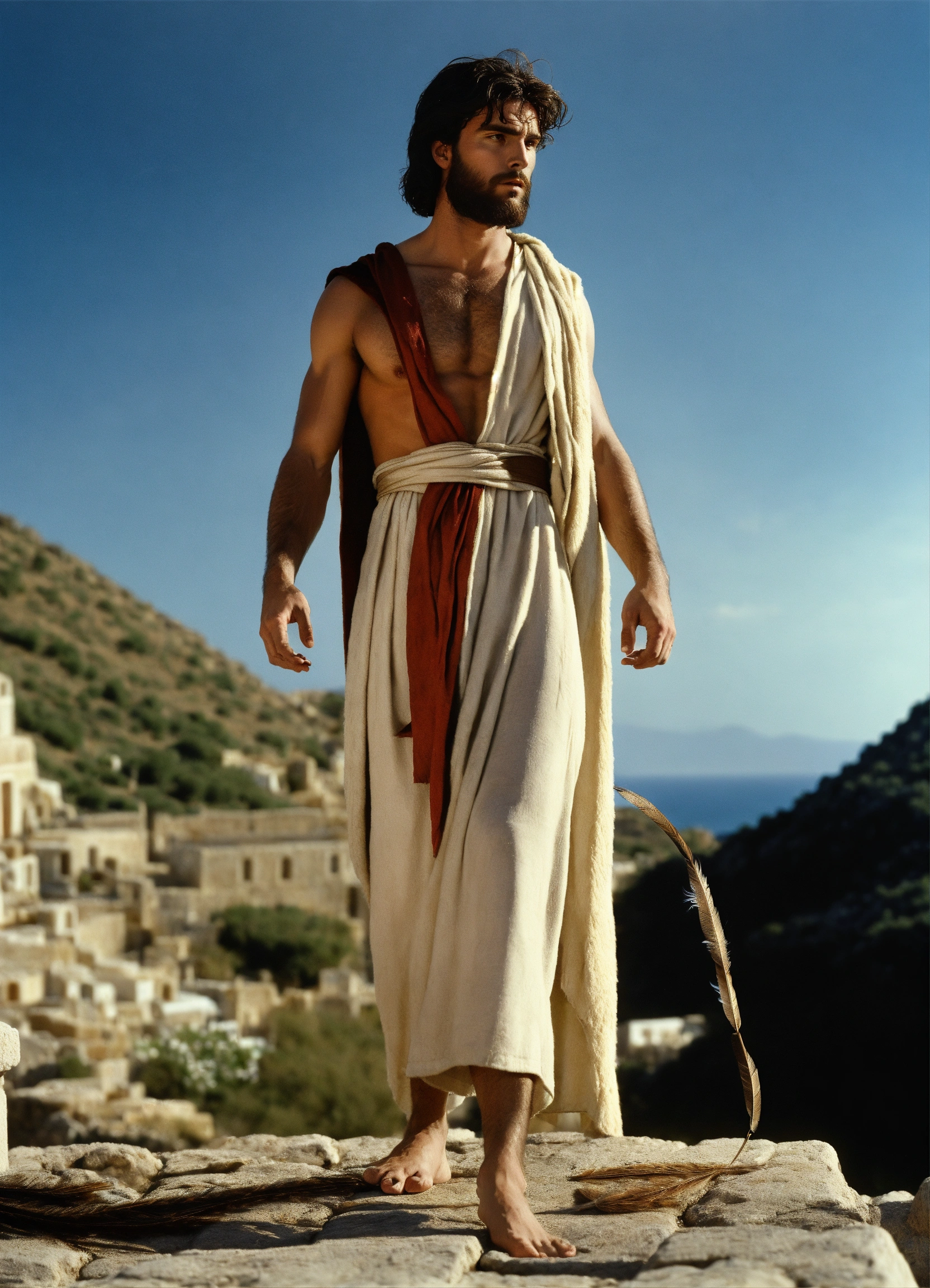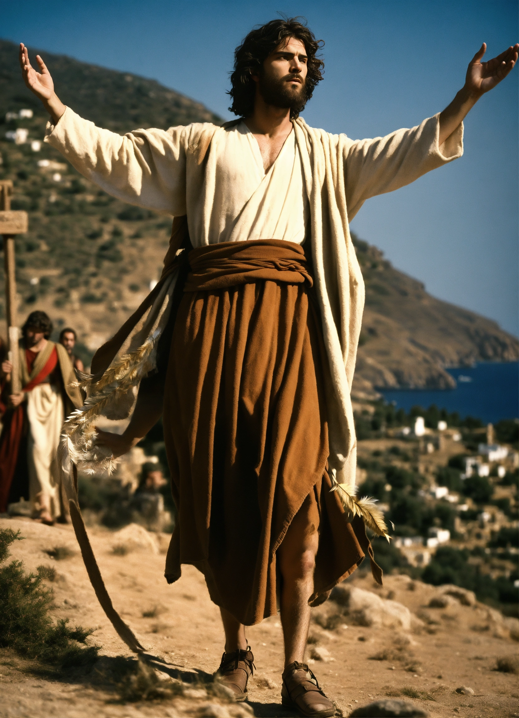 Movie still from the ressurection of jesus of nazareth. full body shot of dramatic posed looking to the sky john the apostle (young, 20 years old, short hair) a book on his right hand, a feather on the left hand, on patmos island. dramatic classical greek pose. 8k.