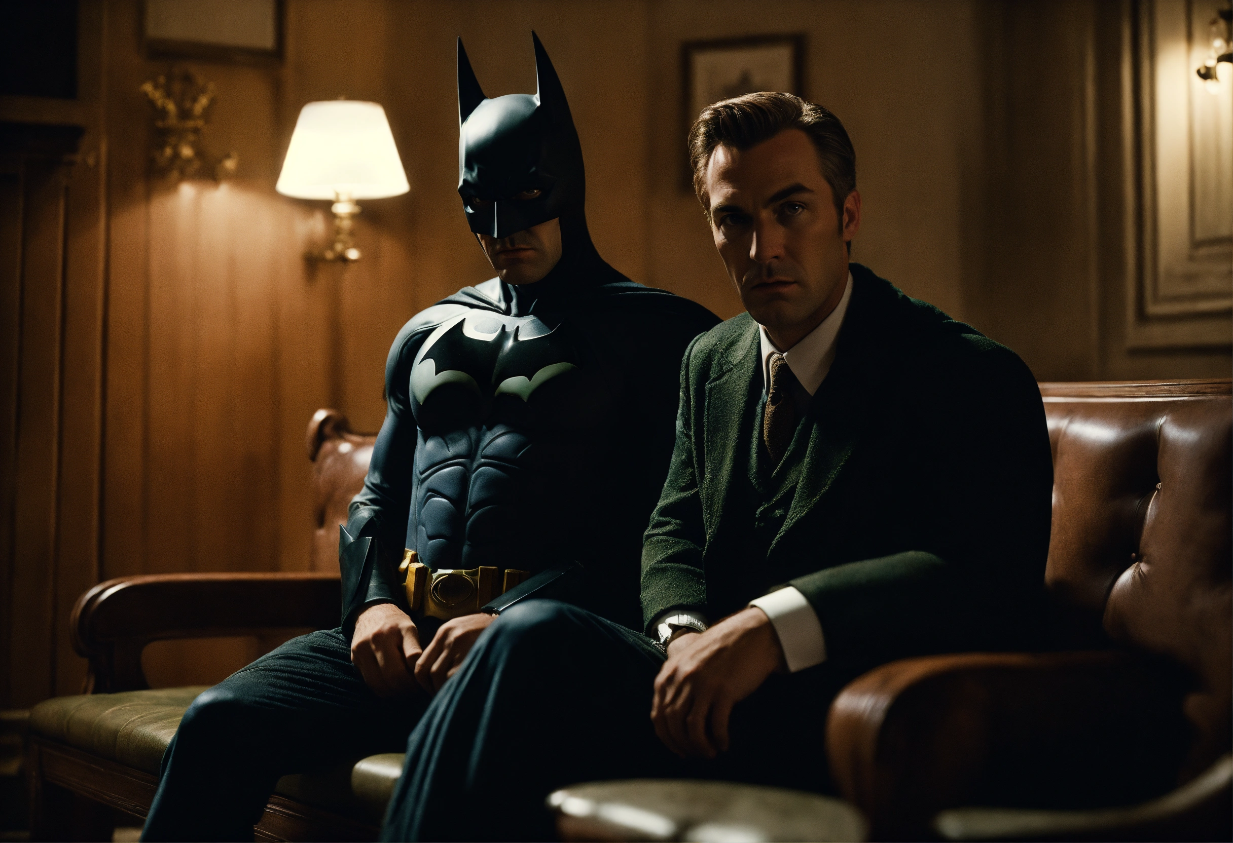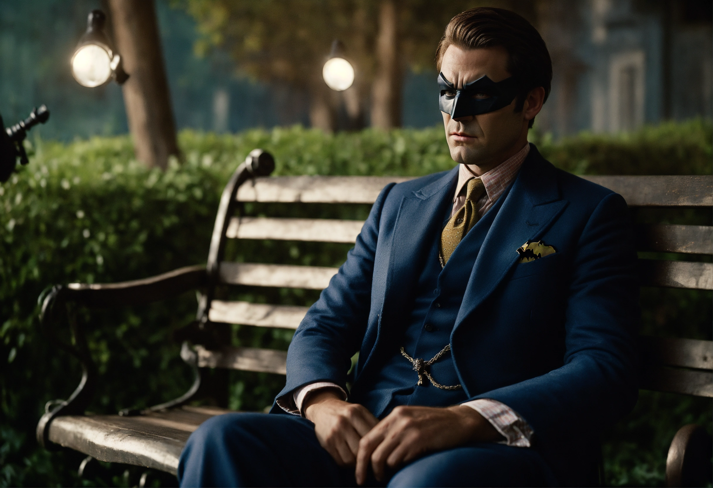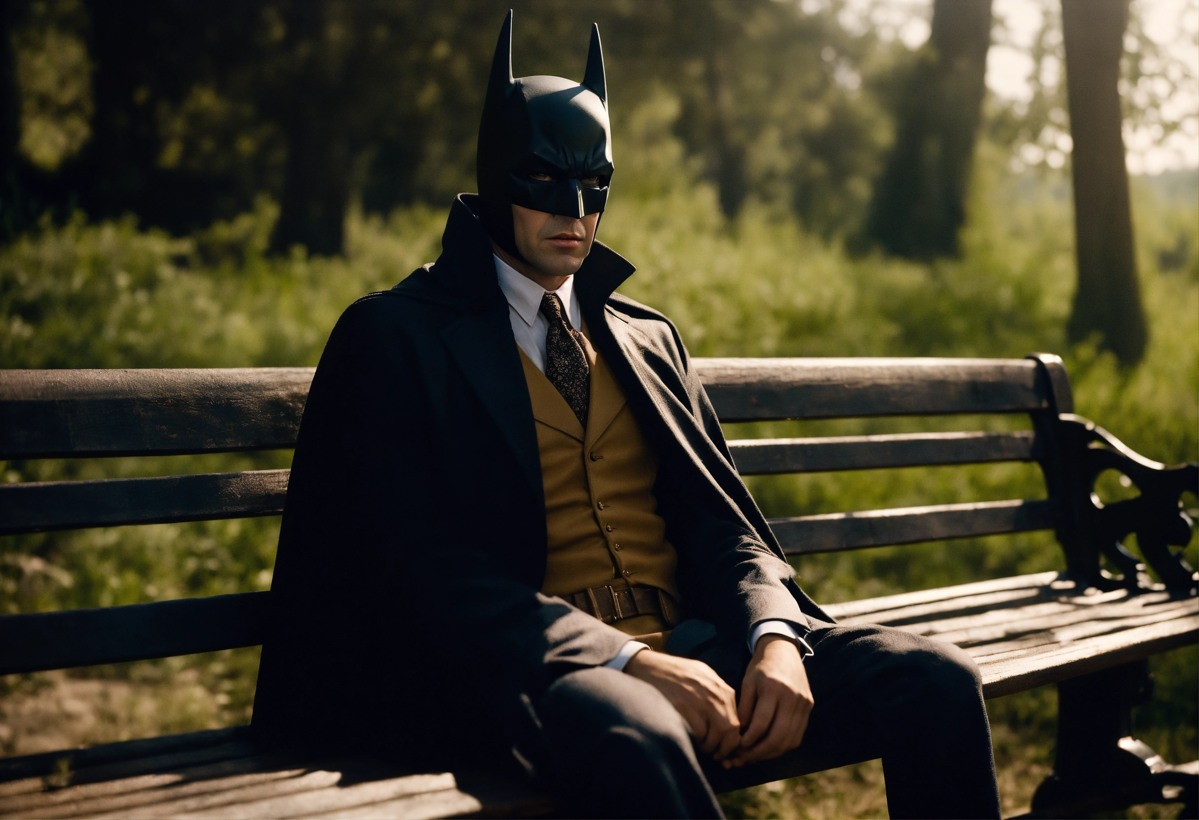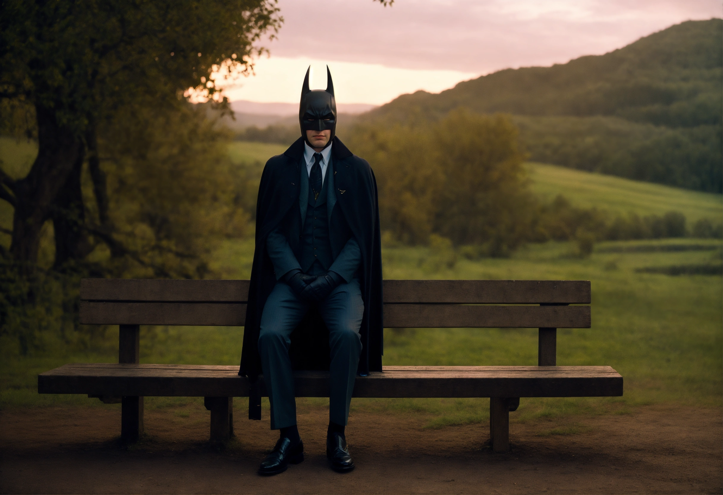 Countryside gentleman batman shot by sofia coppola, staring at camera, sitting on a benchcinematic light, extremely detailed