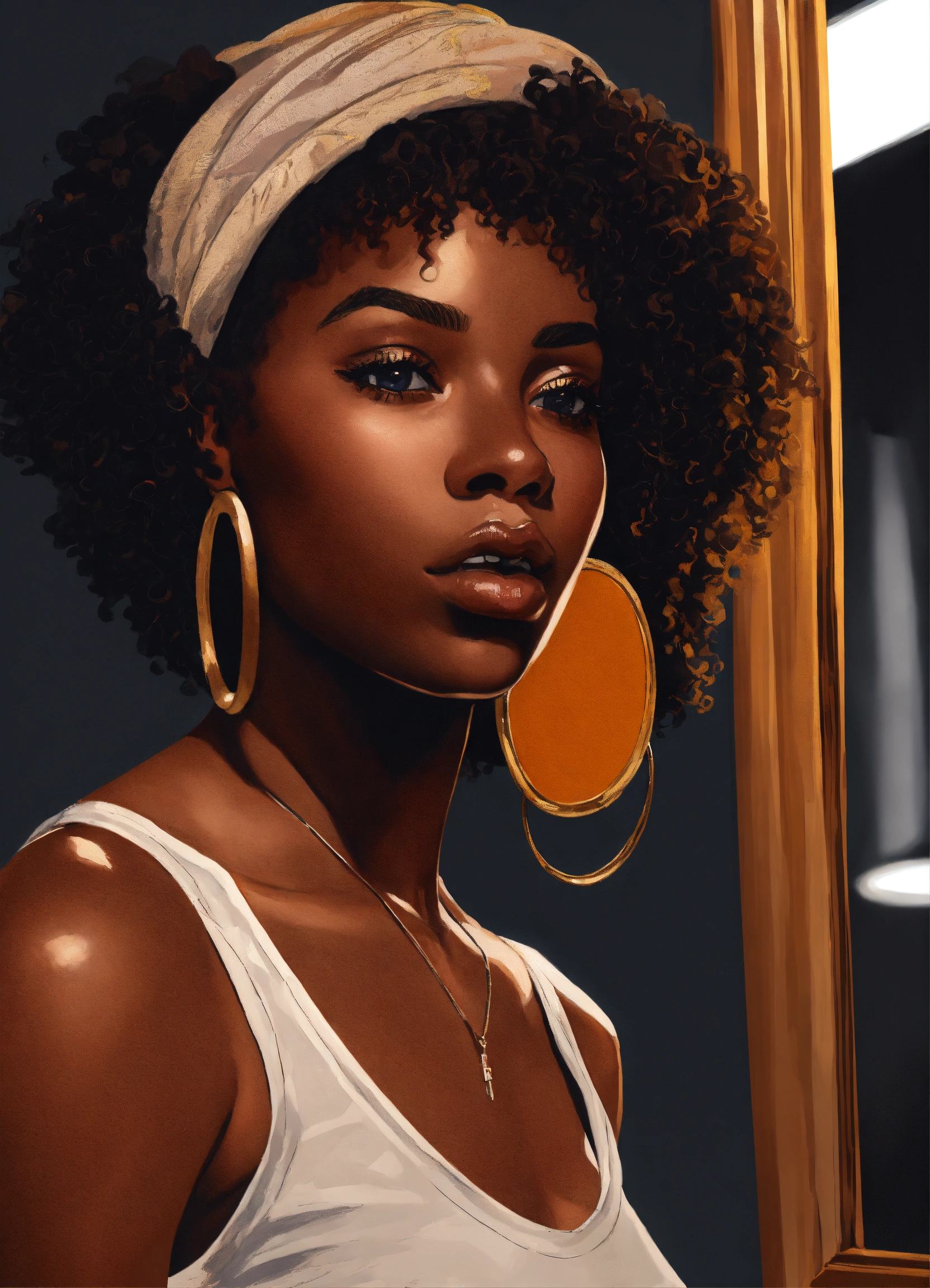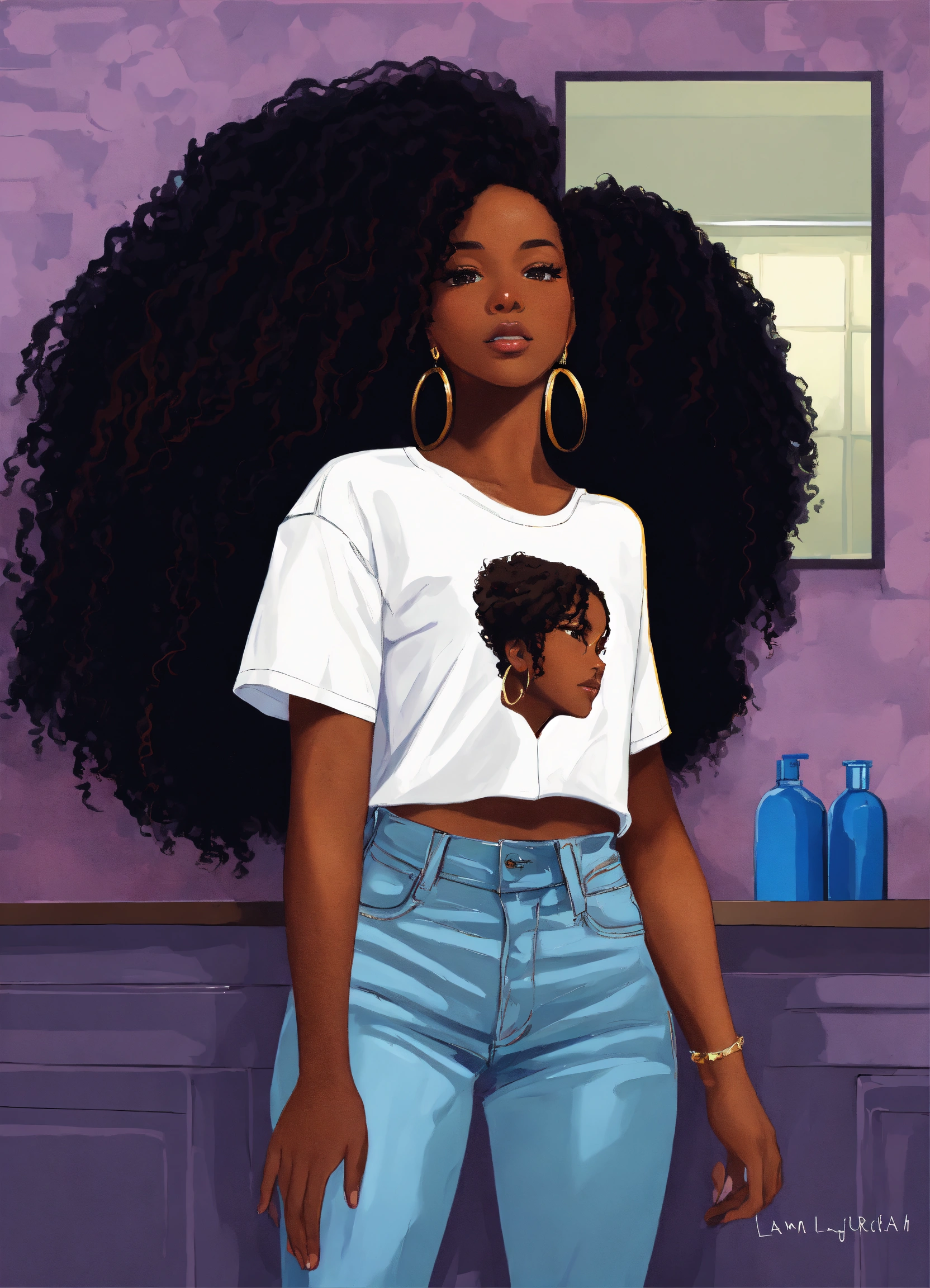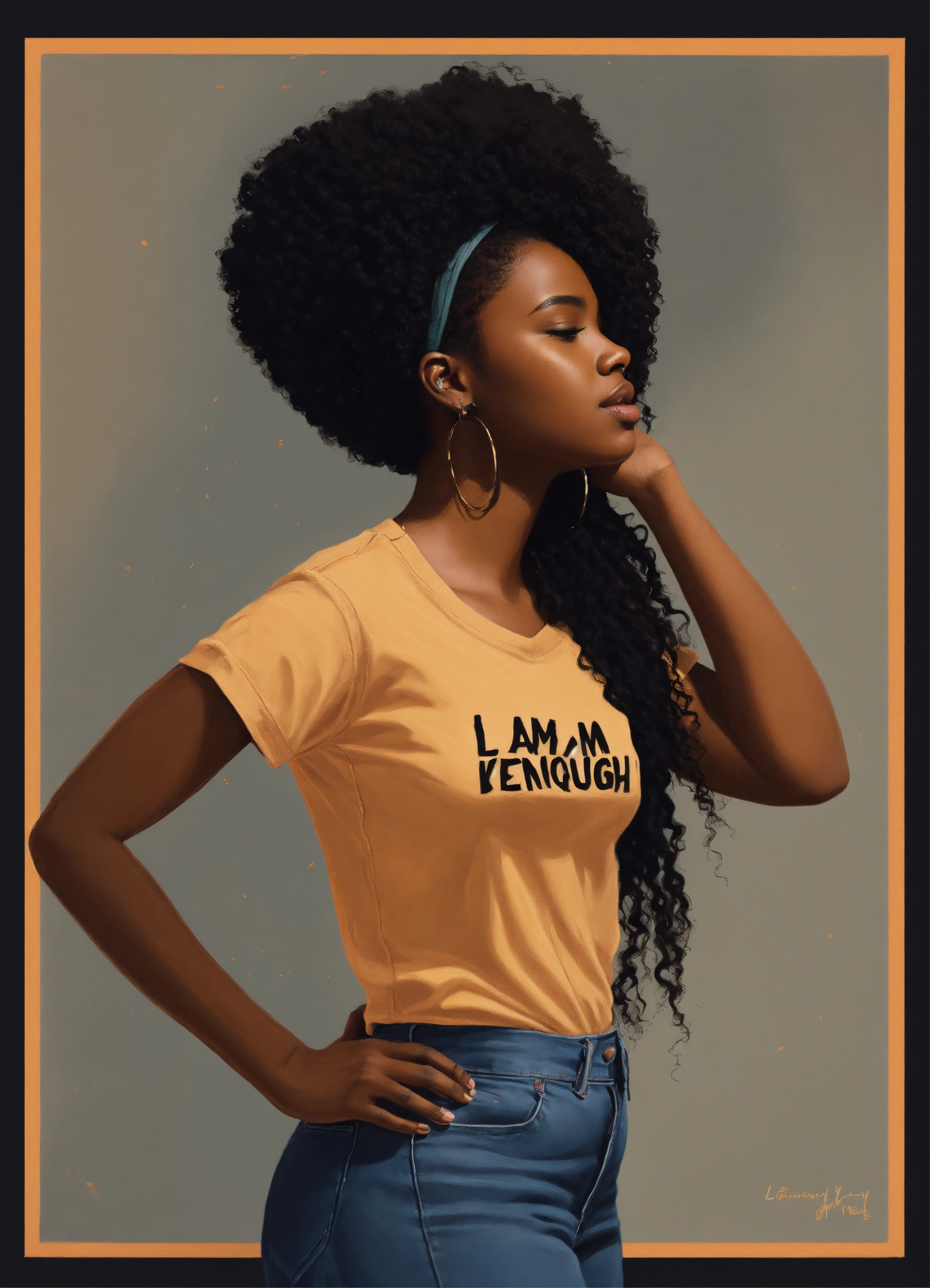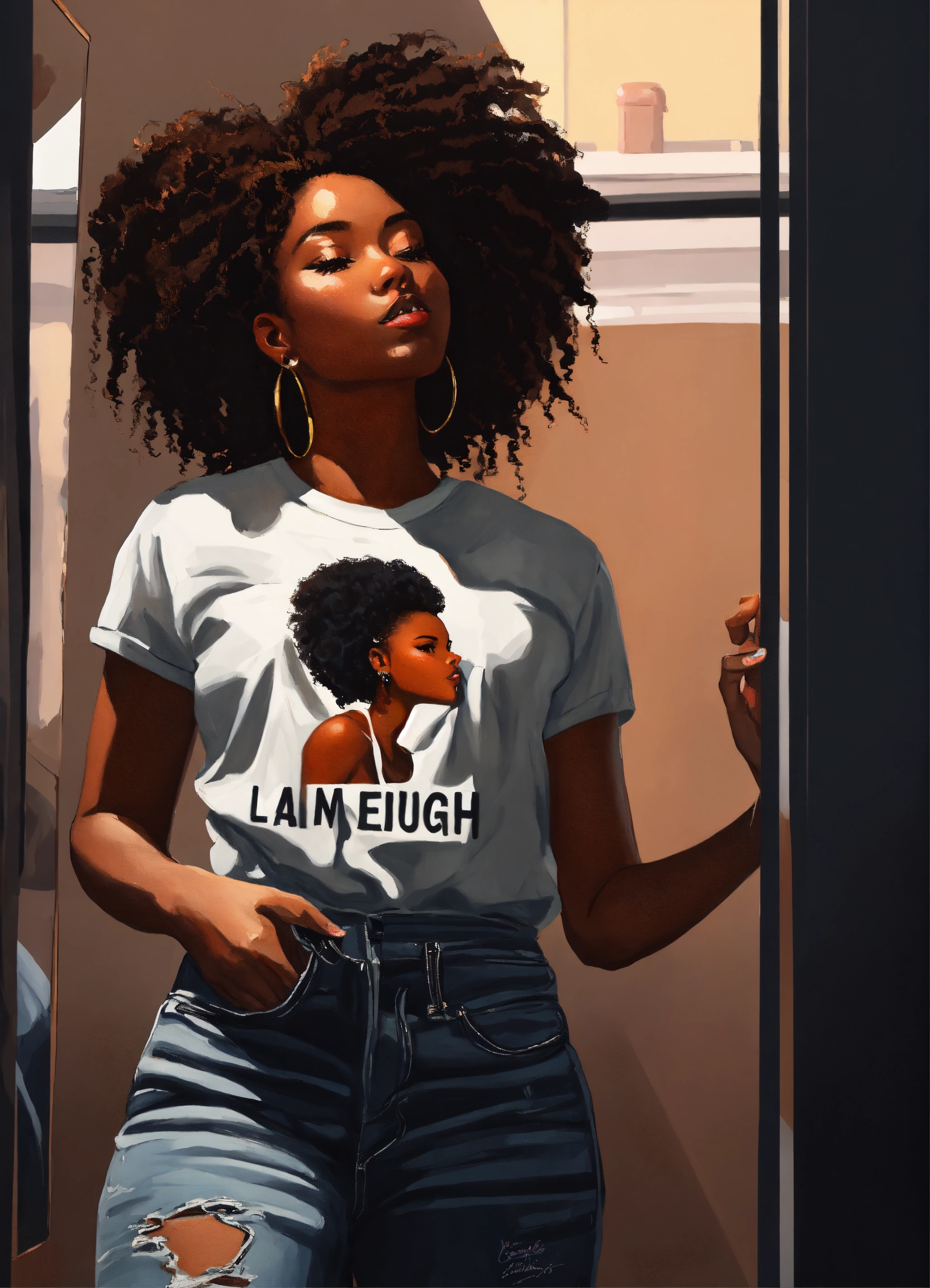 Laquirah greene prompt a realistic acrylic painting, 5d, flat vector faceless illustration, extreme close, urban brown skin woman, standing in the mirror adoring her kinky coily hair, flat black background, flat white background . her shirt say " i am enough"