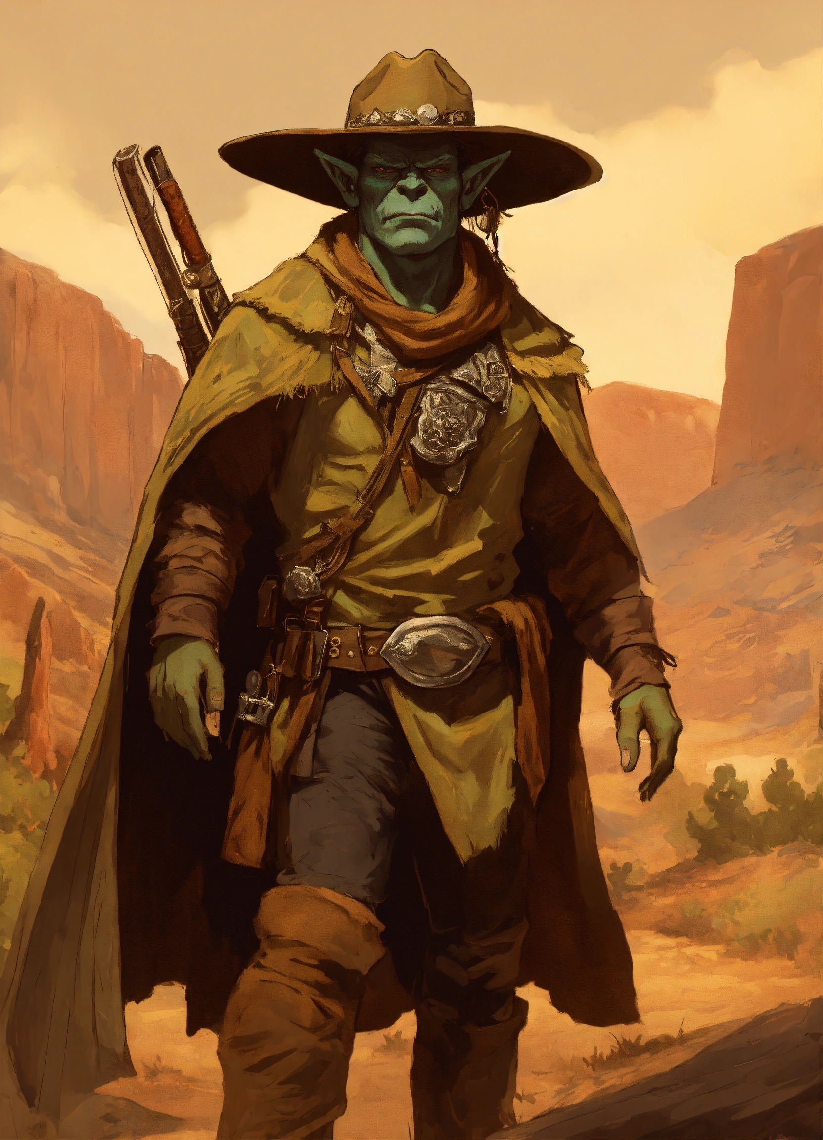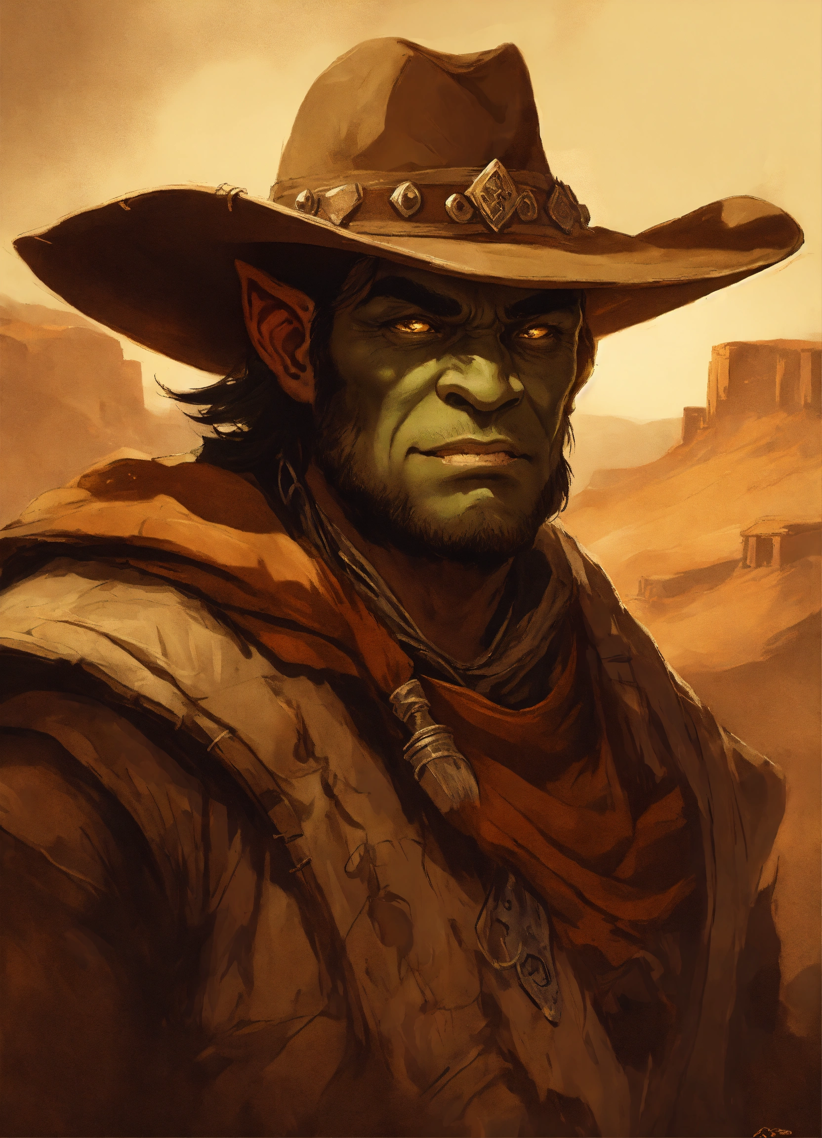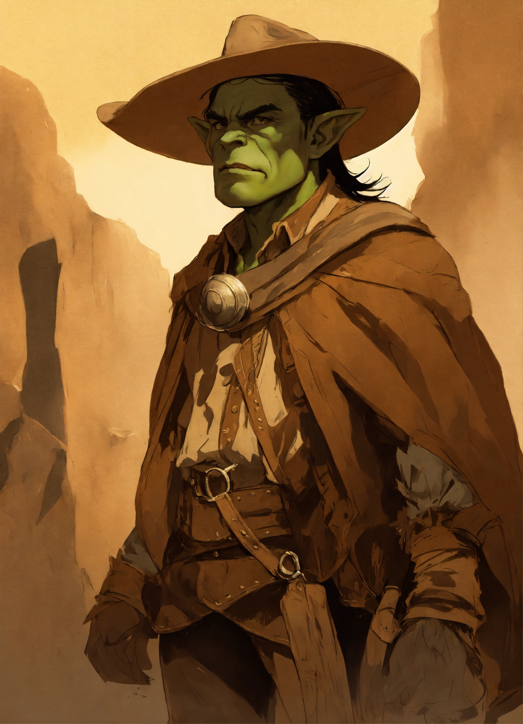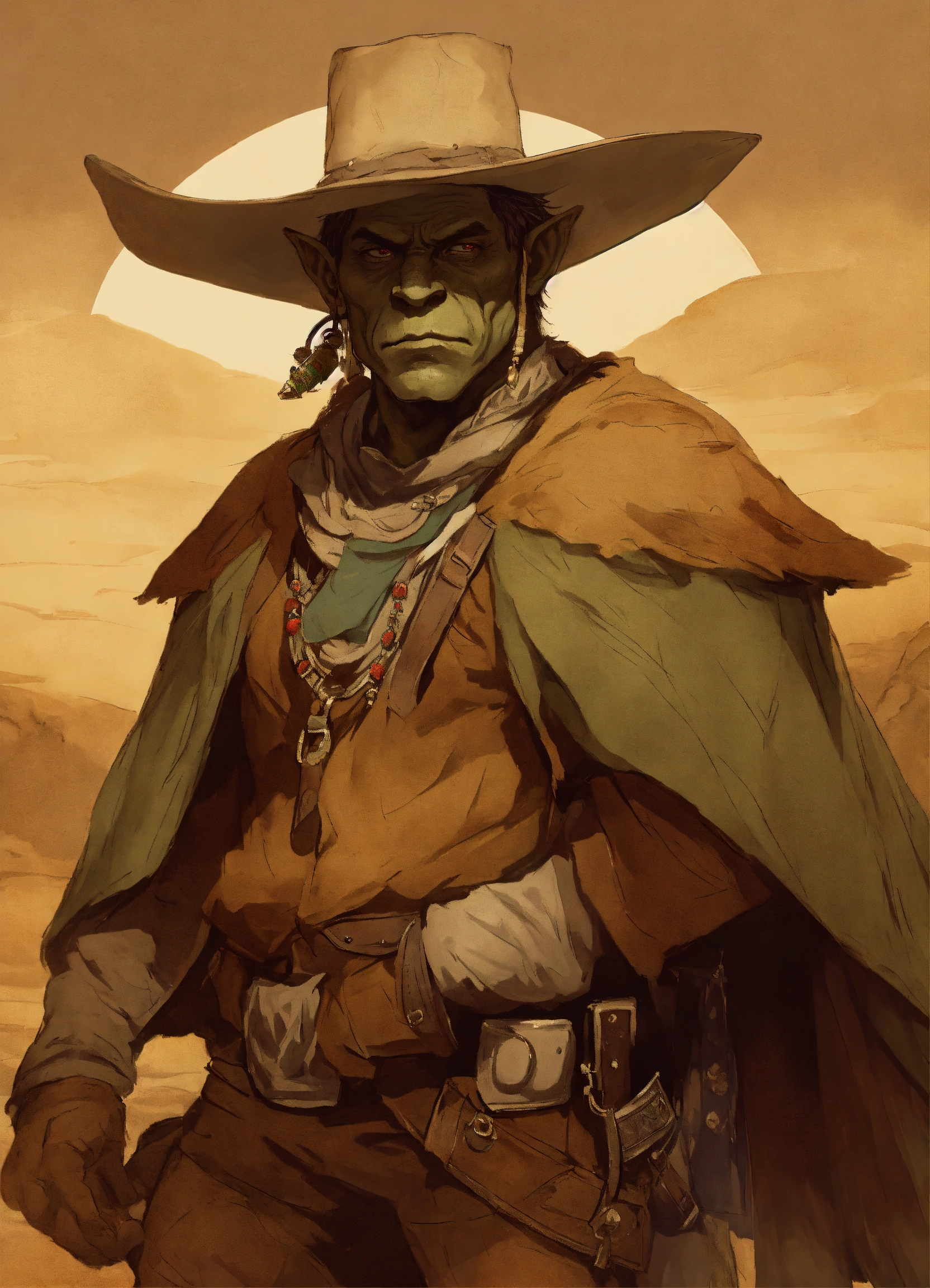 In the style of a old sepia western painting, an orc is wearing a poncho, he is wearing a wide brimmed cowboy hat, there are fake elf ears attached to the hat, he’s dressed like a hero in a western, he has visible tusks, he has disguised himself as an elf