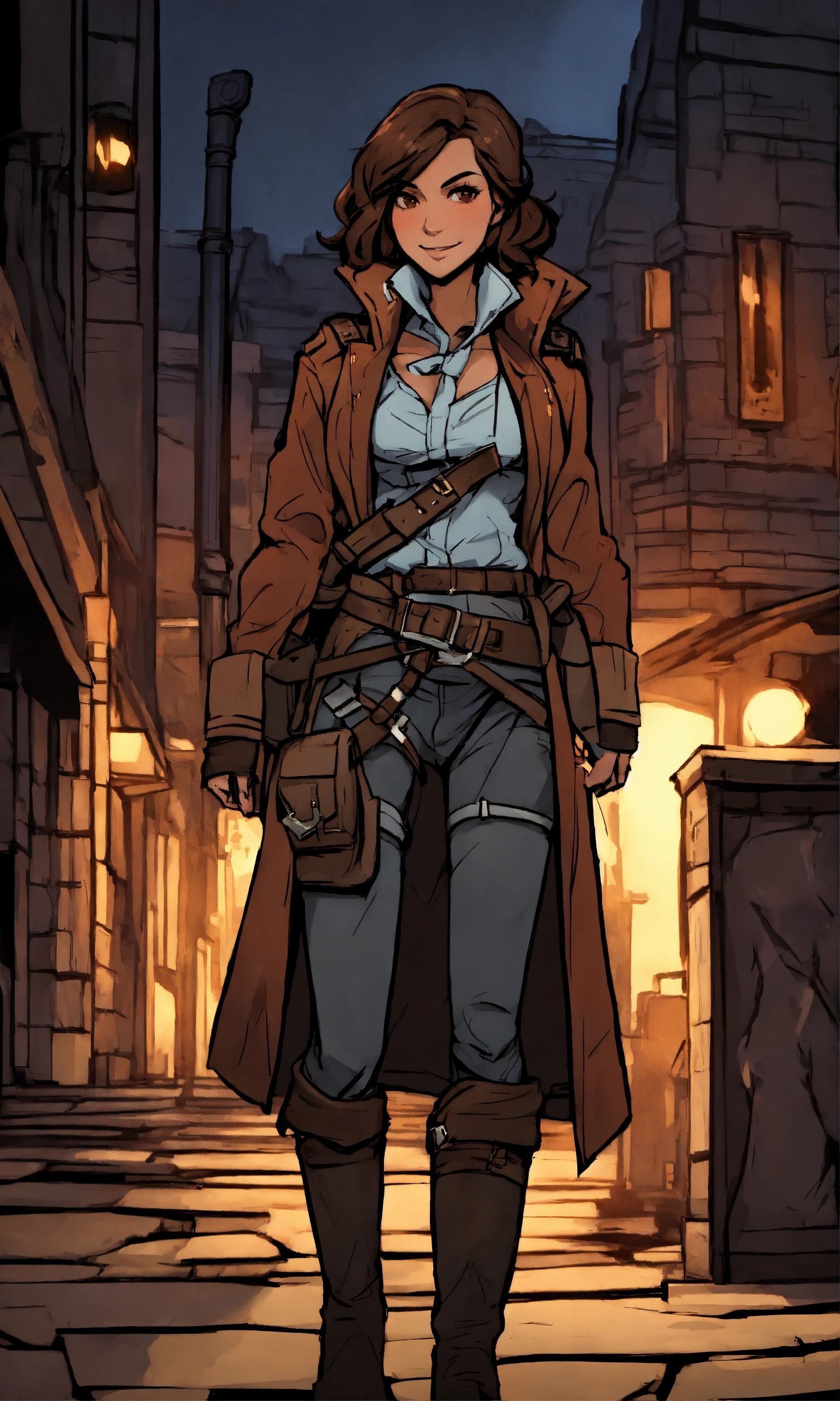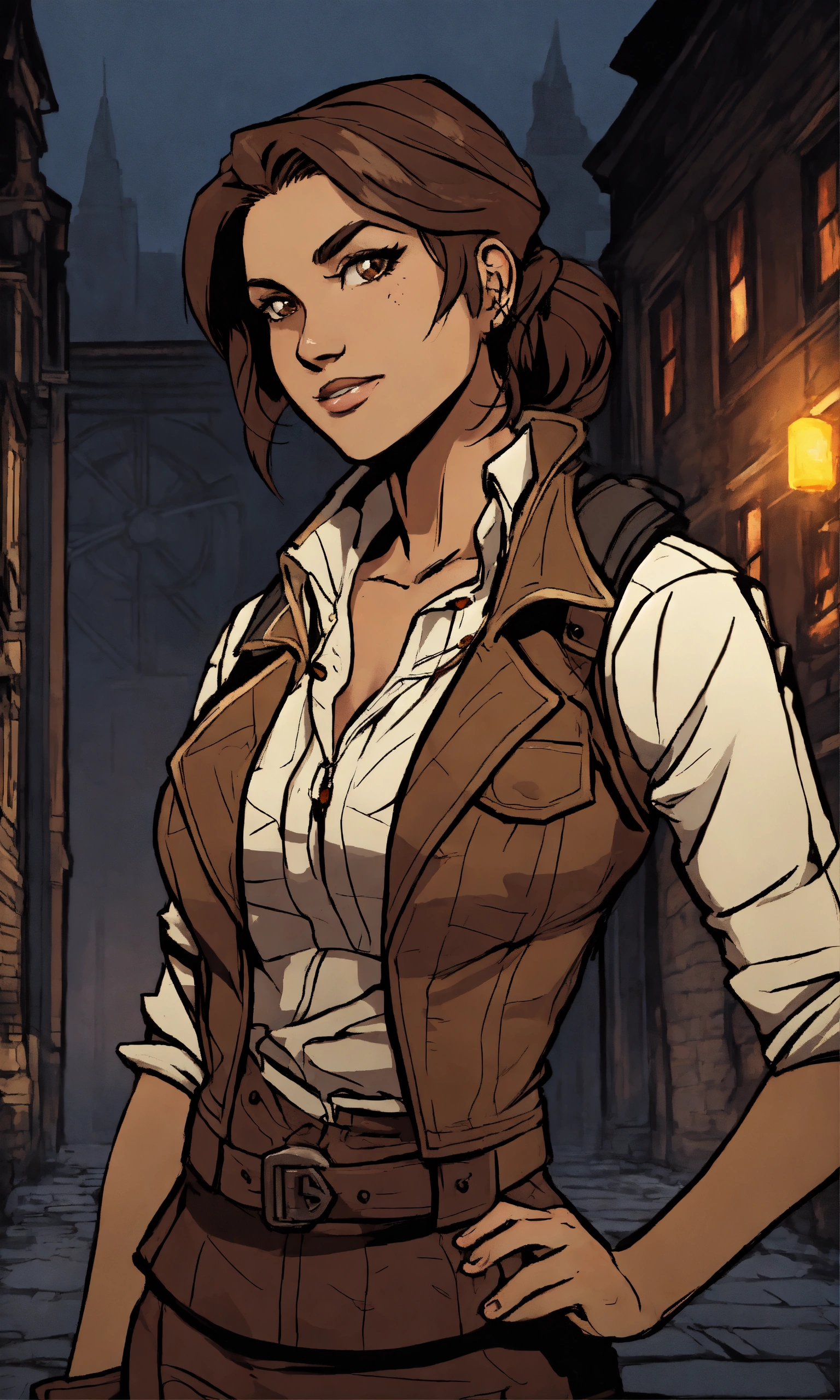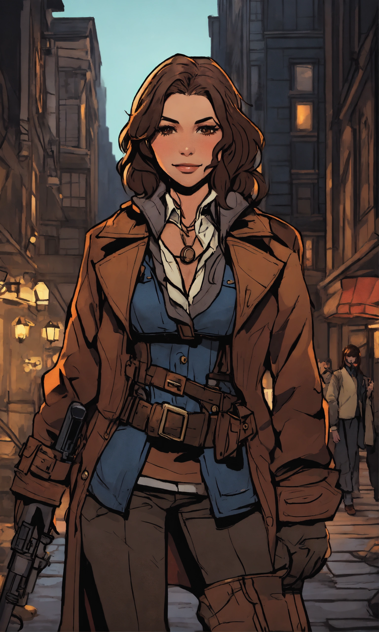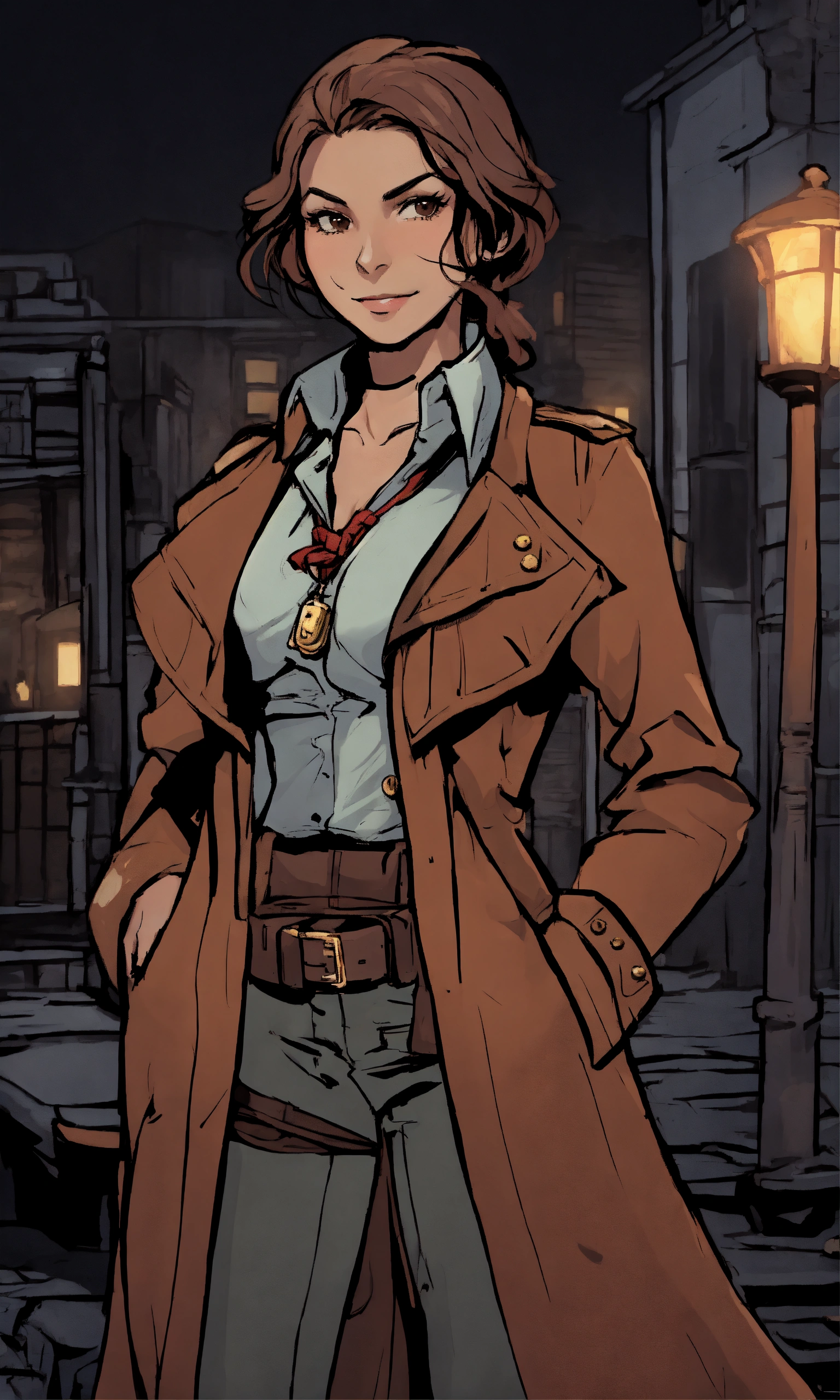 Metis woman, medium brown hair, lose hair, brown eyes, detective outfit, smirk, in a city darkest dungeon style.