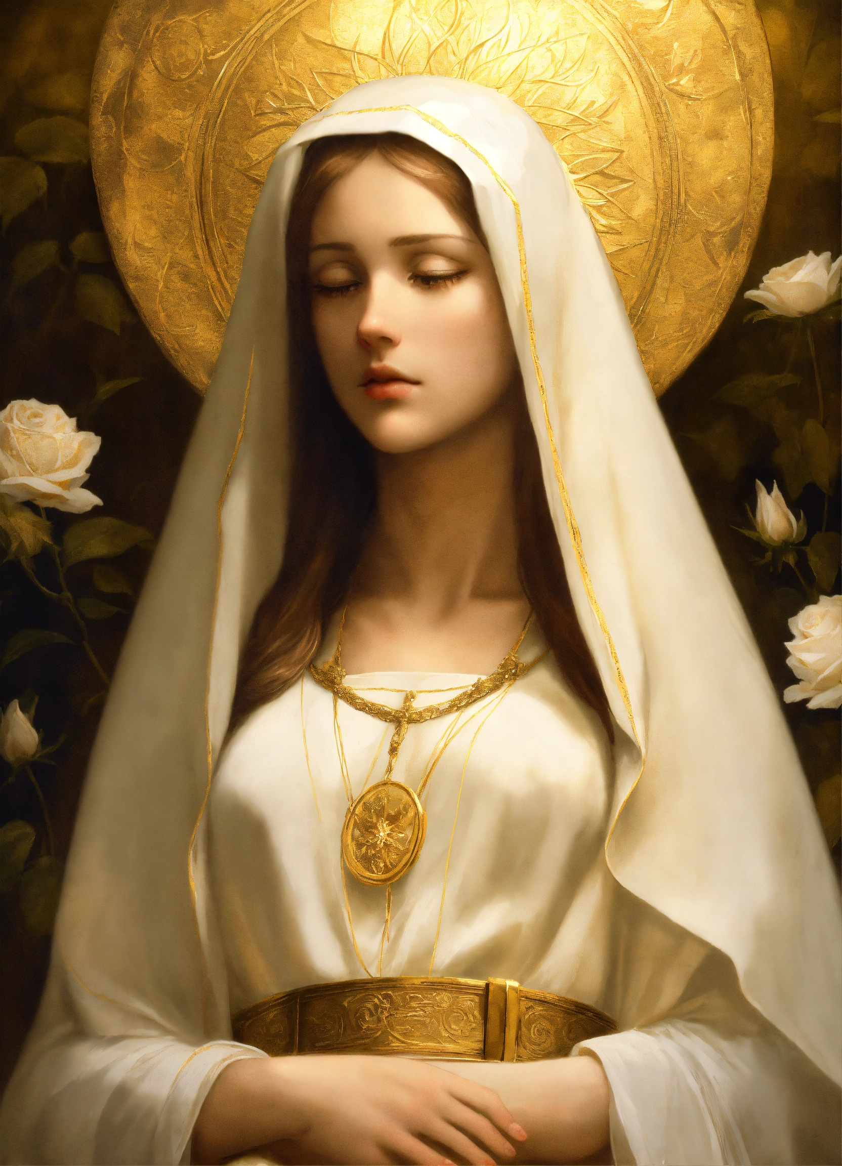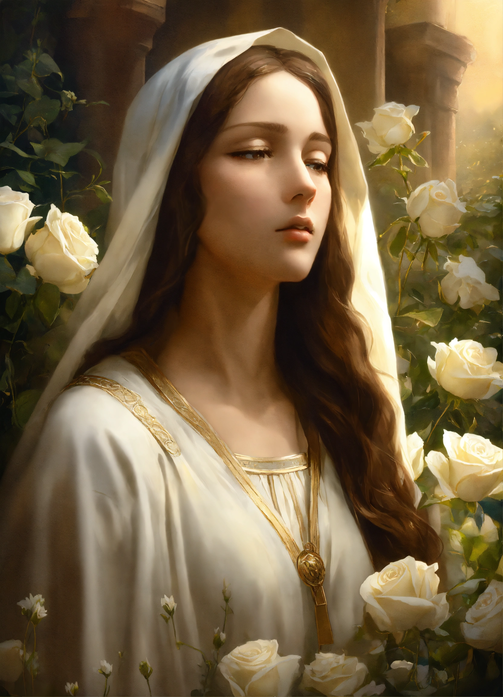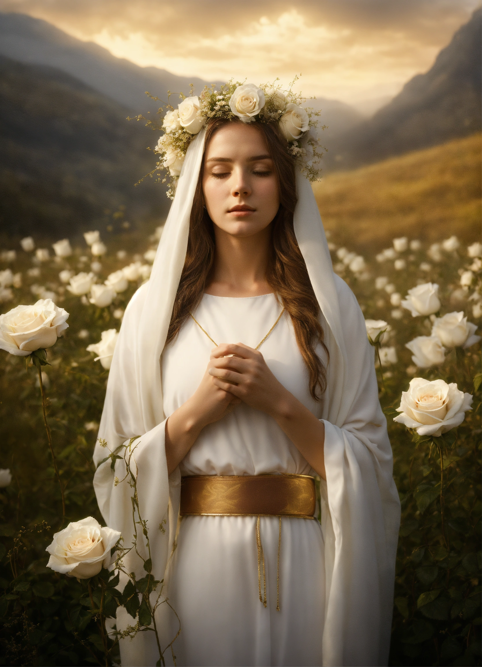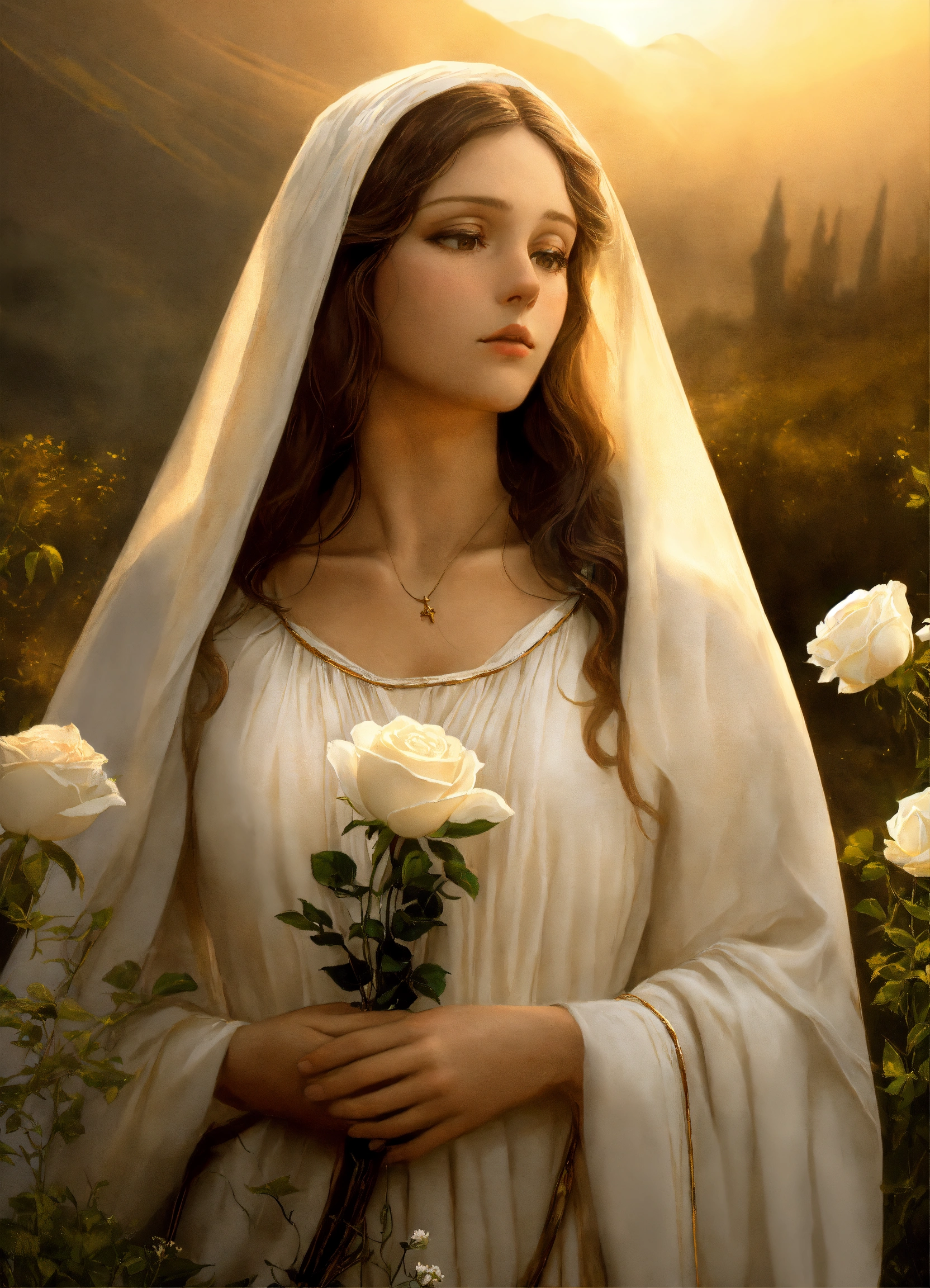 Majestic image 0f virgin mary, mother of christ, extremely realistic, face with greco-roman profile, open sad brown eyes, bowed humbly, pale skin, style of leonardo da vinci paintings, mystical, sublime, surrounded by flashing light, dressed in a white tunic, simple golden belt at the waist, veil covering part of her brown hair, perched on mist, spectacular mountainous background, on a splendid morning, under her bare feet, many white roses and other flowers in the grass around her, little sad and melancholic expression, loving look, perfection, a circular halo of light above her head, holiness
