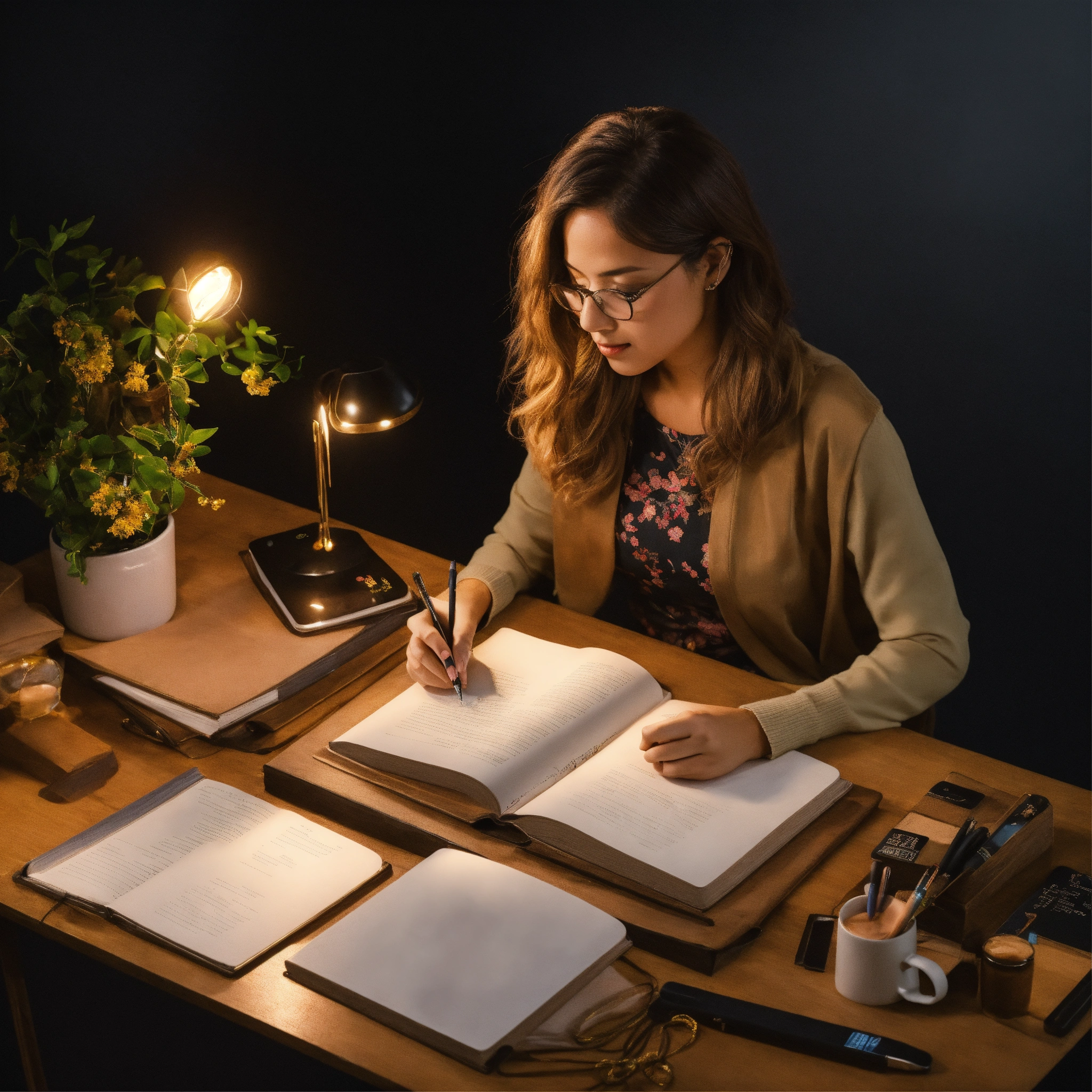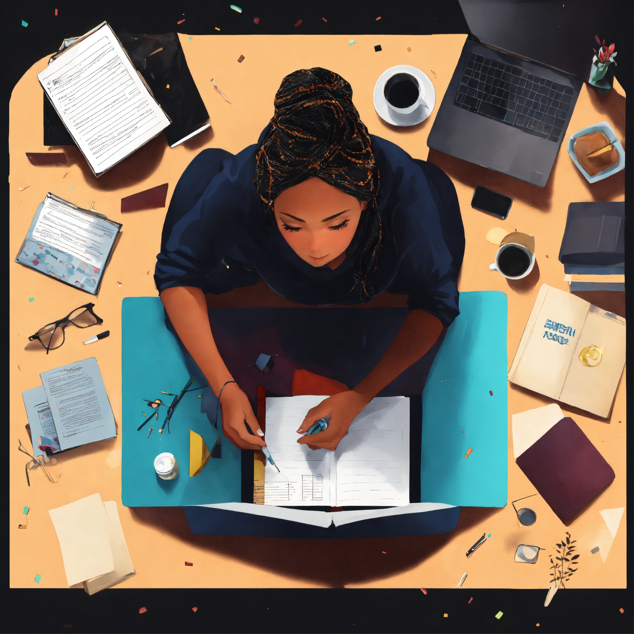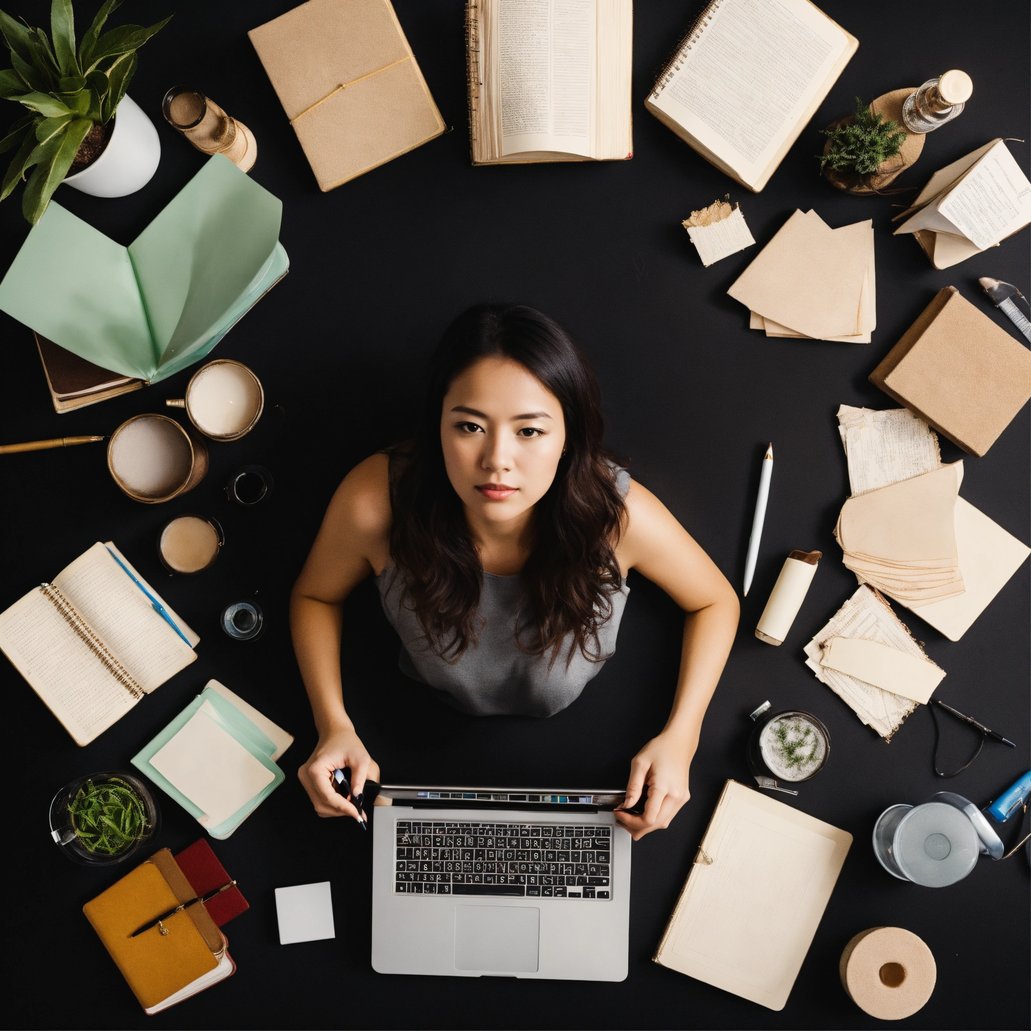 A woman who creates herself studying others from an overhead view on a black background