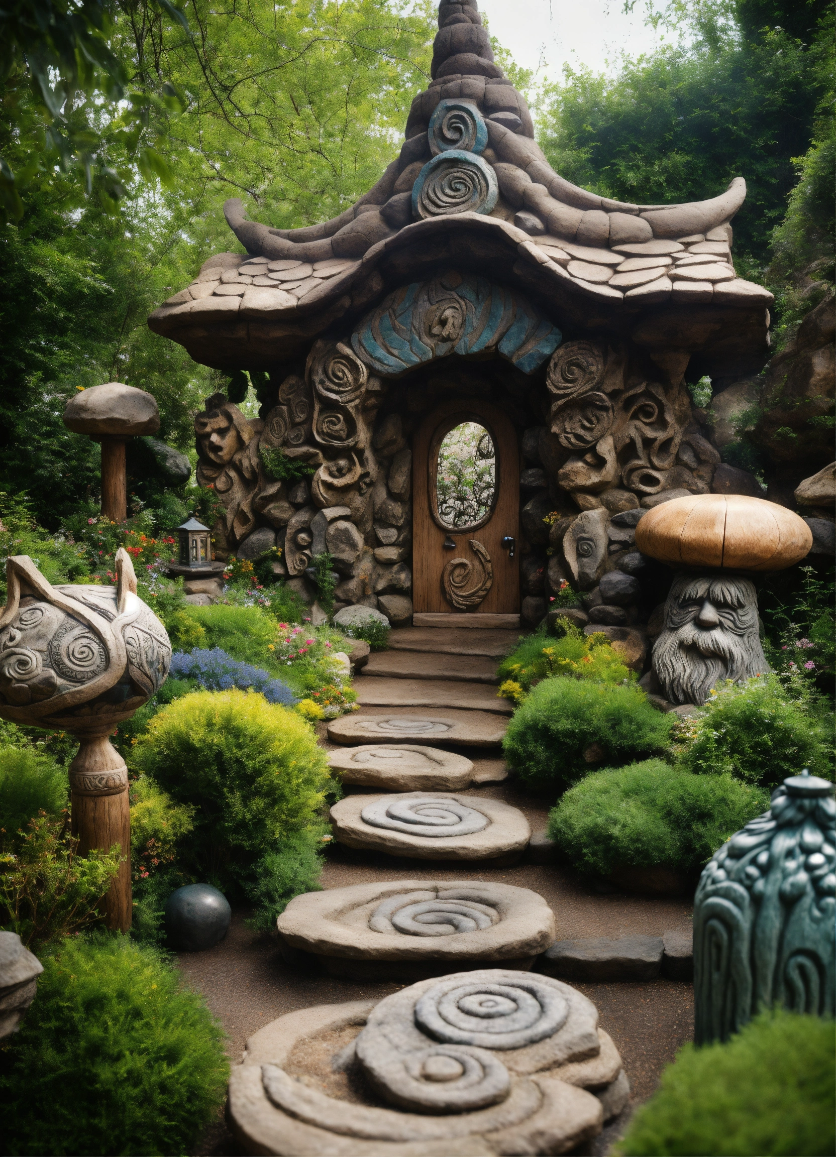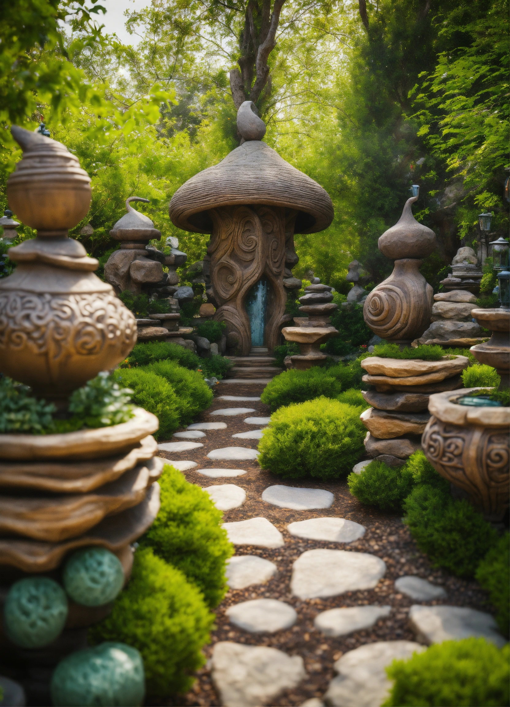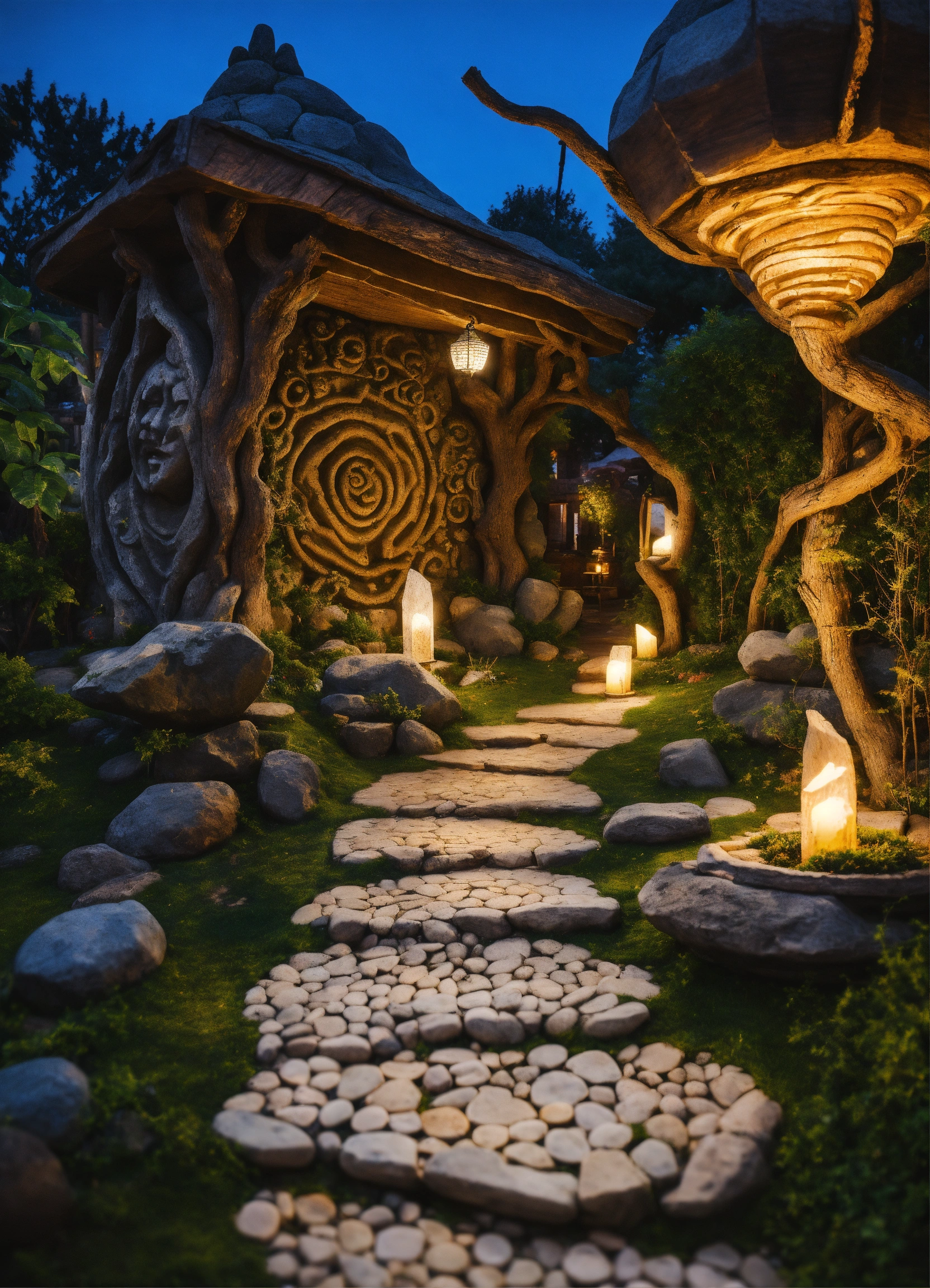 An ancient spiritual gnome stone pathway rock garden.sculptured . style of alex grey, giger.unreal engine.totem sculptures.swirling patterned stone pathway courtyard.wood.stone.driftwood.statues. artistic sculpture.lanterns.air bnb house/backyard