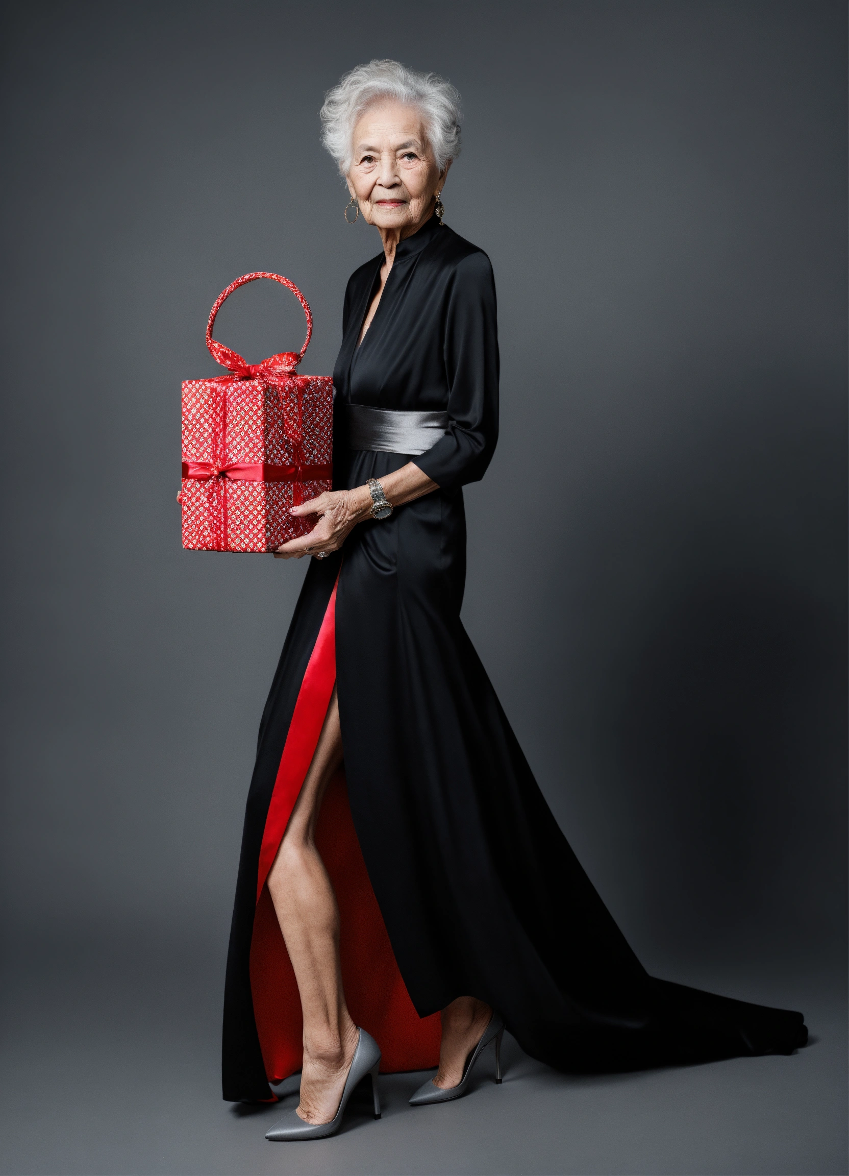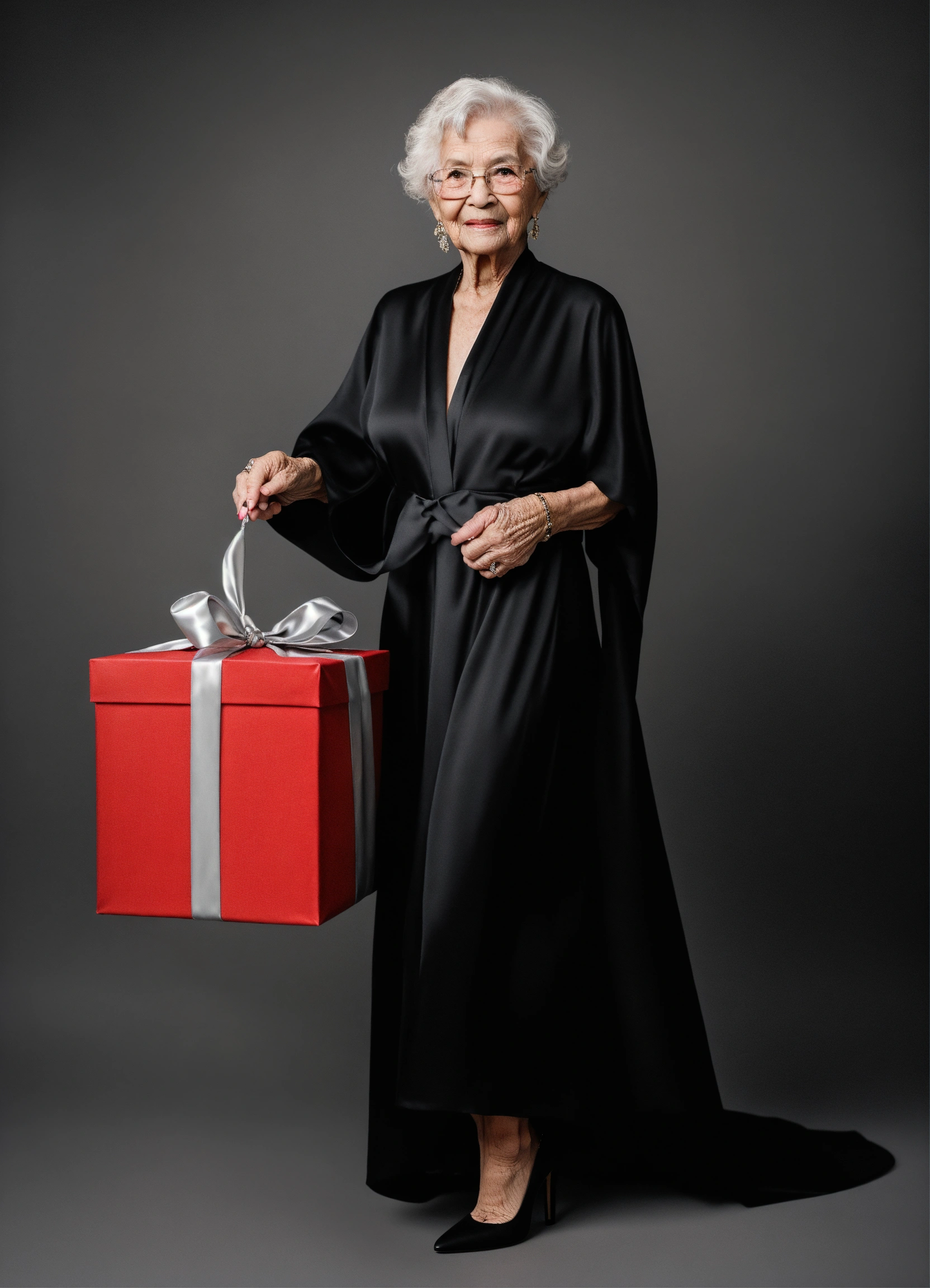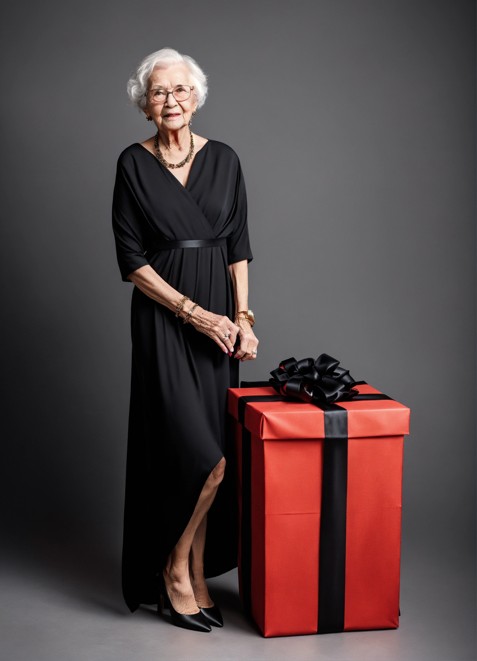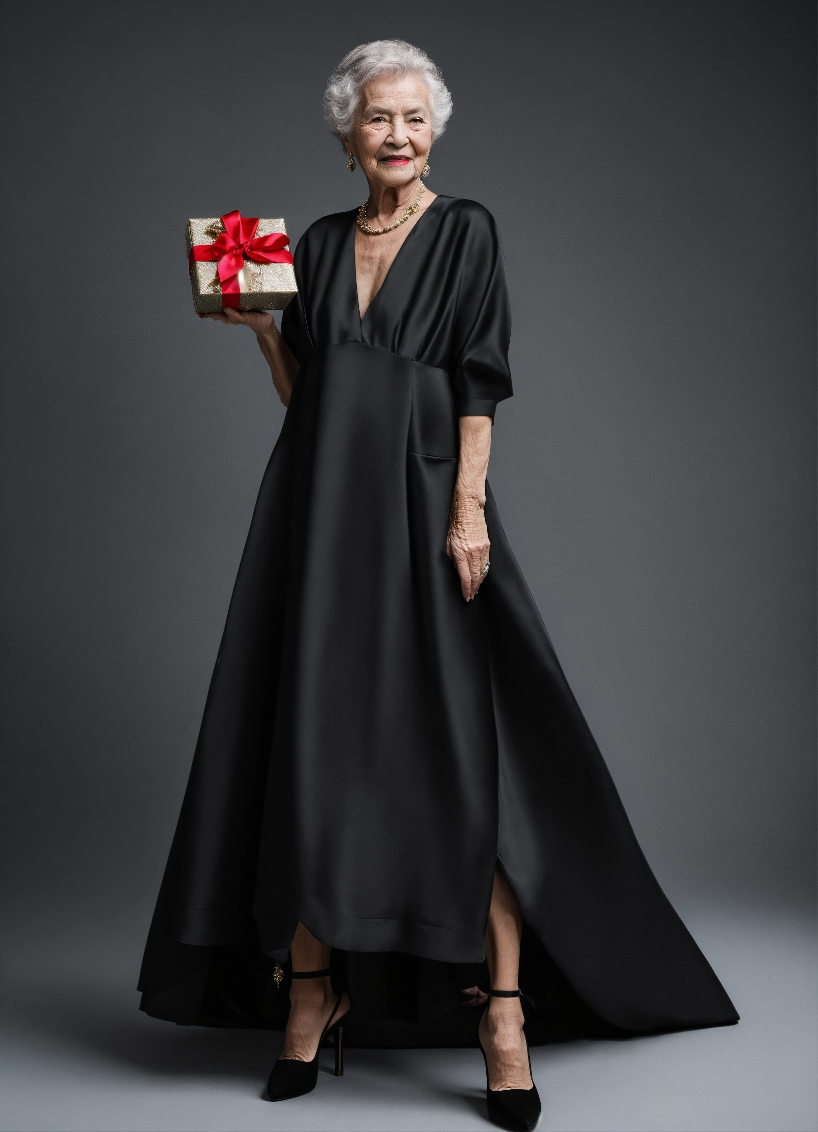An elderly person wearing a long black open dress, black high heels, 175cm, plain gray background, high fashion, photo shoot, raw photond. they are holding a big gift in their hand.