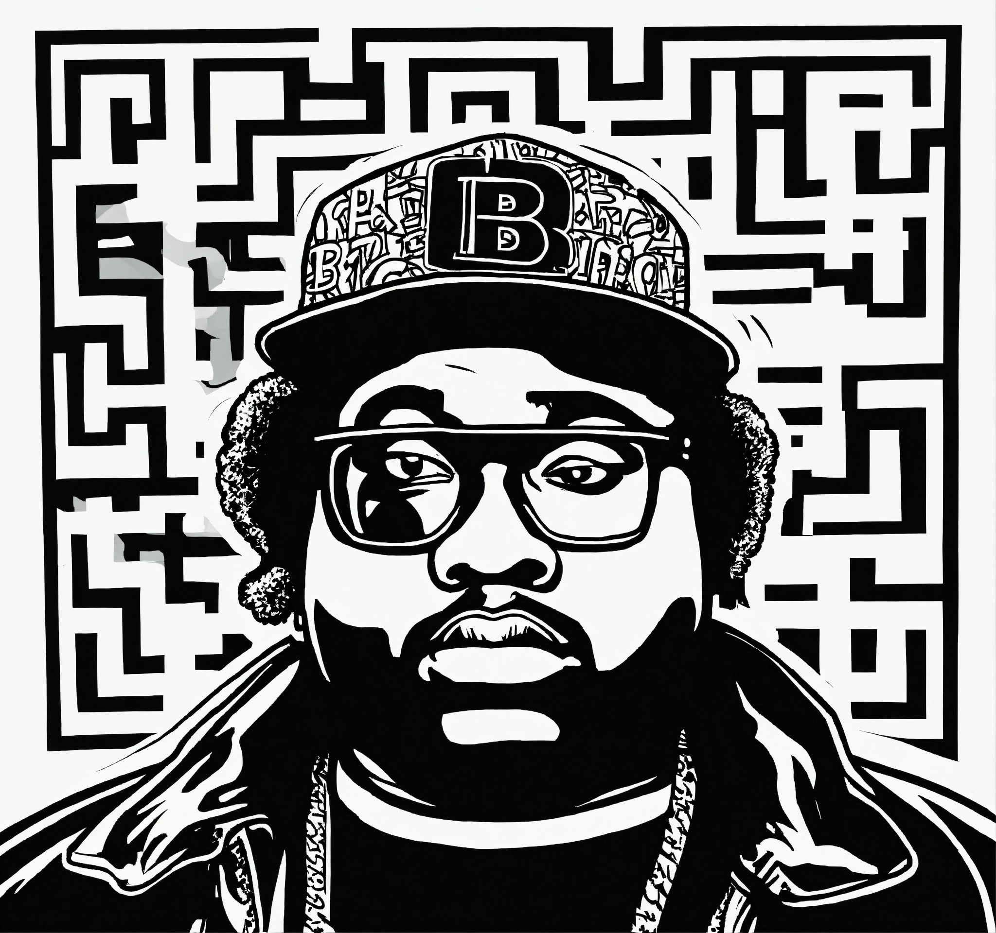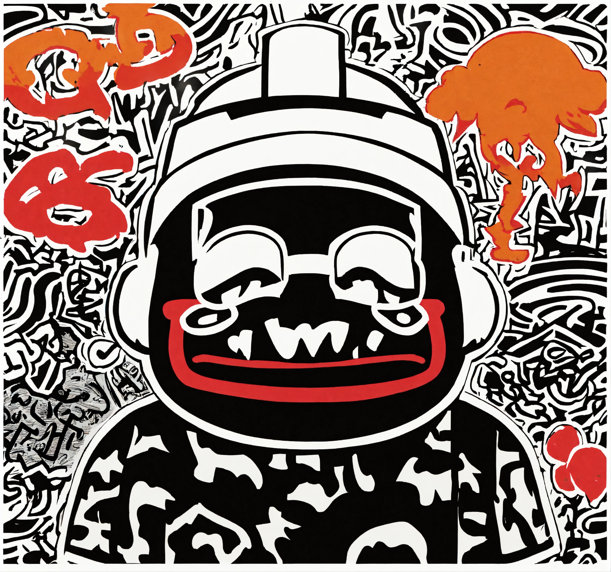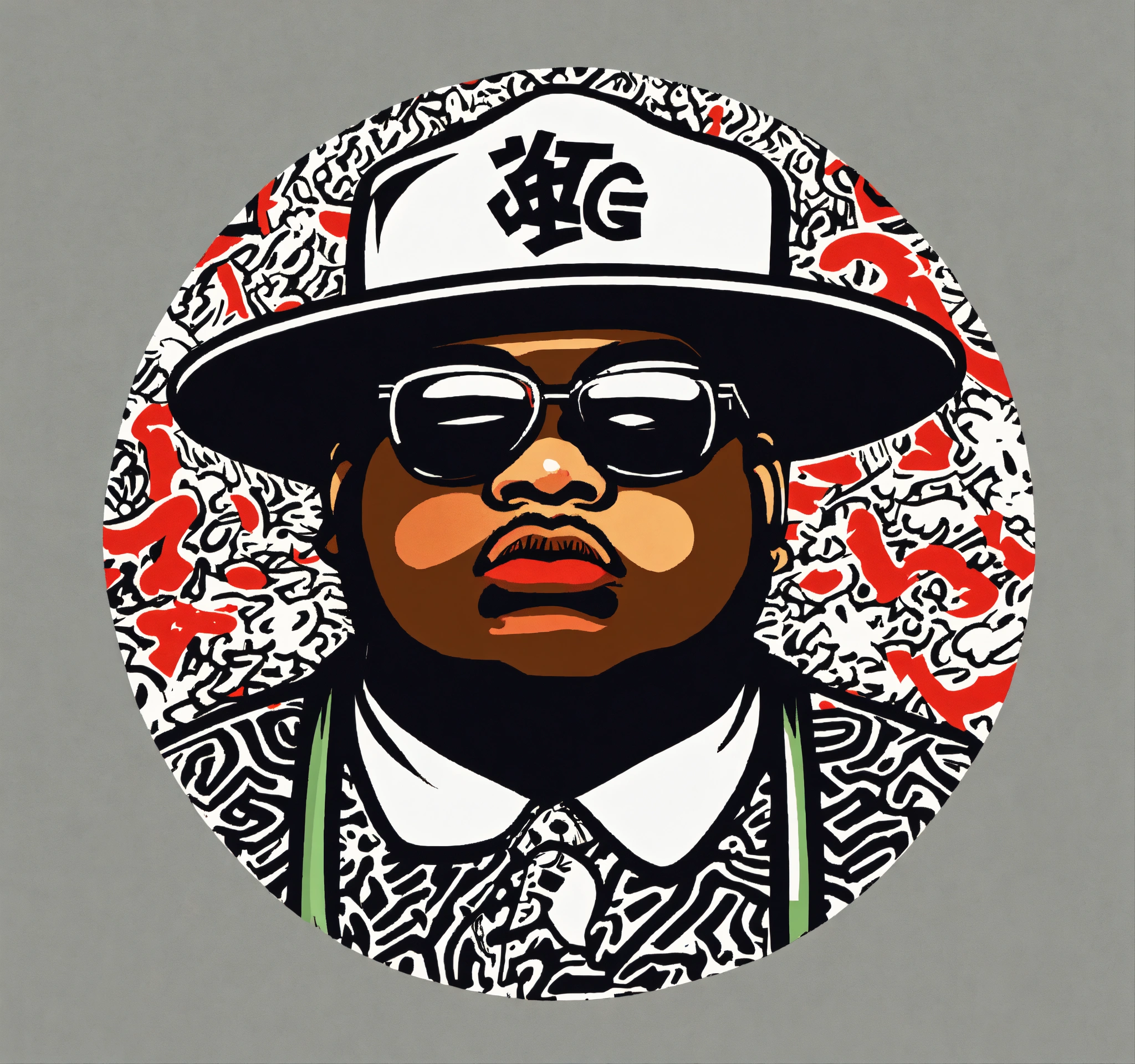 Keith harring style japanese bape graffiti cartoon logo design of the "biggie smalls", nigo boondock's inspired flat vector, fashion company logo, andy warhol style, color black and white, white background.