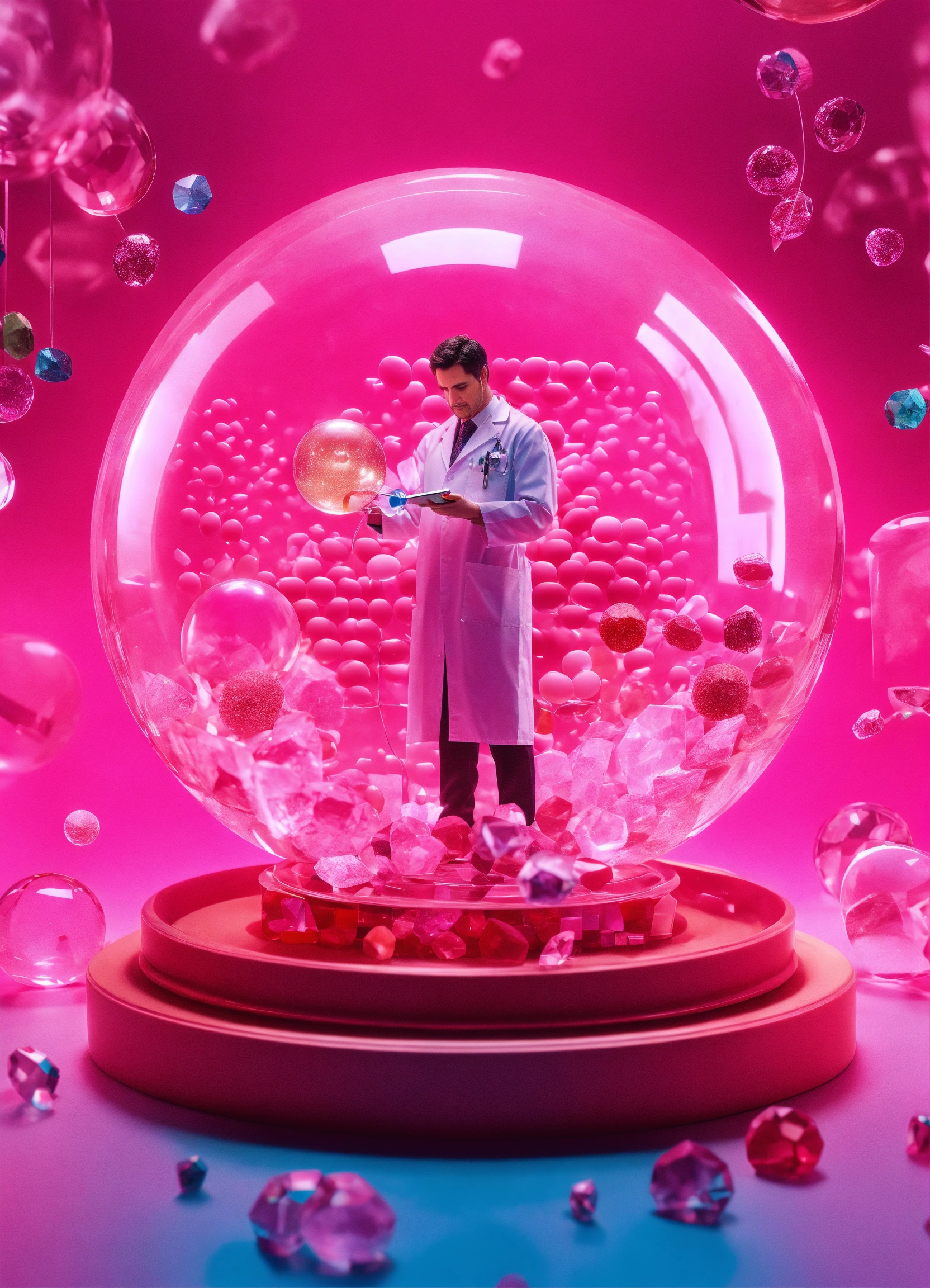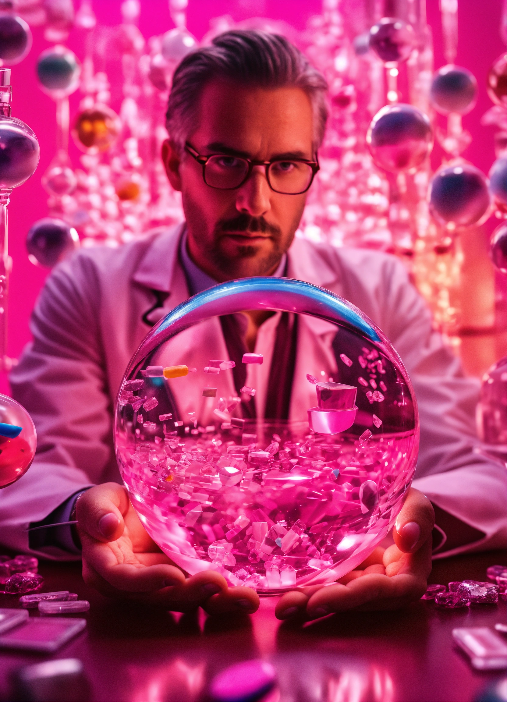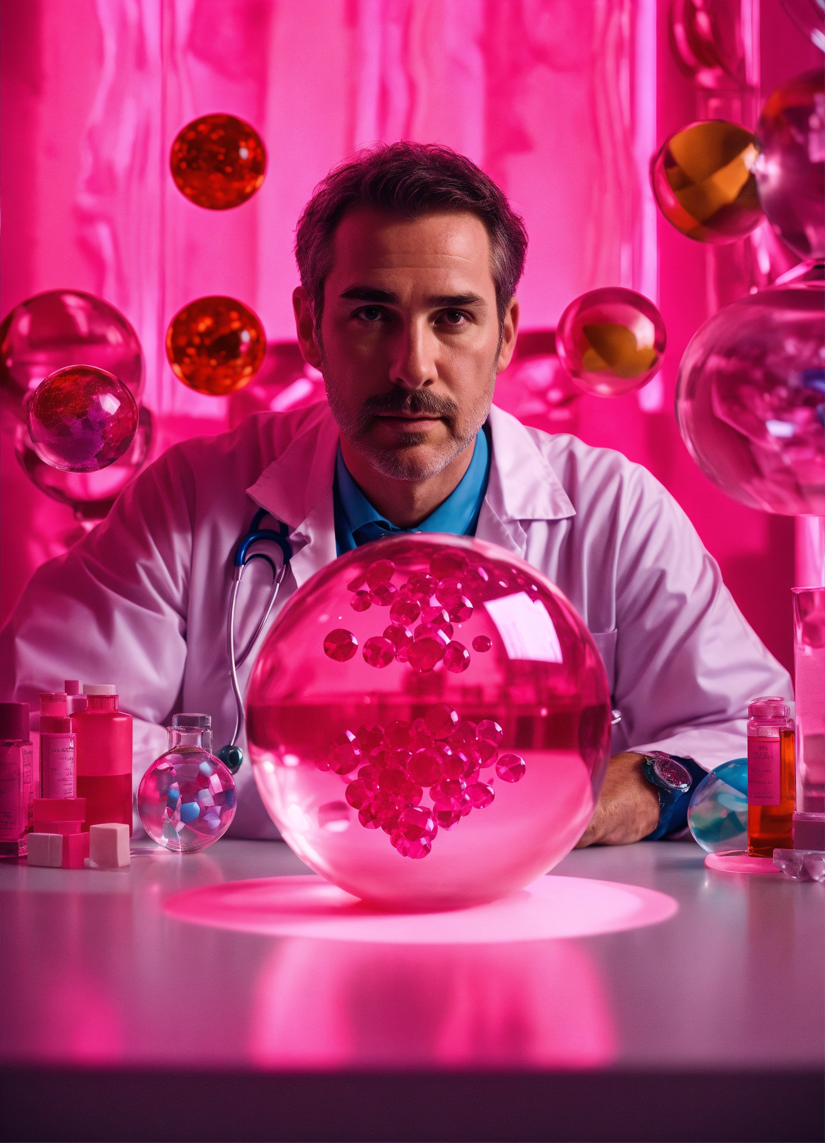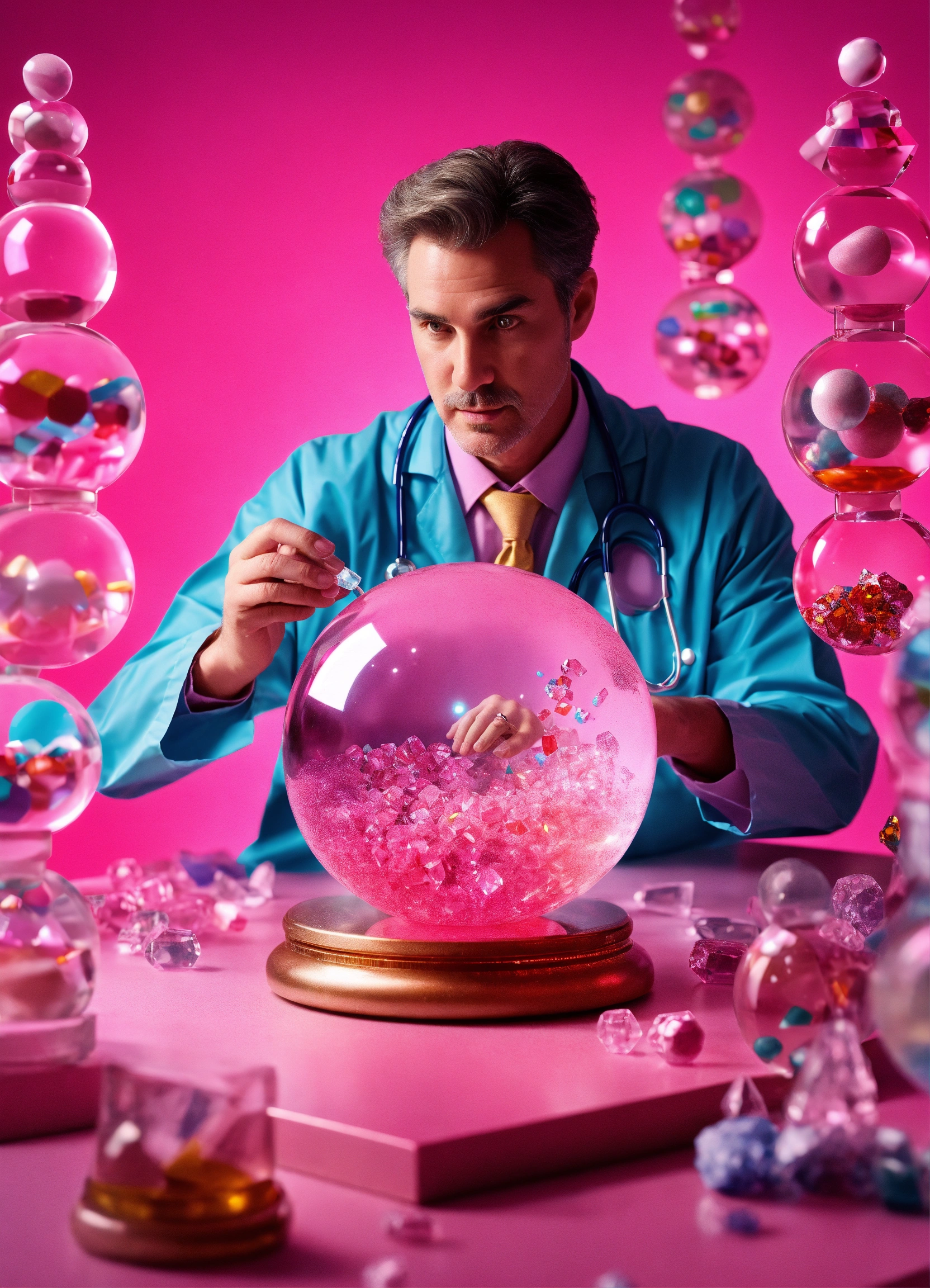 A doctor seens into a pink crystal ball. behind him is a background of floating dna and meds, hyper-realistic photograph, in the style of david lachapelle, trending on artstation, highly detailed, 8k, pink background