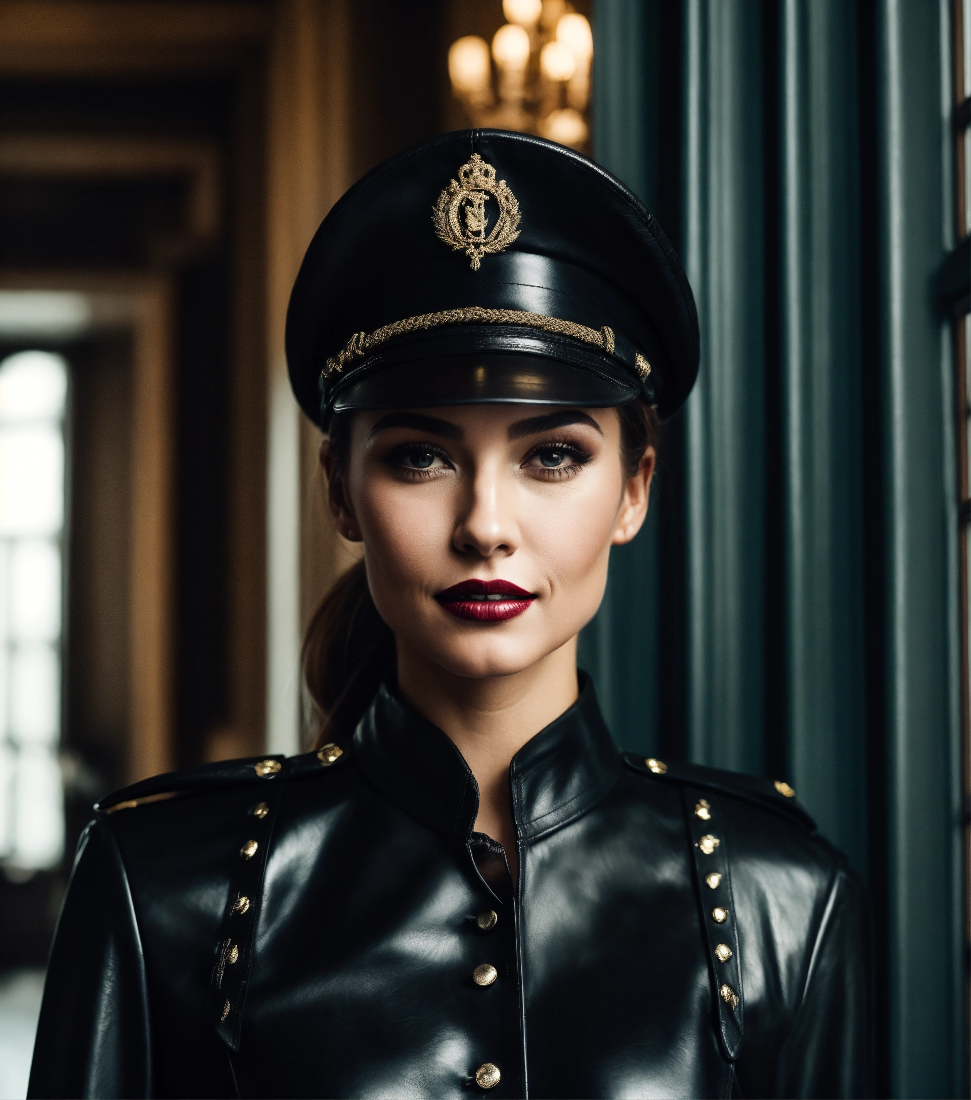 Cinematic style, three stunning dominant seductress french women model, evil smile, straight high ponytail hair, strict military black leather uniform shirt, black leather pencil skirt, black leather military cap, mansion room