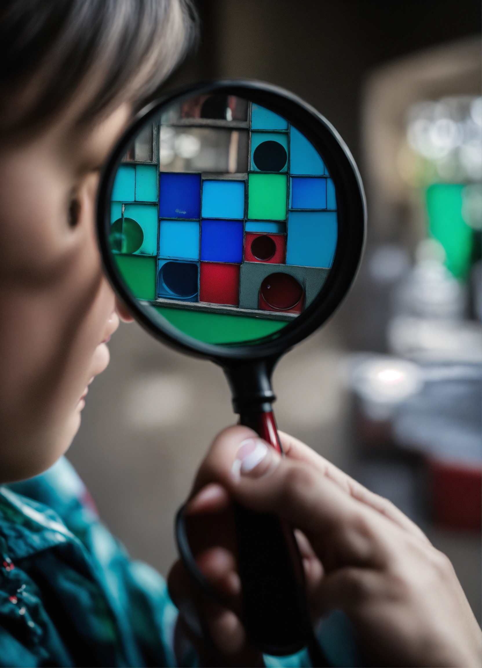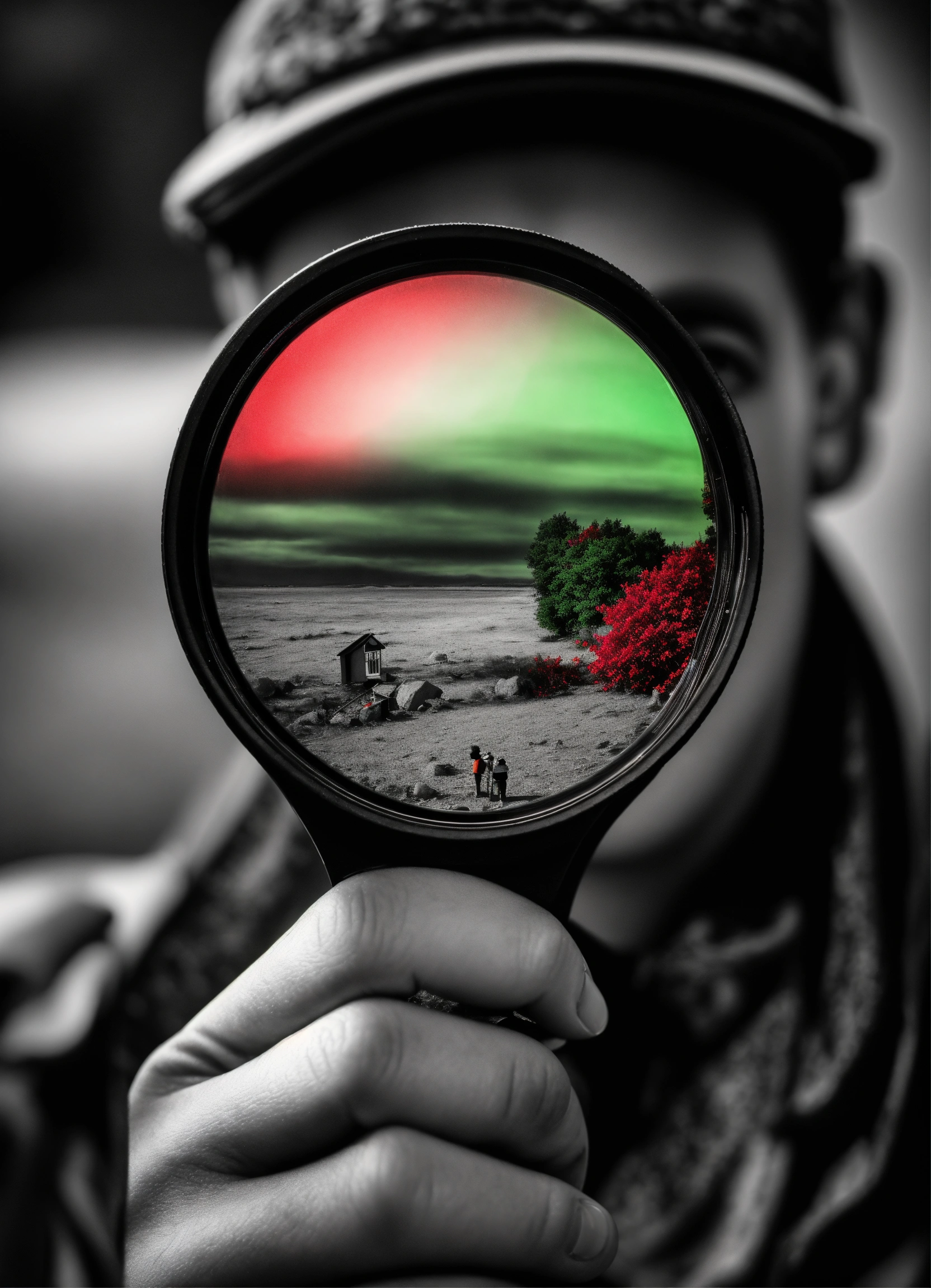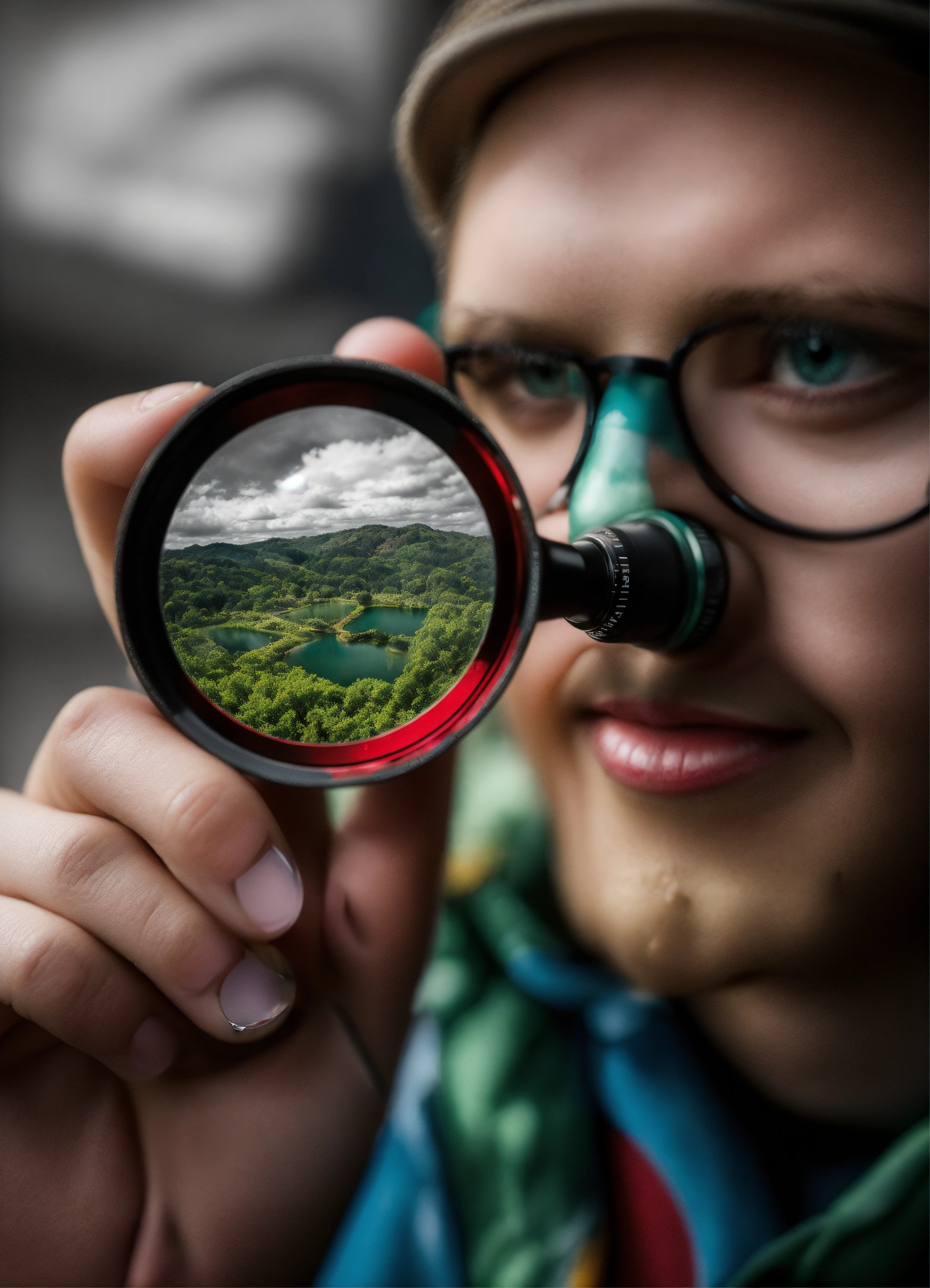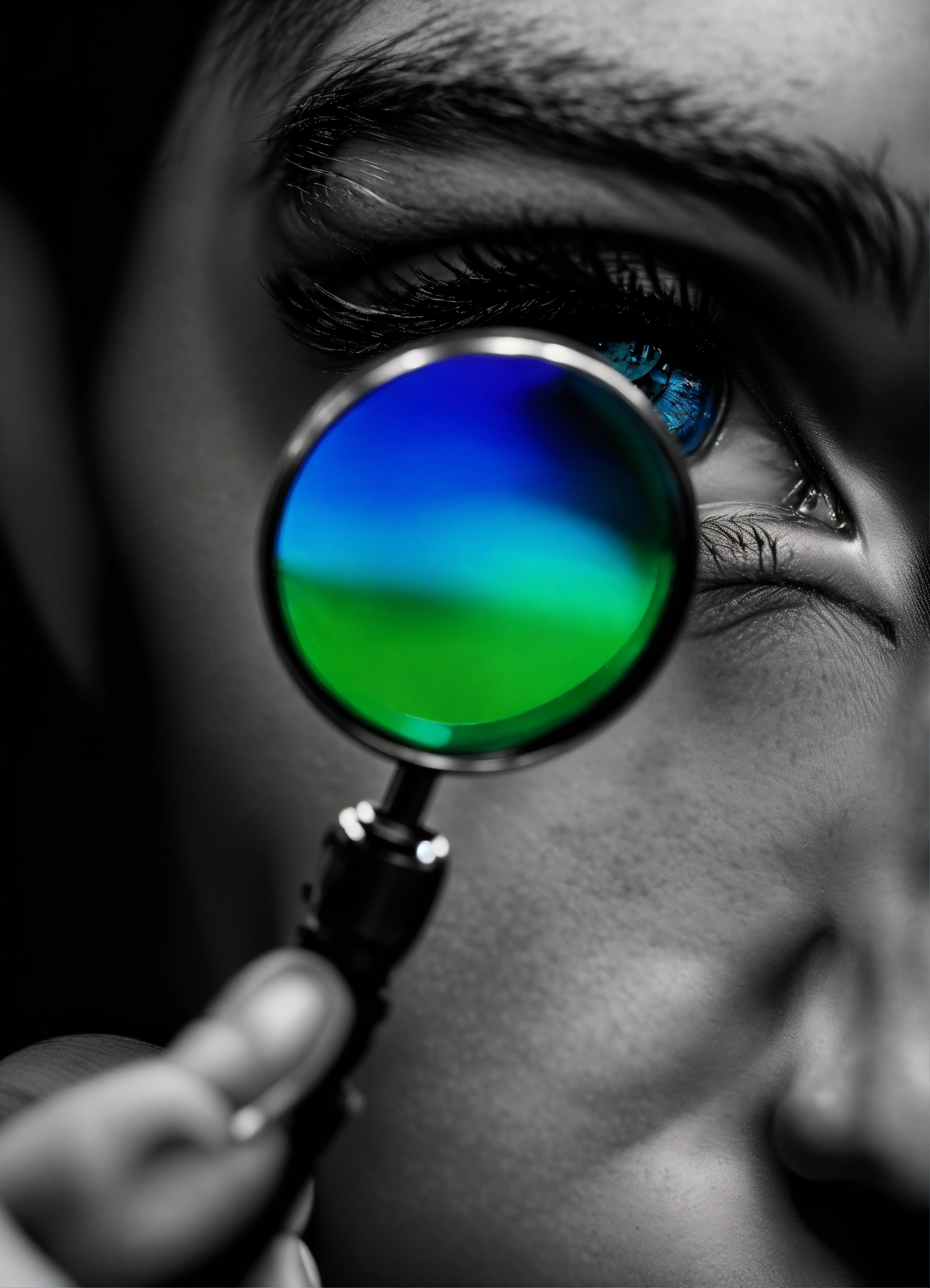 "vivid perception", person holding magnifying glass, rich blues, greens, and reds within lens, grayscale world outside, nikon d850, contrasting hues, photorealistic style.