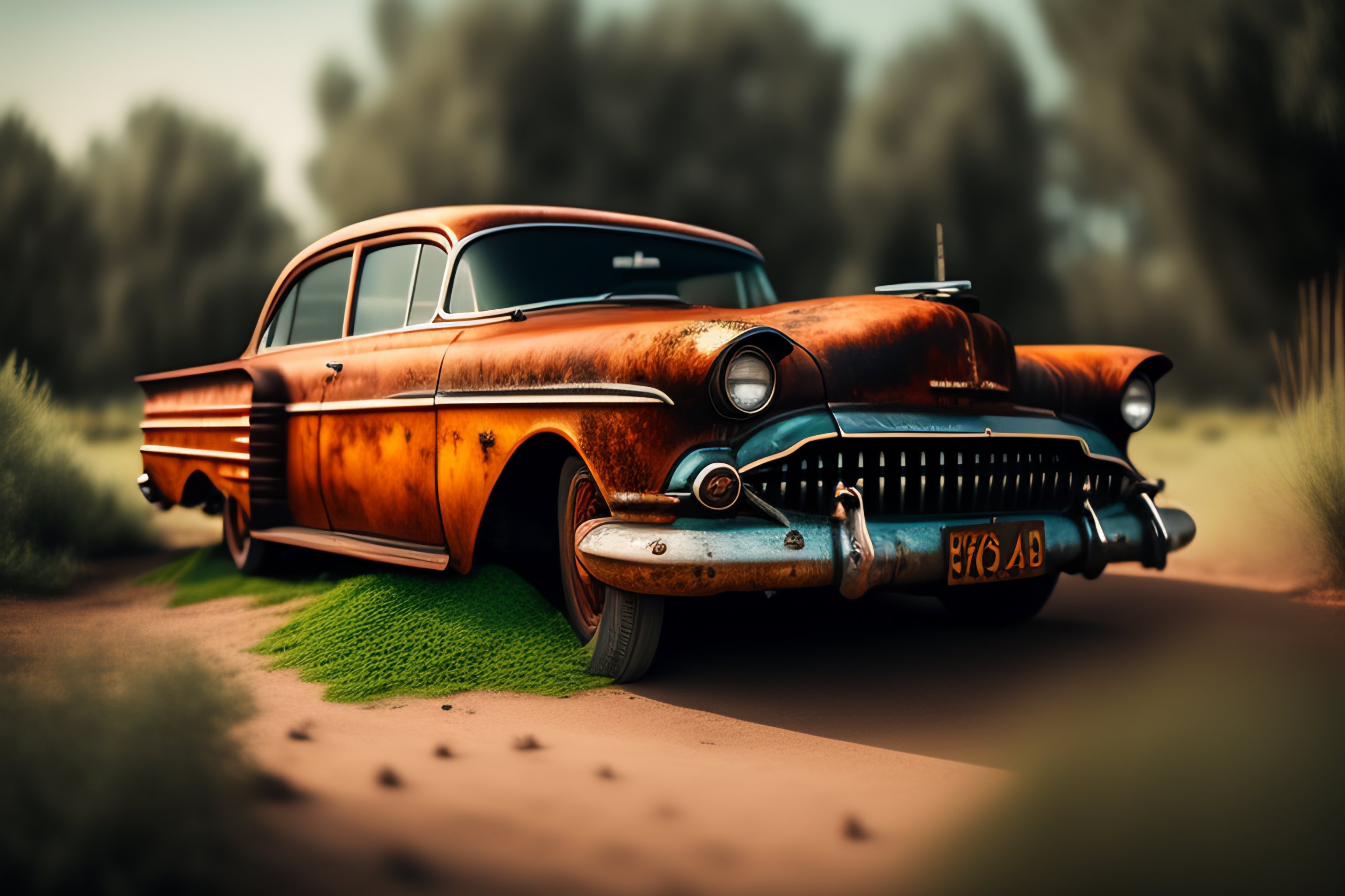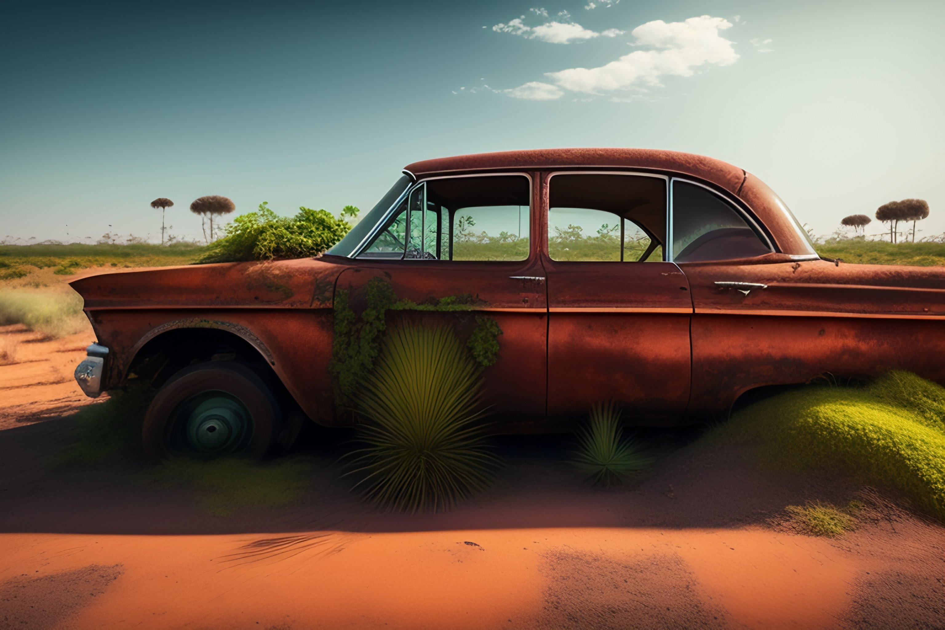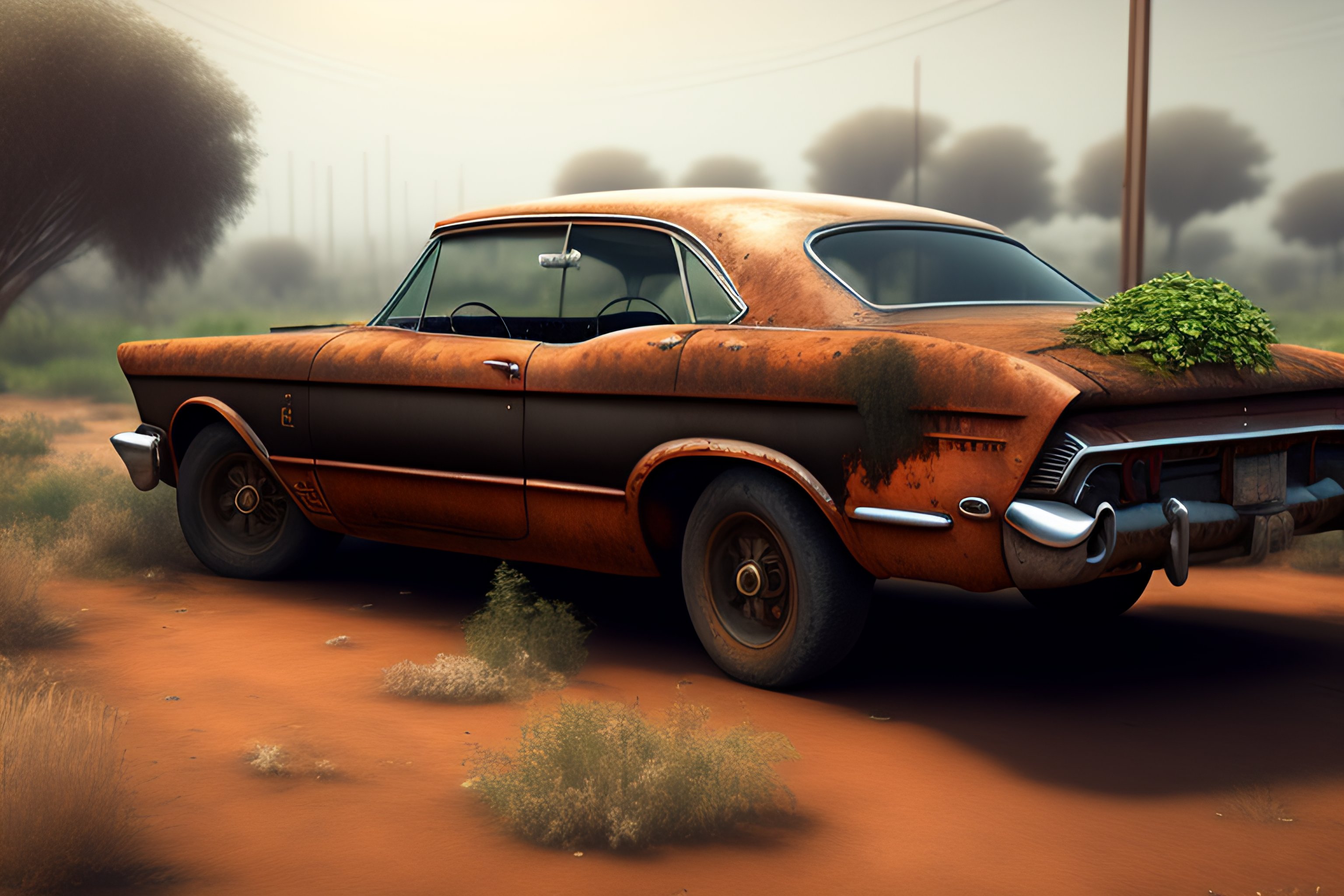4k view of a old rusty car covered in vegetation with rusty body side of a gas station, in a modern city scape covered with vegetation and dust