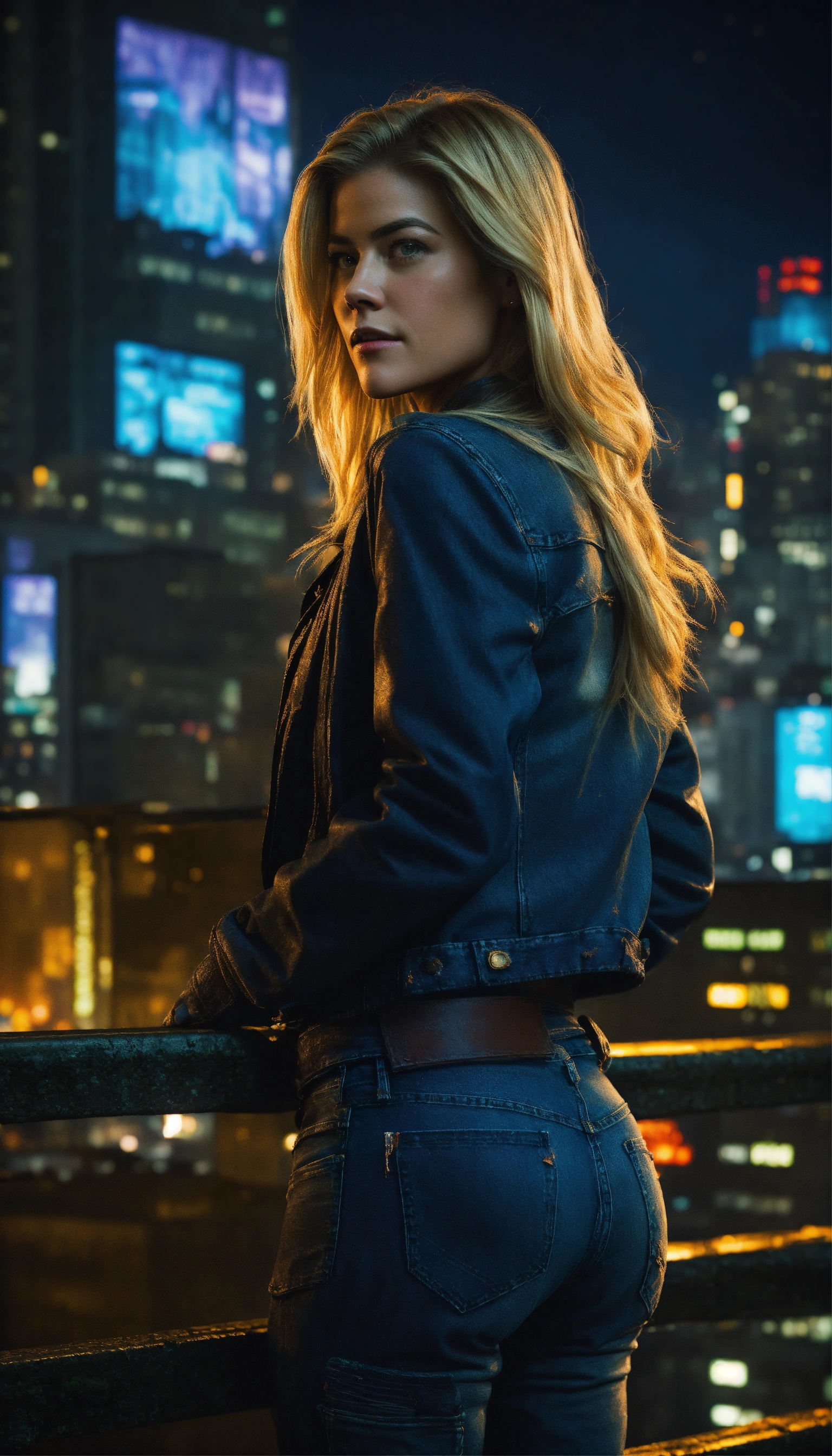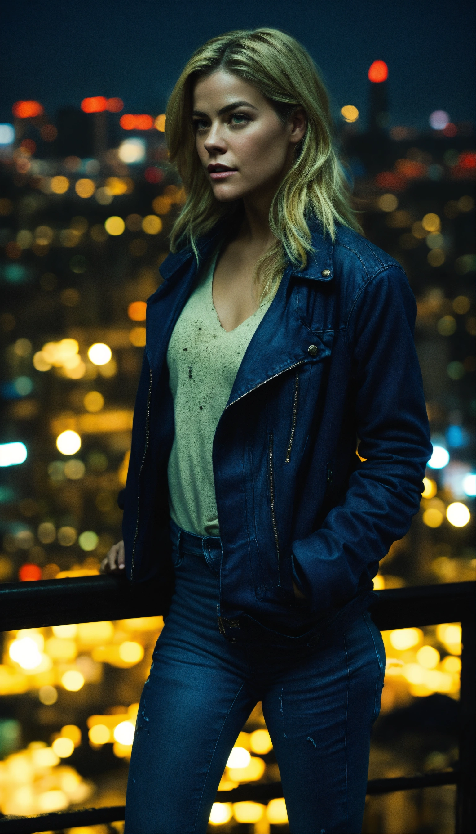 Beautiful blonde girl, rachael taylor long hair, altered carbon style, dark, ruined cityscape, light, cinematic, epic, night, detailed, jeans, realistic