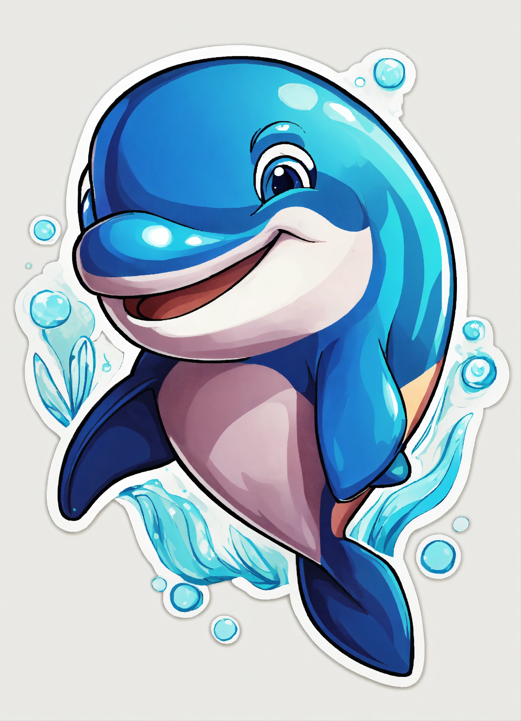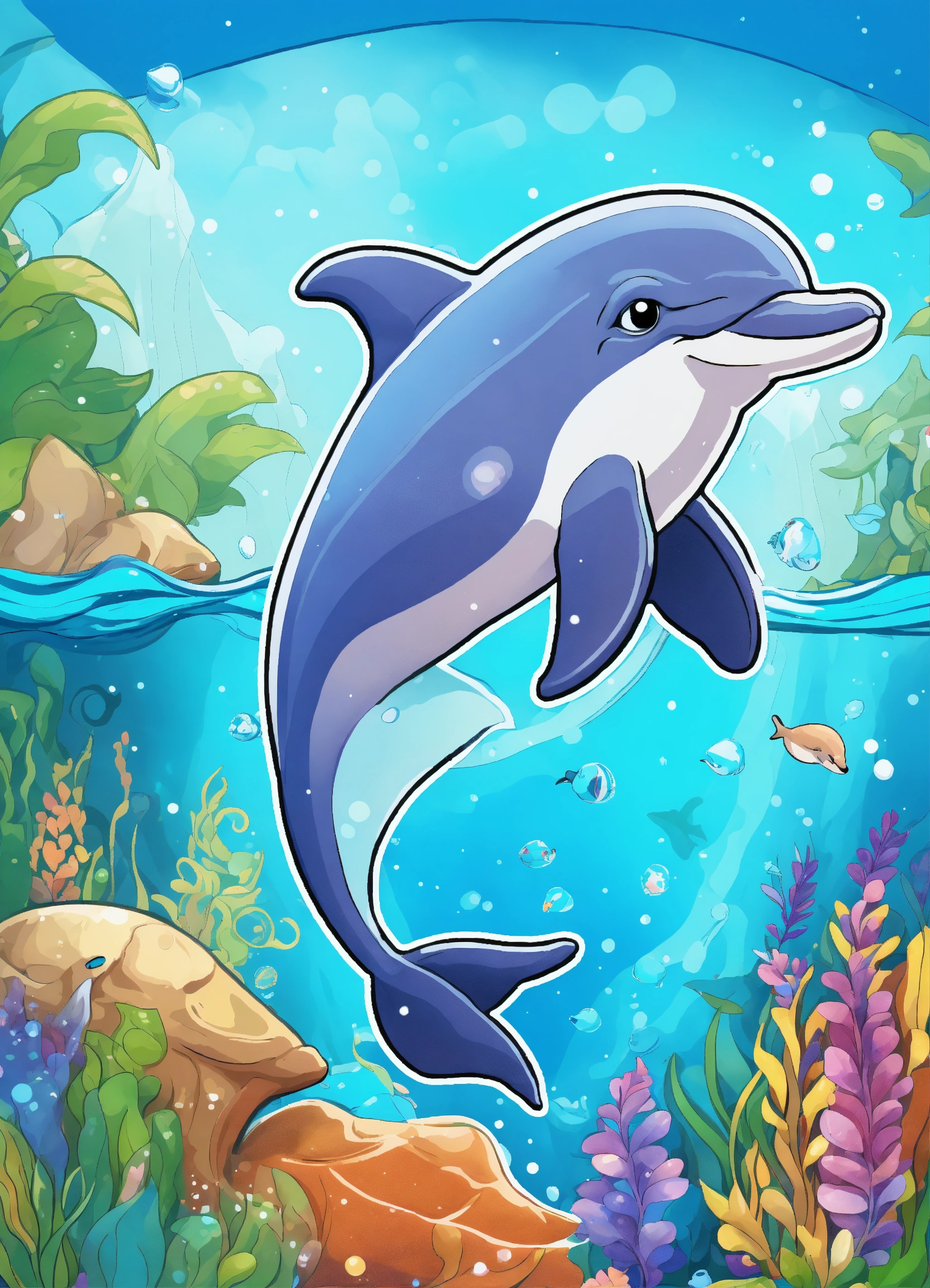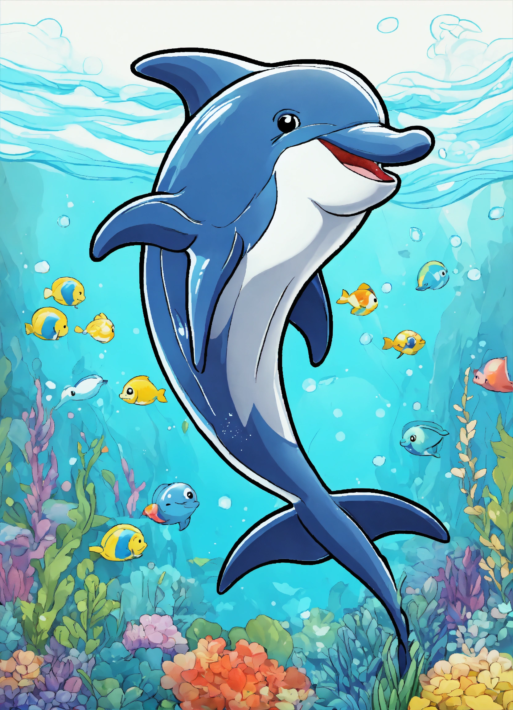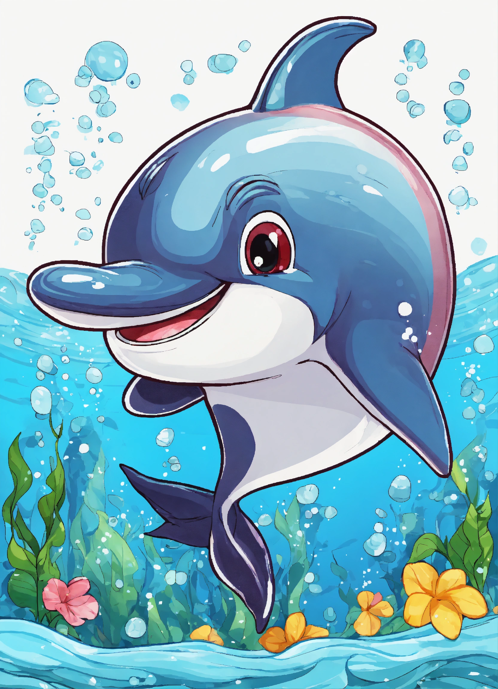 Generate a cute dolphin of the selve, 4k resolution, cartoon-sticker style with clear lines on a pure white background suitable for a children's coloring book.