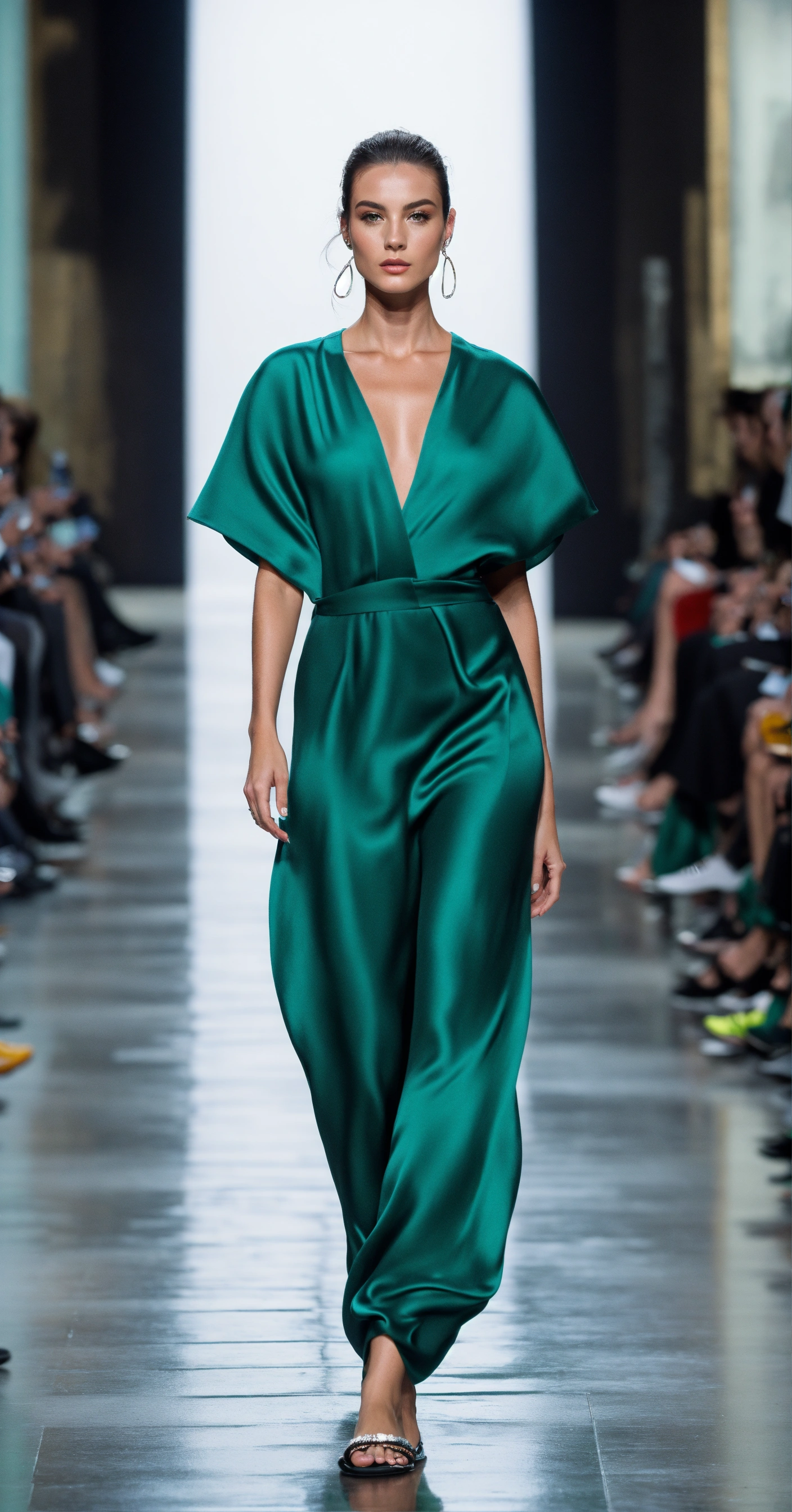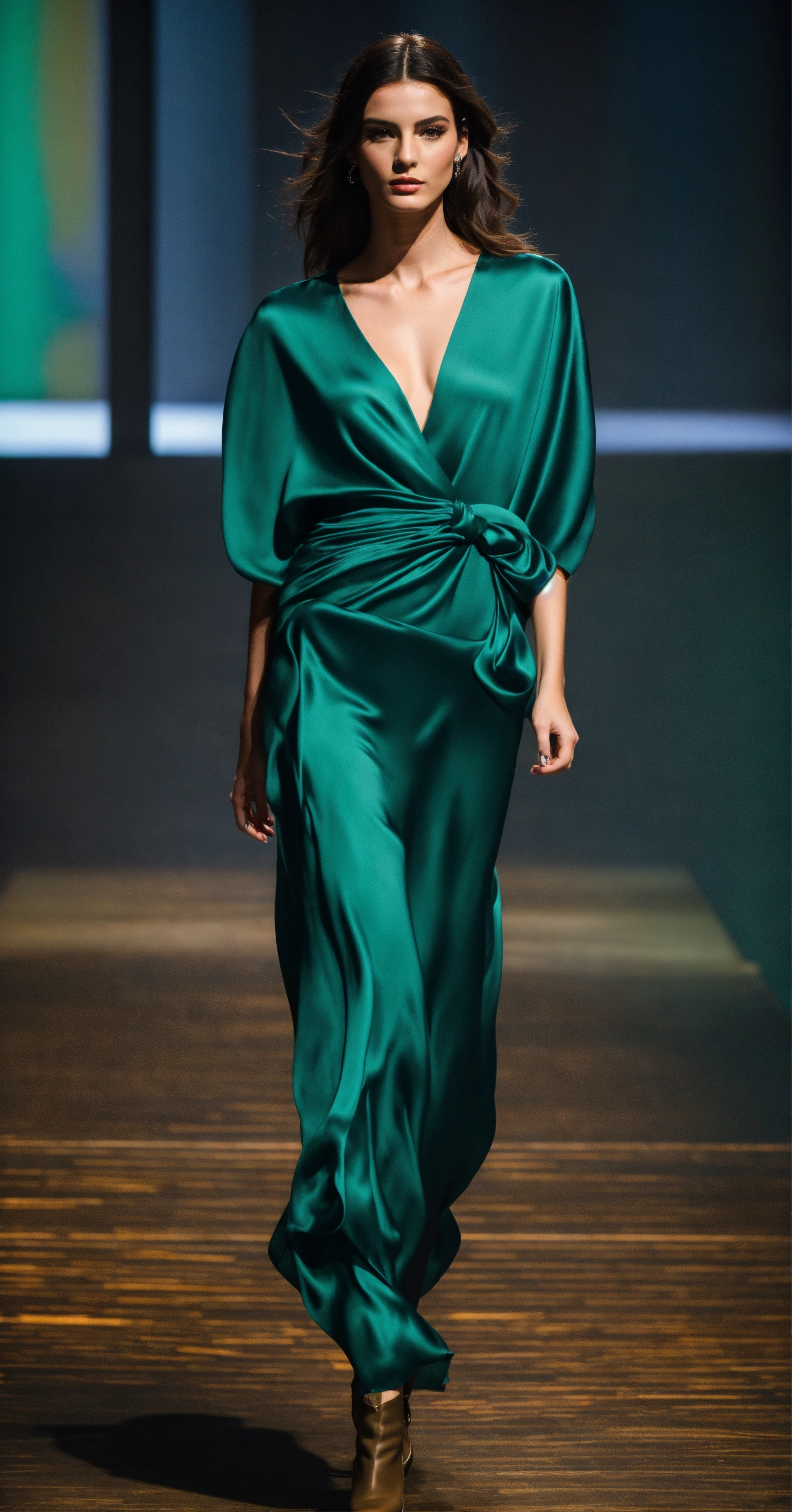 Ultra realistic full body photo of italian female model walking the runway modeling novelty interesting complex unusual street romantic modern brave funky dark teal green silk comb8ned with jersey dolman top