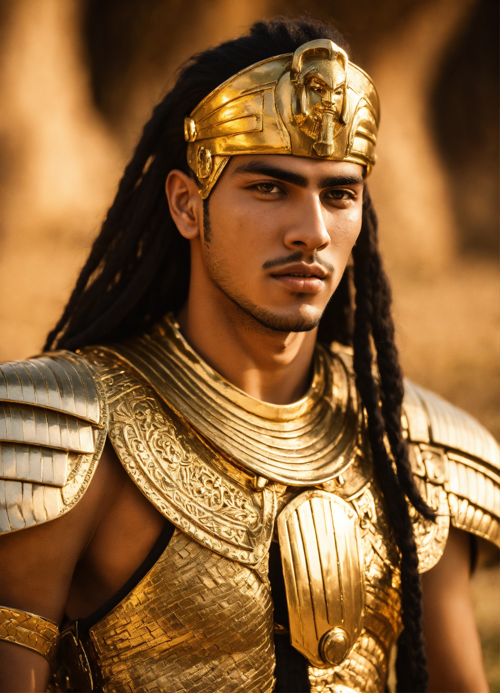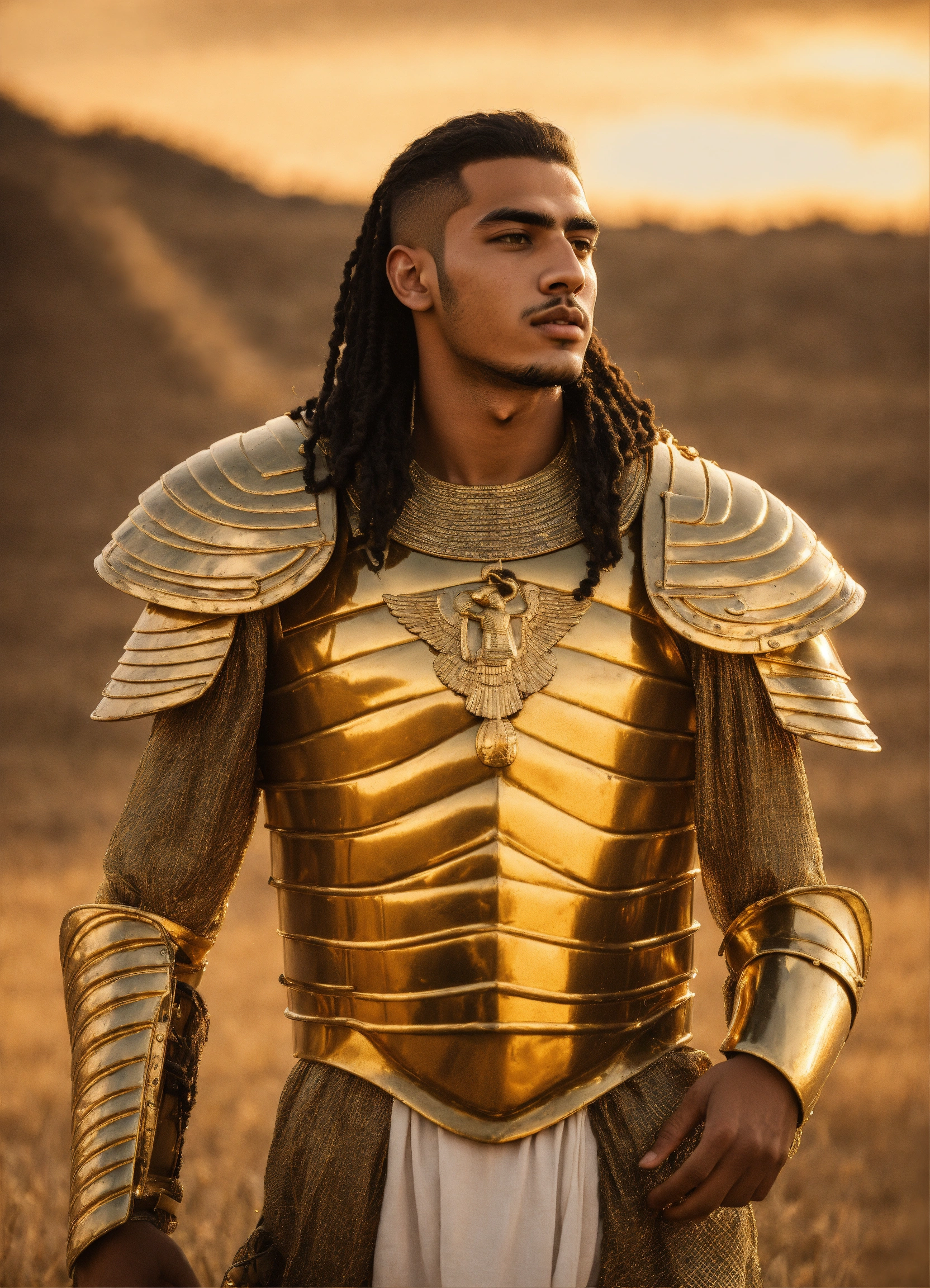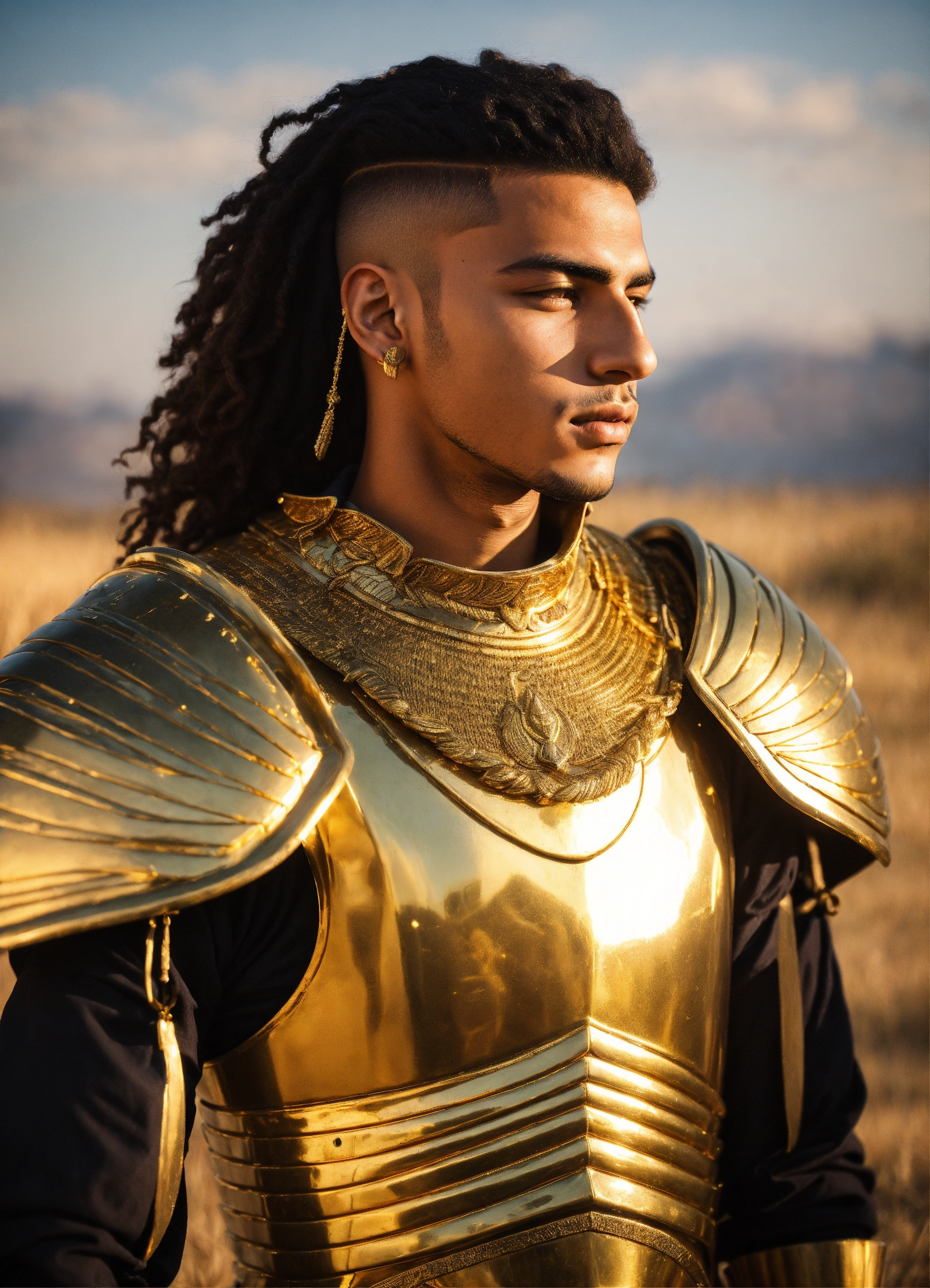 Handsome 20-year-old egyptian male with long neat loc’s, smooth skin, full lips, dressed in gold battle armor, in field, confident demeanor