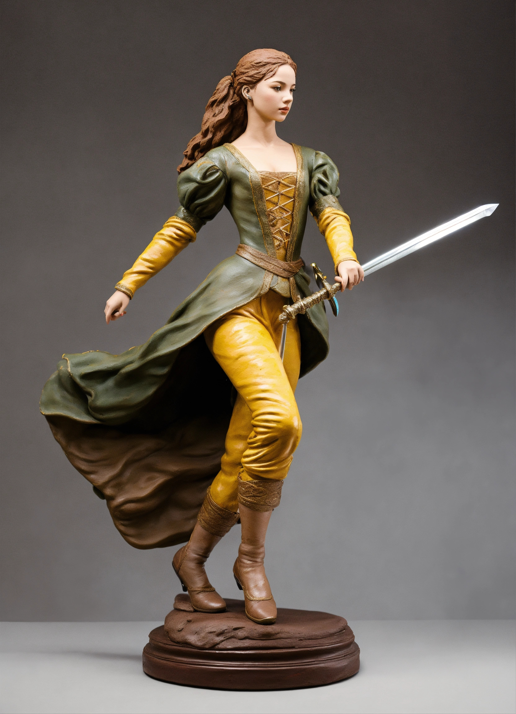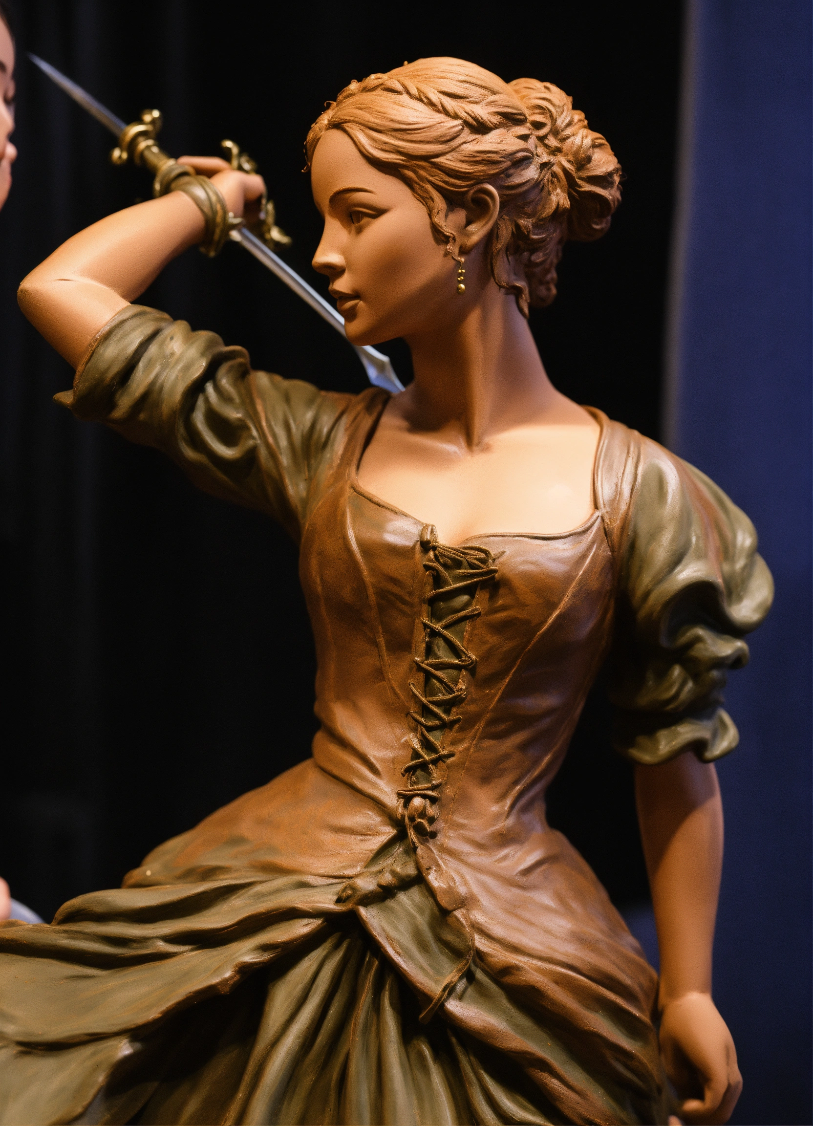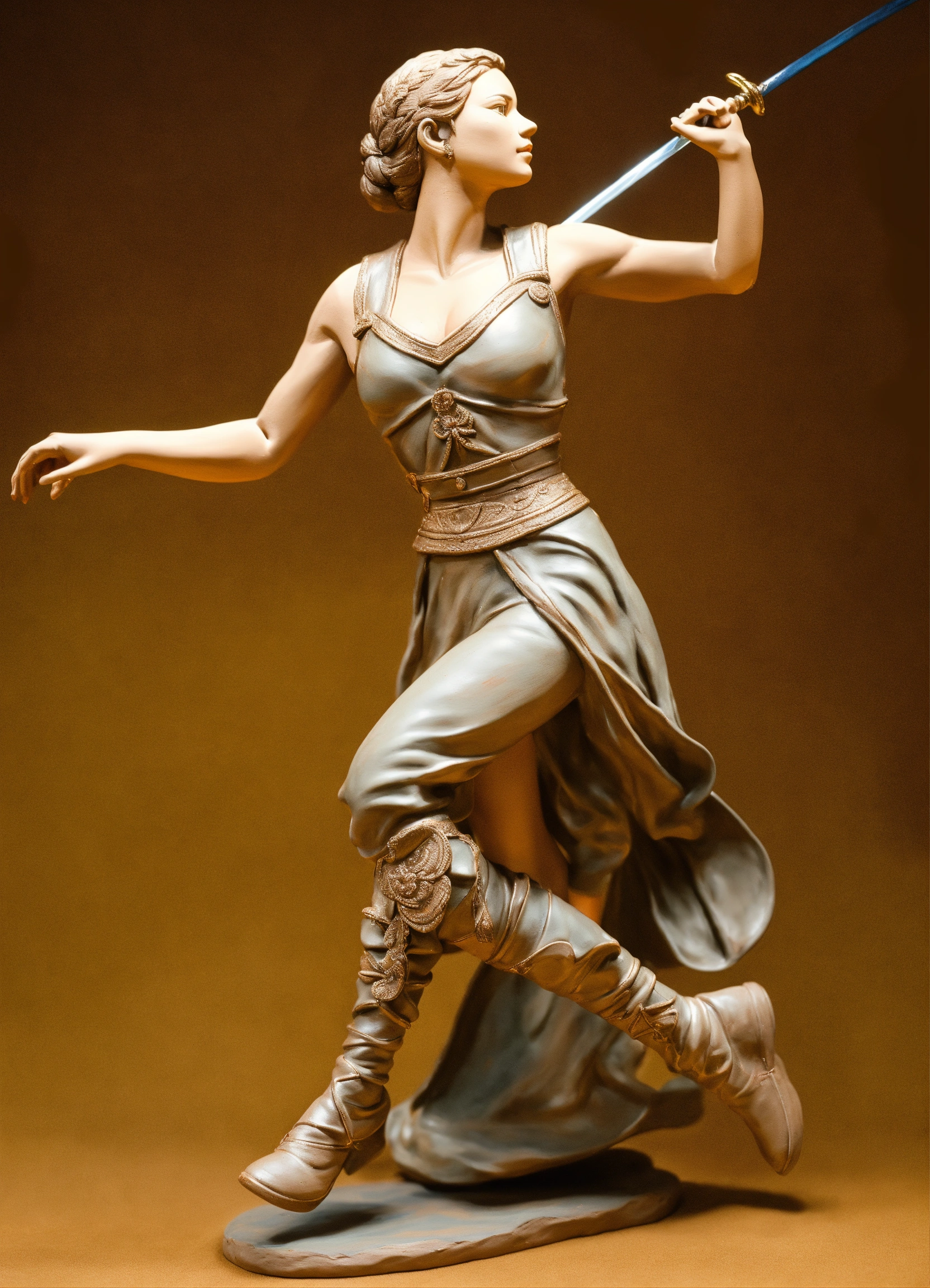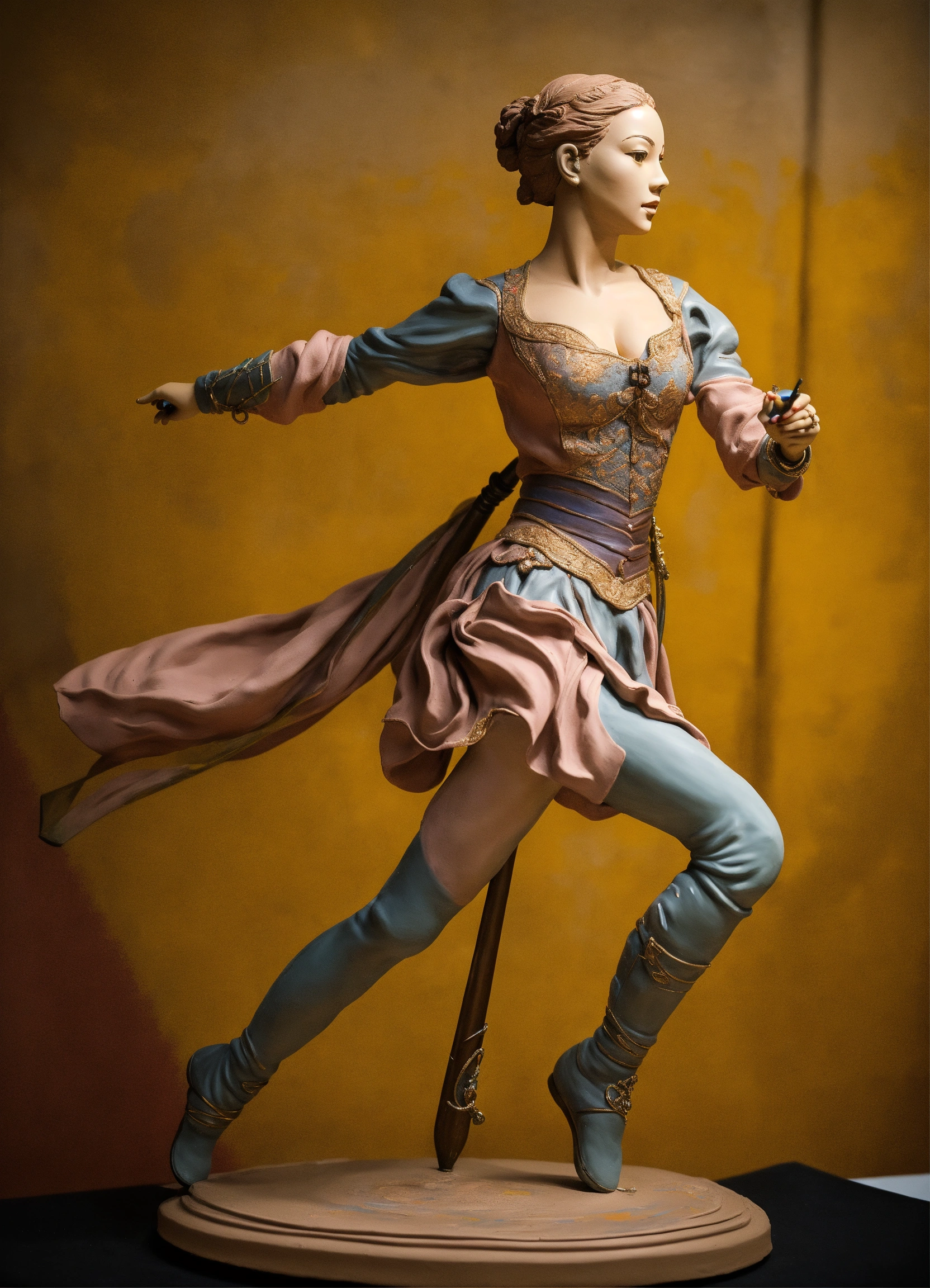 A realistic lifelike painted lifesized clay sculpture of a beautiful young female dancing with a rapier