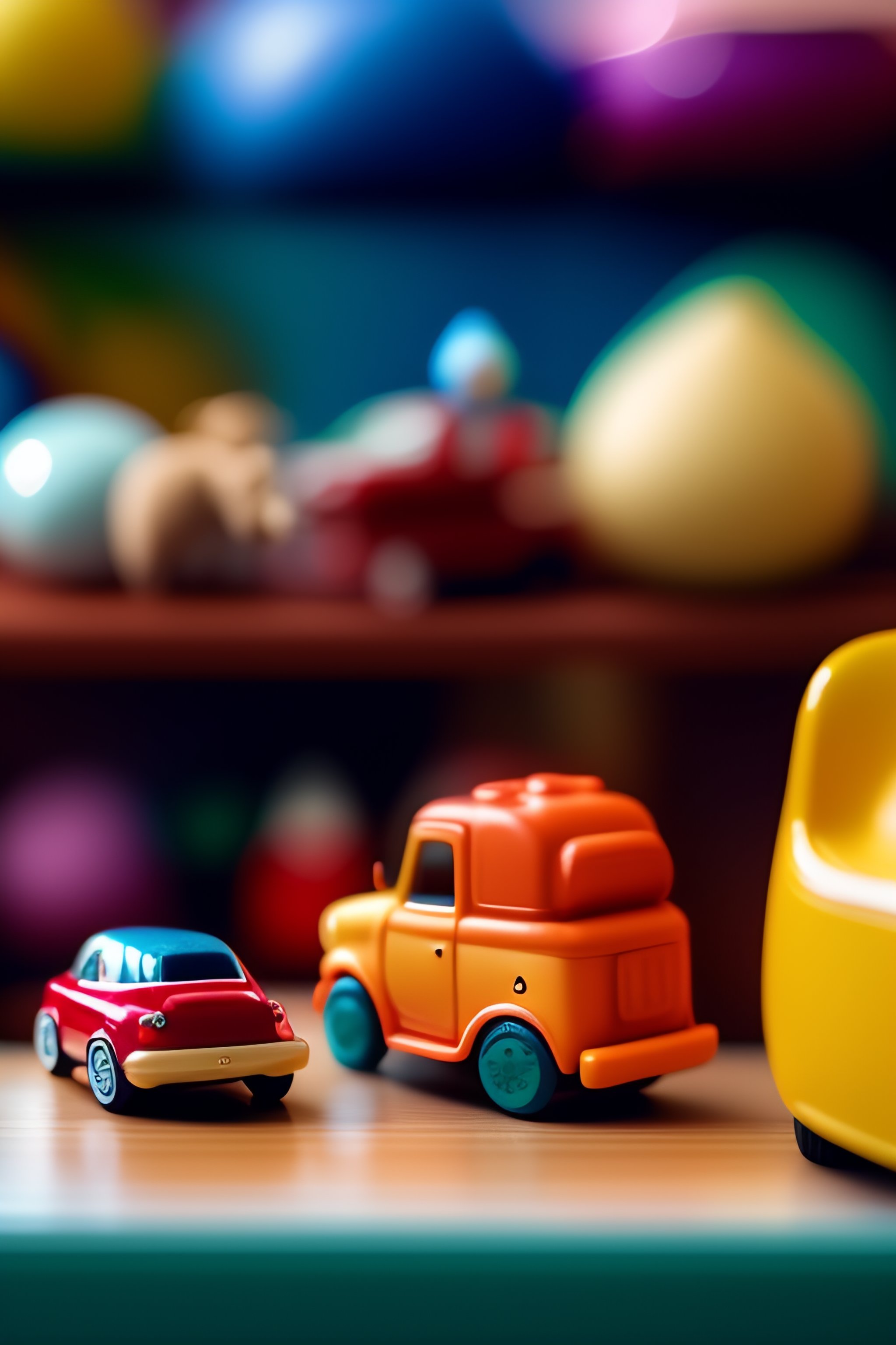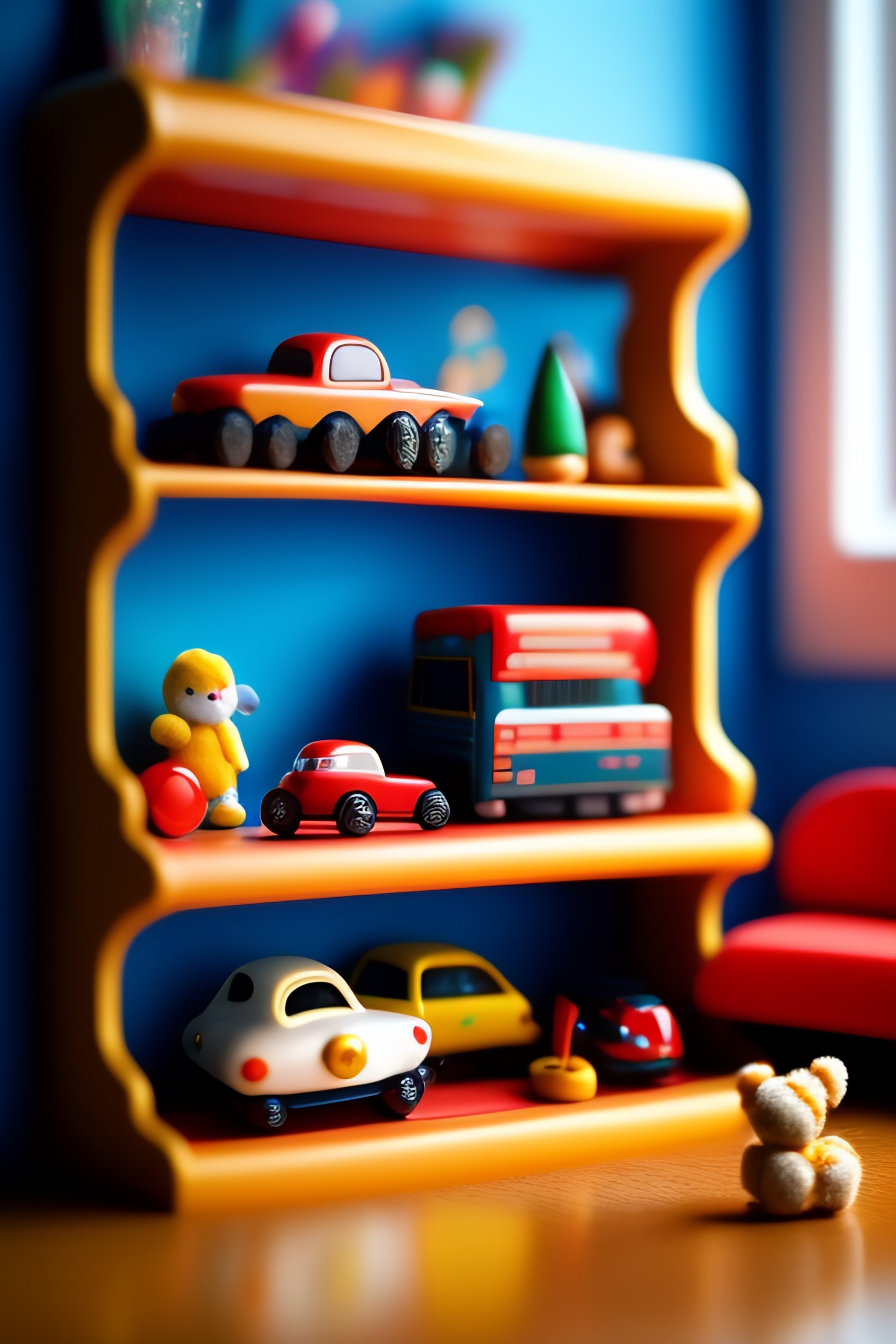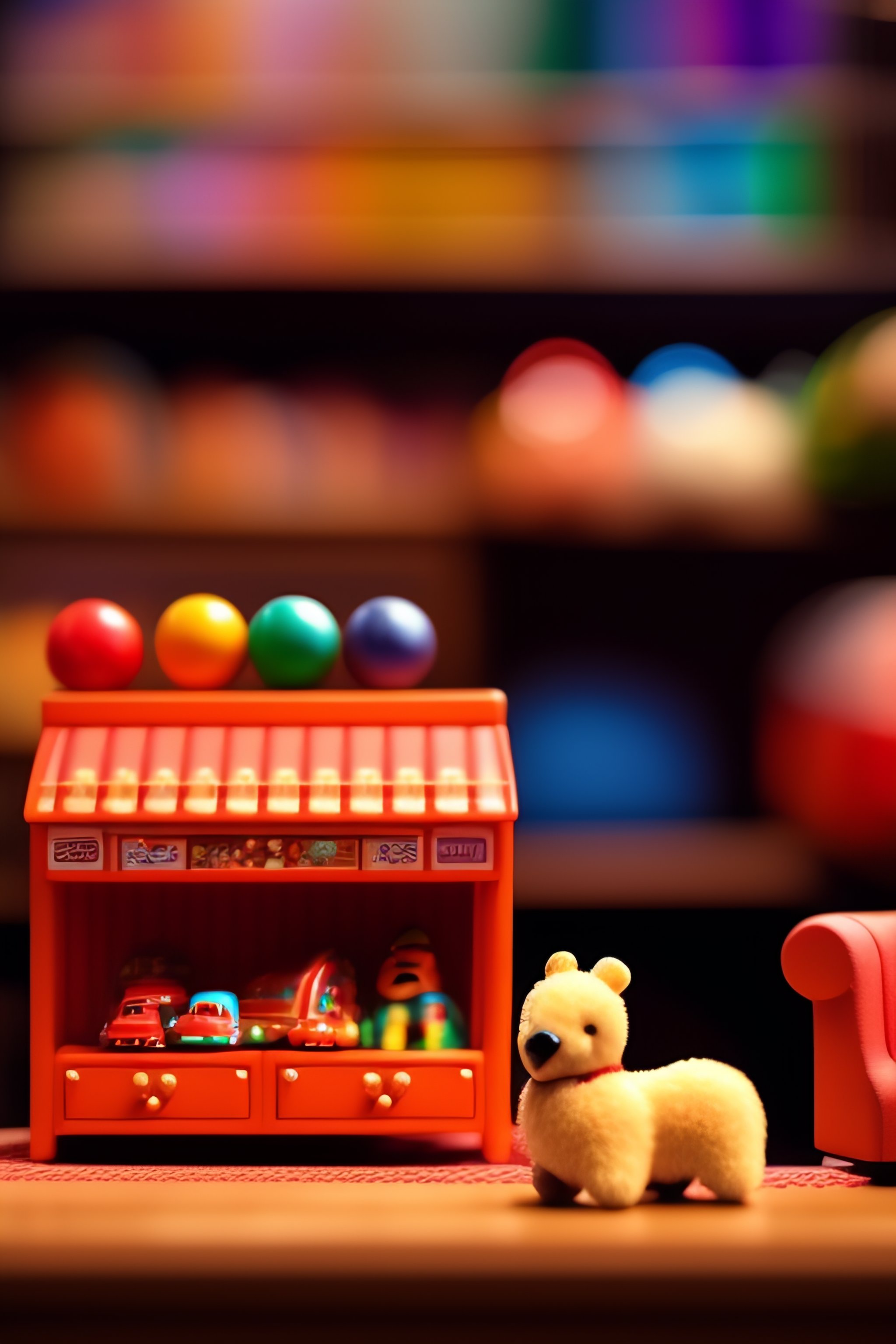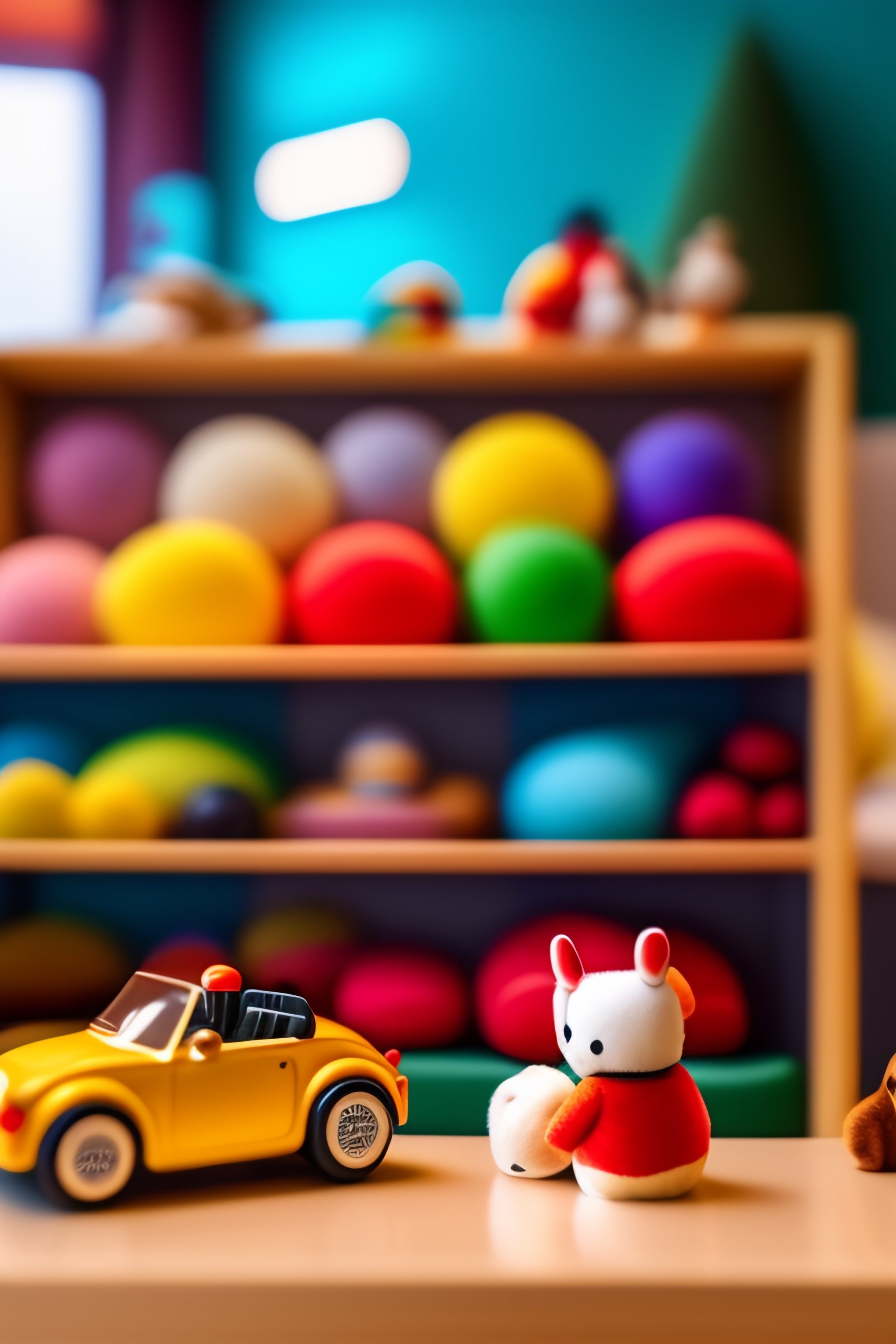 A toy store with an array of different toys on display a group of stuffed animals huddled together on a shelf a plastic car racing along a table a doll sitting on a couch, with a miniature tea set in front of it