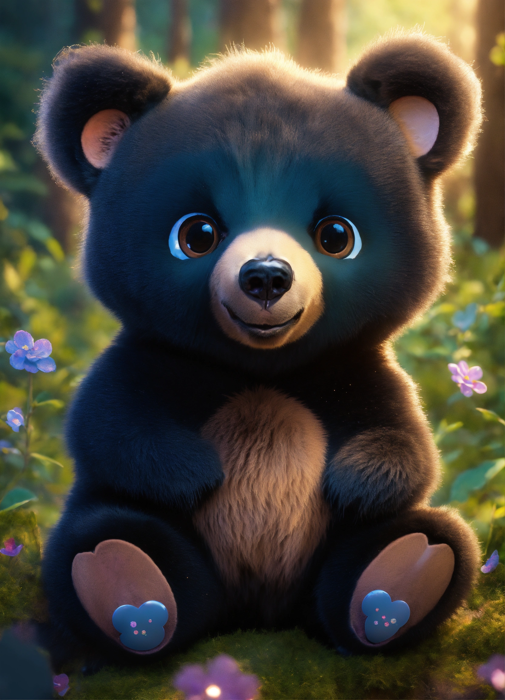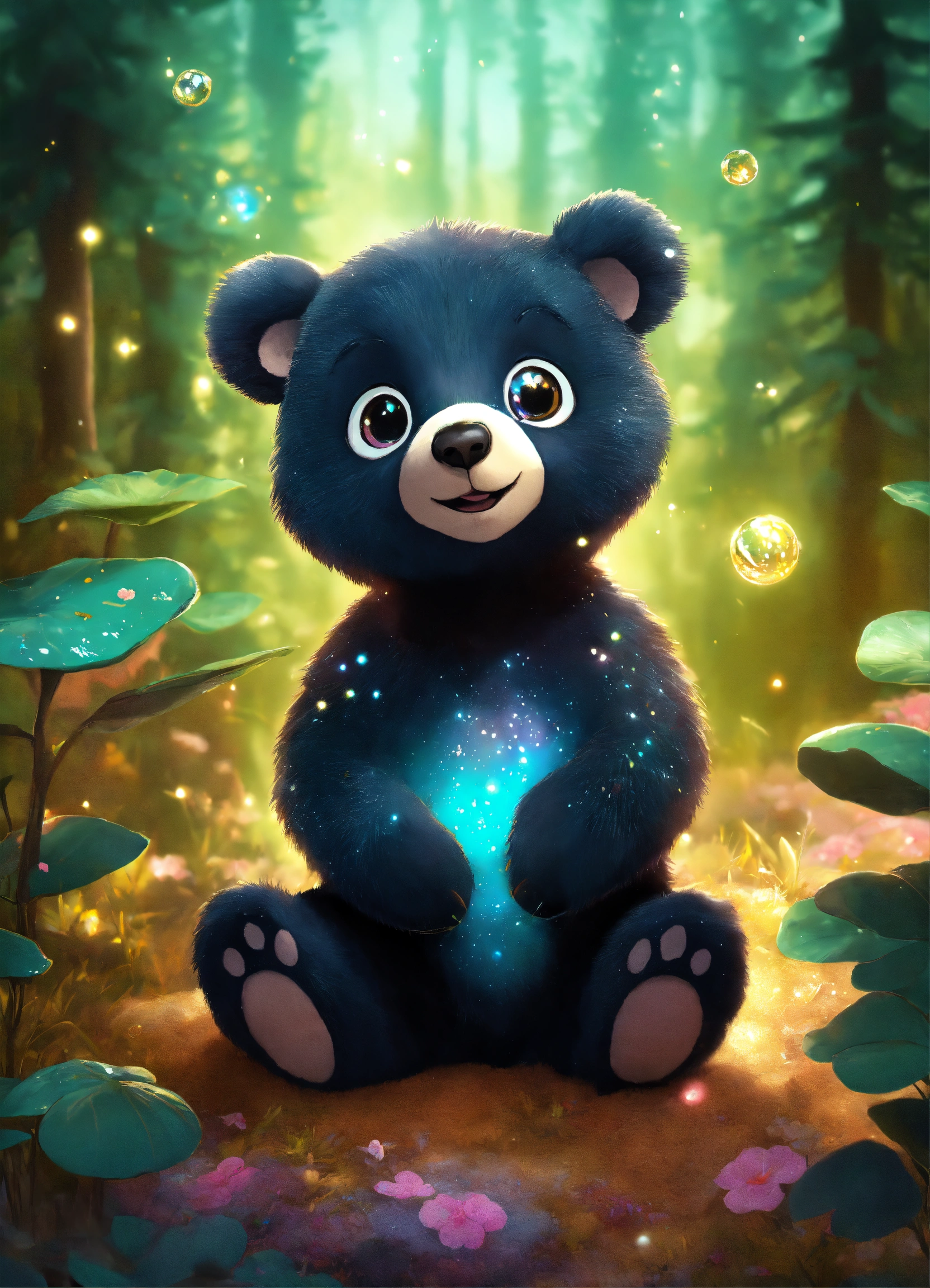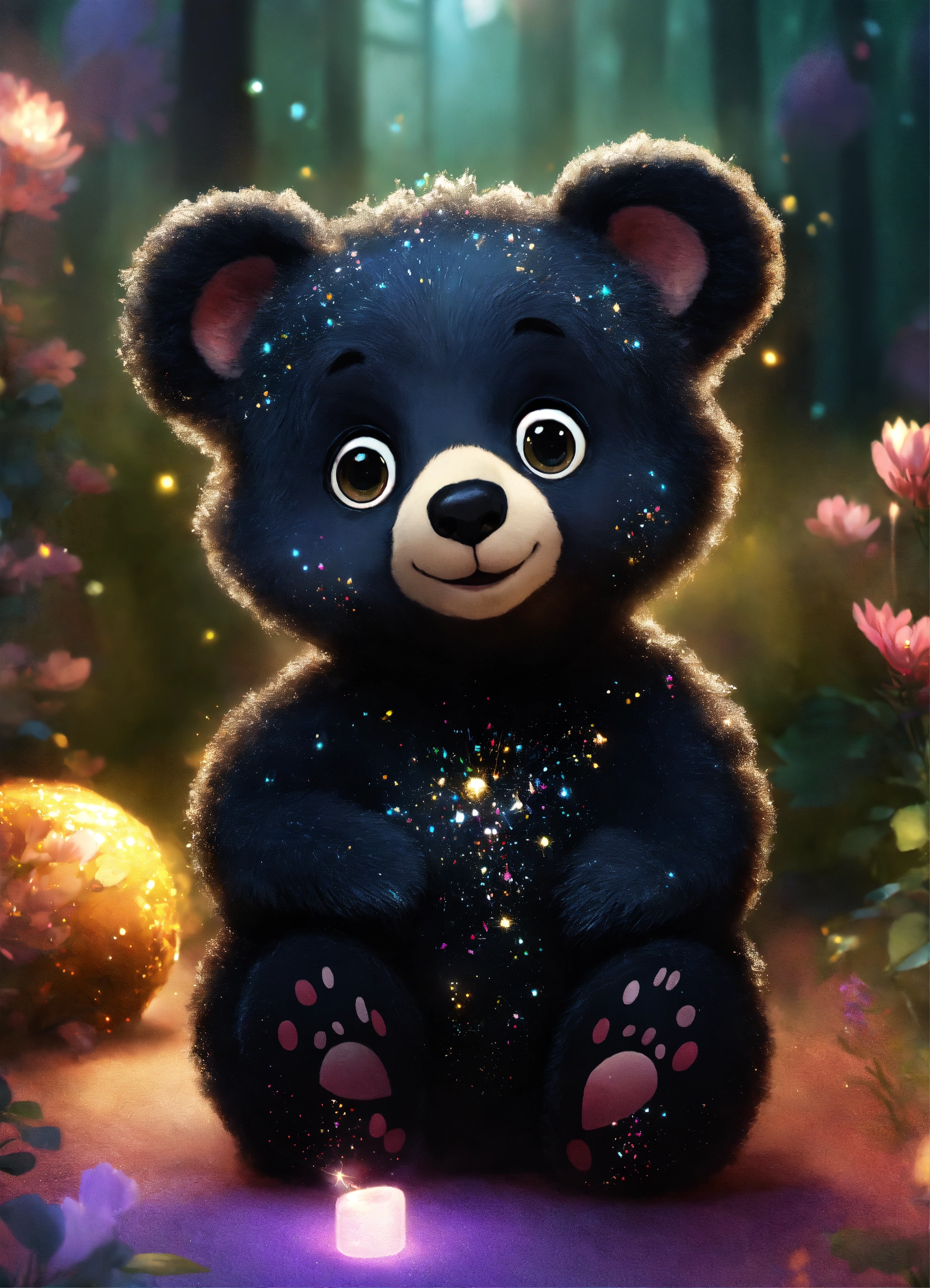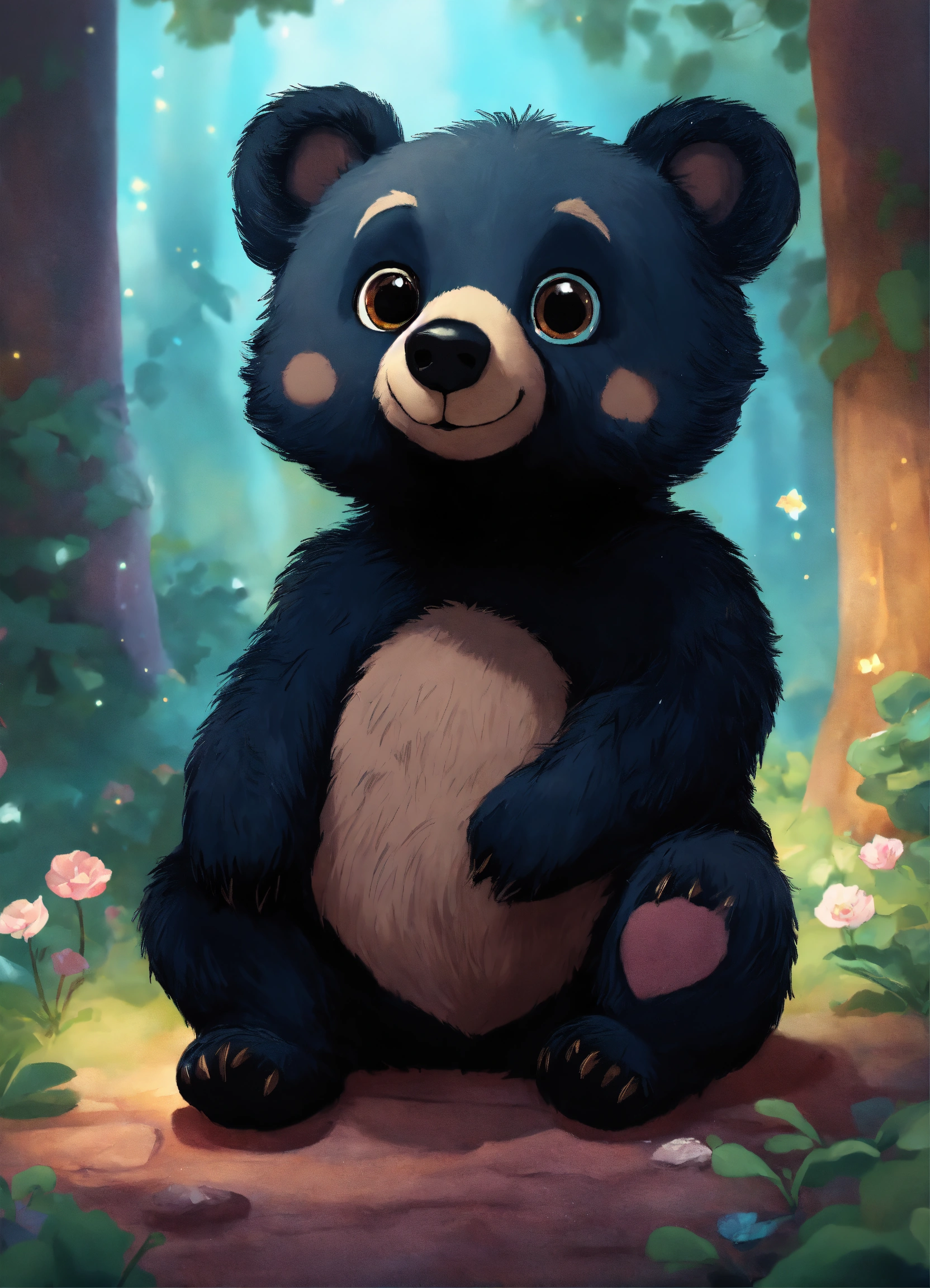 "an adorable black bear cub with oversized, sparkly eyes, animated in a whimsical, fantastical cartoon style."