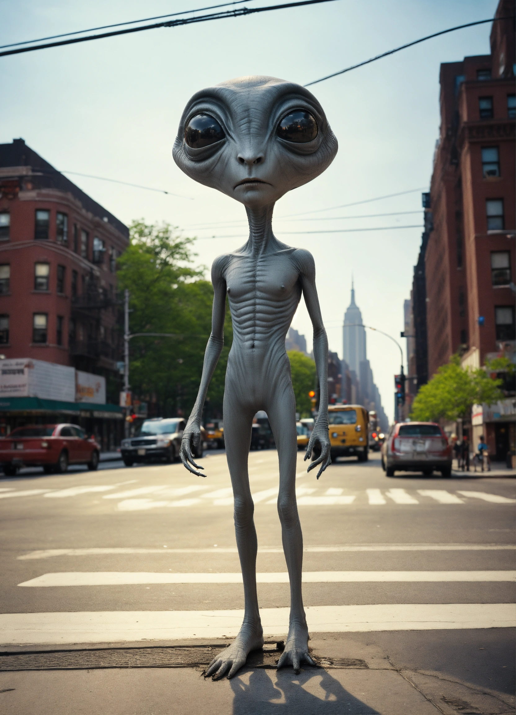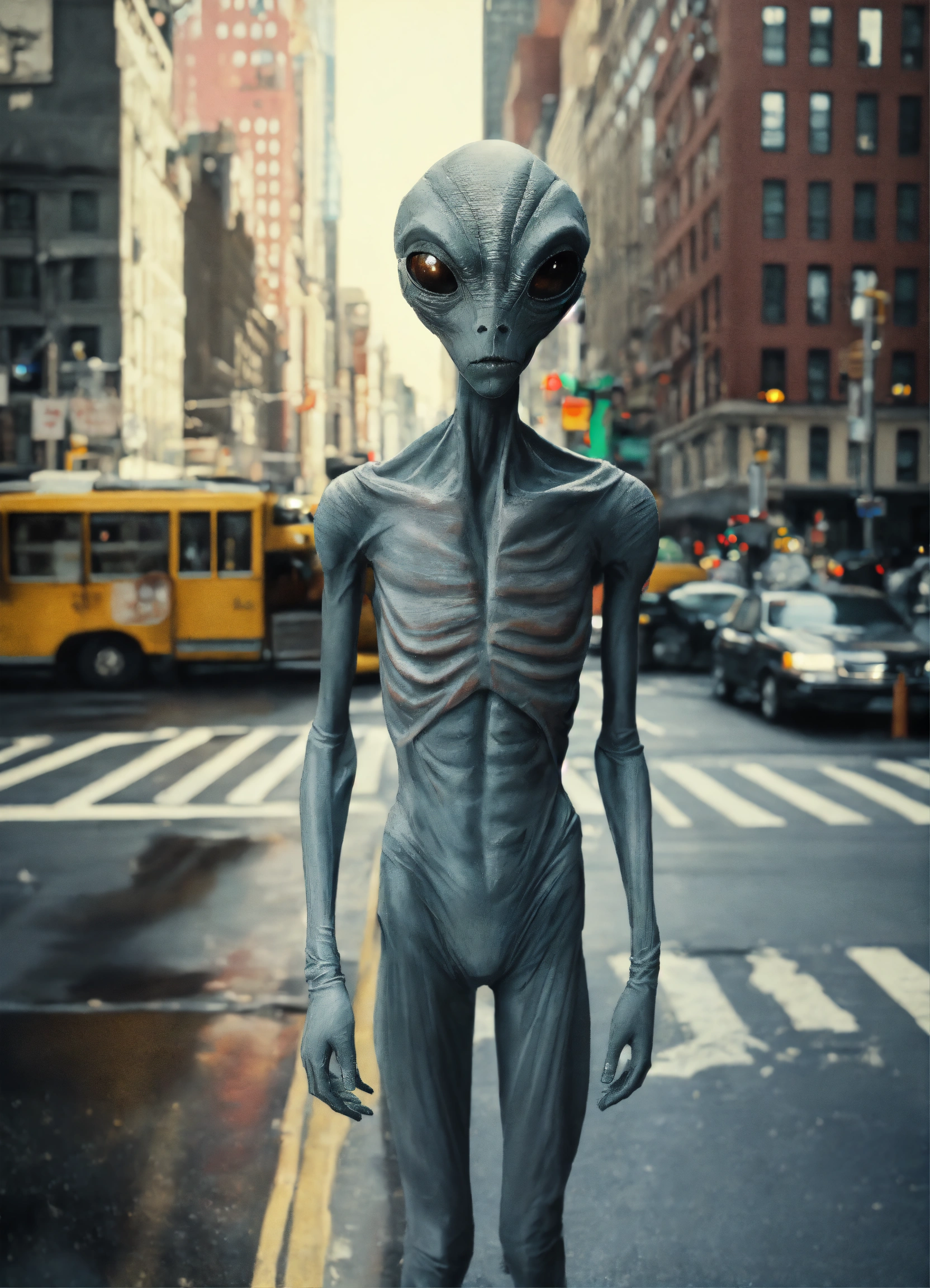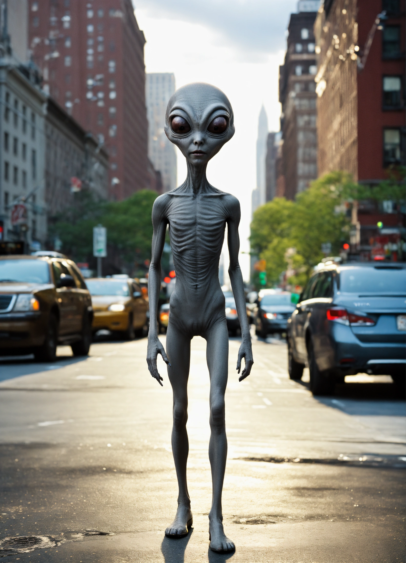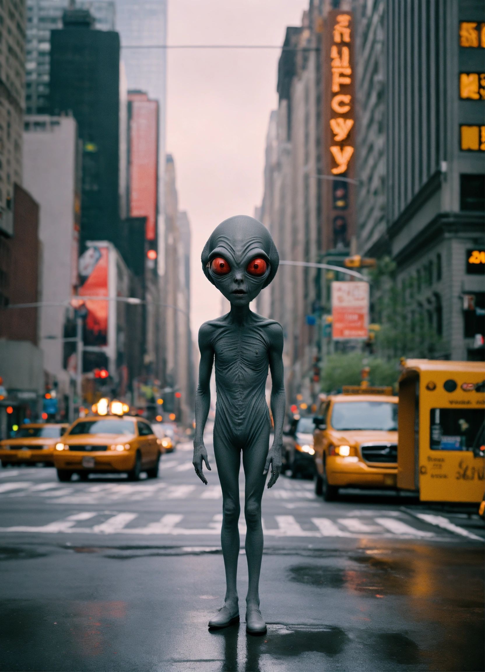 Very creepy realistic grey alien standing on a street corner, new york city, unsettling, wide angle, wes anderson movie still