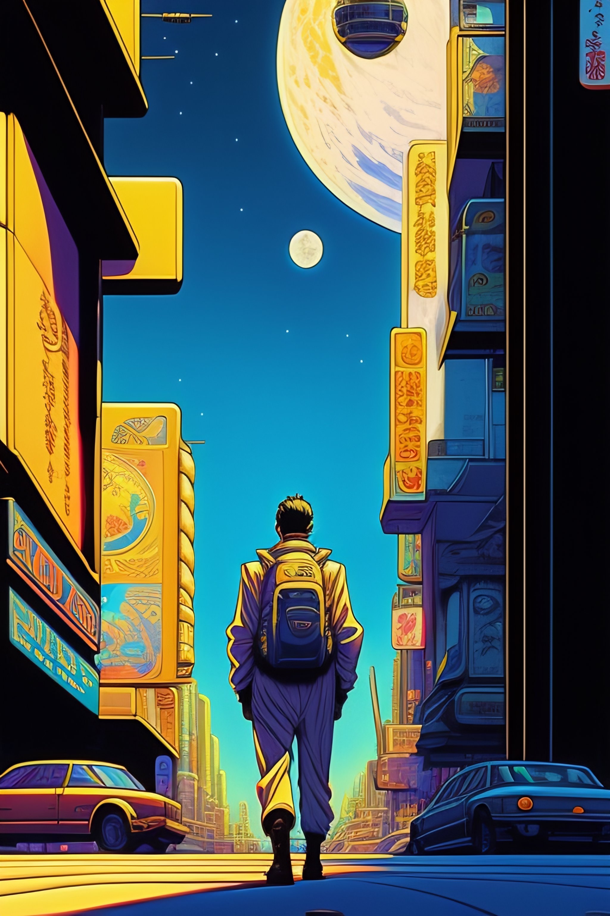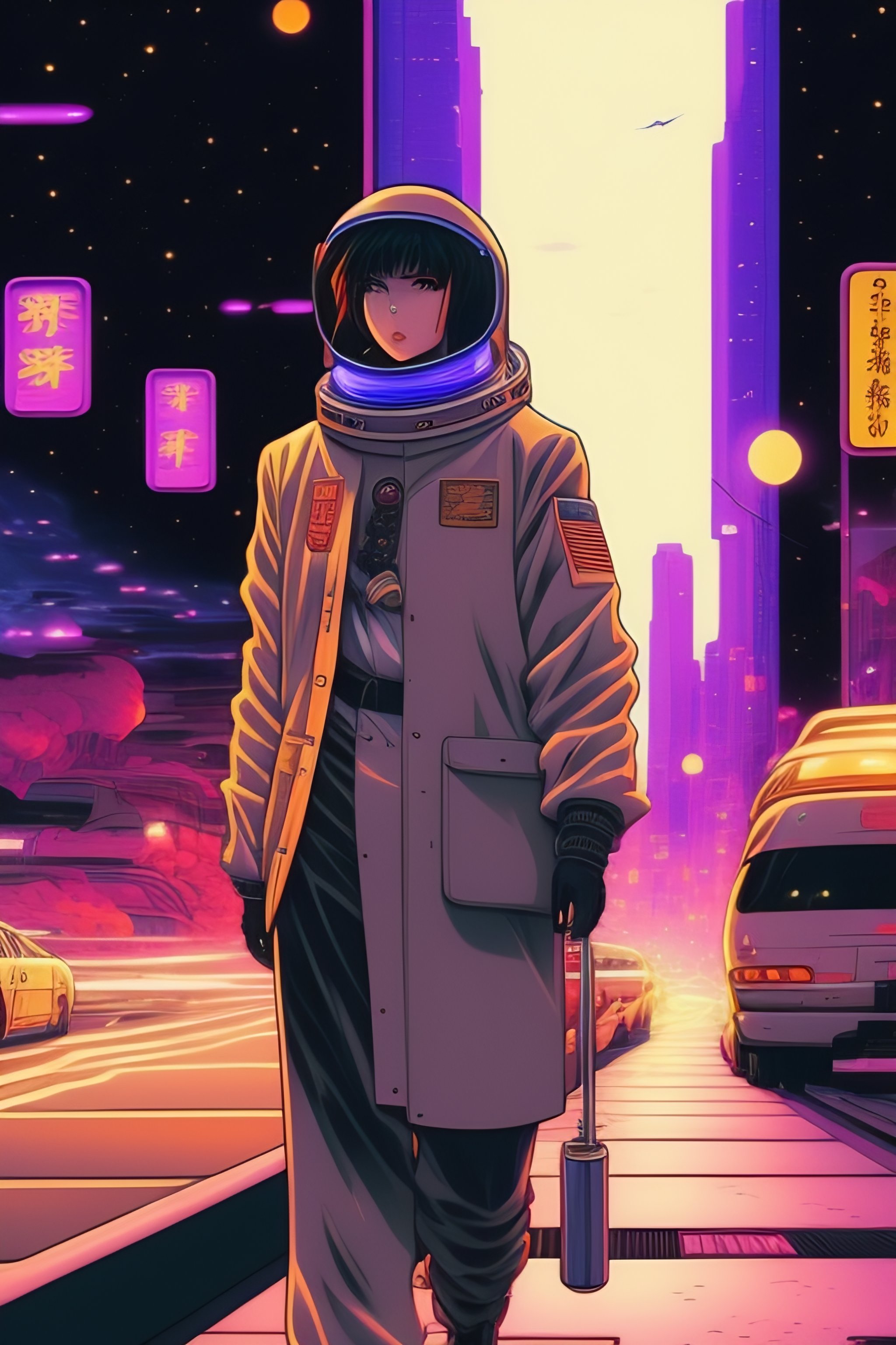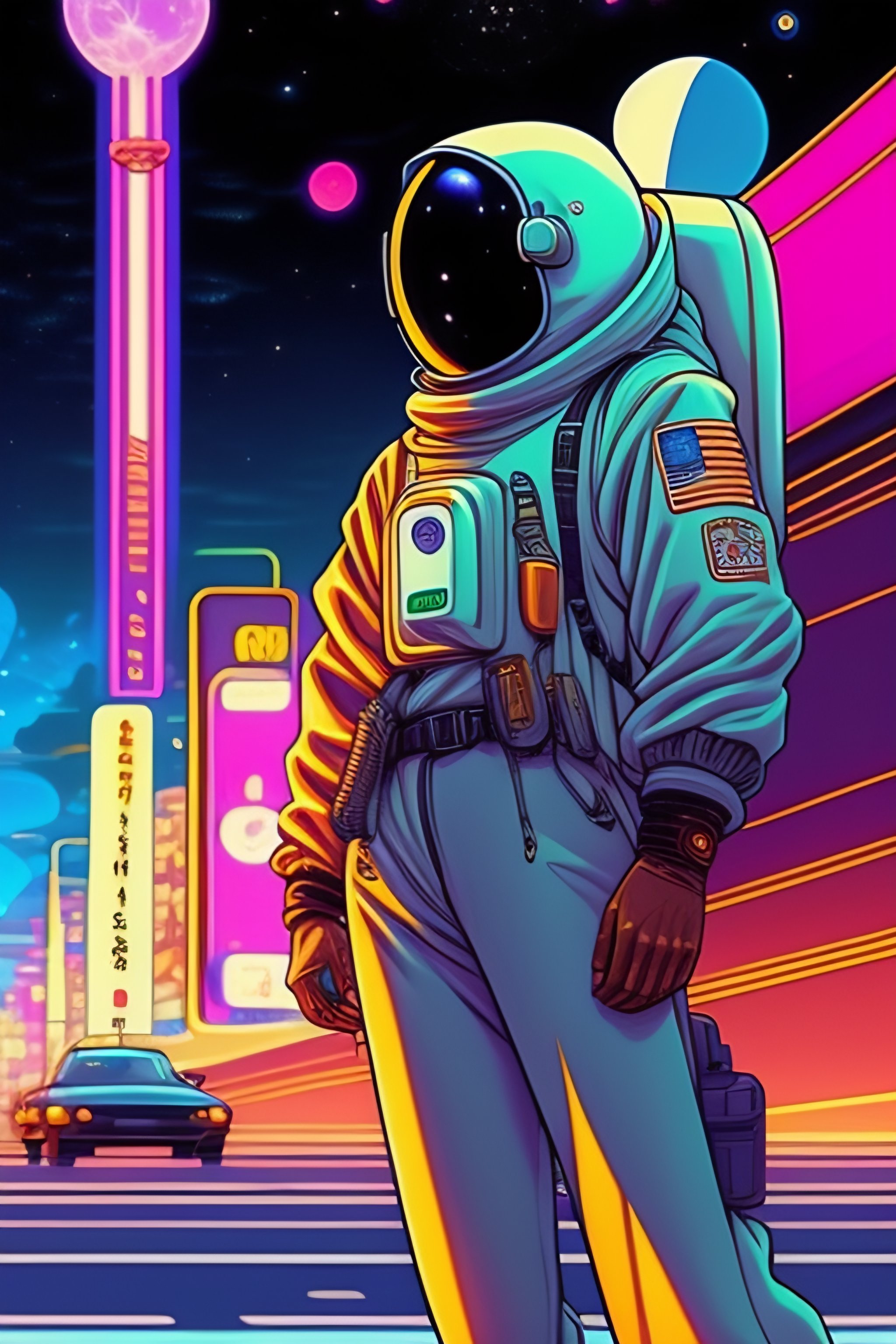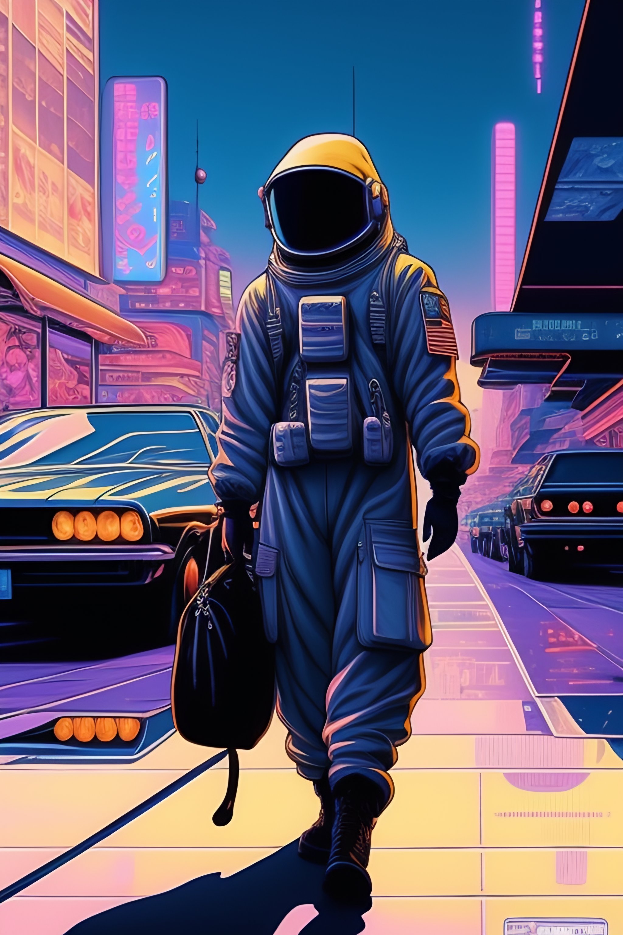 Vintage 90's anime style. a lonely astronaut walking down the street; by hajime sorayama, greg tocchini, virgil finlay, sci-fi. line art. environmental arcade art.