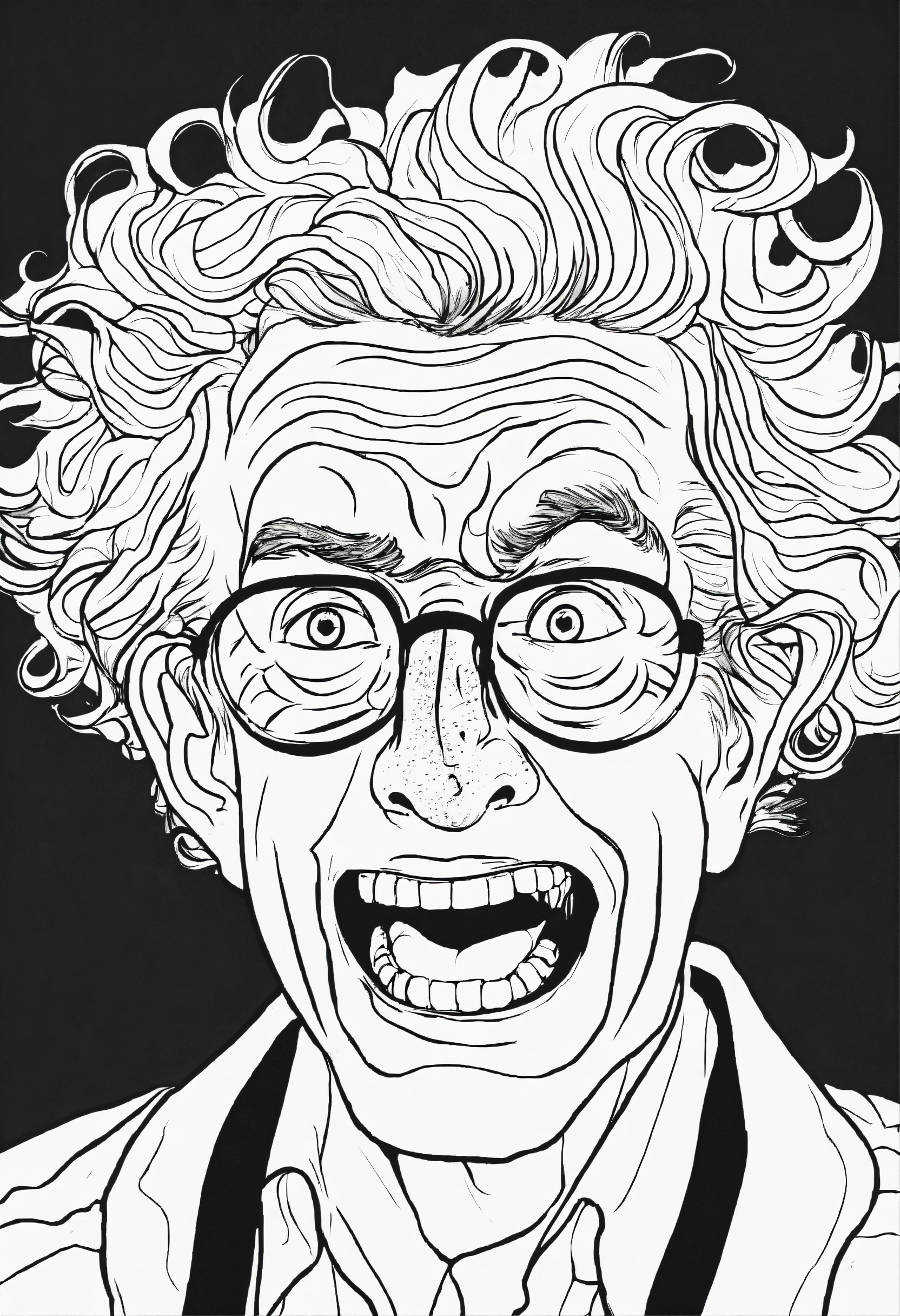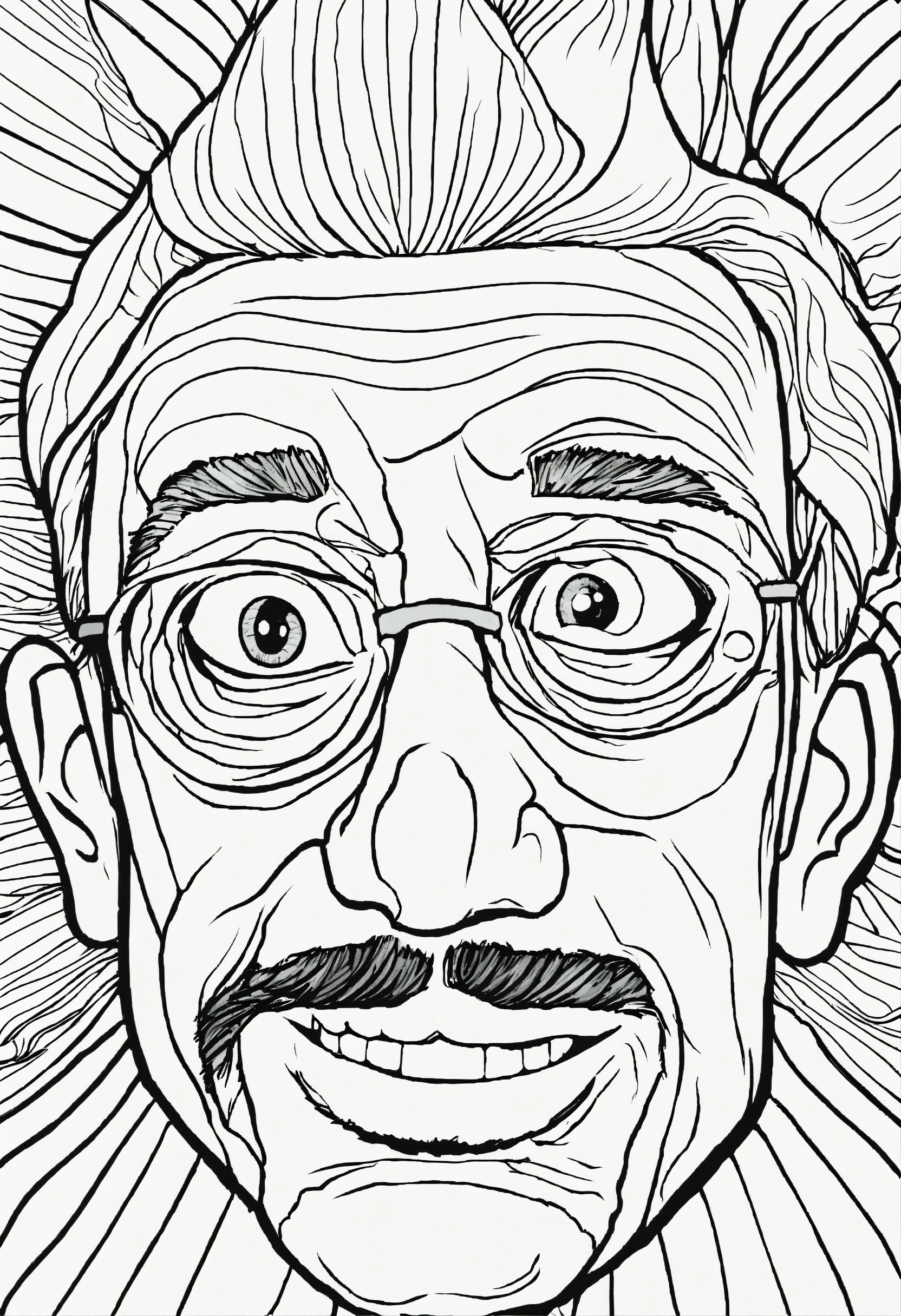 Coloring page for adults, wavy lines, mad magazine character idiot face, black and white, cartoon, white background