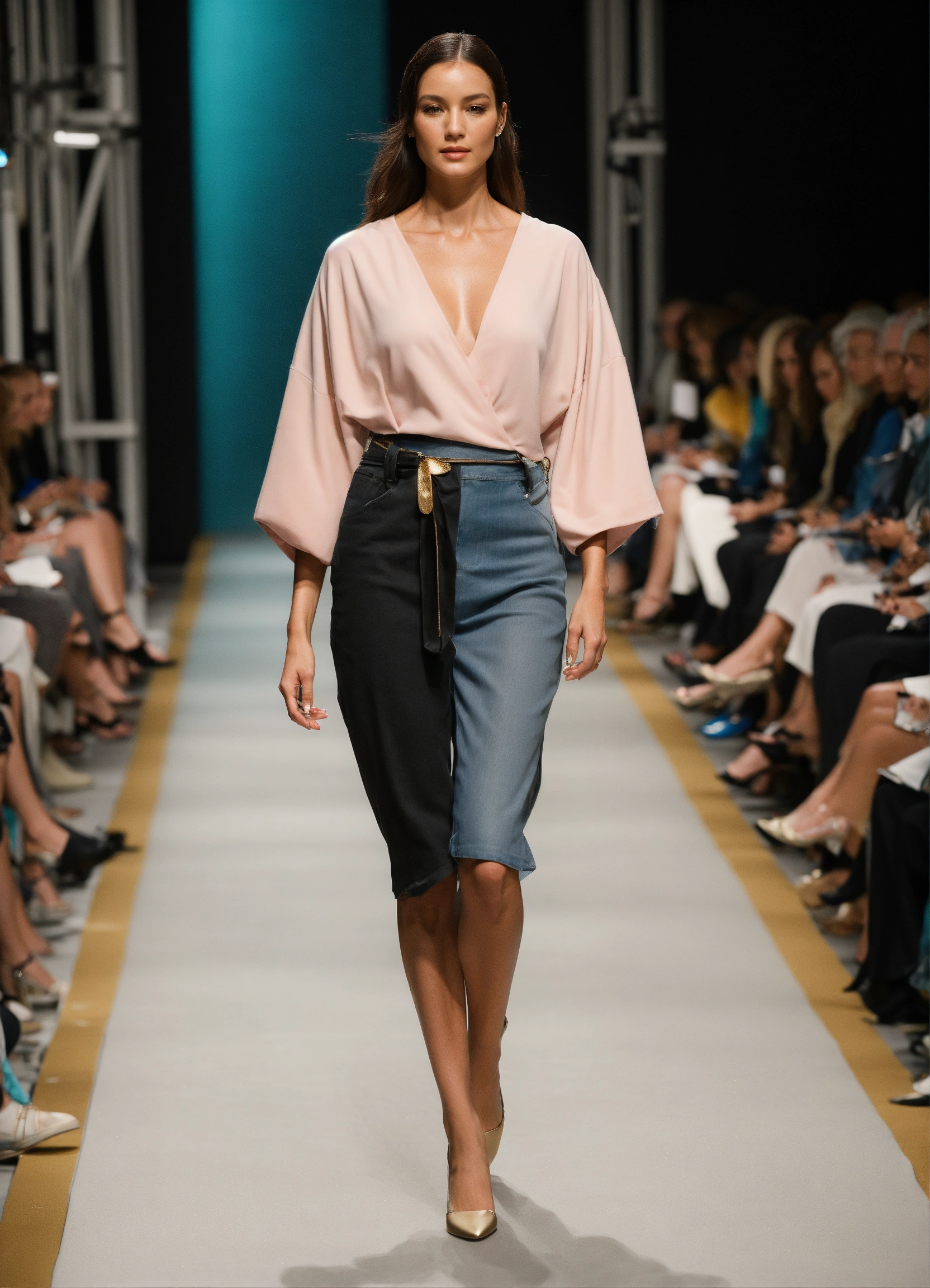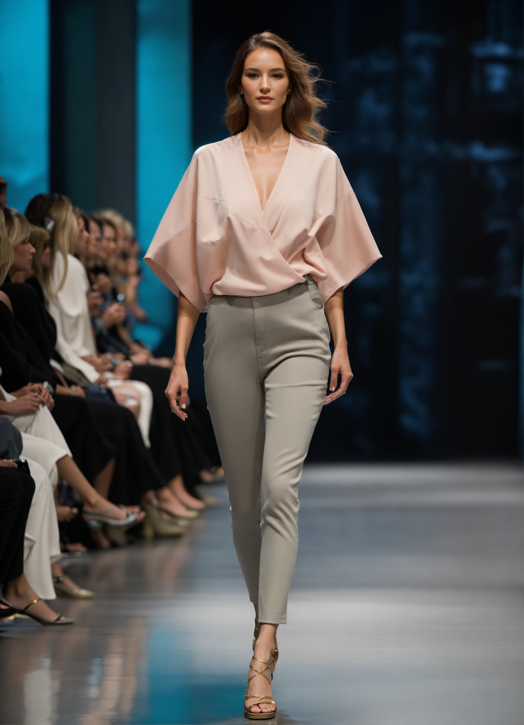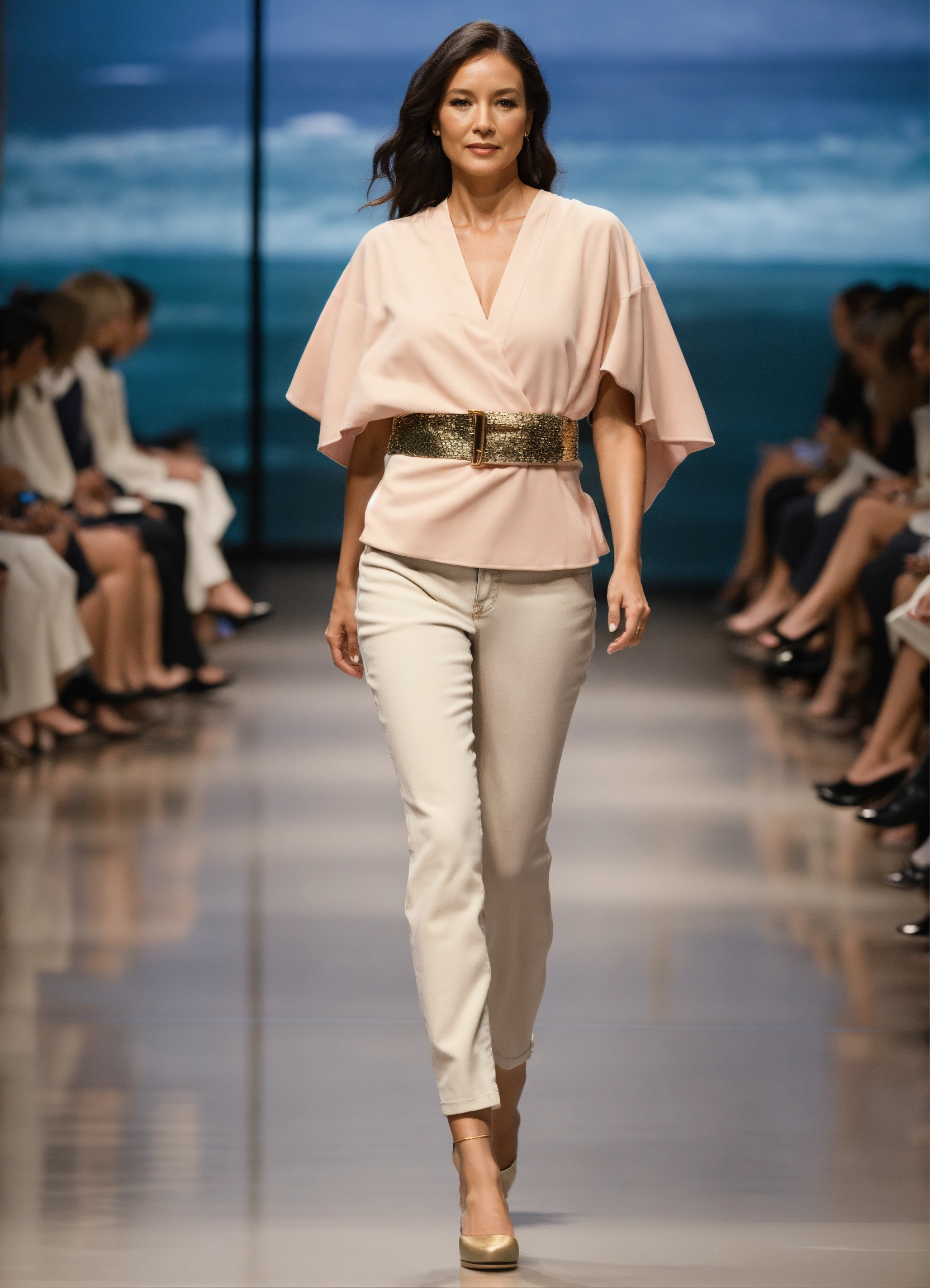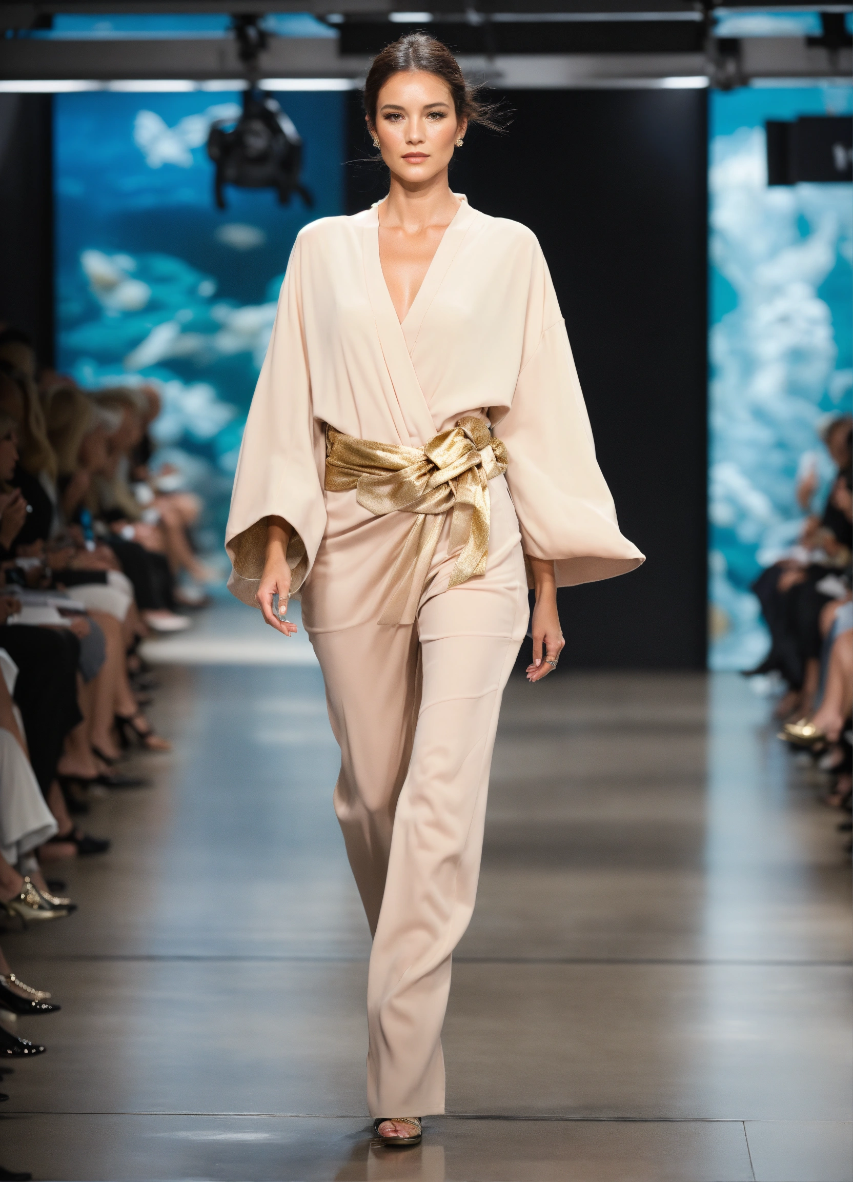 3d realistic photo of female oceanographer walking runway during marine fashion week wearing dolman sleeve donna karan oceanographers fashion in black, white, blush, grey, beige, stone, gold, denim, blue, teal walking a runway in a marine lab