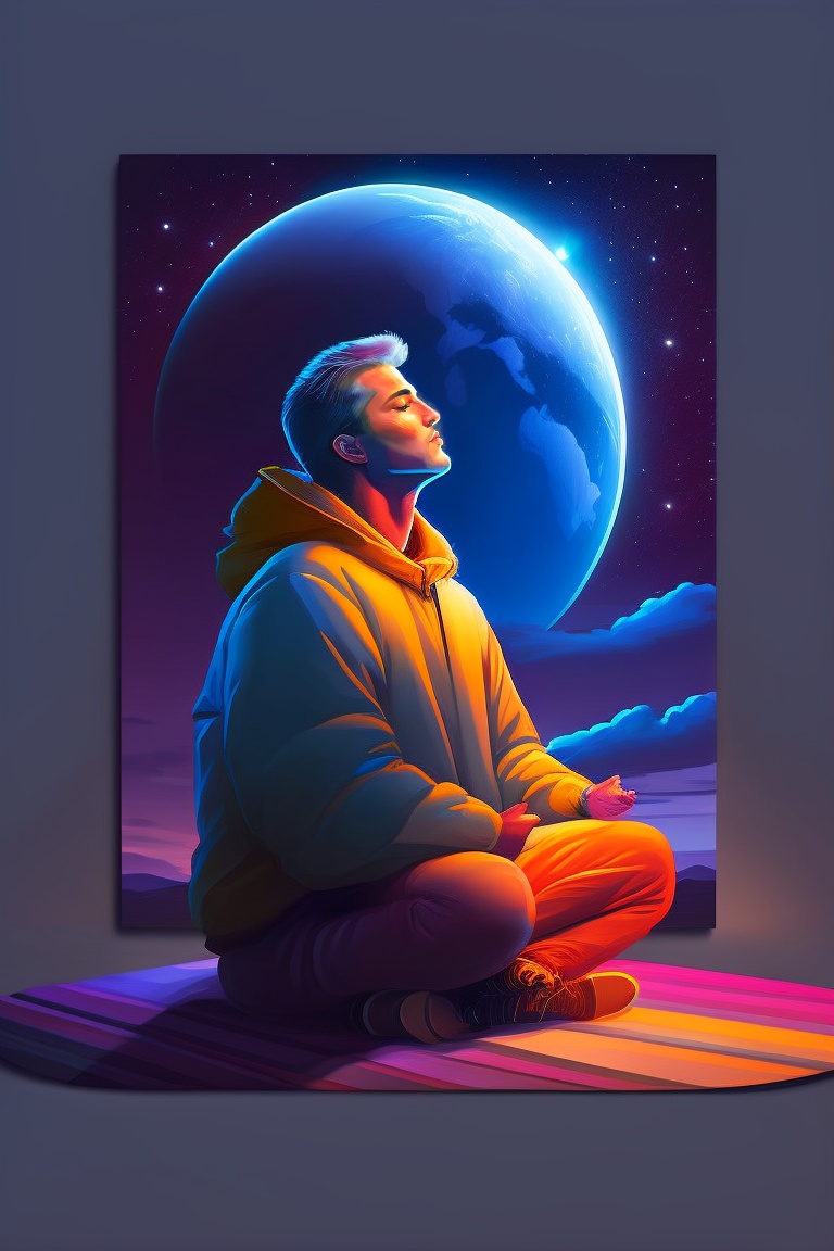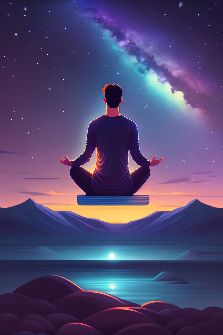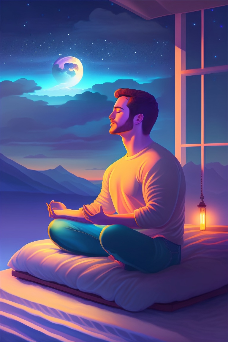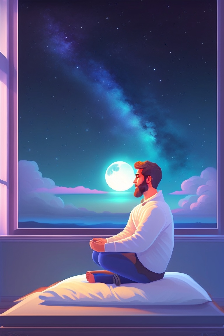 Beautiful painting of man sitting on her bed and meditating with closed eyes sky night, illustration, highly detailed, simple, smooth, and clean vector illustration, no jagged lines, vector art, smooth, artstation