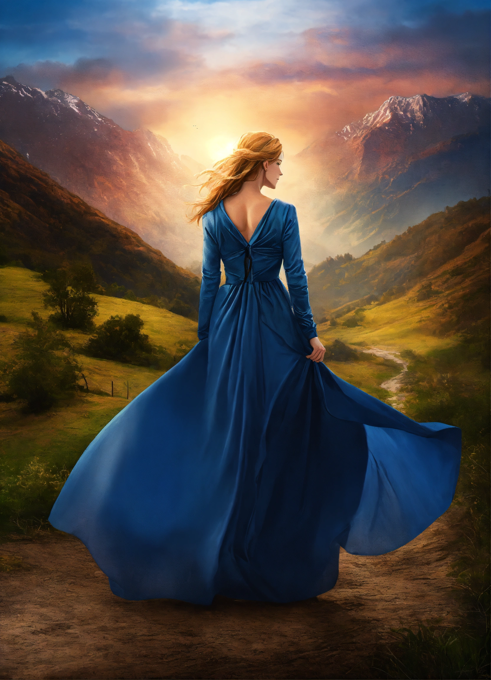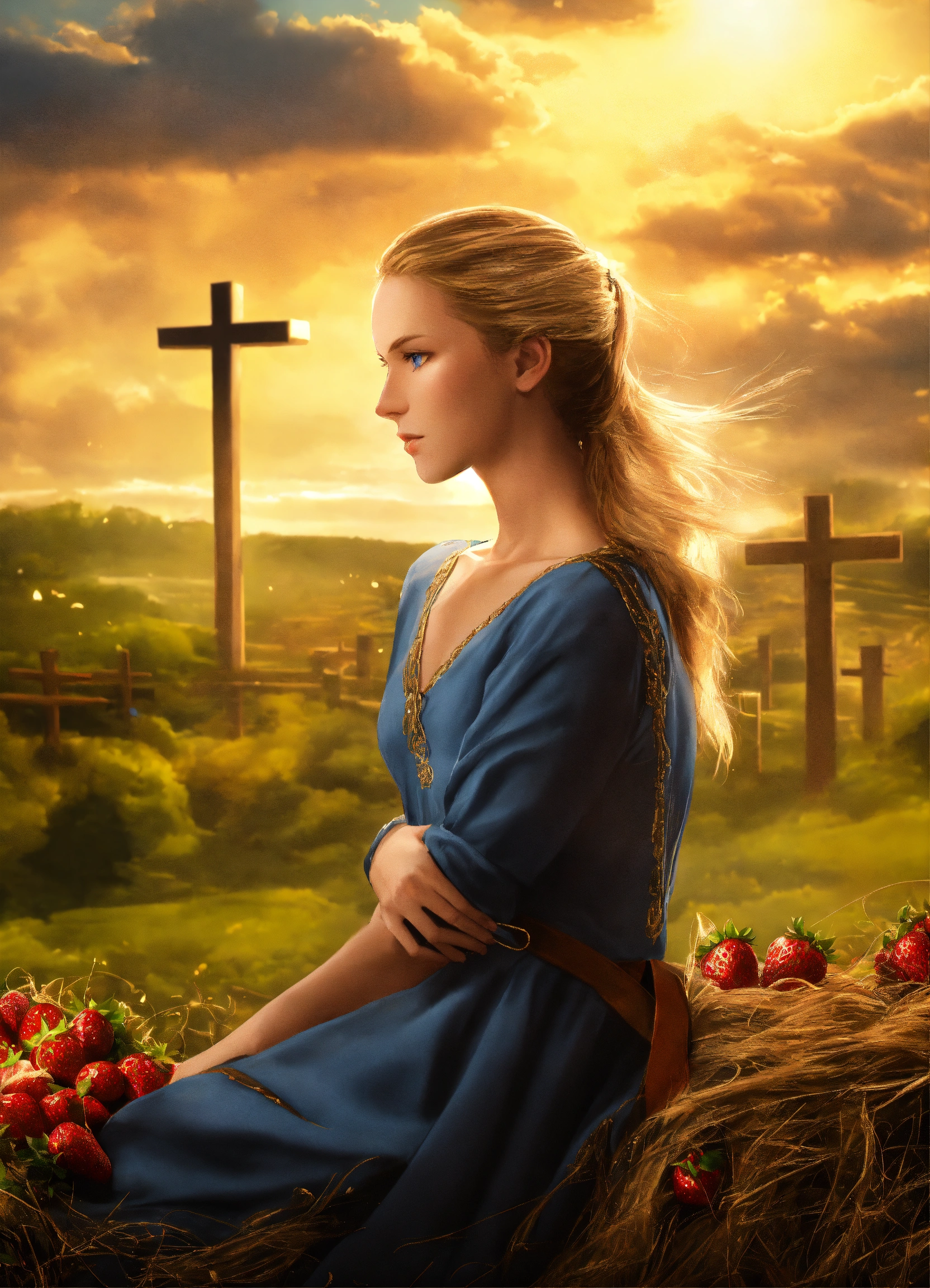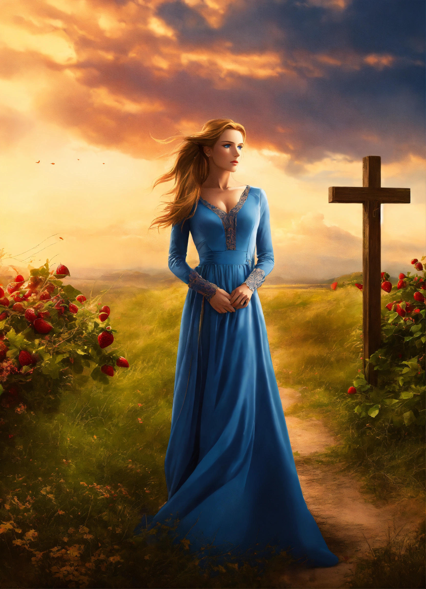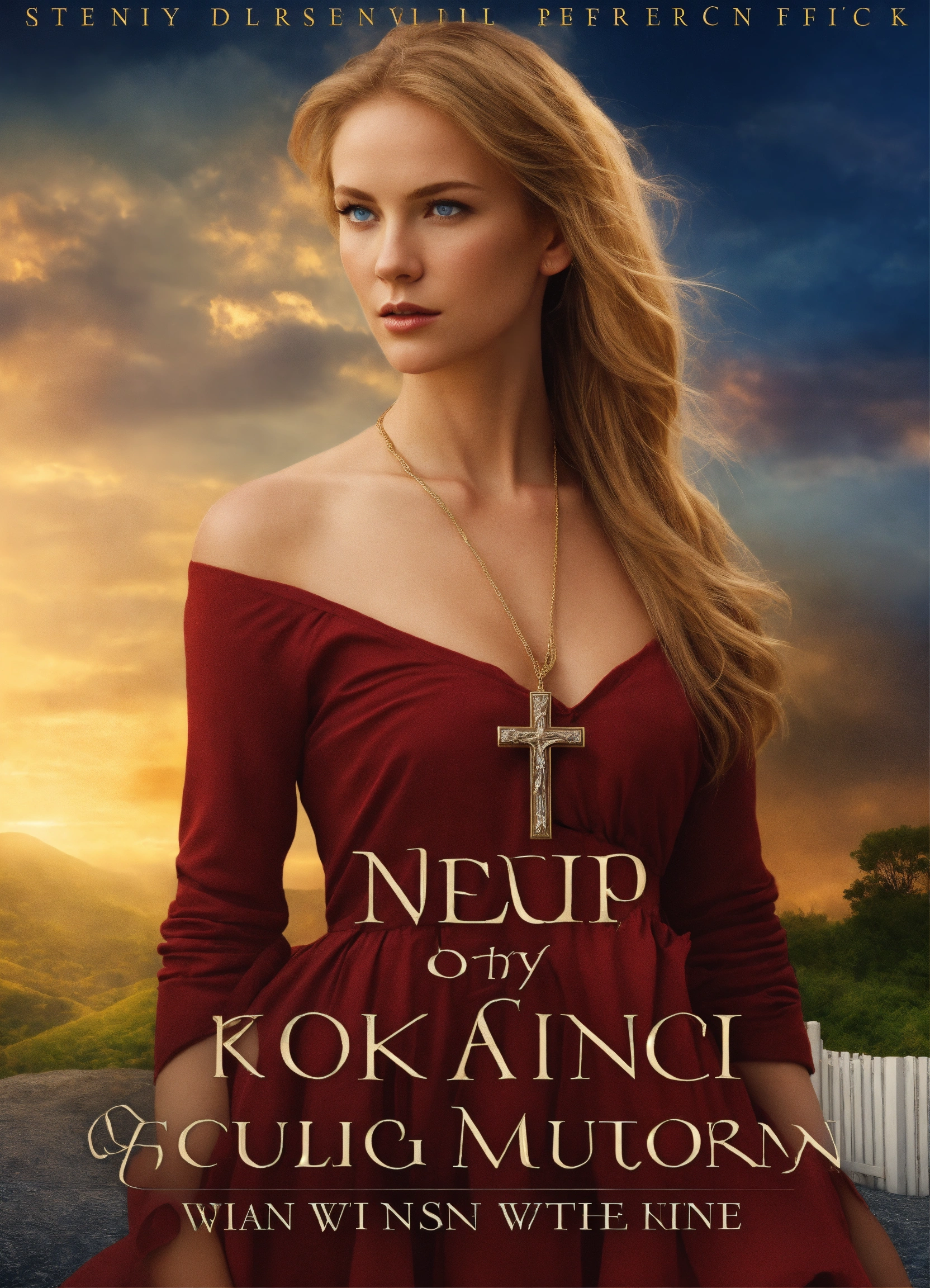Create captivating background designs for the book cover that convey the theme of romance, family saga fiction, contemporary women's fiction, sky background with lighting and shadow effects, photorealistic, with a woman in a ponytail, strawberry blond hair, blue eyes, wearing a crucifix, in a long sleeve dress with collar, not showing her chest, conservative christian woman. the man on the cover of one of a kind is what i am looking for in the man on my cover. he should look like a rich guy, maybe a little dangerous but his hair needs to be dark red with hazel eyes. think 'bad boy.'