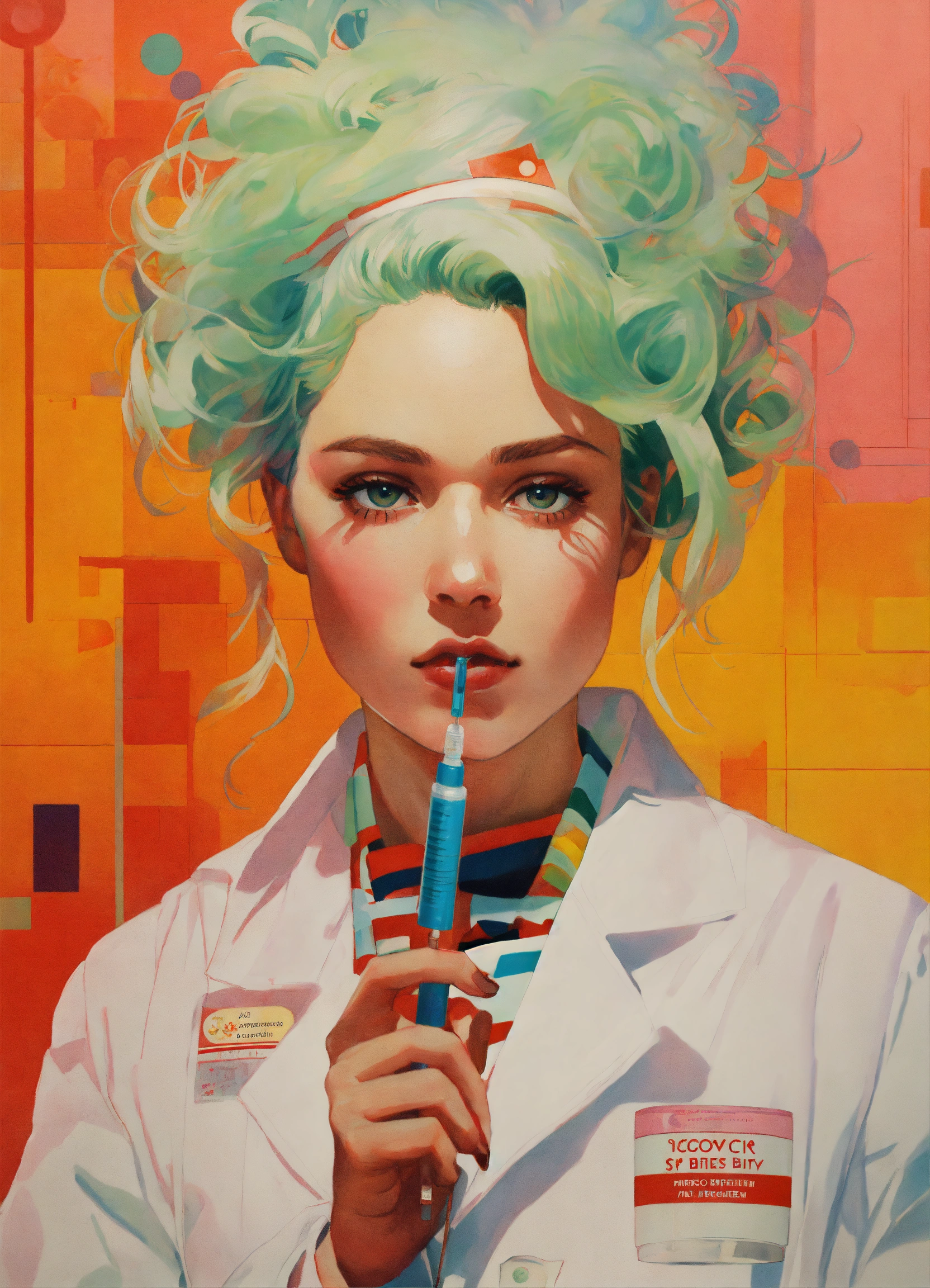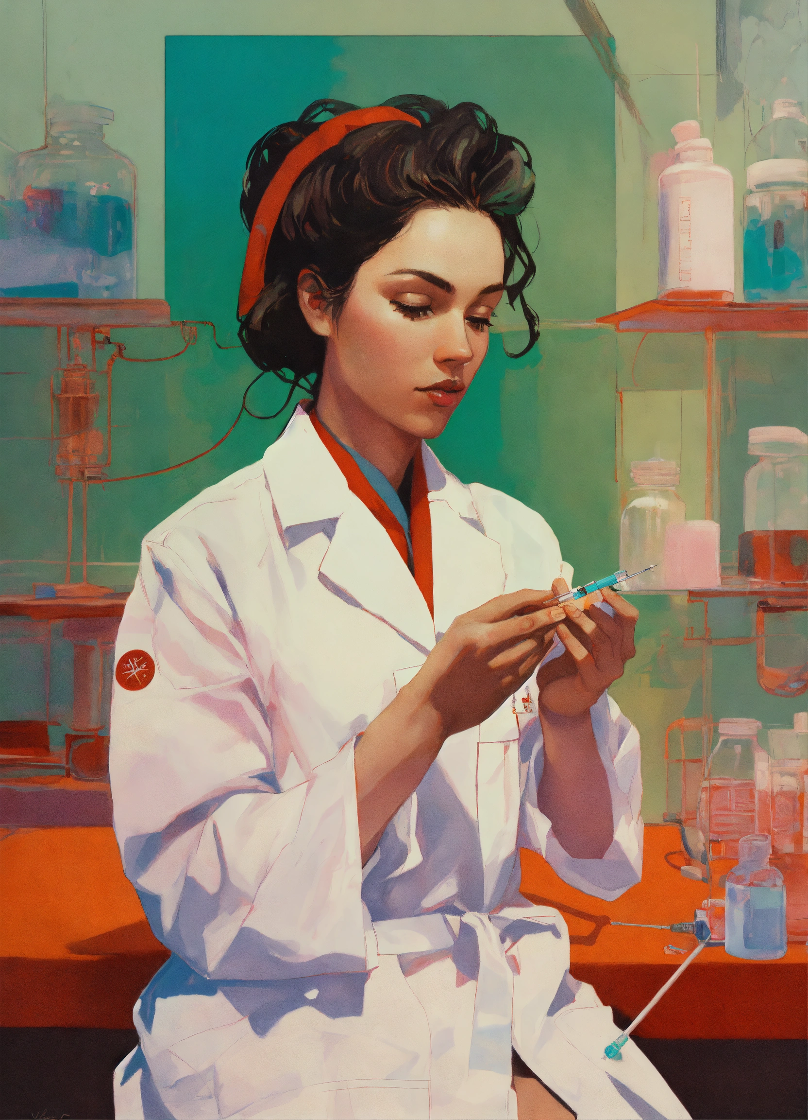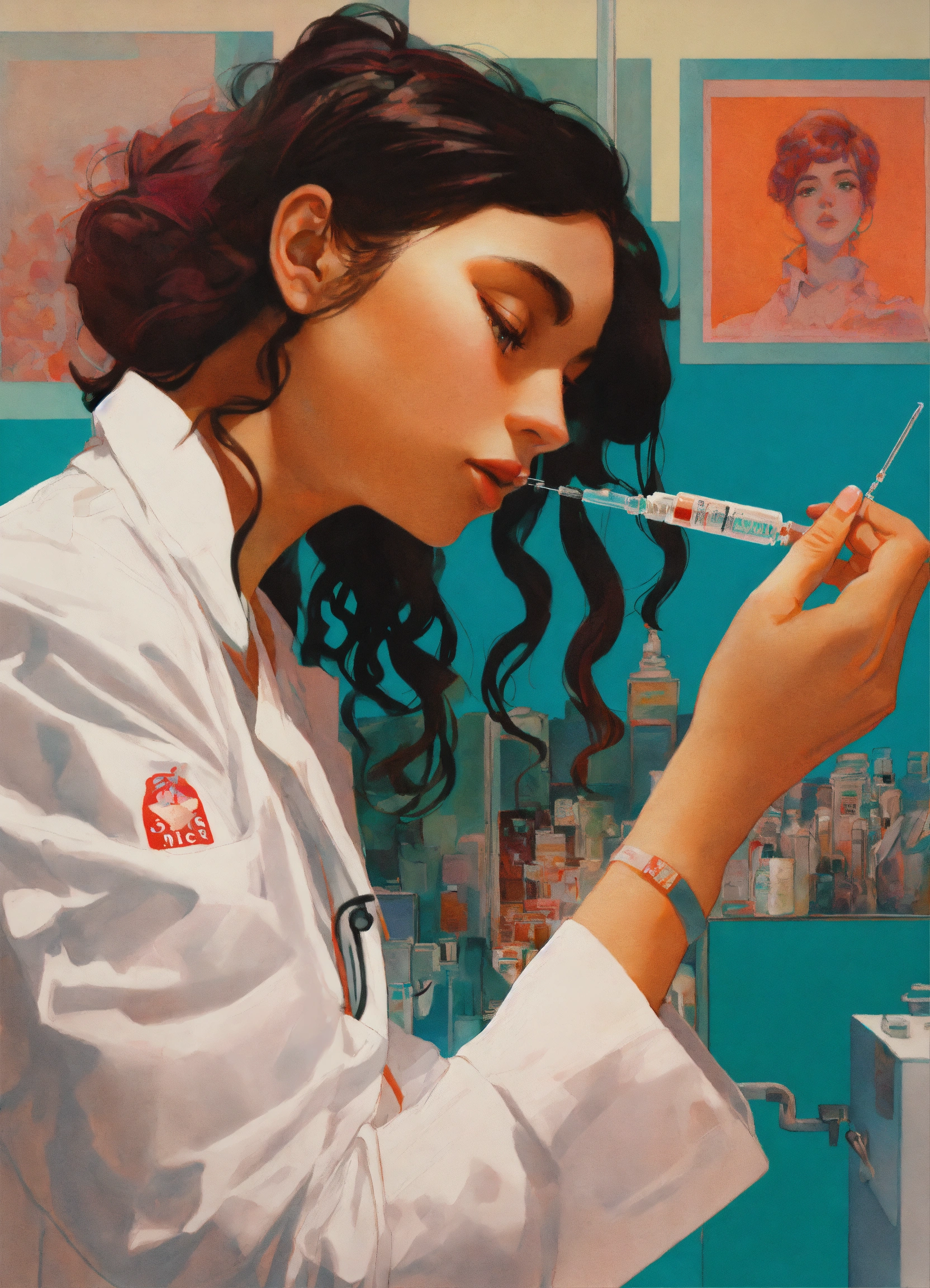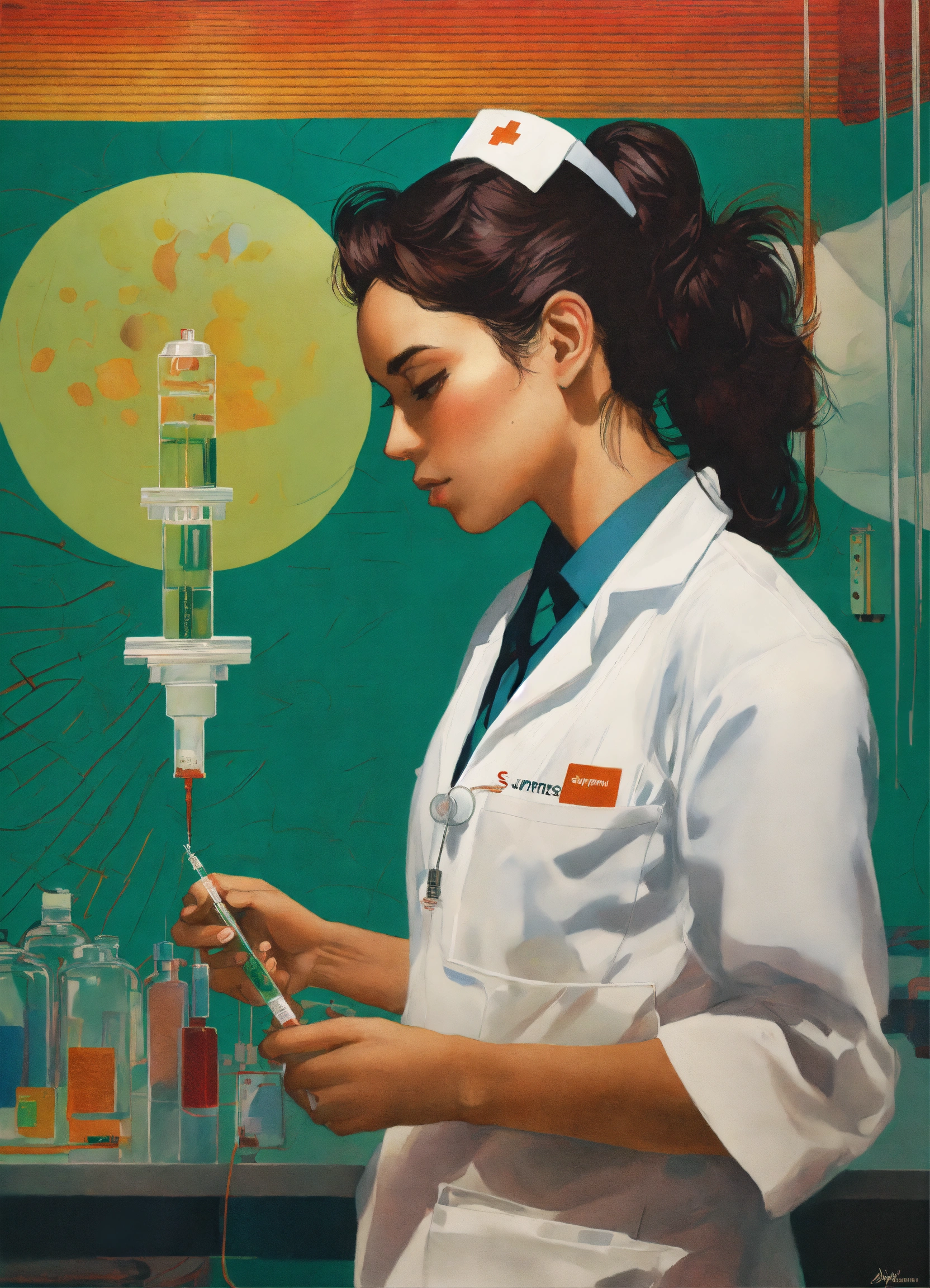 Sergio lopez arctium láppa conrad roset poster, a realistic photograph of a nurse in a white lab coat preparing a syringe for an injection, art by victor moscoso and bridget riley by sachin teng x supreme