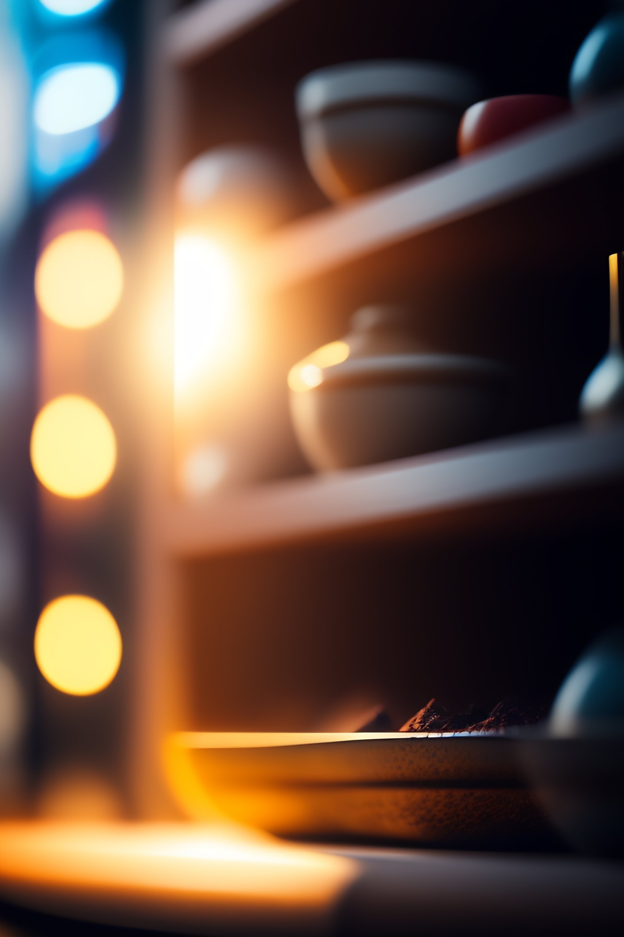 Shelf, splash art, movie still, cinematic lighting, dramatic, octane render, shallow depth of field, bokeh, anamorphic lens flare, 8 k, hyper detailed, 200 mm film grain