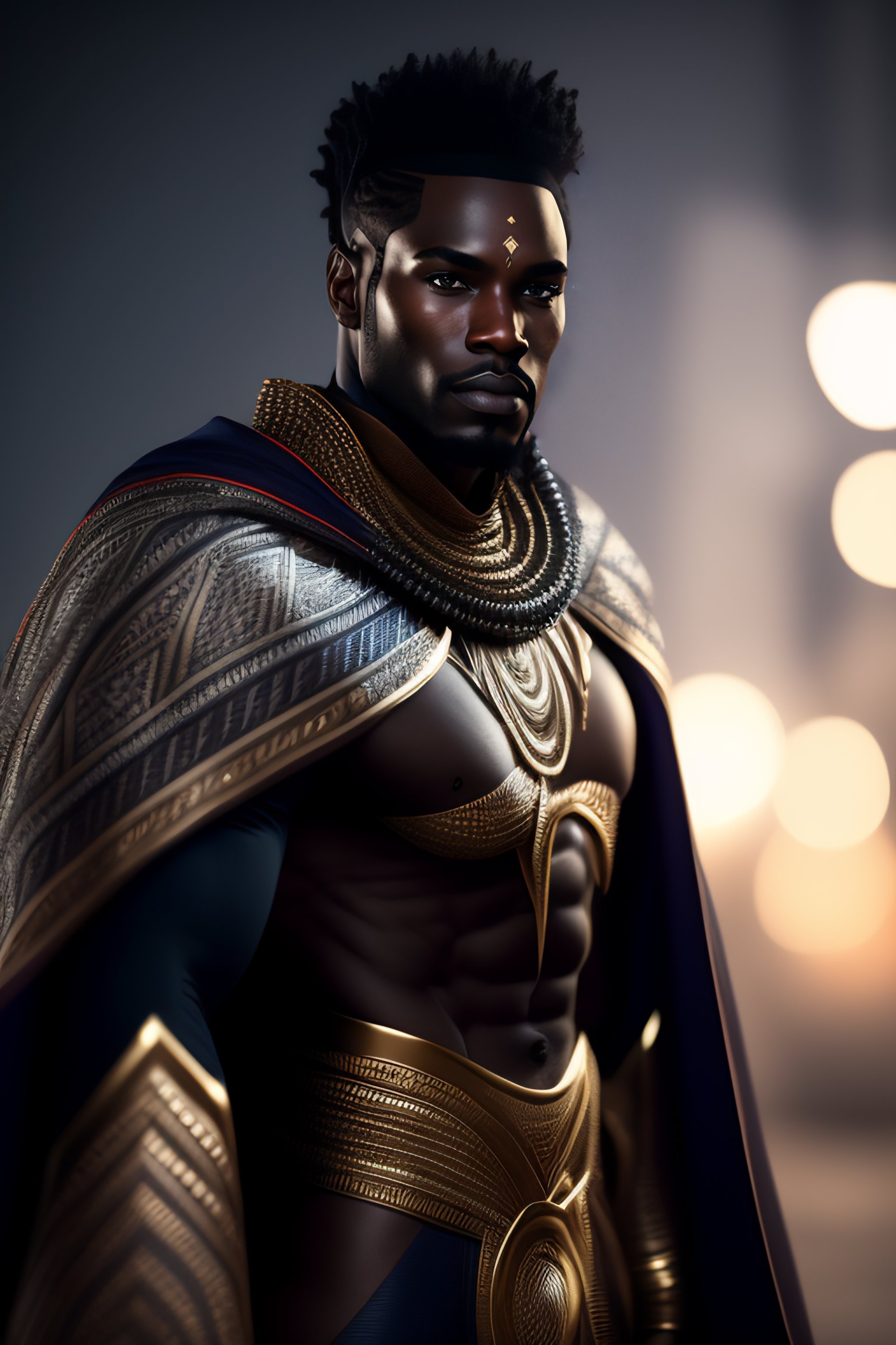 Male superhero, marvel comics, full body, character concept, intricate african clothing and cape, black and white photography, magical, tribal patterns in rmour, sparks, cinematic lighting, cinematic atmosphere, 8 k octane render, unreal engine 5