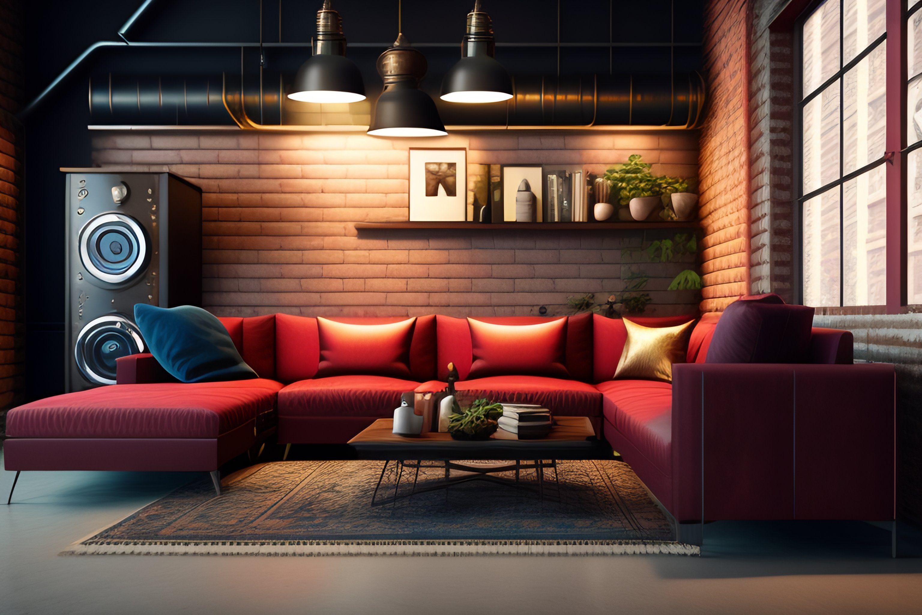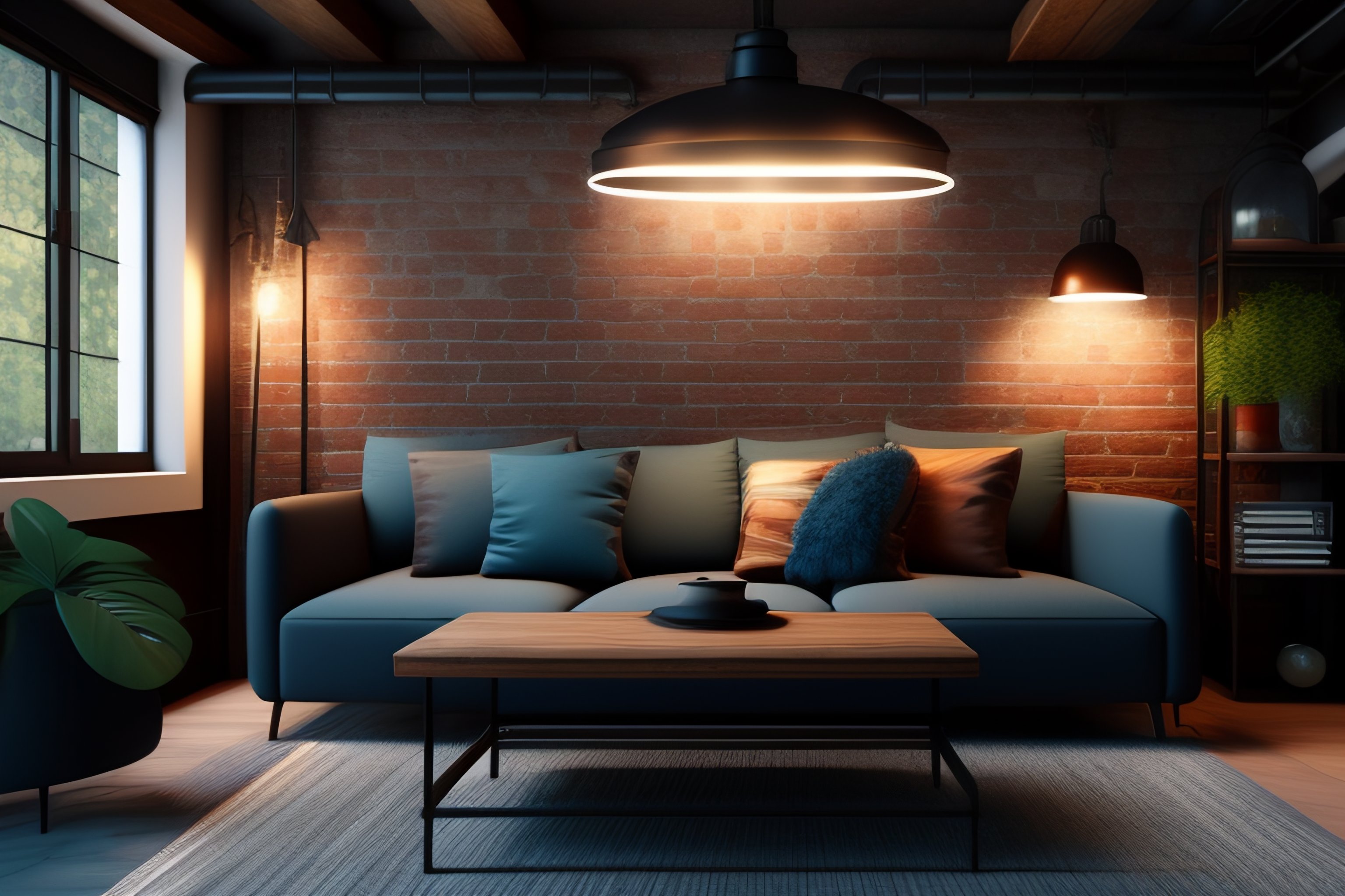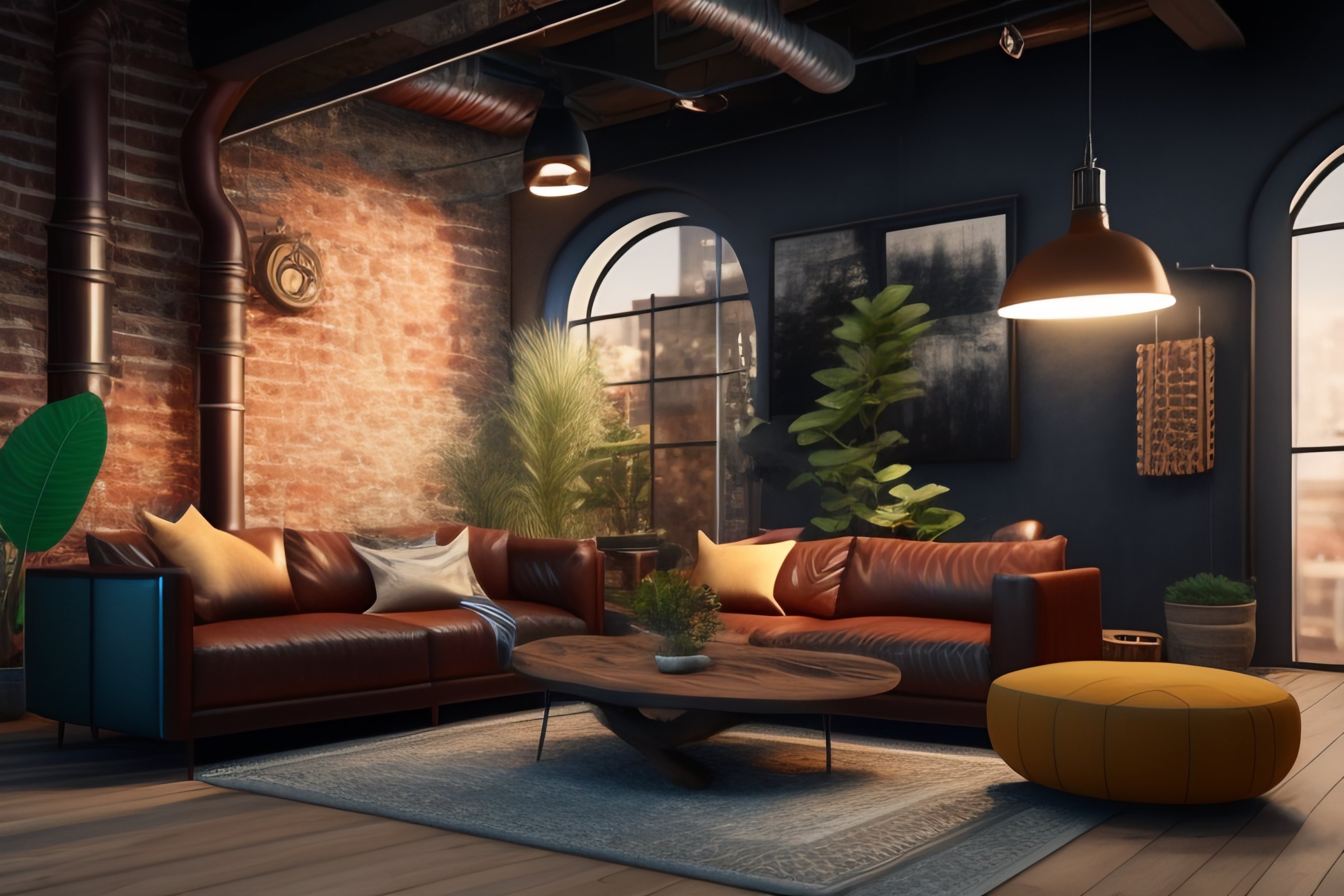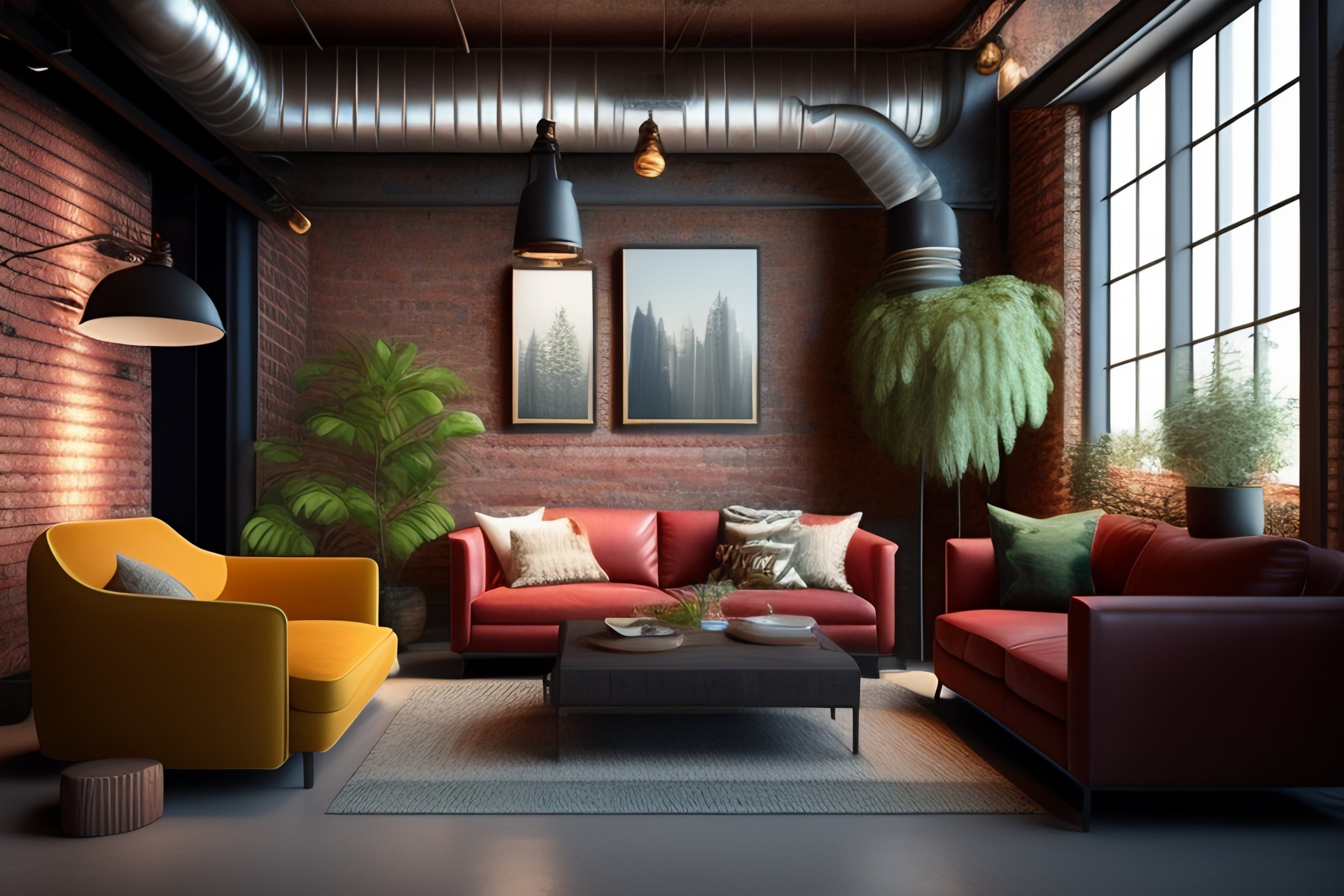 (((sofa set))), (painting on the wall), (fully furnished living room), ((vintage wood and metal furniture)), exposed brick walls, (grunge wall), (industrial interior design), industrial aesthetic, minimalist and utilitarian, exposed metal pipes and ducts, vintage lighting fixtures, (((wooden door in the middle)))), (((highly detailed))), (((4k))), ((accurate))
